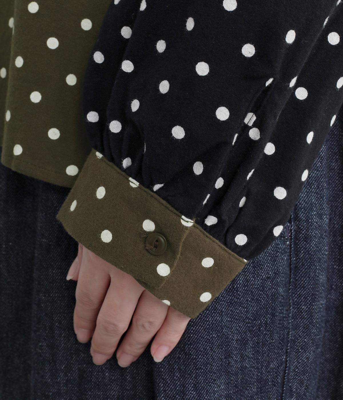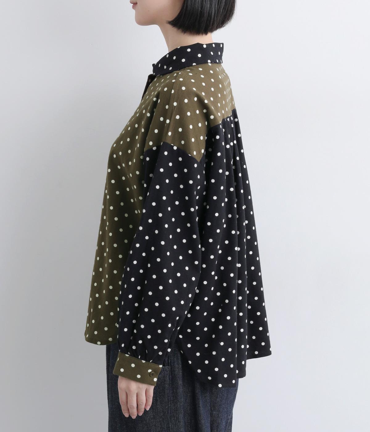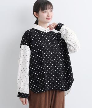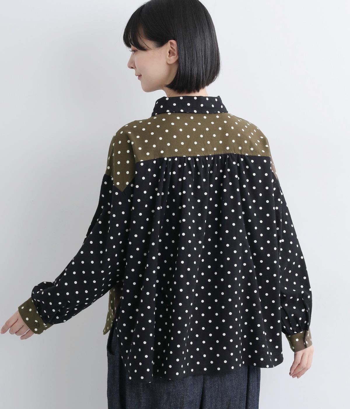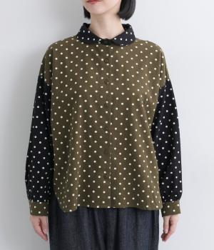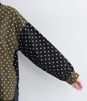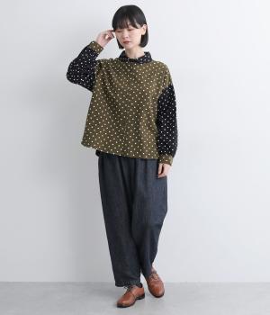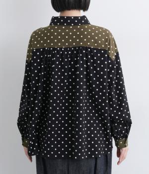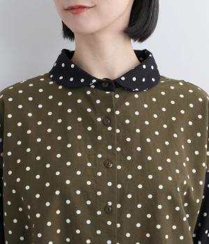 小さめのドット柄と、配色が印象的な一枚です。襟や袖、背面の切り替えがゆたかな表情を生み、ナチュラルさのなかにも遊び心を感じます。クラシカルな丸襟で、やわらかく女性らしい印象も添えました。背面と袖口には、ふんわりとギャザーを寄せて立体感をプラス。