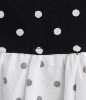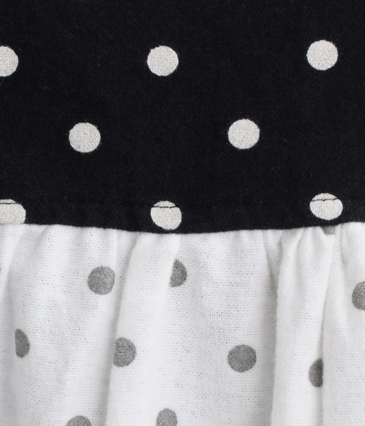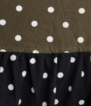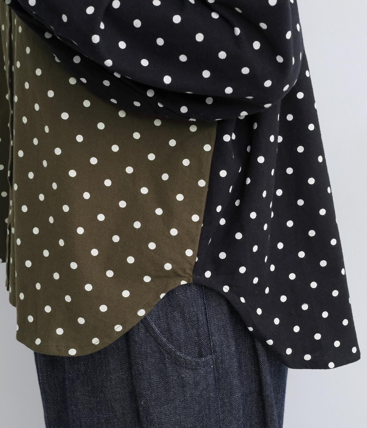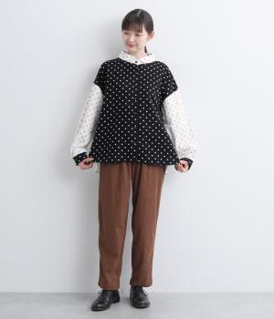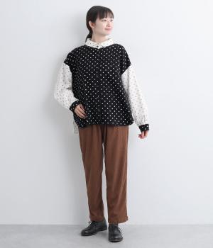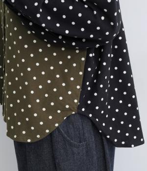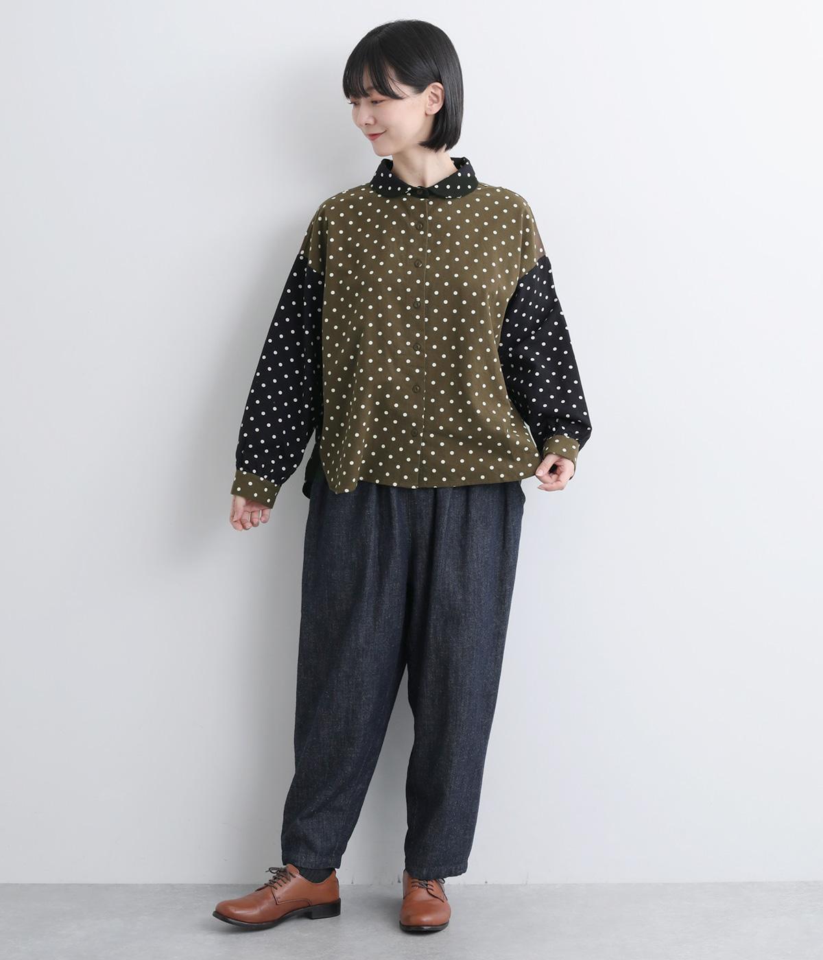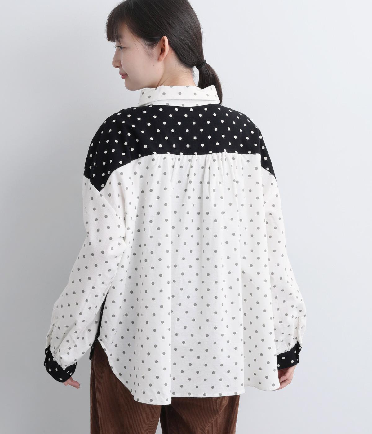 小さめのドット柄と、配色が印象的な一枚です。襟や袖、背面の切り替えがゆたかな表情を生み、ナチュラルさのなかにも遊び心を感じます。クラシカルな丸襟で、やわらかく女性らしい印象も添えました。背面と袖口には、ふんわりとギャザーを寄せて立体感をプラス。