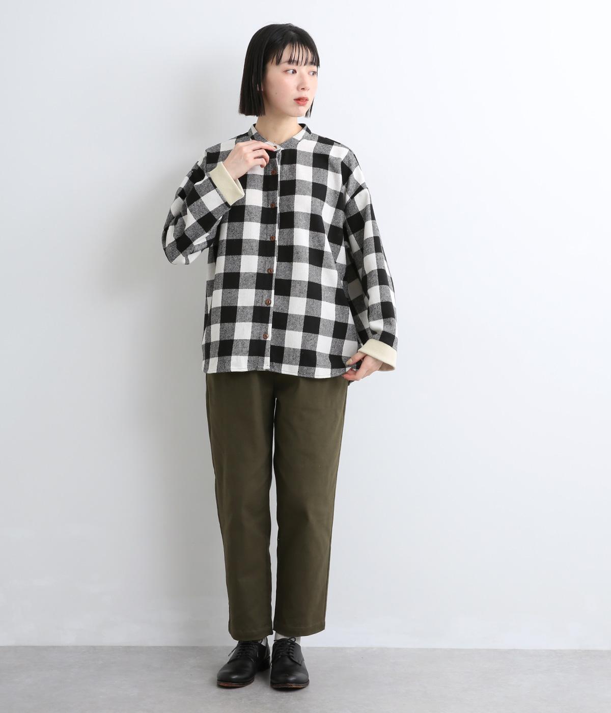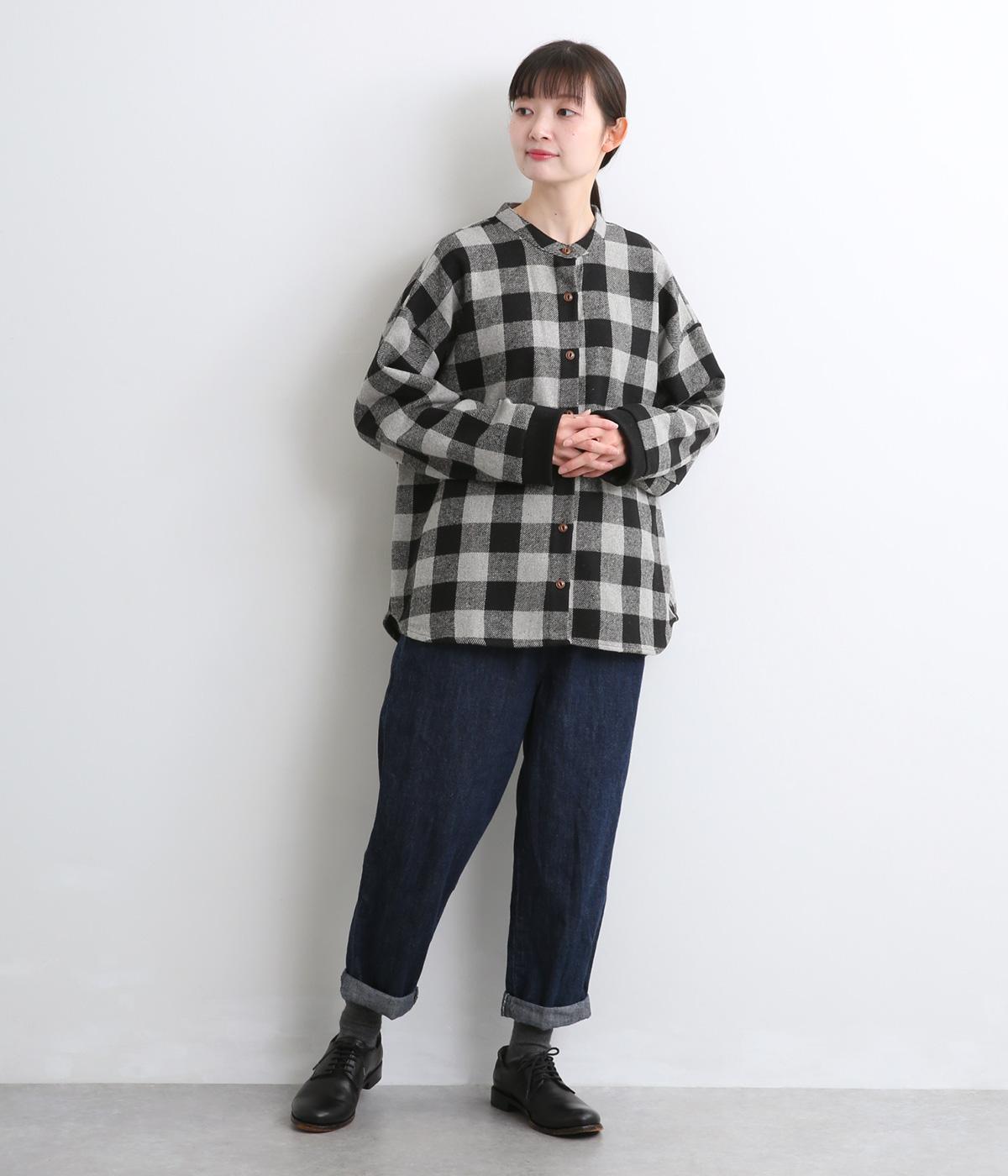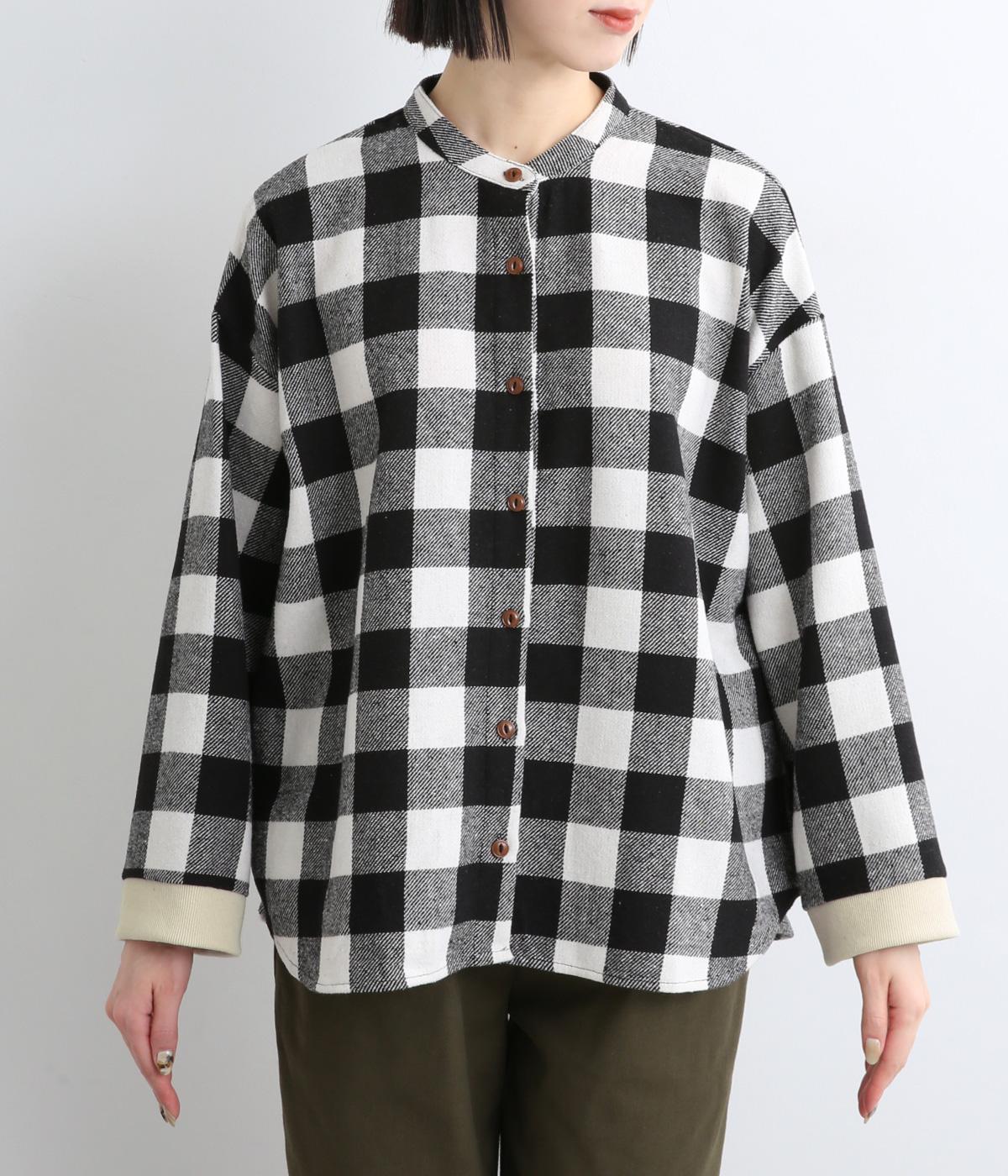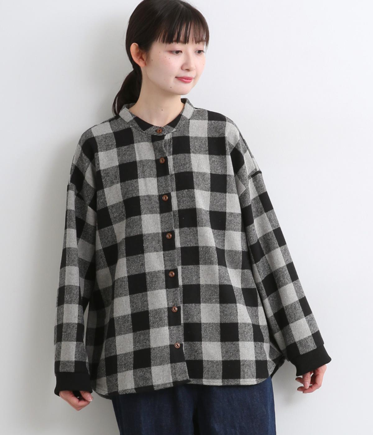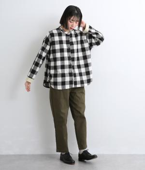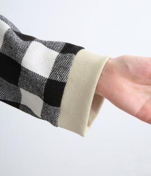 インパクトのあるブロックチェックをバンドカラーと袖口のリブでバランスよくまとめました。丸みのあるラインを描く裾もさりげなく女性らしさをプラスしています。ゆったりとリラックス感のある着心地です。
