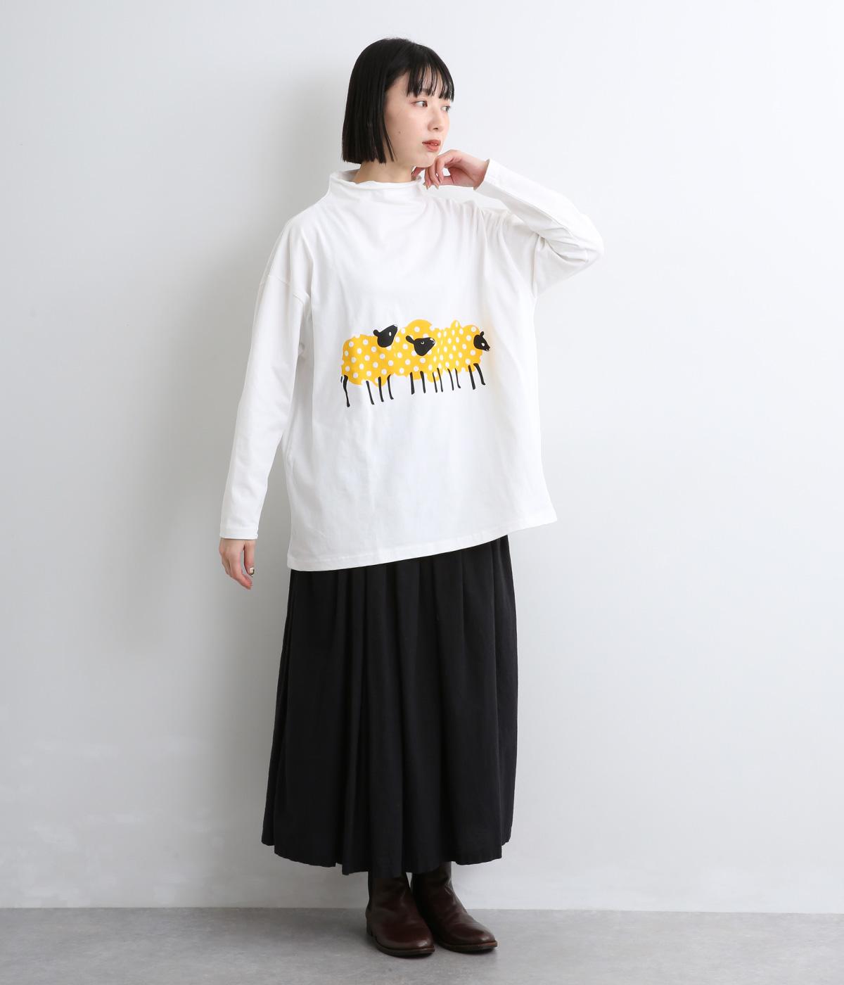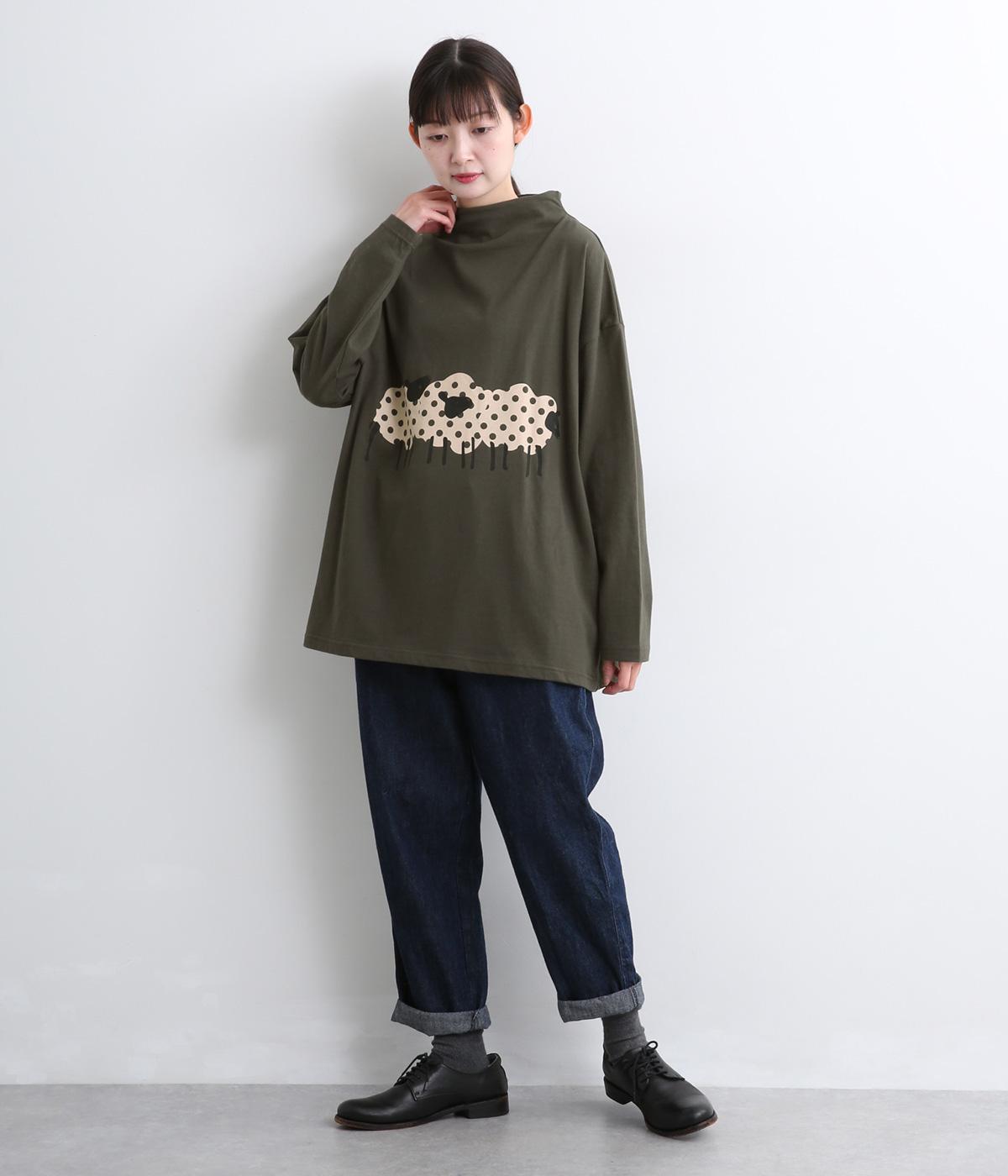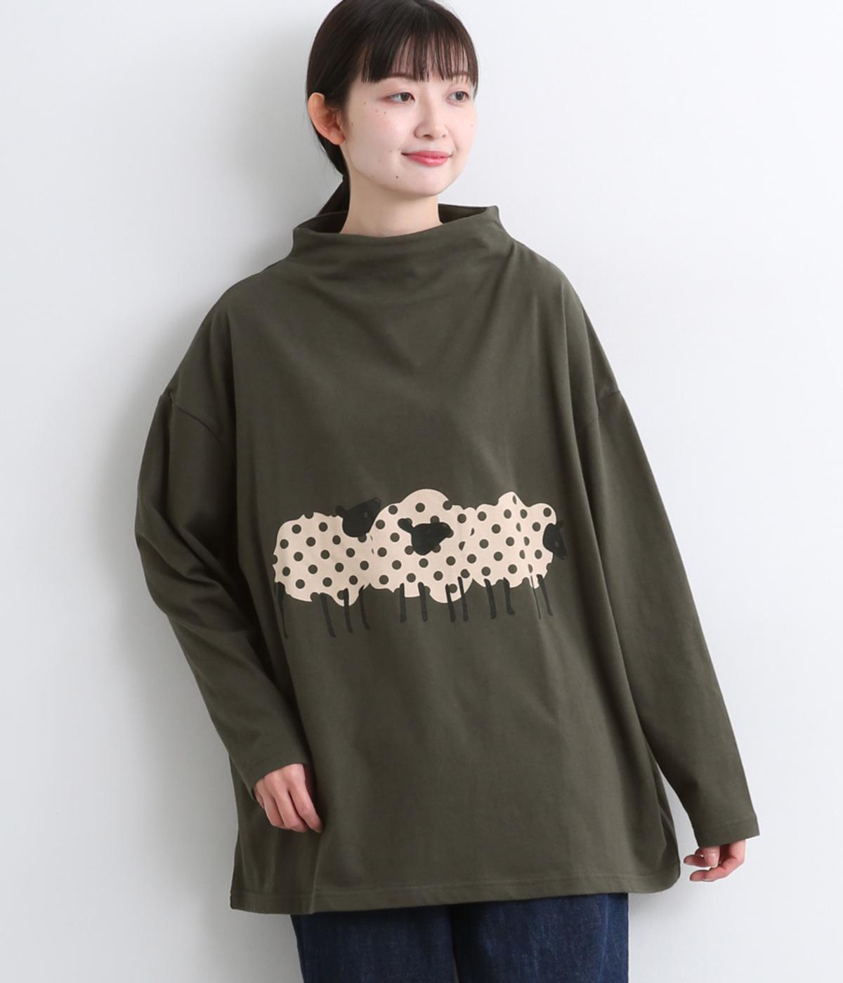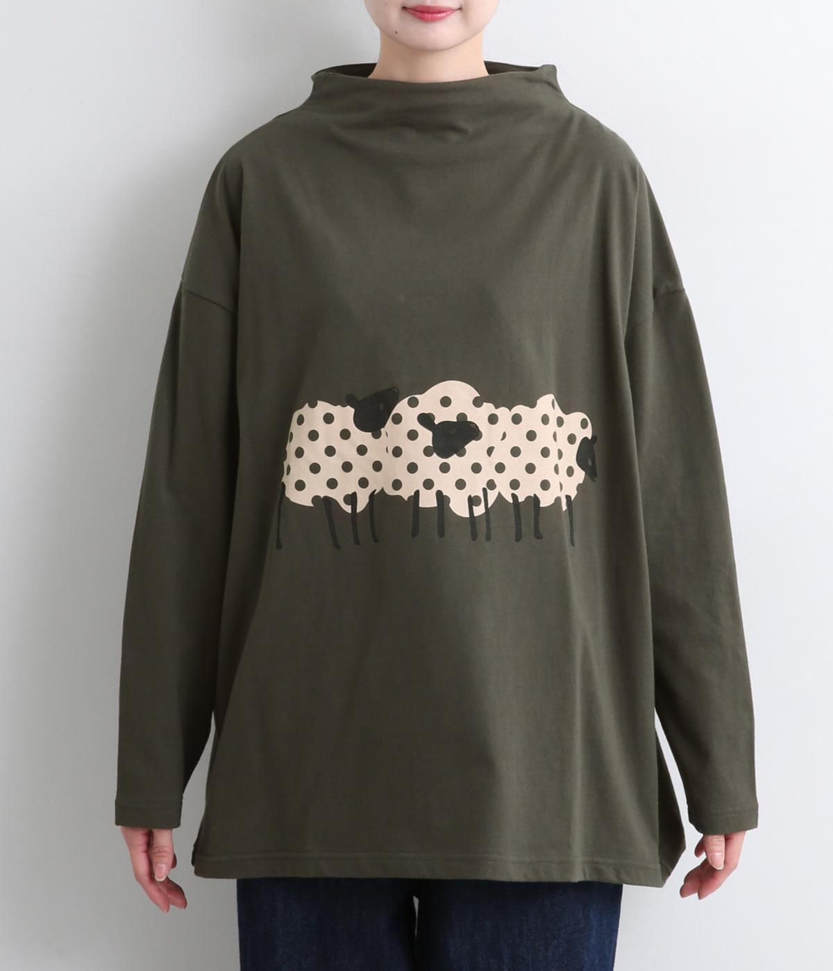 ドット柄の羊たちがインパクトを放ちます。緩やかなモックネックとゆとりのある身幅でリラックス感のある着心地です。腰回りをカバーする長めの丈もうれしいポイント。パンツスタイルにもスカートにもなじみます。