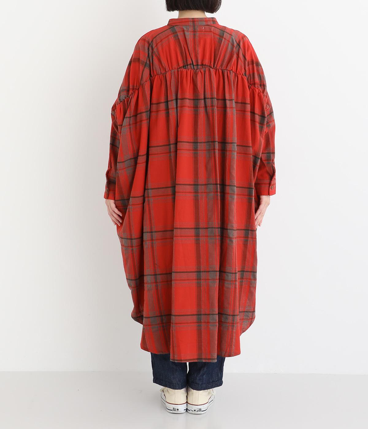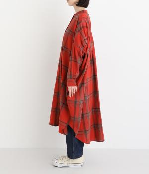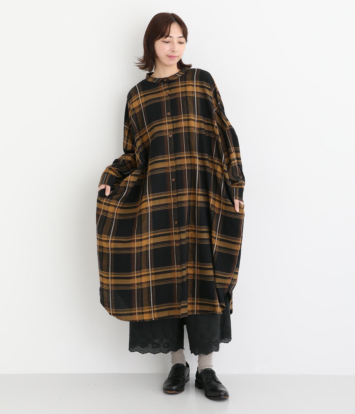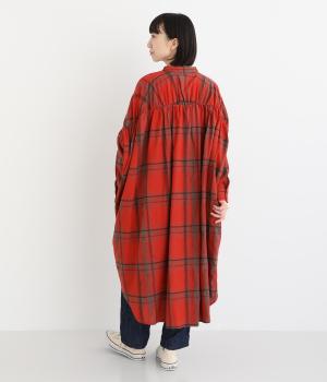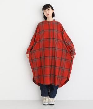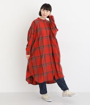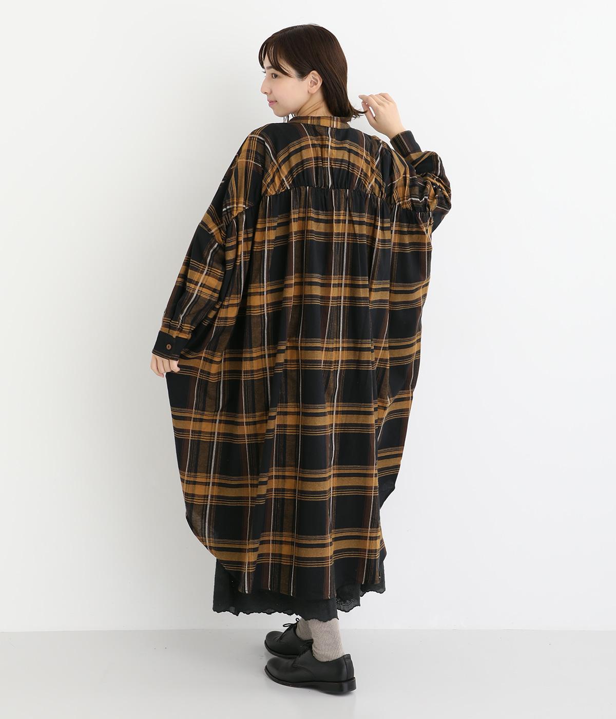 チェック生地をたっぷりと使ってボリューミーに仕上げたワンピース。後ろヨーク切り替えにゴムギャザーを入れ、そこから広がるドレープが華やかさをアップしてくれます。パンツなどとのレイヤードスタイルを好バランスに導く、前後差をつけたラウンドヘムにも注目です。