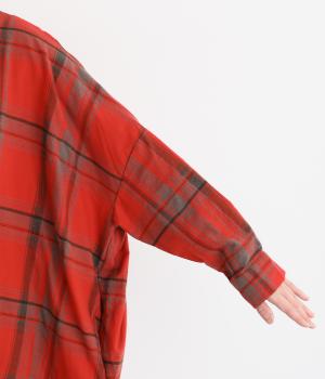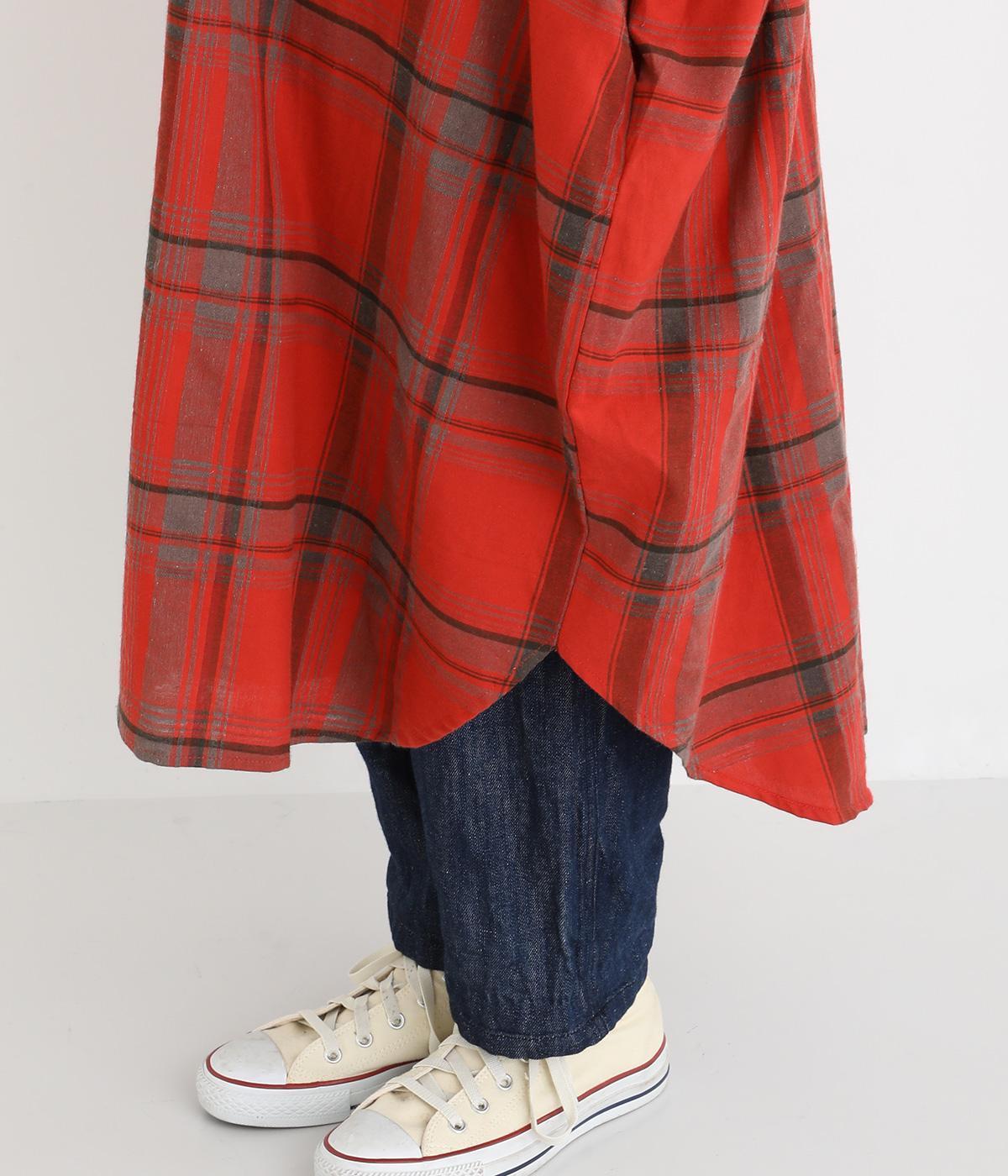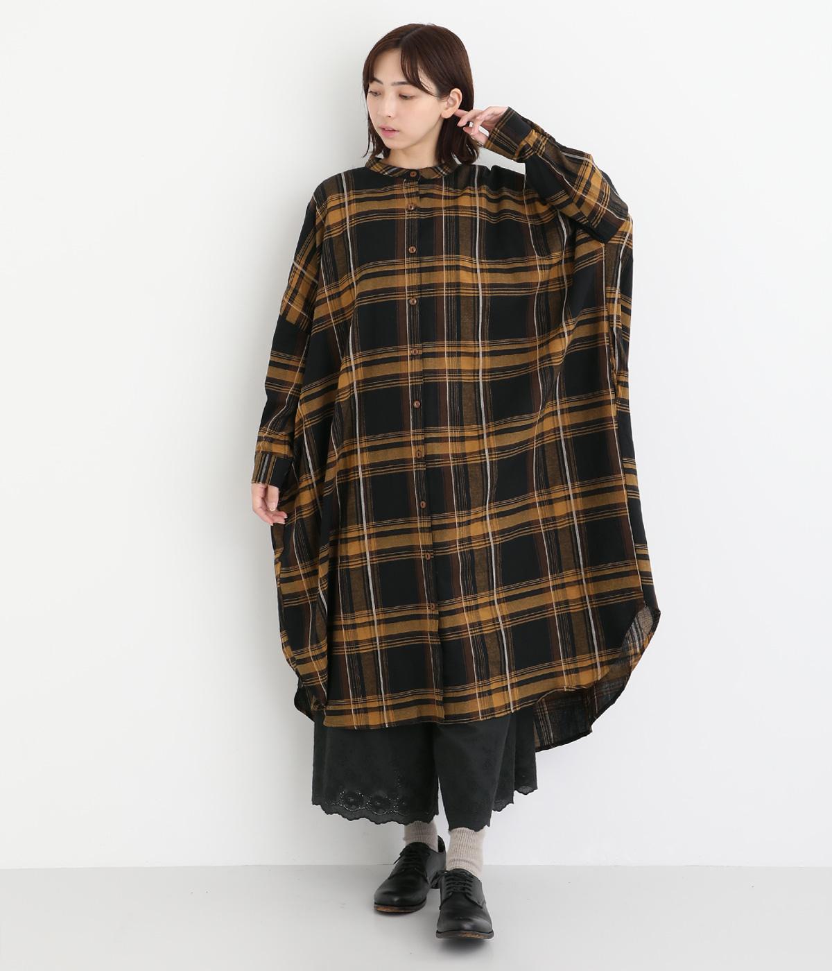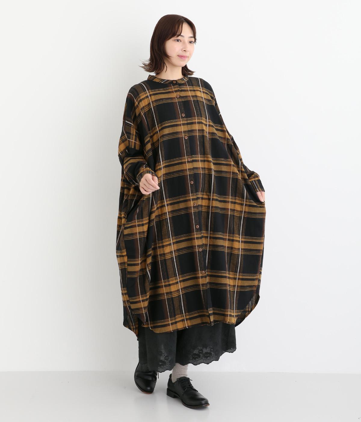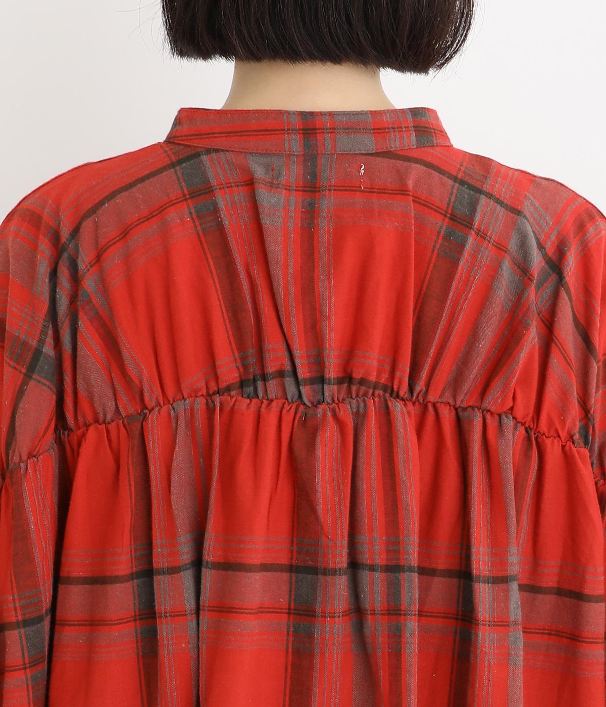チェック生地をたっぷりと使ってボリューミーに仕上げたワンピース。後ろヨーク切り替えにゴムギャザーを入れ、そこから広がるドレープが華やかさをアップしてくれます。パンツなどとのレイヤードスタイルを好バランスに導く、前後差をつけたラウンドヘムにも注目です。