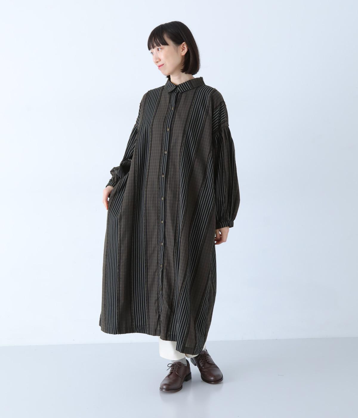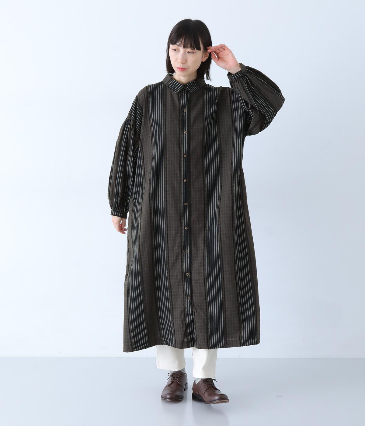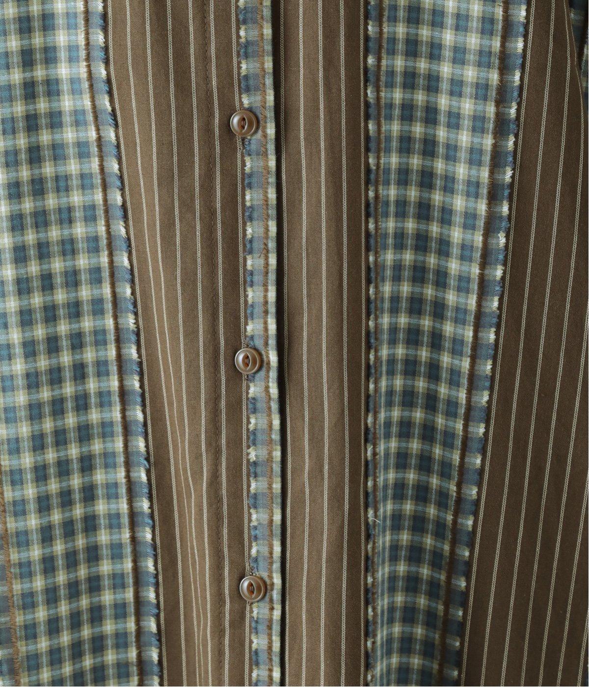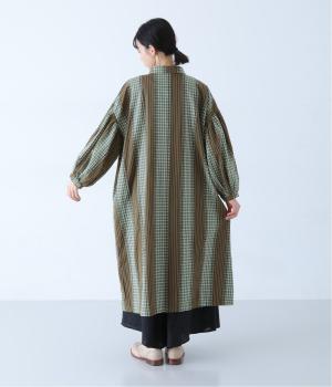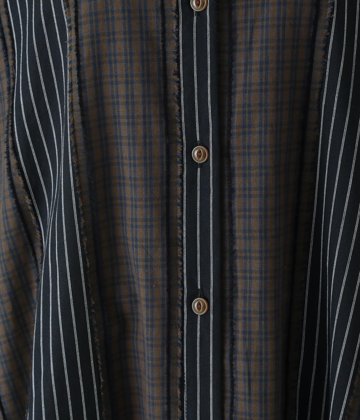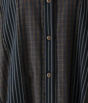 チェック柄とストライプ柄をパッチワークしたこだわりの生地です。接ぎ部分のフリンジがさりげないアクセントに。さらりとした風合いと軽やかな着心地で、一枚ではもちろん、重ね着にも重宝。
