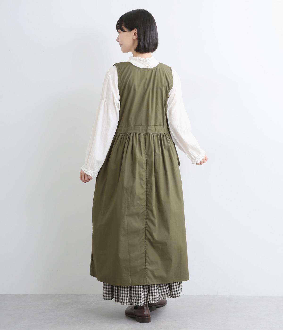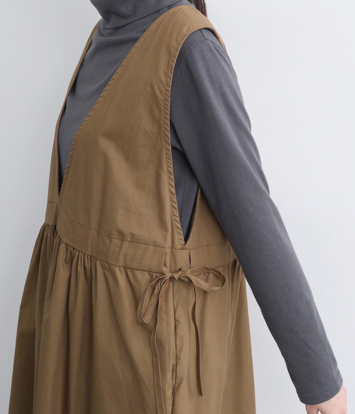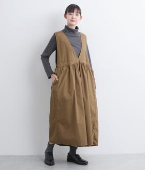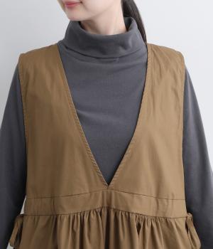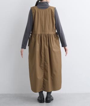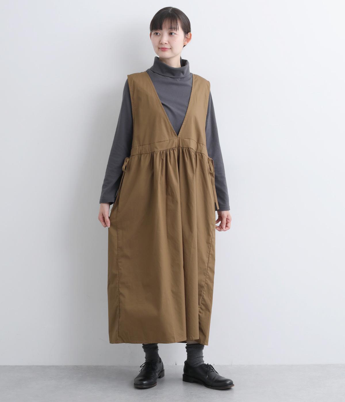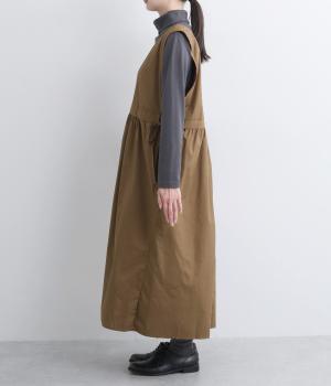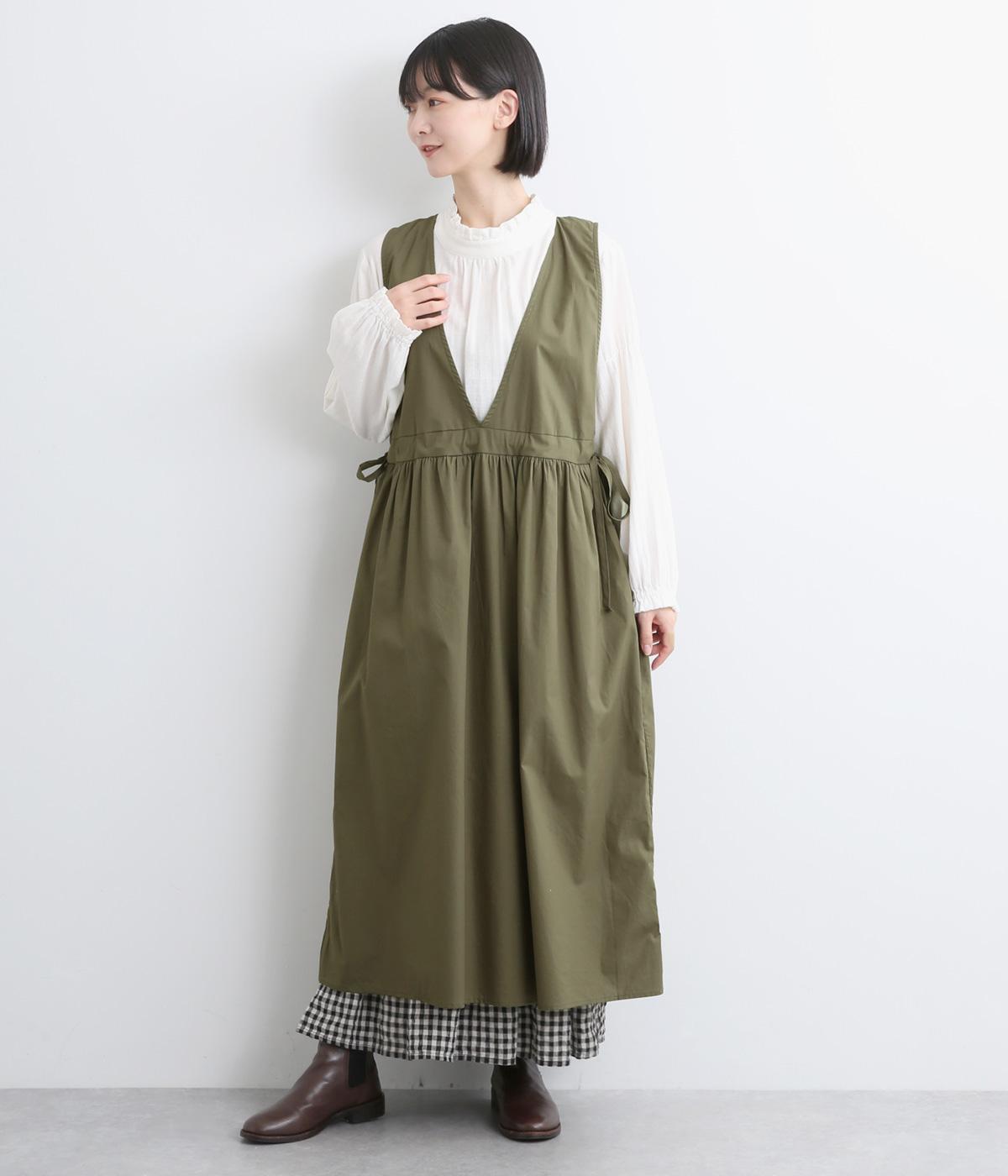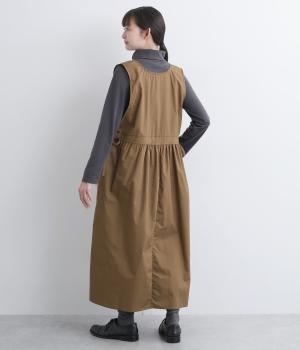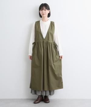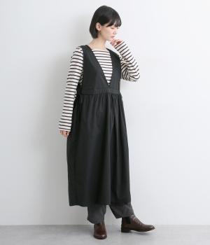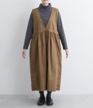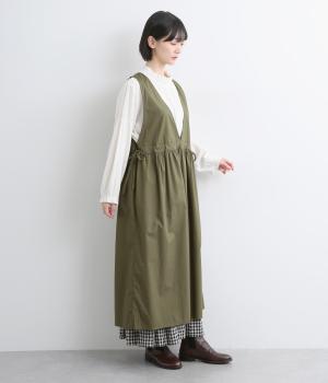 深めのVネックが抜け感をつくり、重ね着してもバランスよく決まるジャンパースカートです。ウエストのギャザーは紐で調整が可能。軽く絞るだけでボリュームが生まれ、立体的なシルエットに。シンプルながらも、女性らしさを感じるデザインに仕立てました。