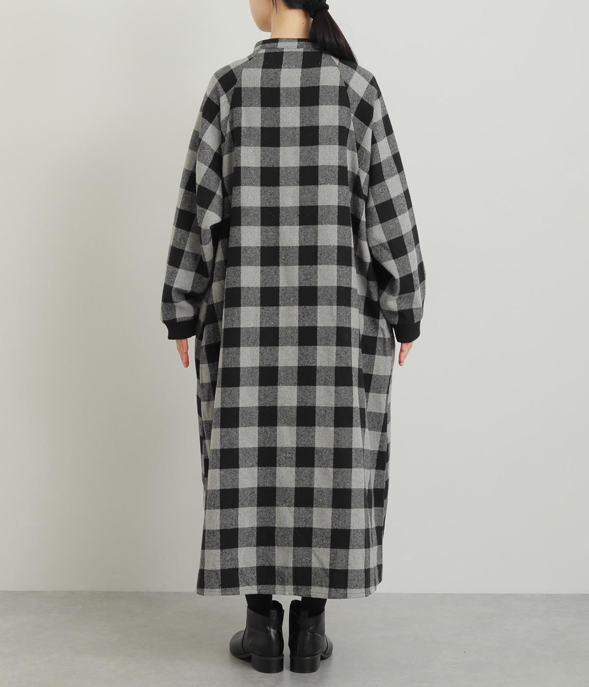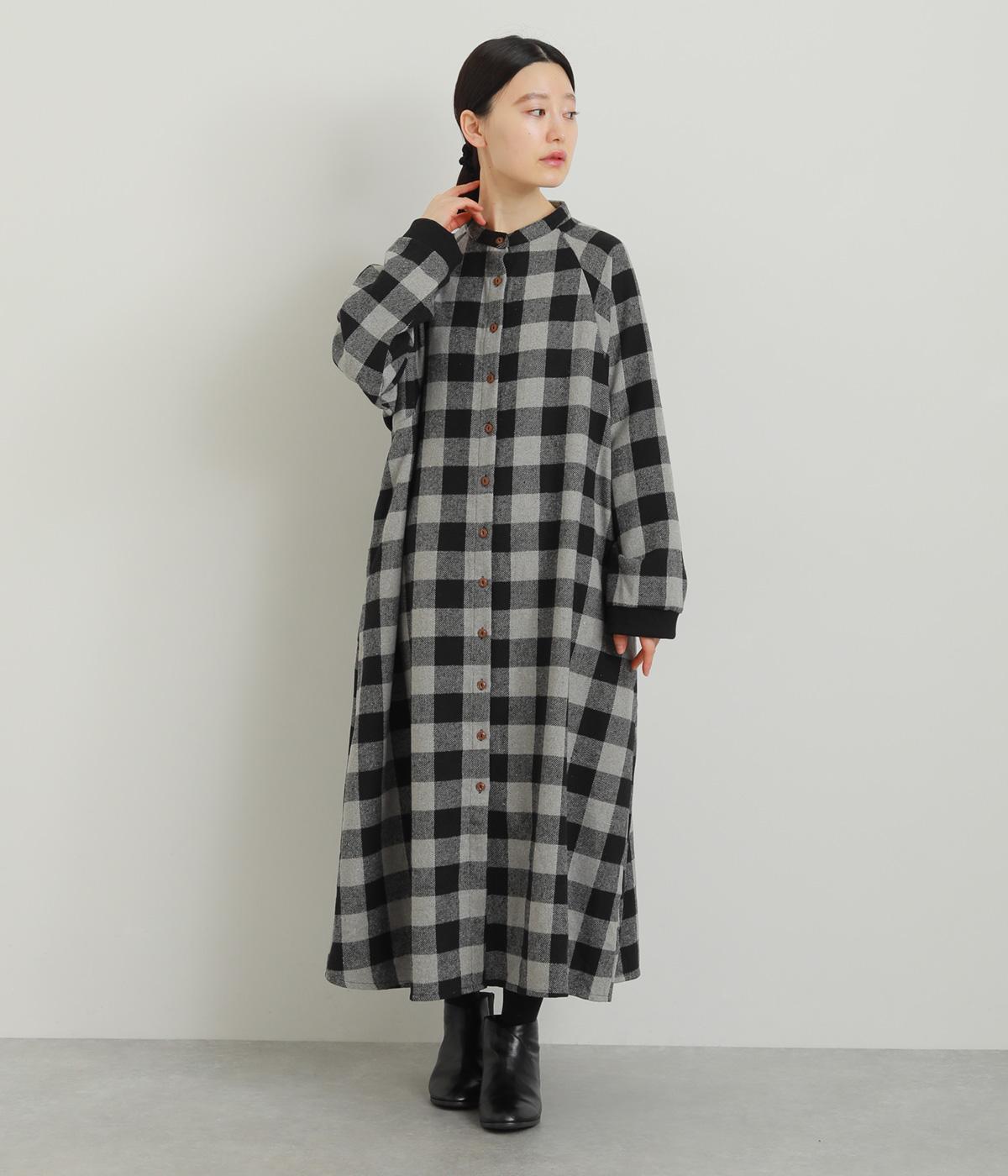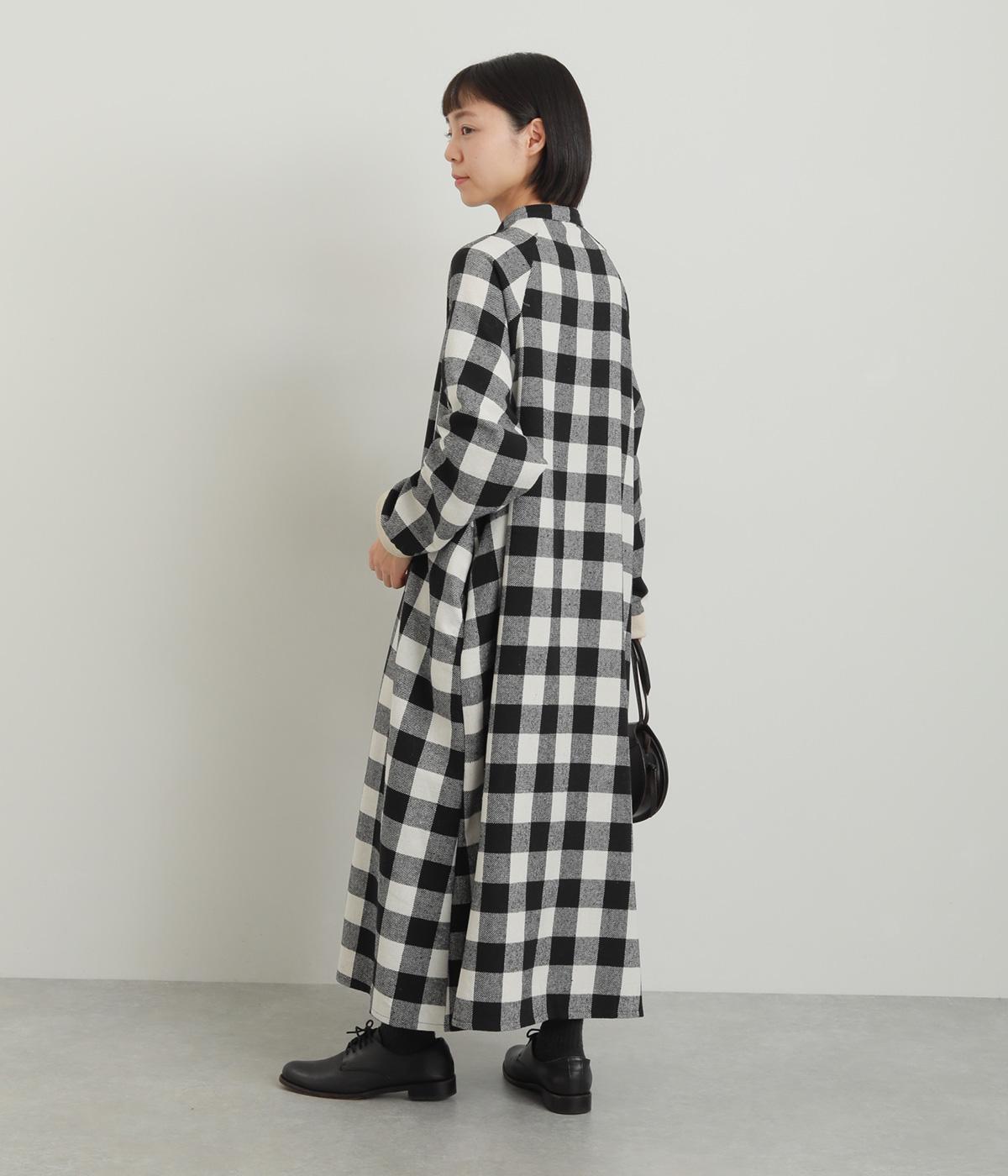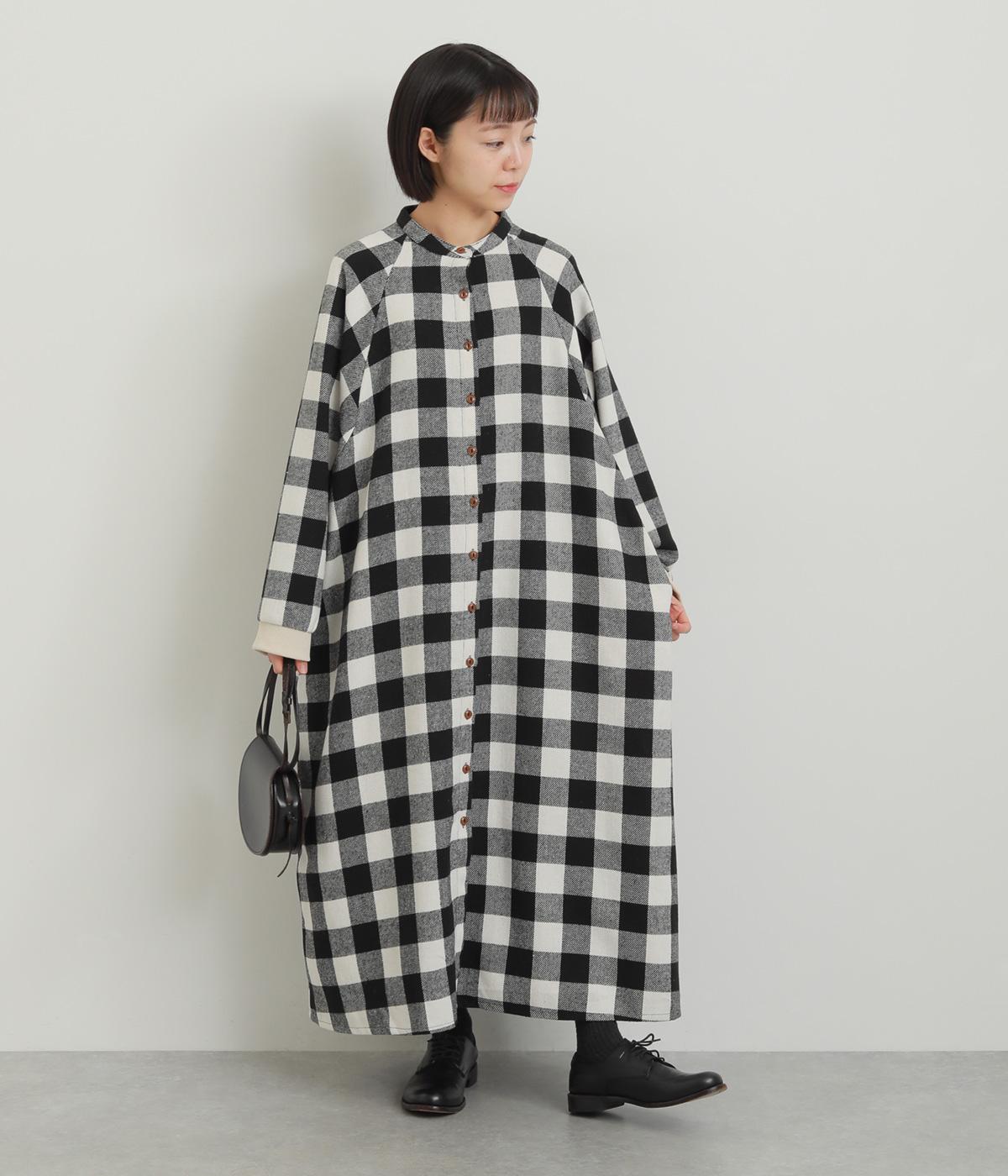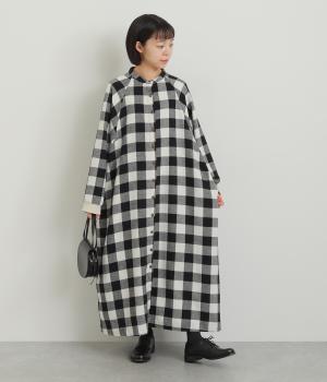 落ち着いたモノトーンながら、大きめのブロックチェック柄が新鮮見えを叶えるワンピース。ゆったりとしたドルマン袖でインナーも着合わせしやすく、袖口のリブ切り替えがちょうどいいアクセントに。ロング丈の前あき仕様です。