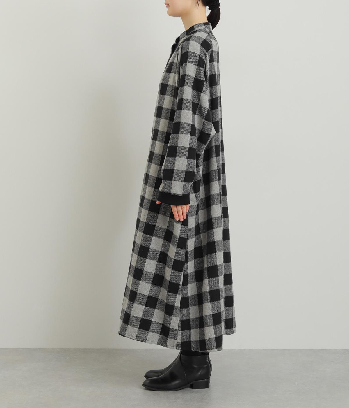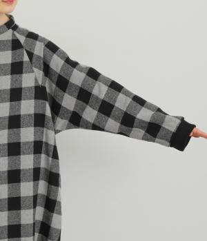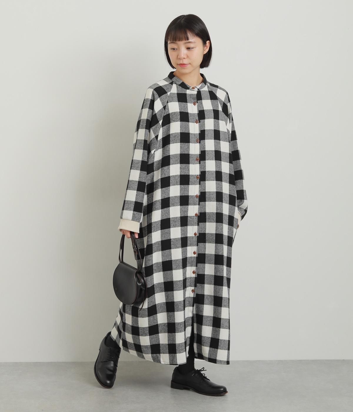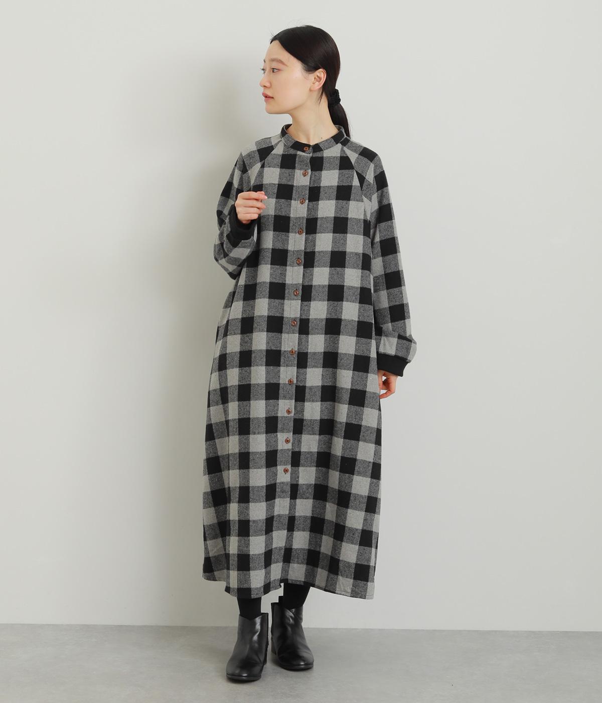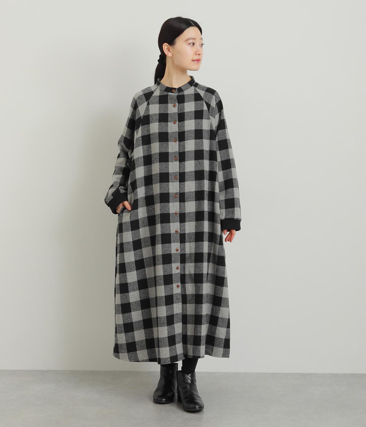 落ち着いたモノトーンながら、大きめのブロックチェック柄が新鮮見えを叶えるワンピース。ゆったりとしたドルマン袖でインナーも着合わせしやすく、袖口のリブ切り替えがちょうどいいアクセントに。ロング丈の前あき仕様です。