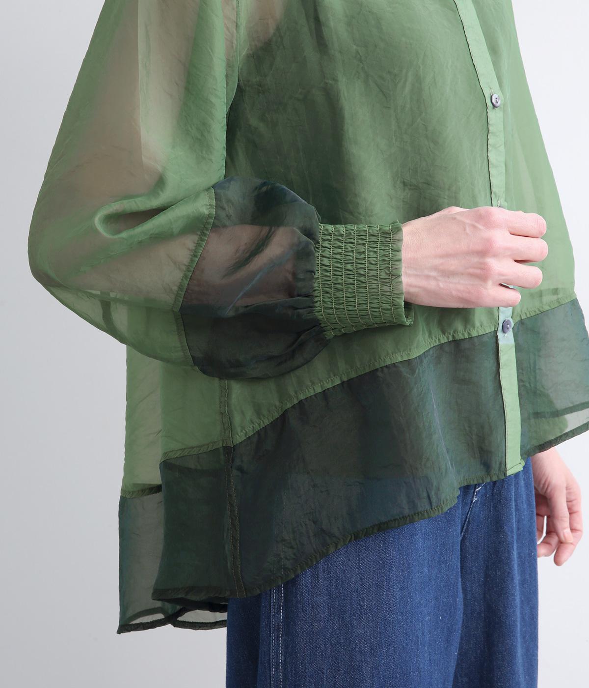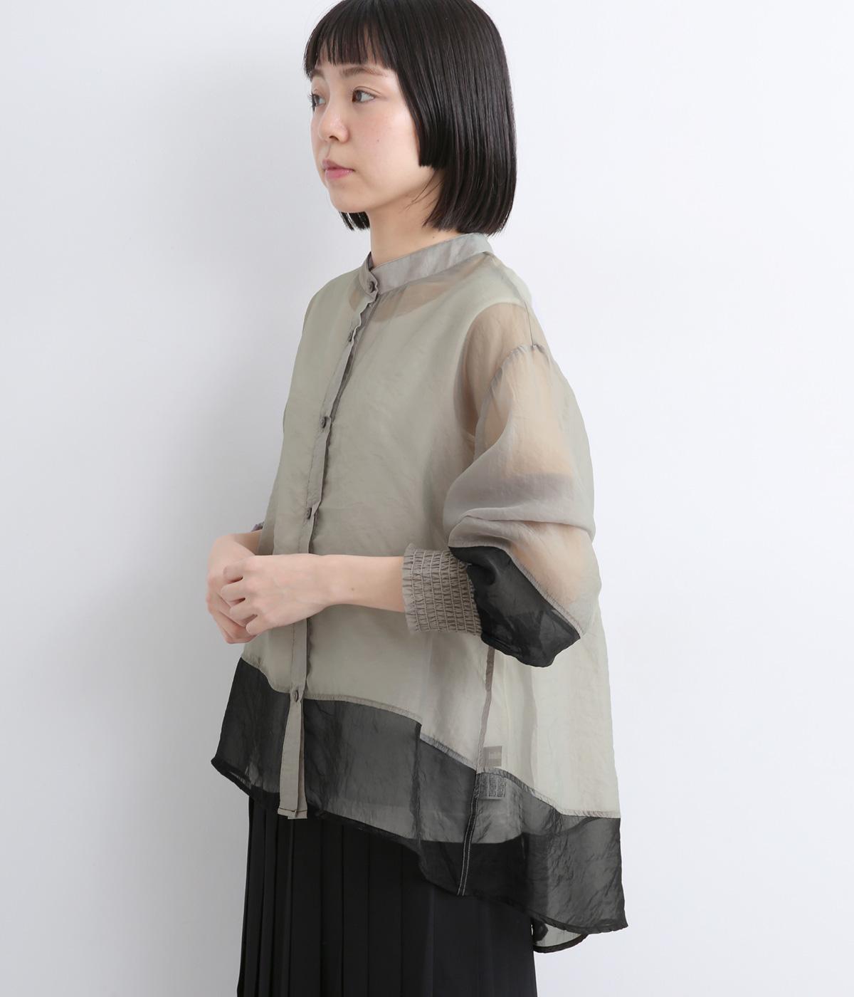 ふんわり広がるAラインシルエットのオーガンジーブラウスです。バイカラーの配色がさりげなく個性を添え、シャーリングが立体感とやさしい表情を生みます。透け感のある素材で軽やかに動き、デイリーにもお出かけにも活躍する一枚です。