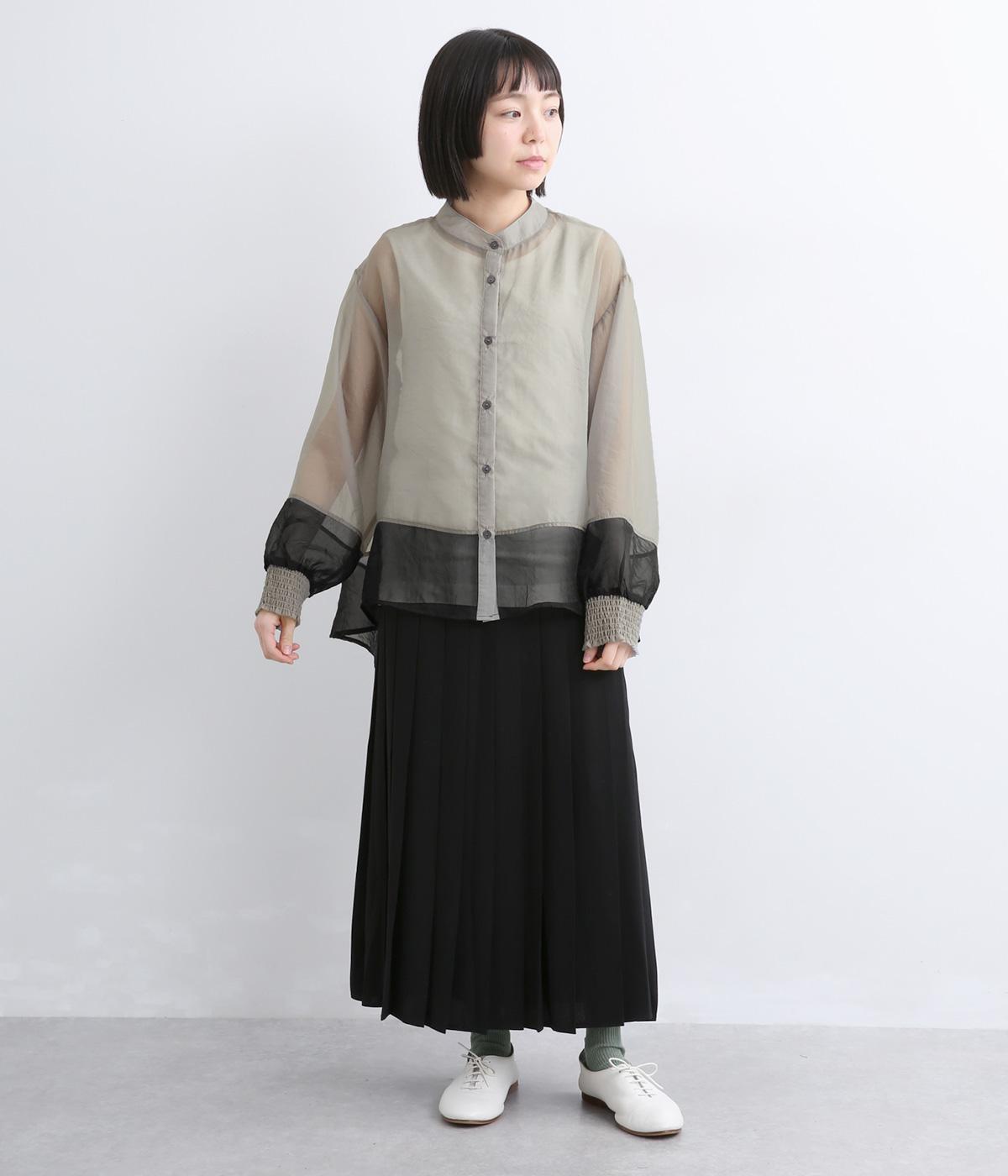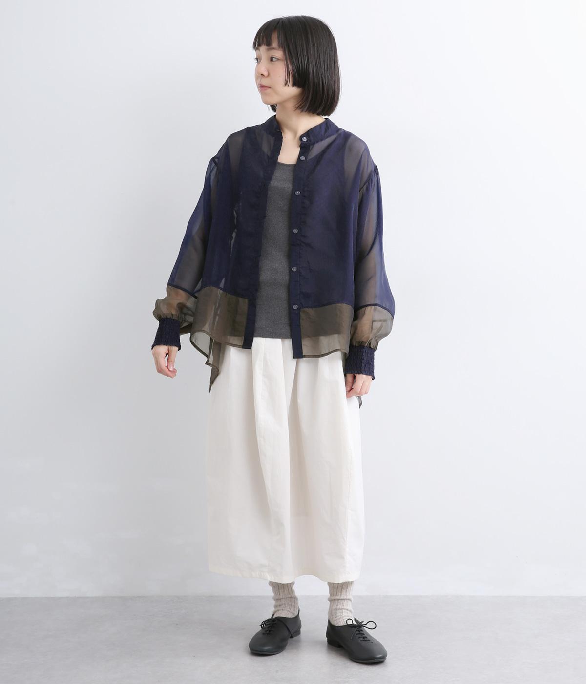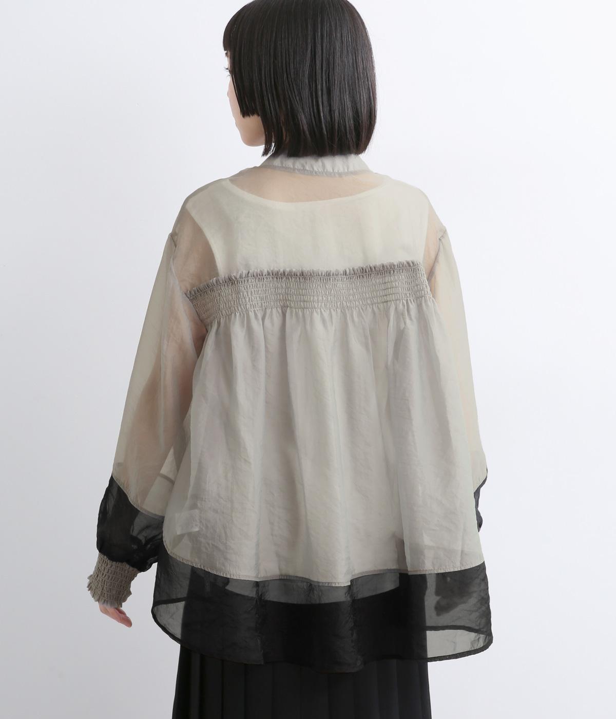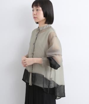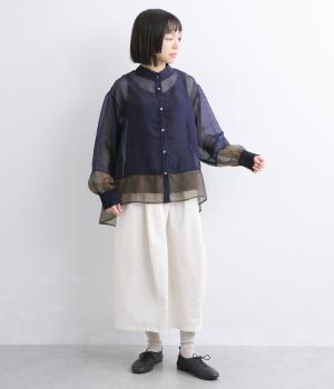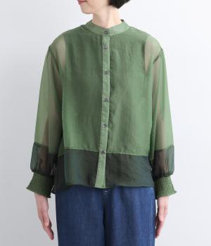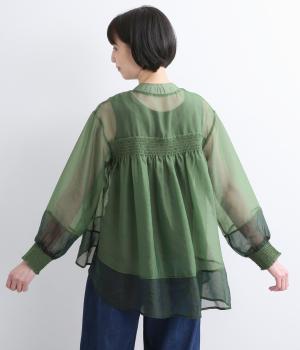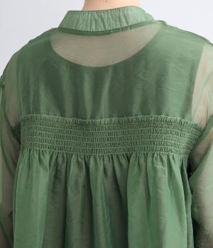 ポリエステルとナイロンの混紡オーガンジーは、ハリと光沢のある薄手の生地です。透け感がありつつ立体的なシルエットを作り、袖口やヨークのシャーリングは伸縮性があって快適な着心地です。