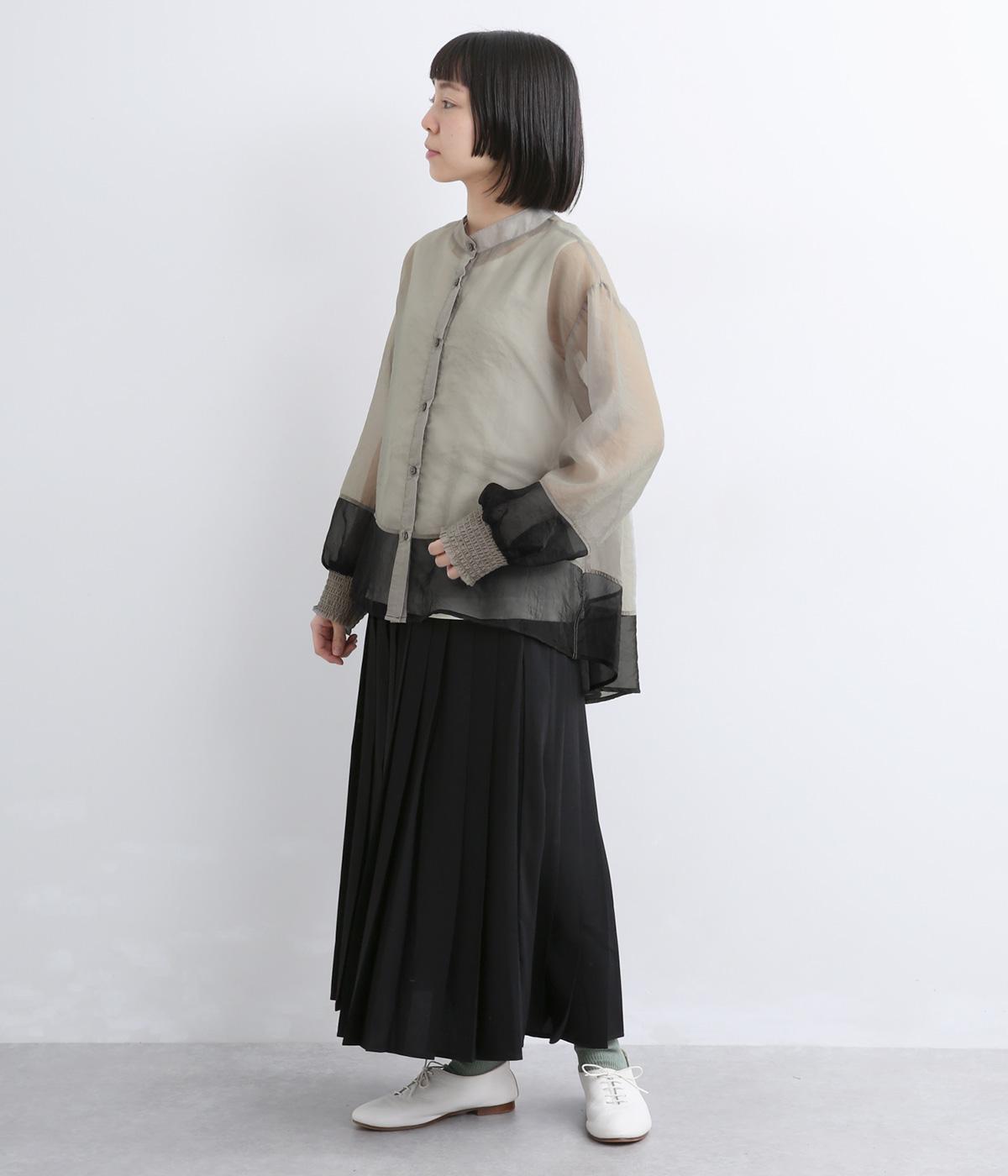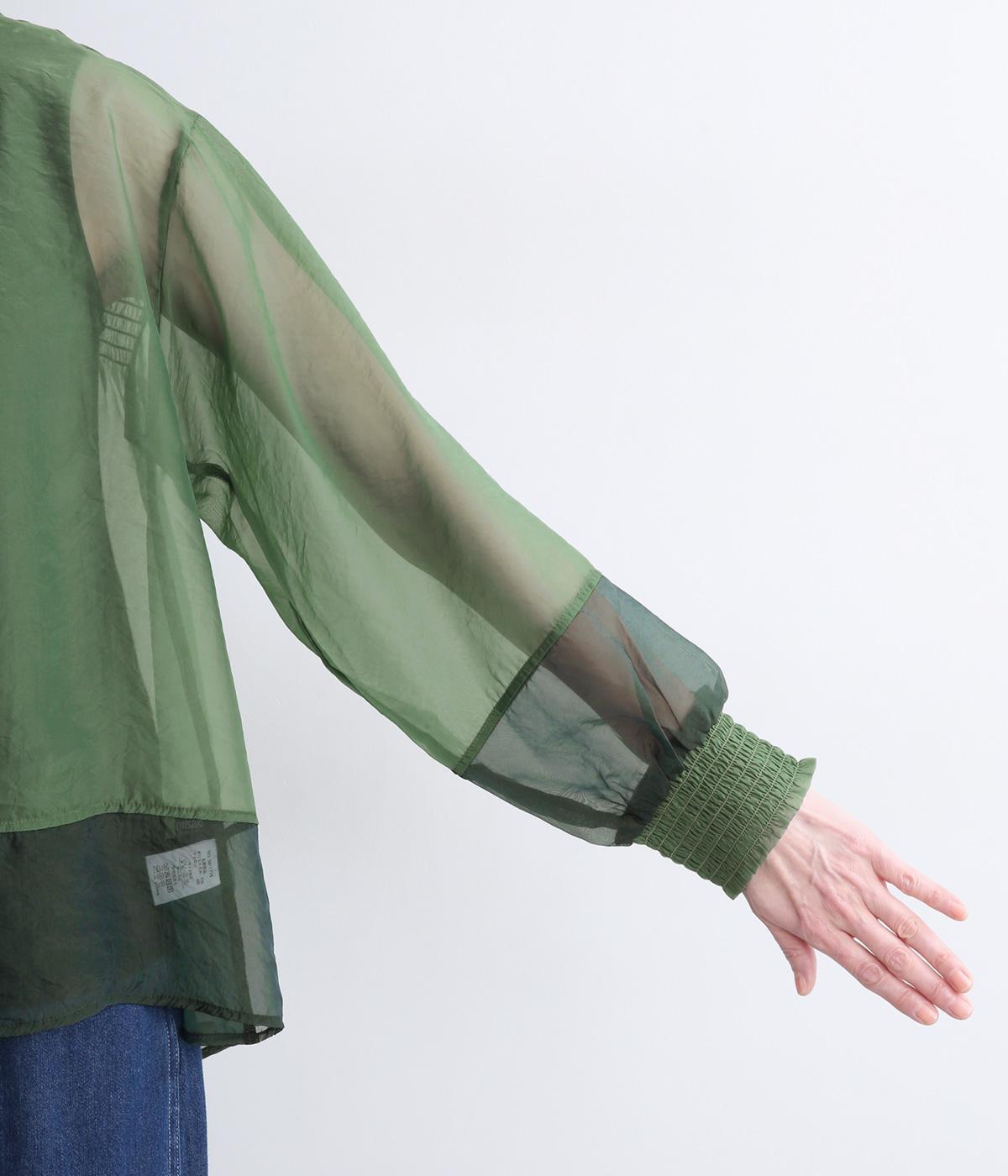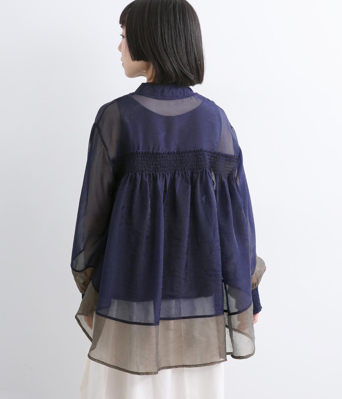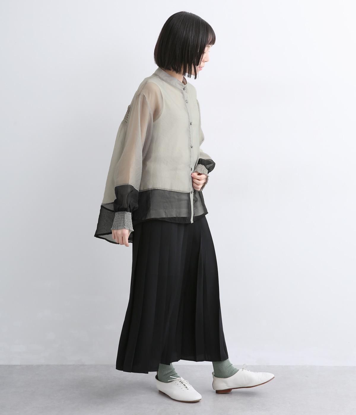 ポリエステルとナイロンの混紡オーガンジーは、ハリと光沢のある薄手の生地です。透け感がありつつ立体的なシルエットを作り、袖口やヨークのシャーリングは伸縮性があって快適な着心地です。