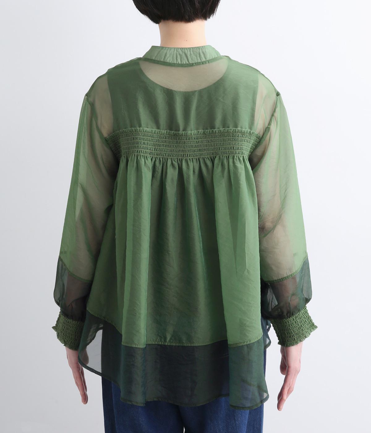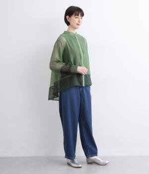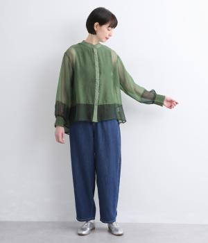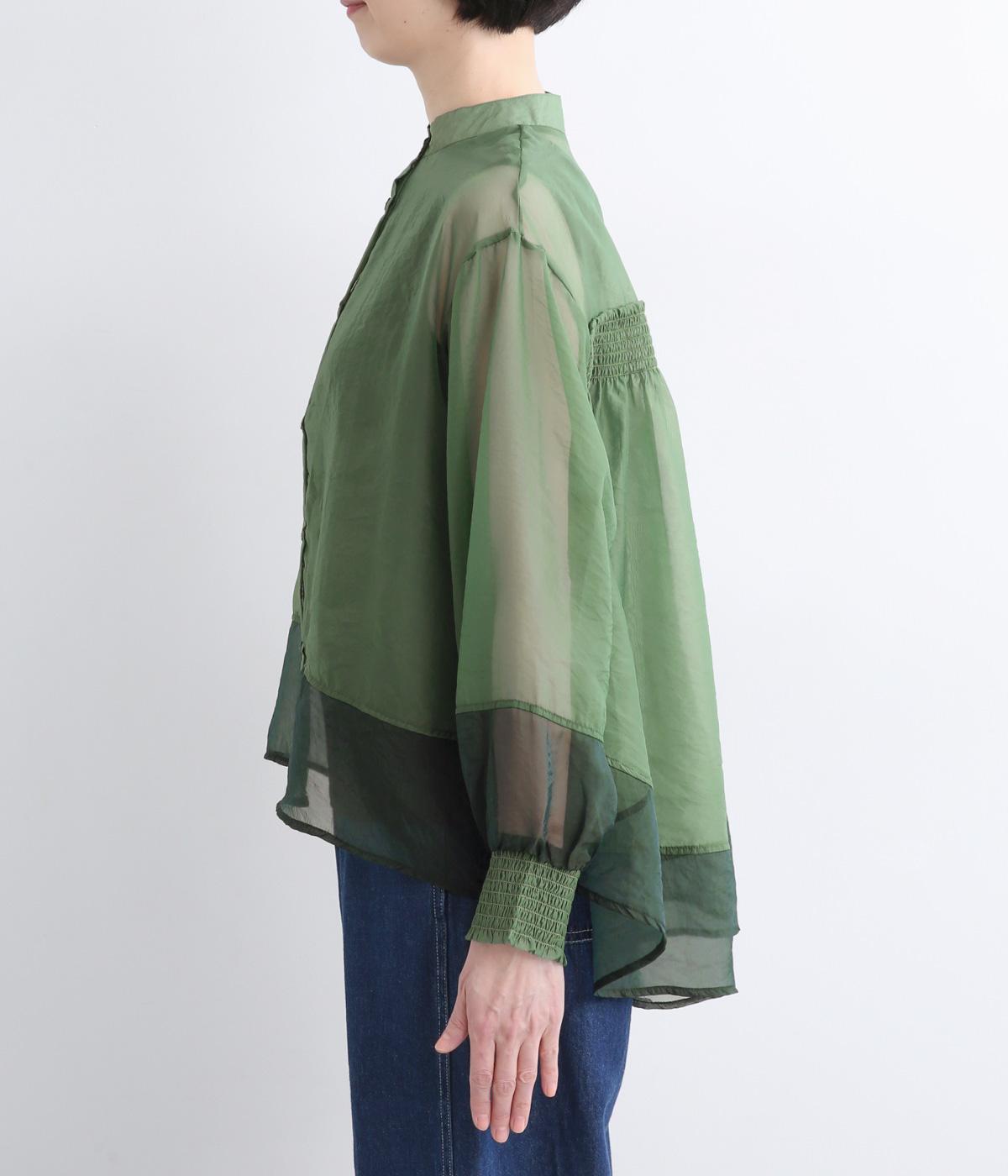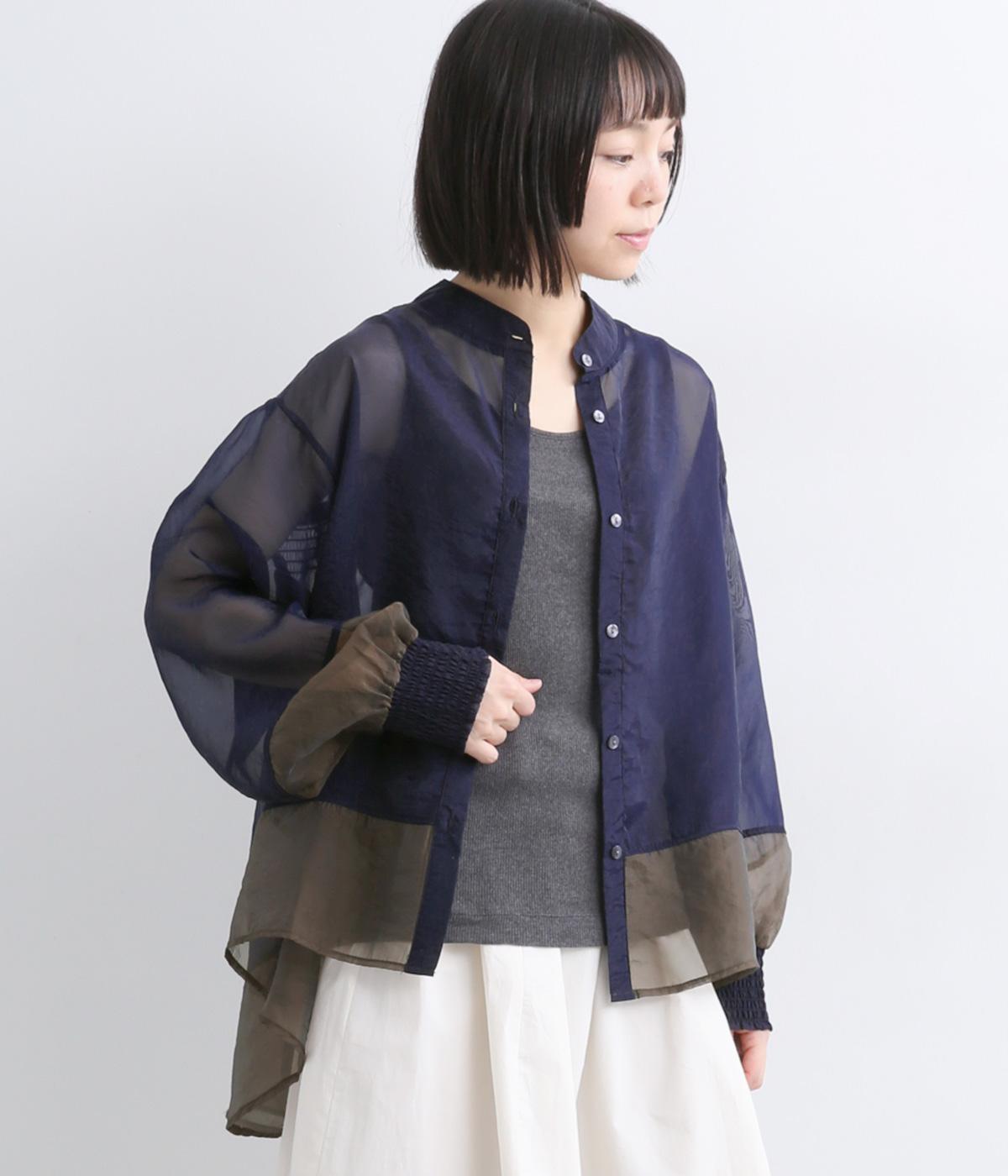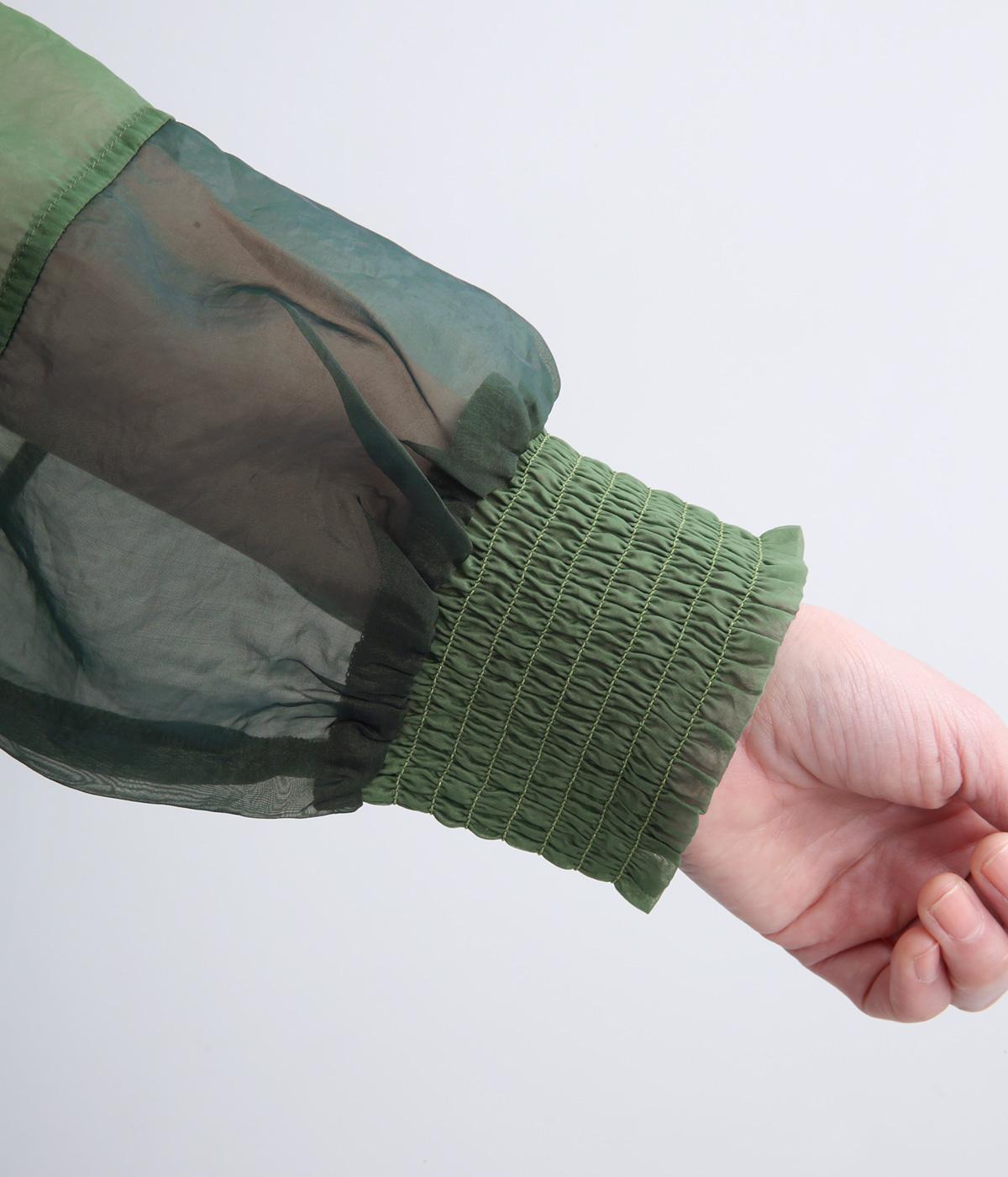 ポリエステルとナイロンの混紡オーガンジーは、ハリと光沢のある薄手の生地です。透け感がありつつ立体的なシルエットを作り、袖口やヨークのシャーリングは伸縮性があって快適な着心地です。
