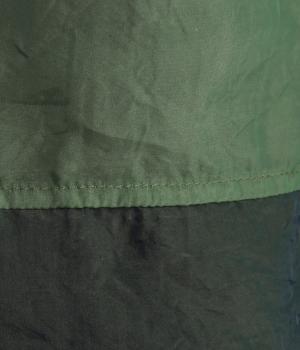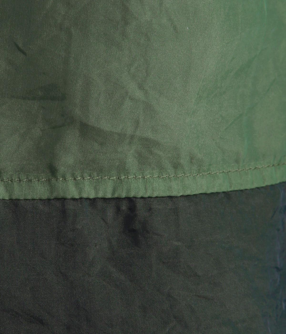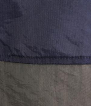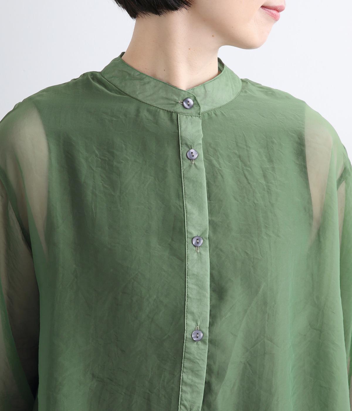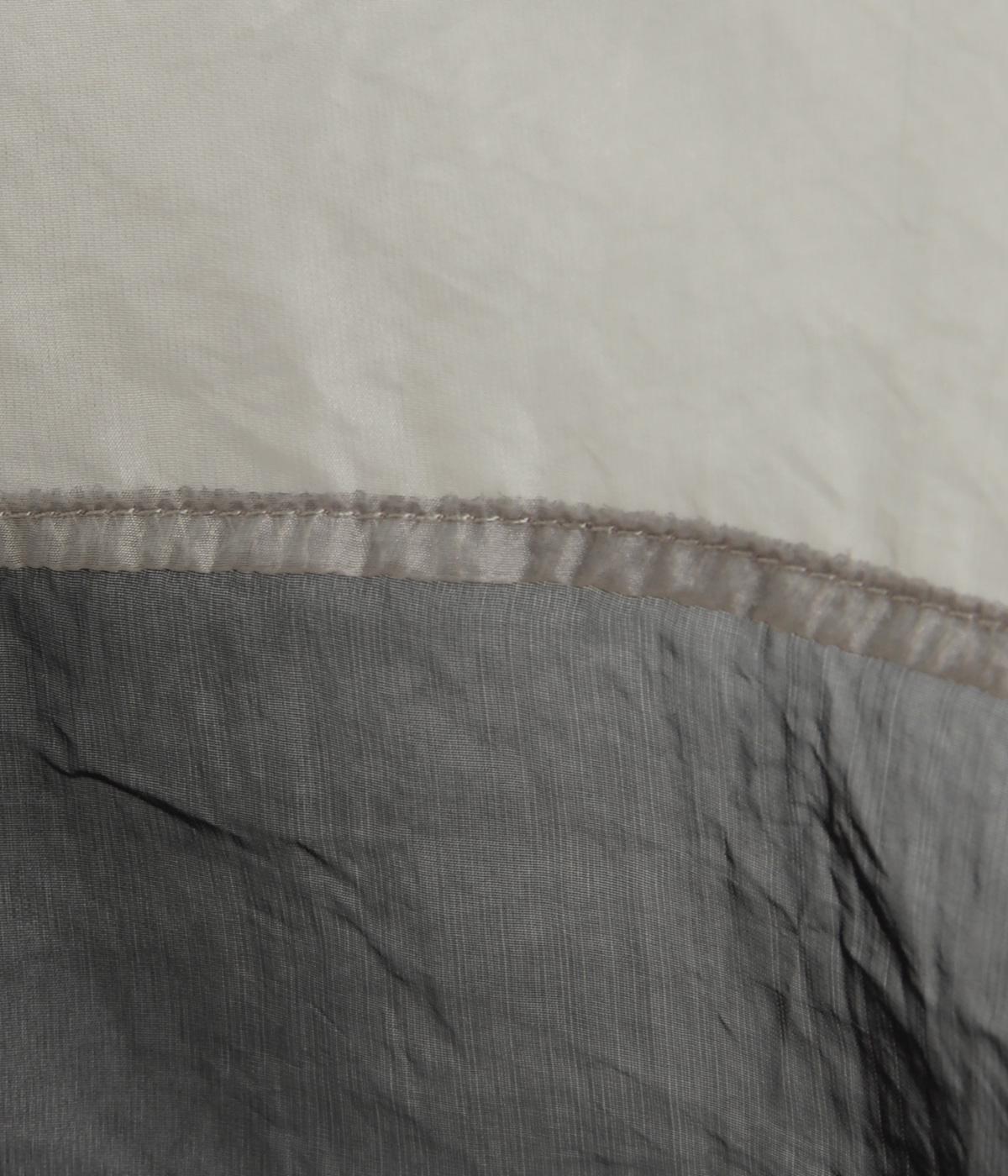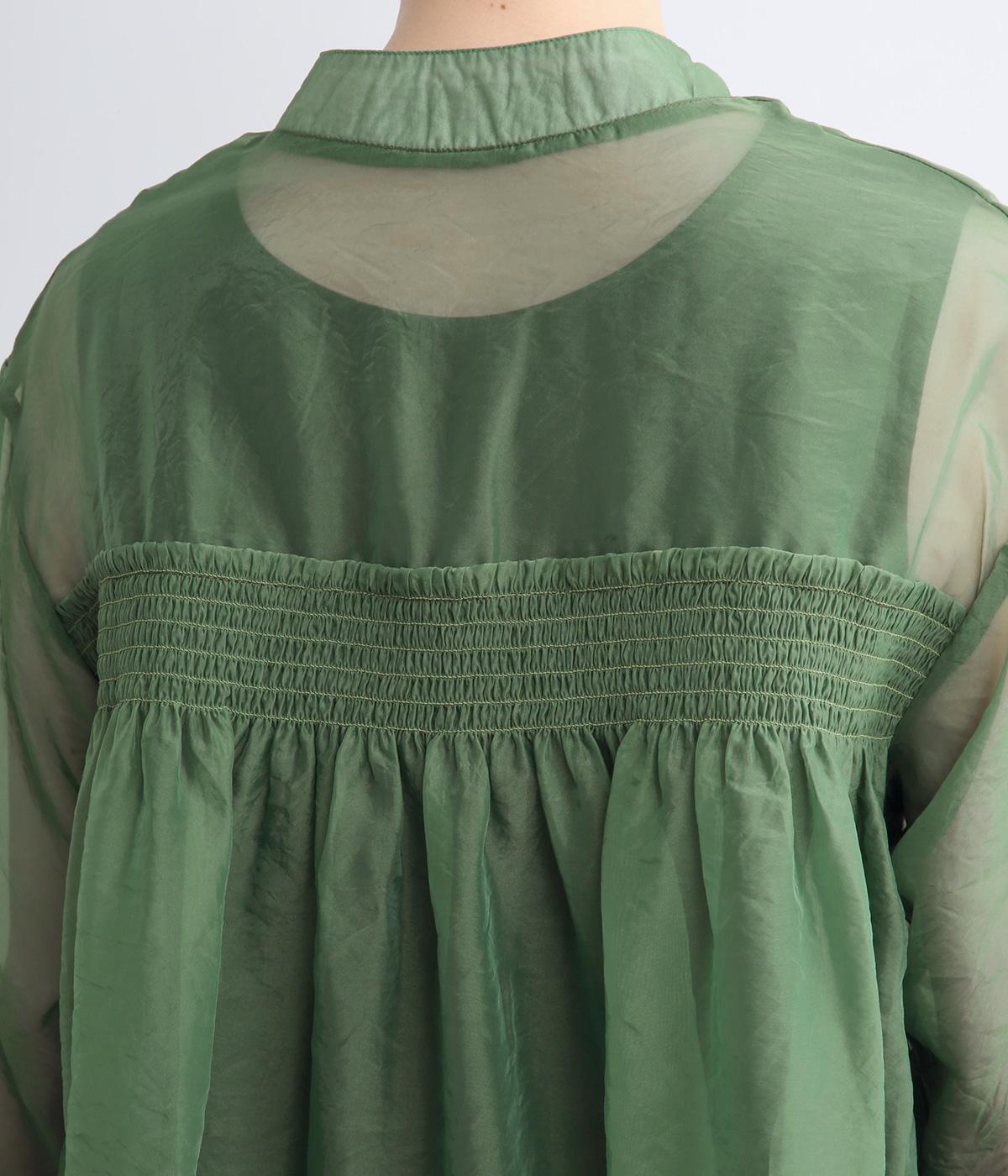 ポリエステルとナイロンの混紡オーガンジーは、ハリと光沢のある薄手の生地です。透け感がありつつ立体的なシルエットを作り、袖口やヨークのシャーリングは伸縮性があって快適な着心地です。
