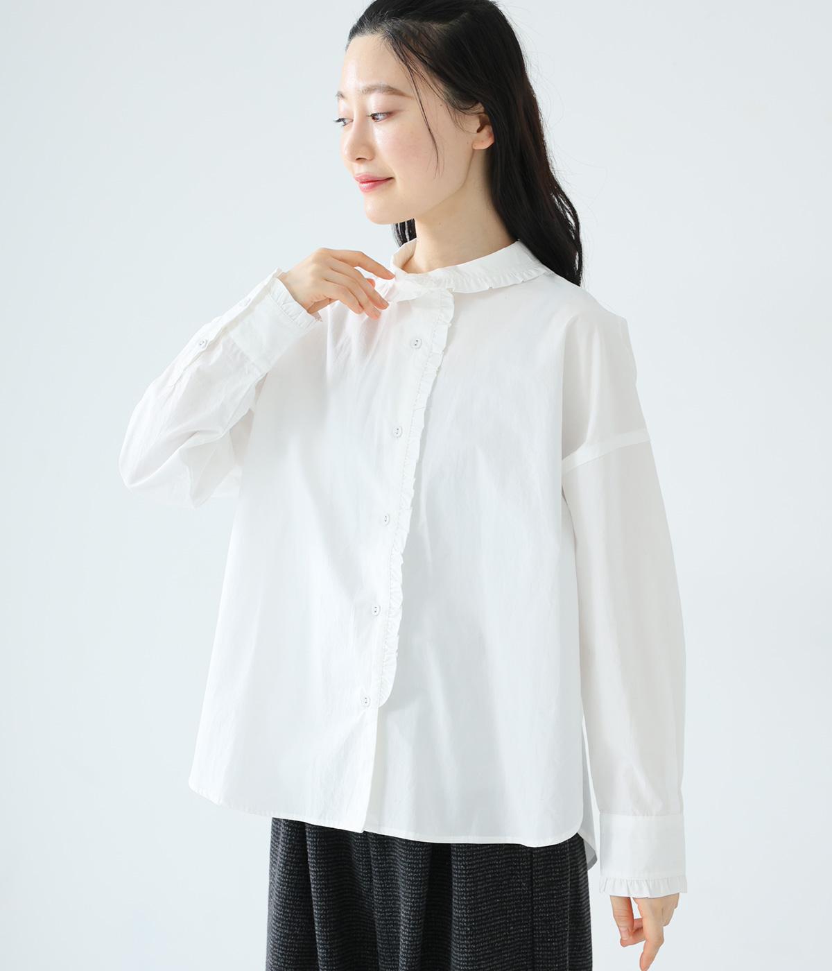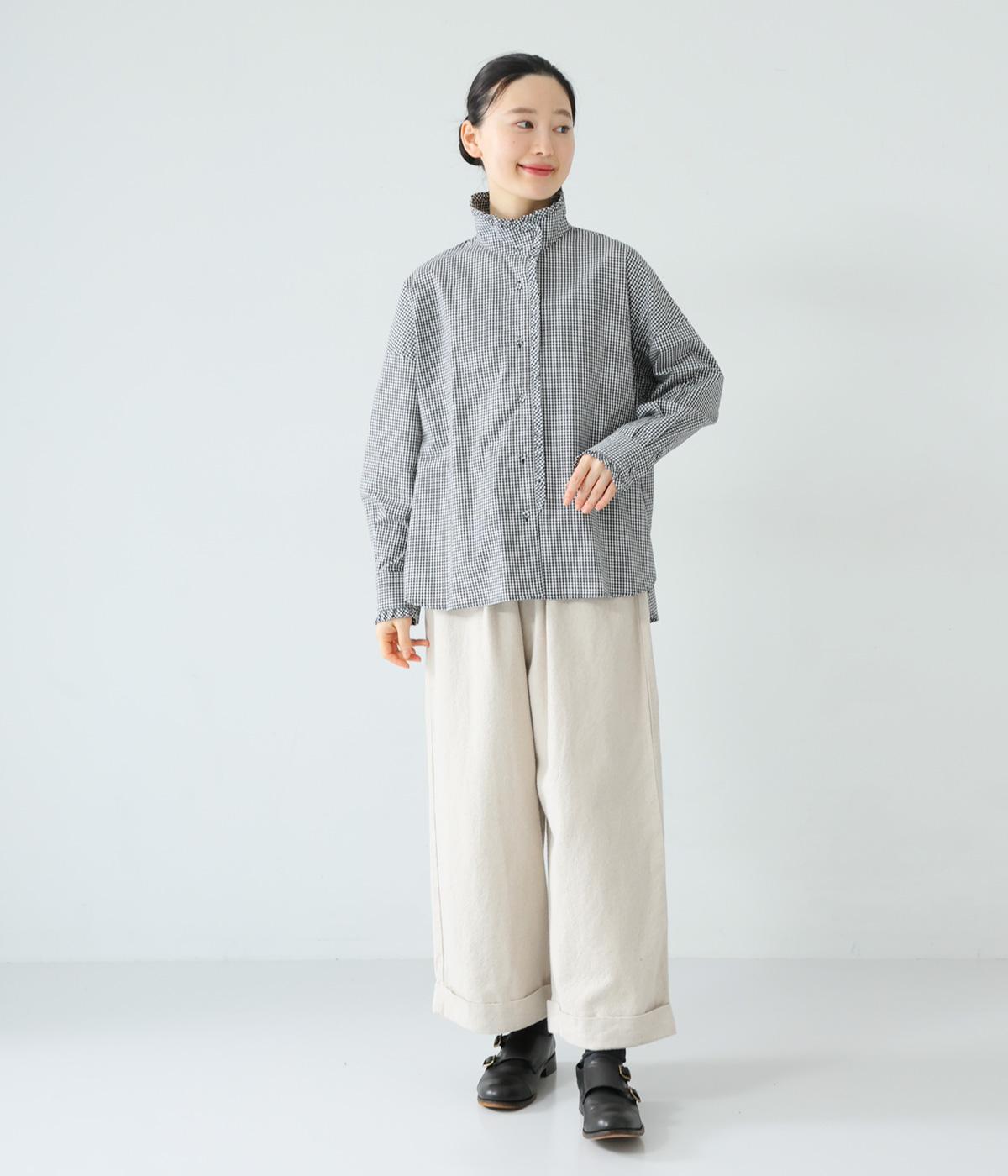 コーディネートに大人の甘さをプラスする、クラシカルなハイネックフリルシャツ。襟はパタンと折り返しても着用できる2way仕様です。下前立ての配色や共布のくるみボタンなど、ディテールへのこだわりが詰まった一枚。