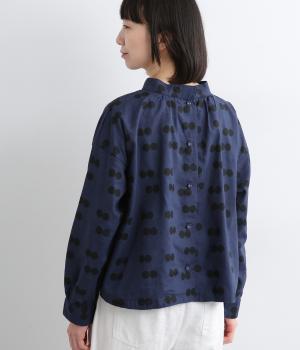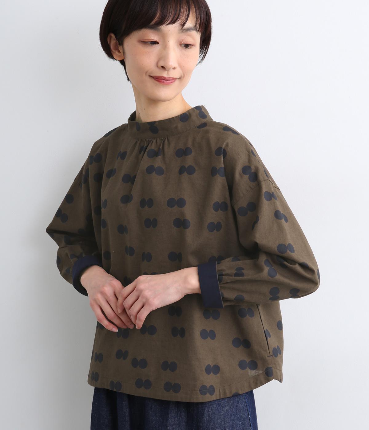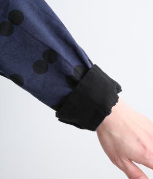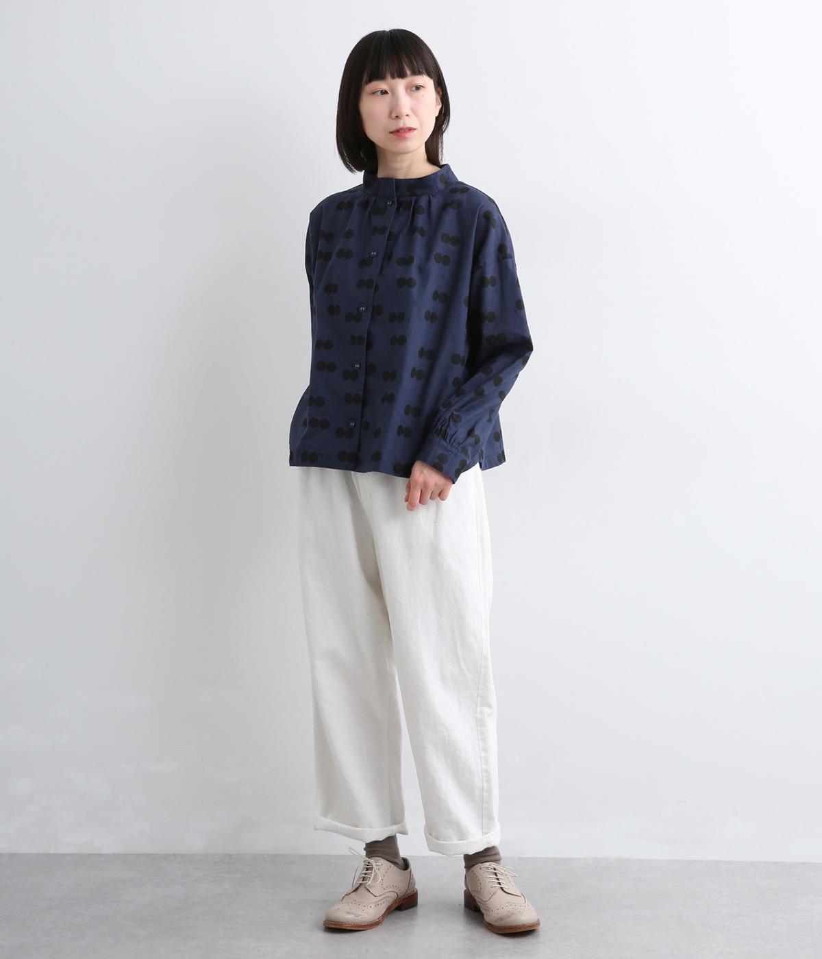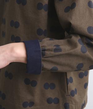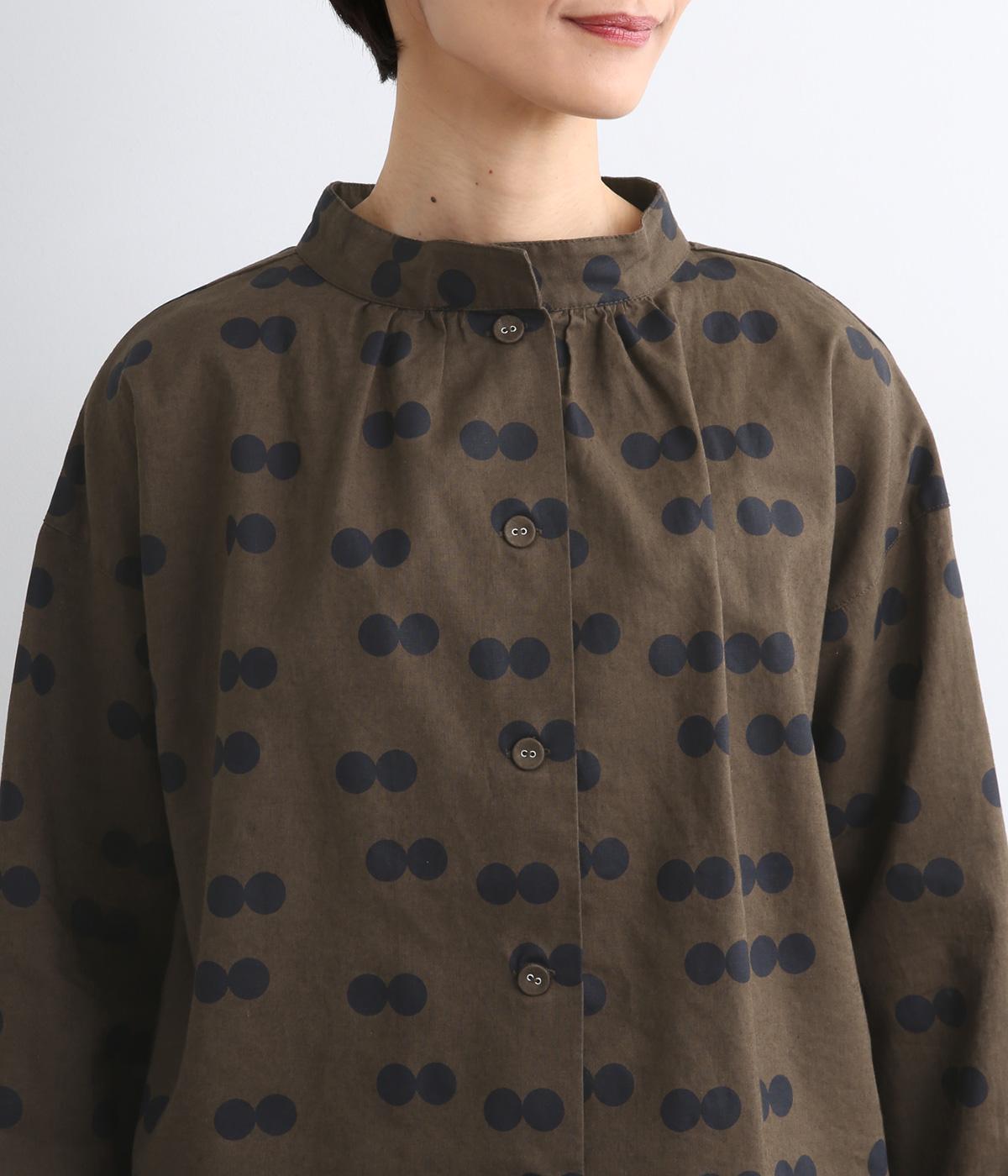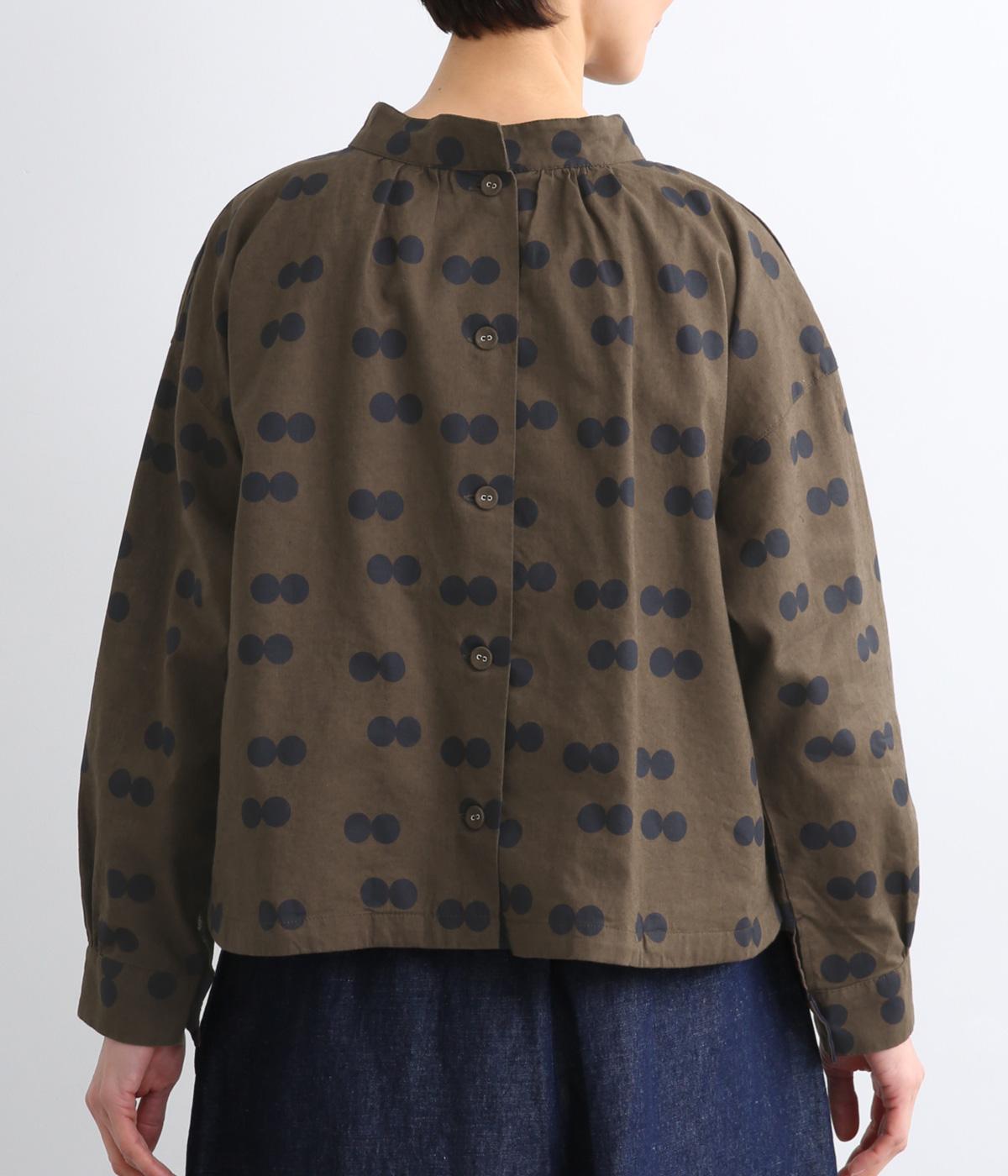 ふたつ並んだドット柄がレトロな雰囲気を醸すブラウスは、前後どちらでもたのしめる2way仕立てです。すこし太めのスタンドカラーにギャザーをほどこして女性らしいニュアンスに。袖をラフに折り返して配色裏をのぞかせた着こなしもおすすめ。
