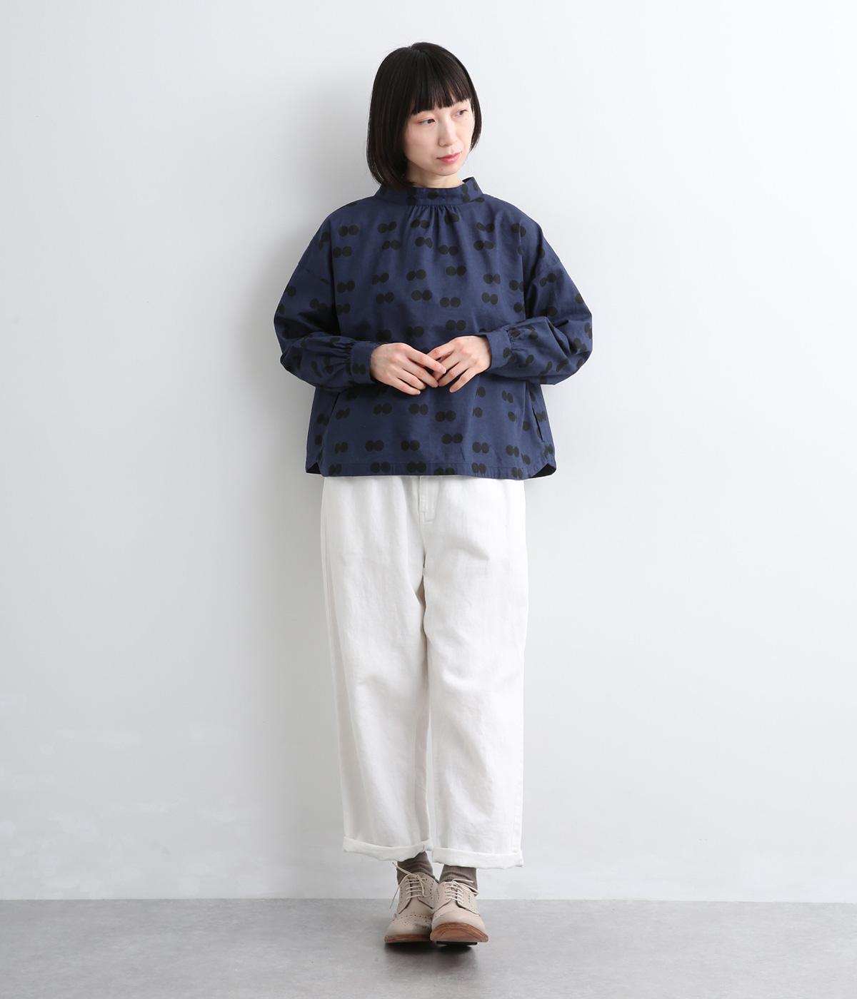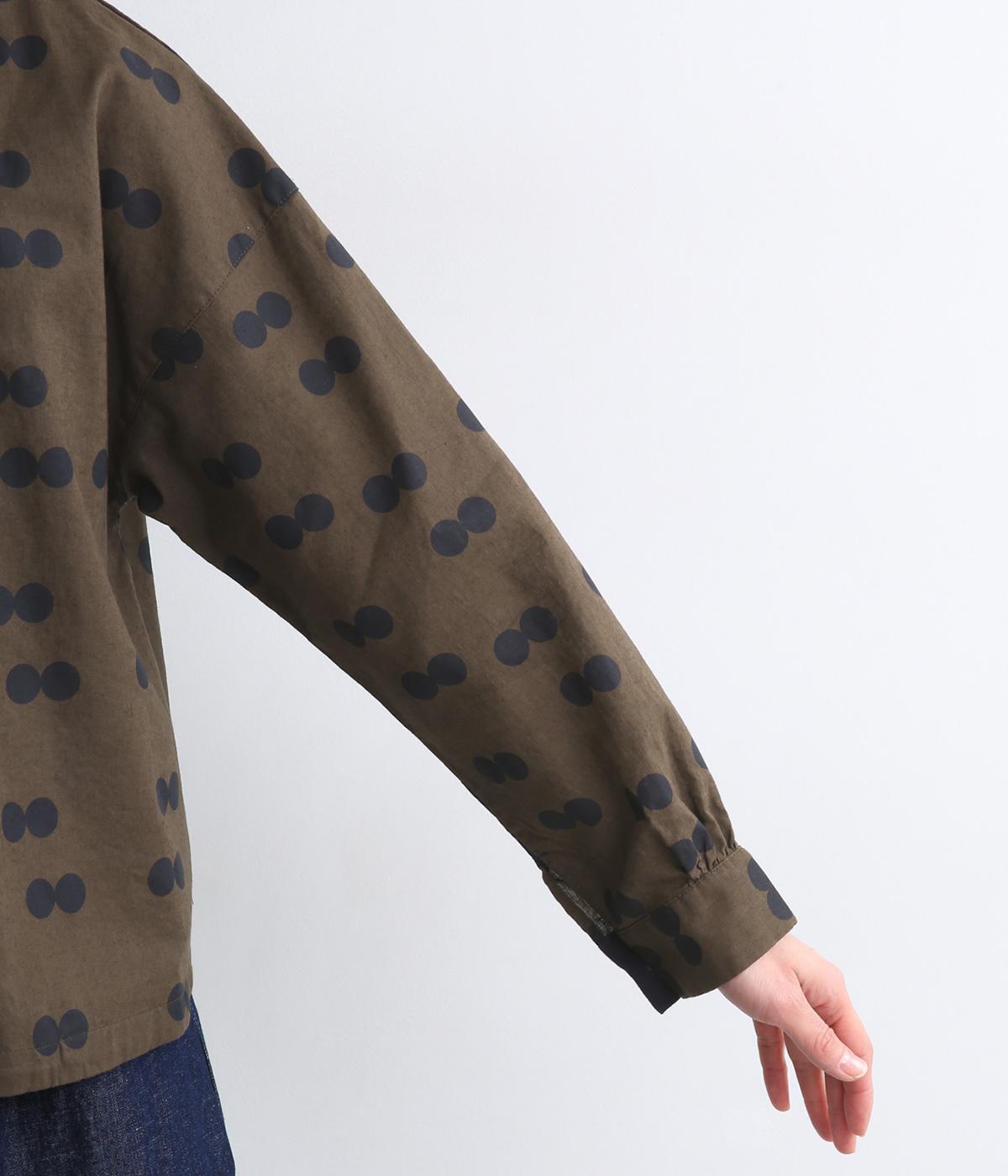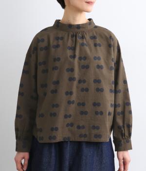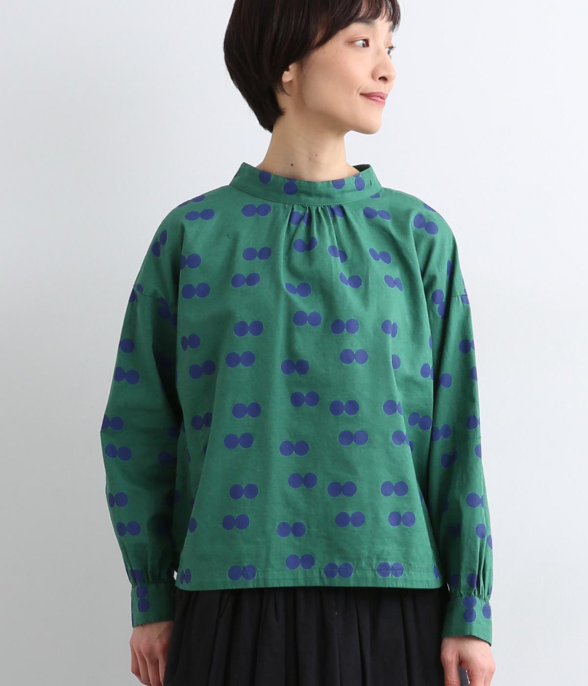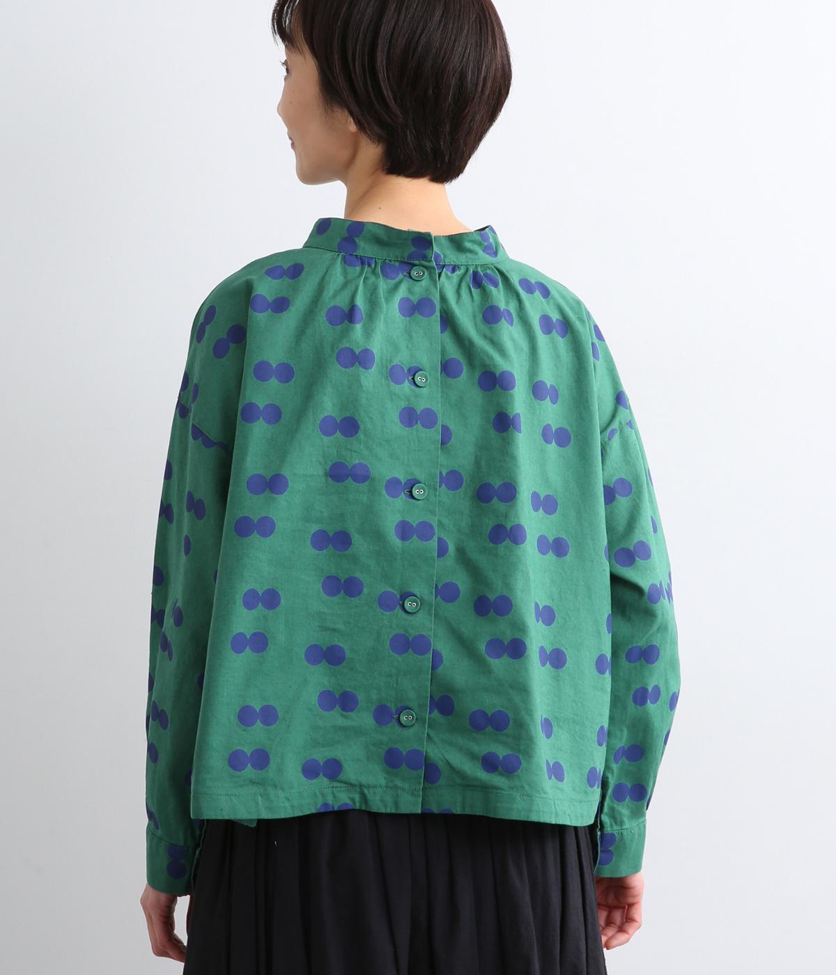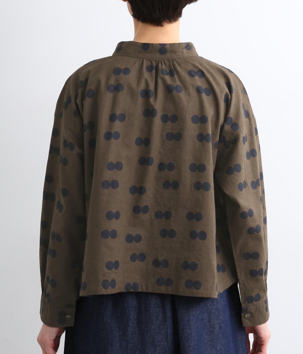 ふたつ並んだドット柄がレトロな雰囲気を醸すブラウスは、前後どちらでもたのしめる2way仕立てです。すこし太めのスタンドカラーにギャザーをほどこして女性らしいニュアンスに。袖をラフに折り返して配色裏をのぞかせた着こなしもおすすめ。