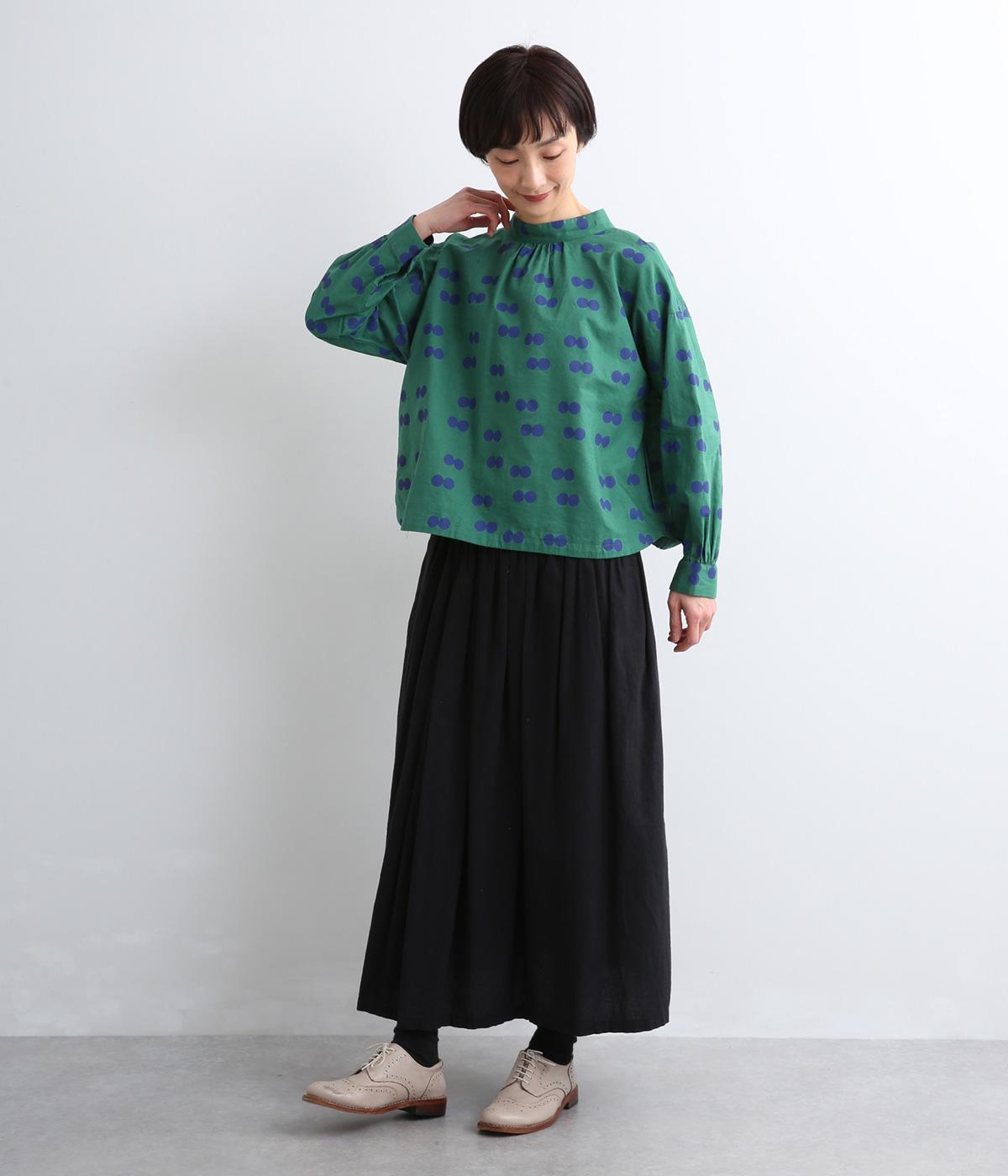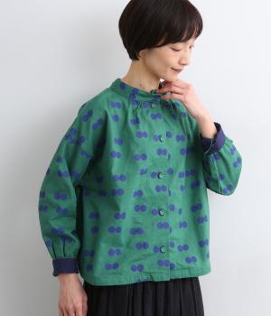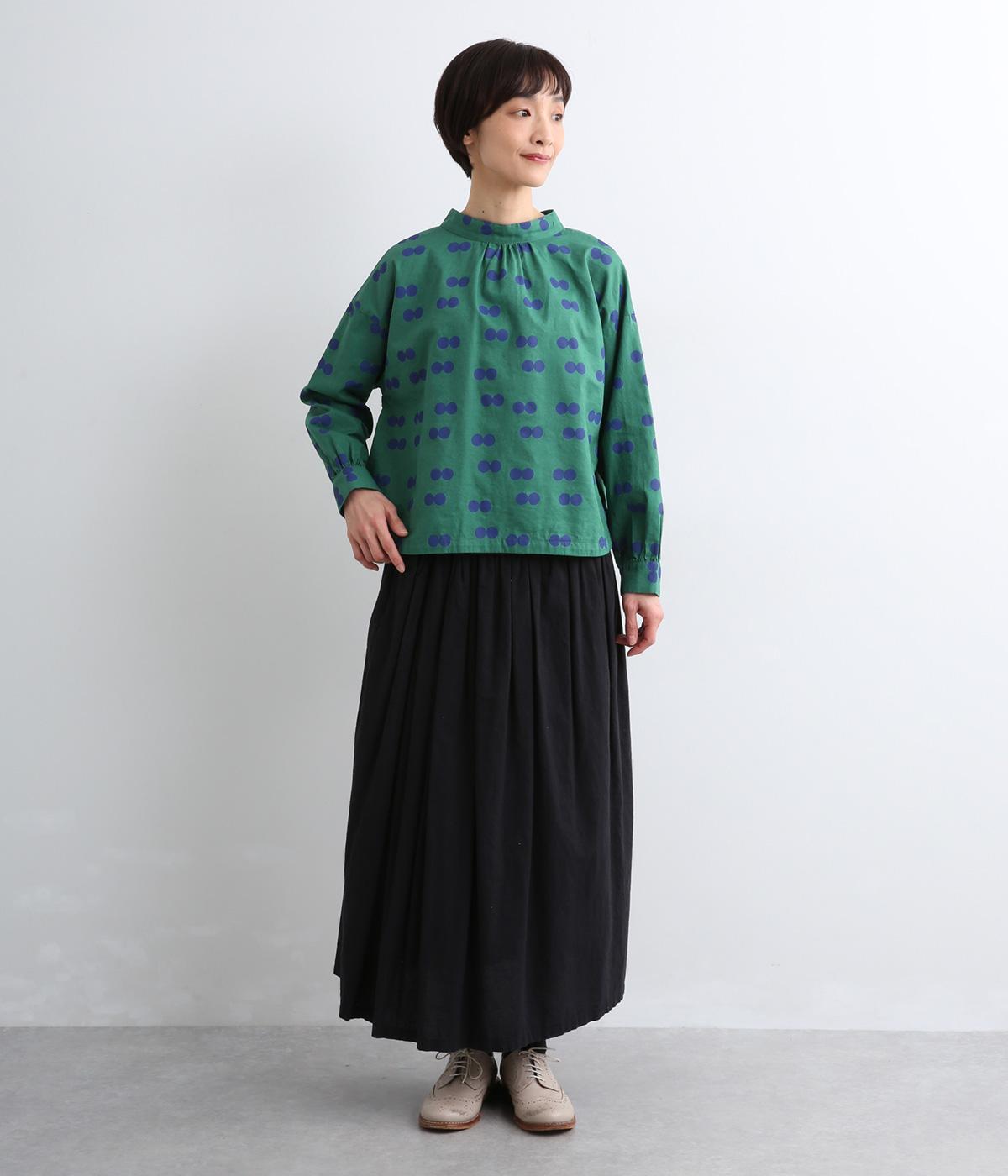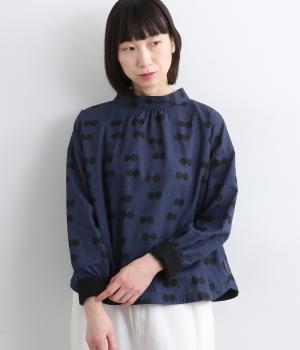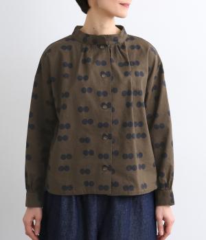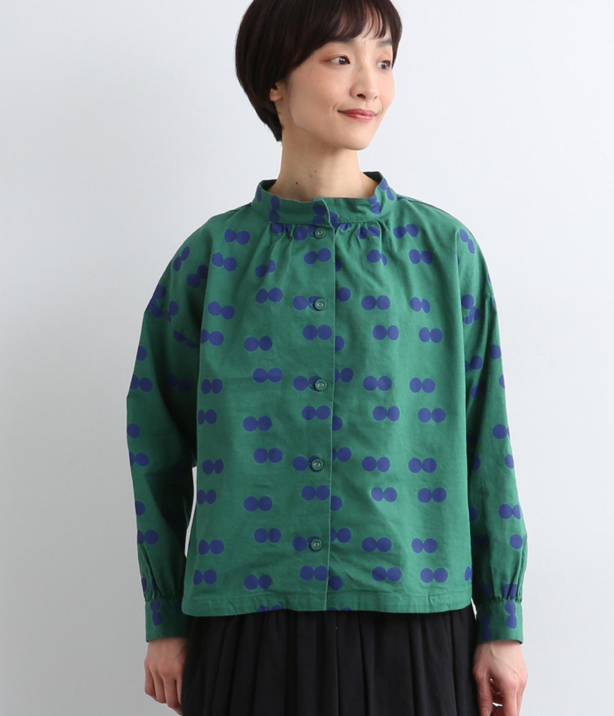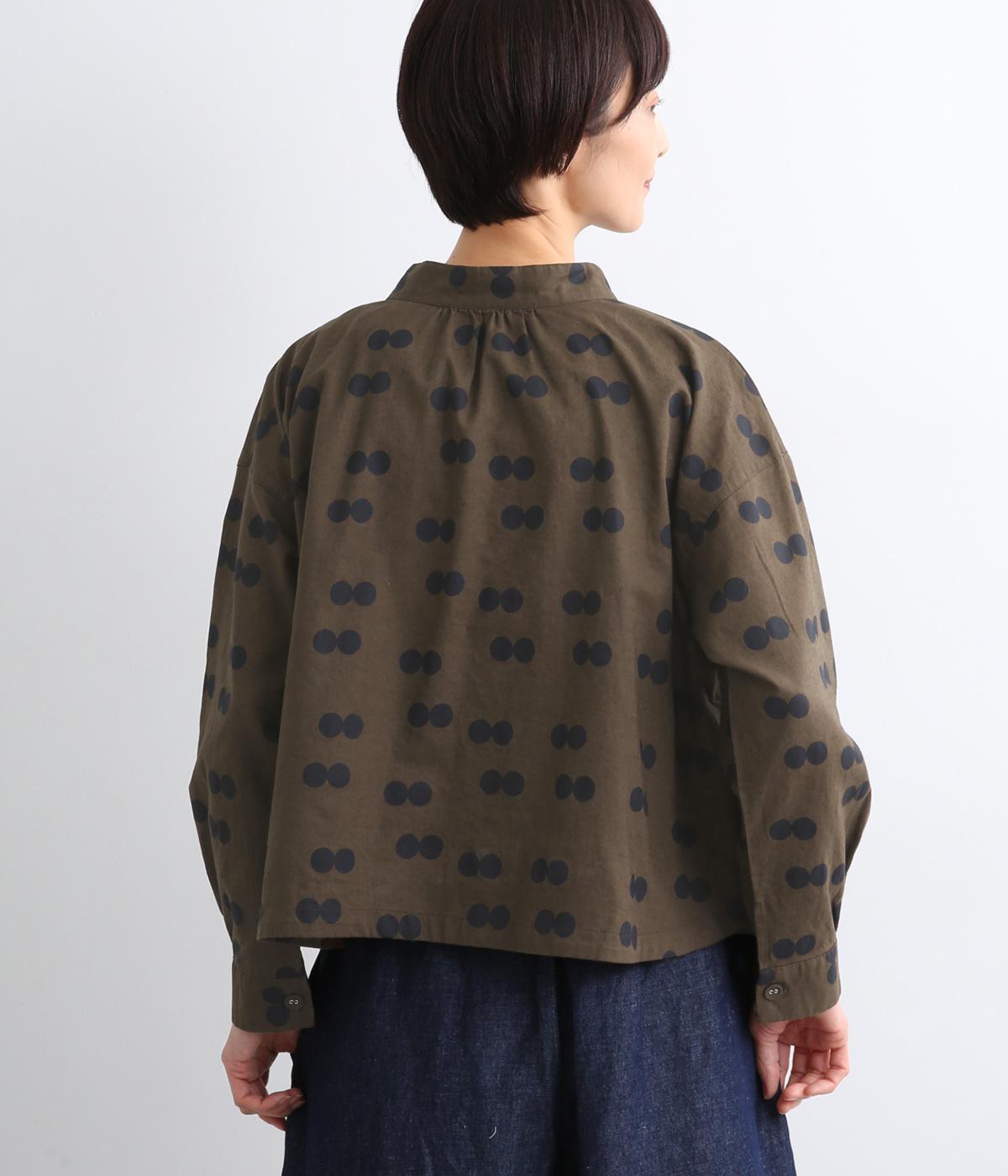 ふたつ並んだドット柄がレトロな雰囲気を醸すブラウスは、前後どちらでもたのしめる2way仕立てです。すこし太めのスタンドカラーにギャザーをほどこして女性らしいニュアンスに。袖をラフに折り返して配色裏をのぞかせた着こなしもおすすめ。