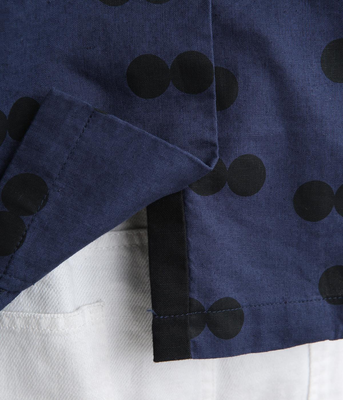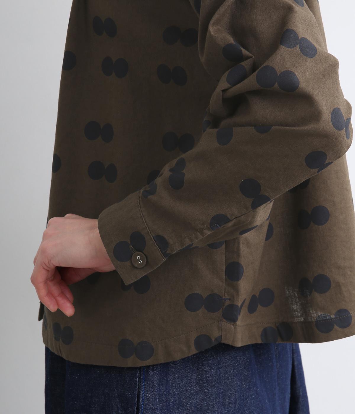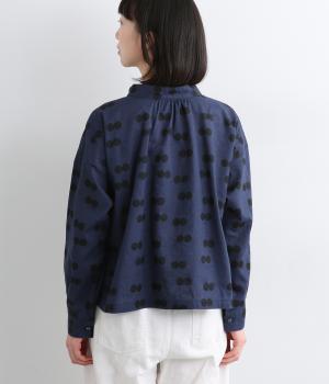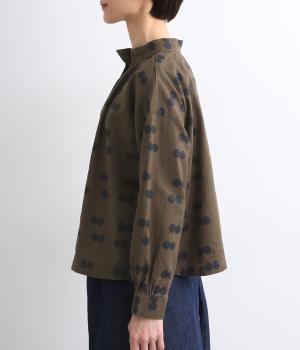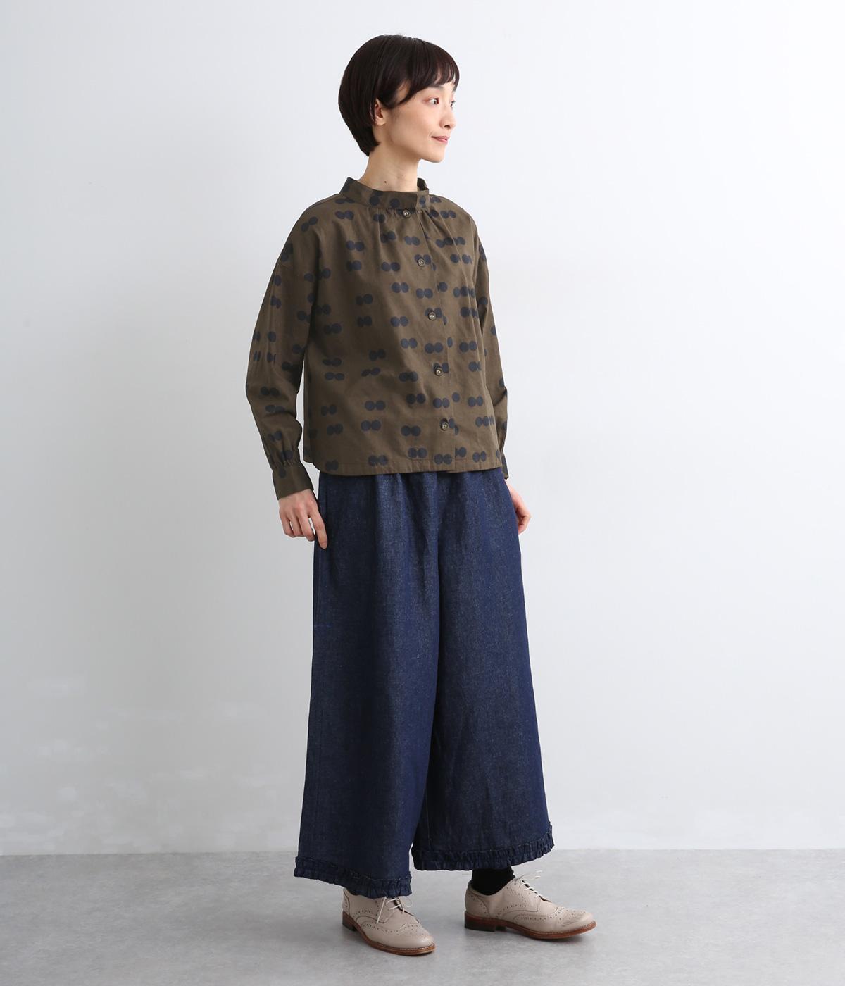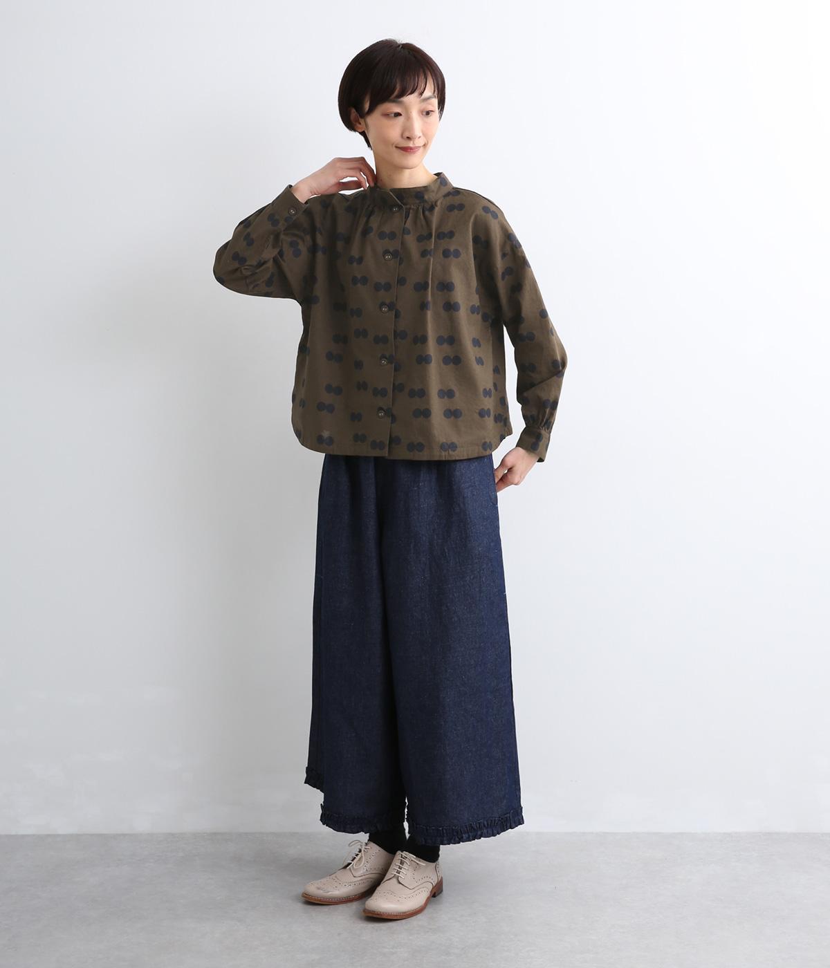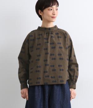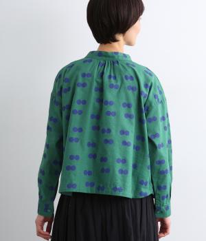 ふたつ並んだドット柄がレトロな雰囲気を醸すブラウスは、前後どちらでもたのしめる2way仕立てです。すこし太めのスタンドカラーにギャザーをほどこして女性らしいニュアンスに。袖をラフに折り返して配色裏をのぞかせた着こなしもおすすめ。