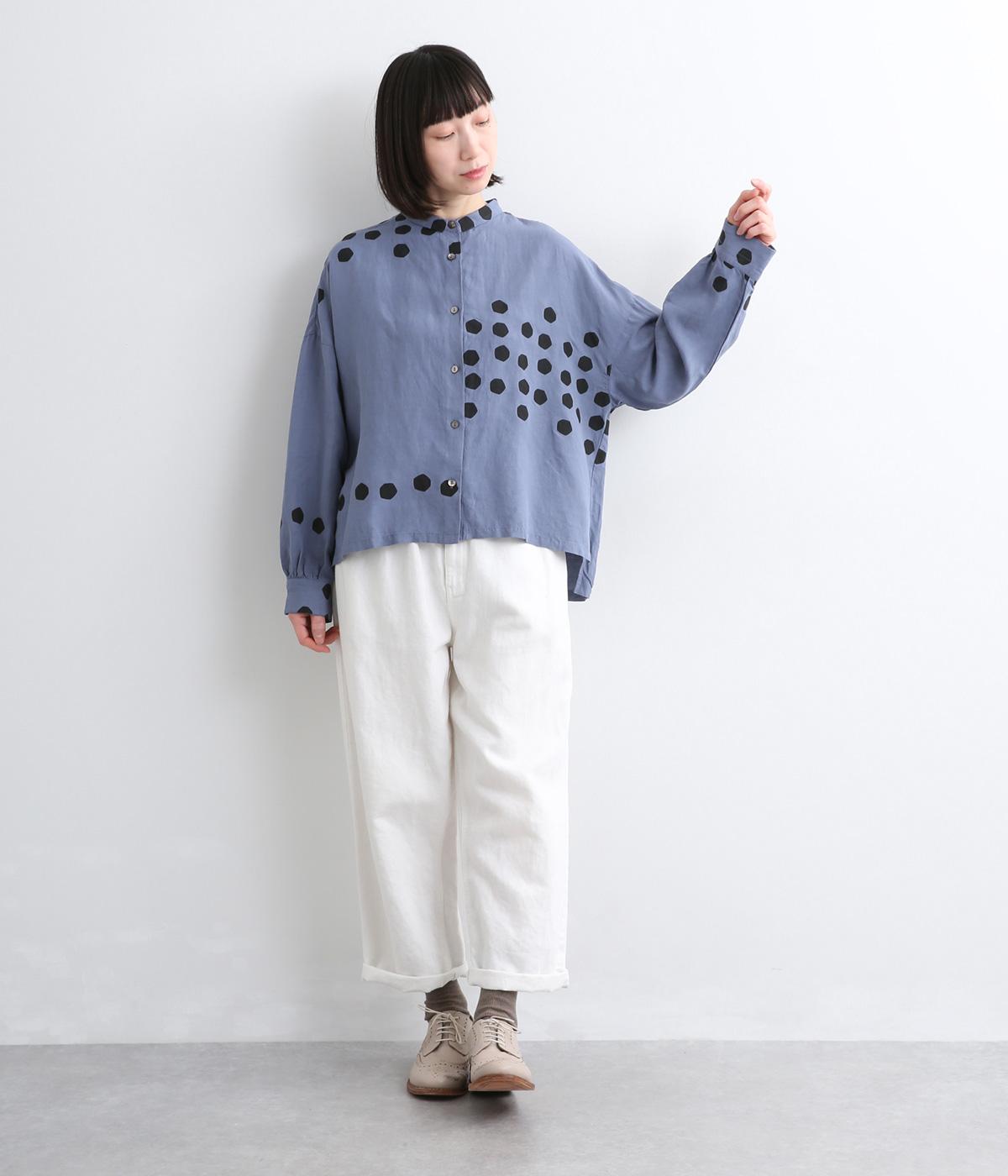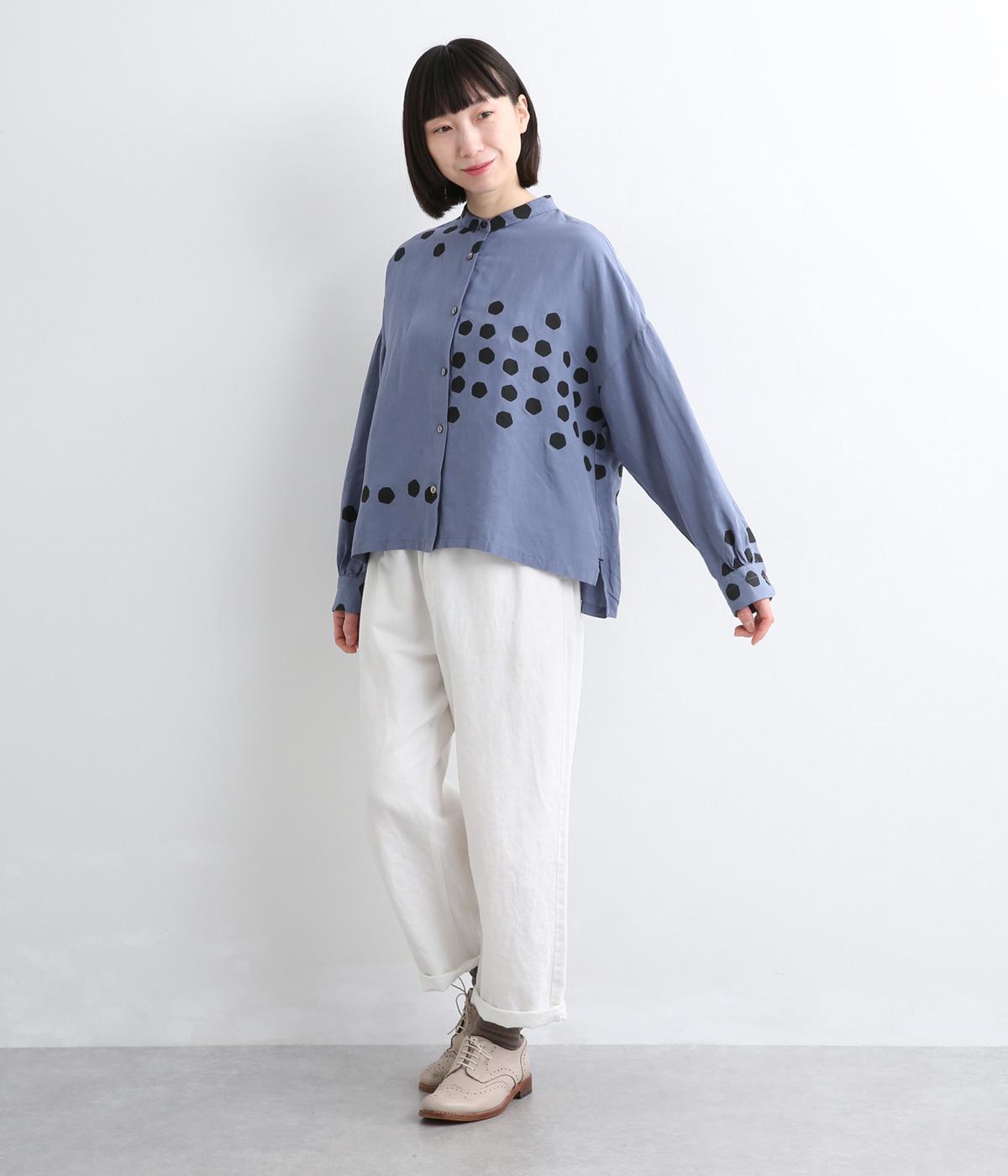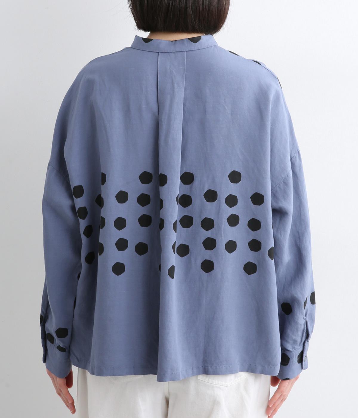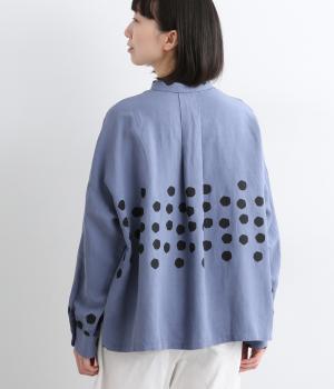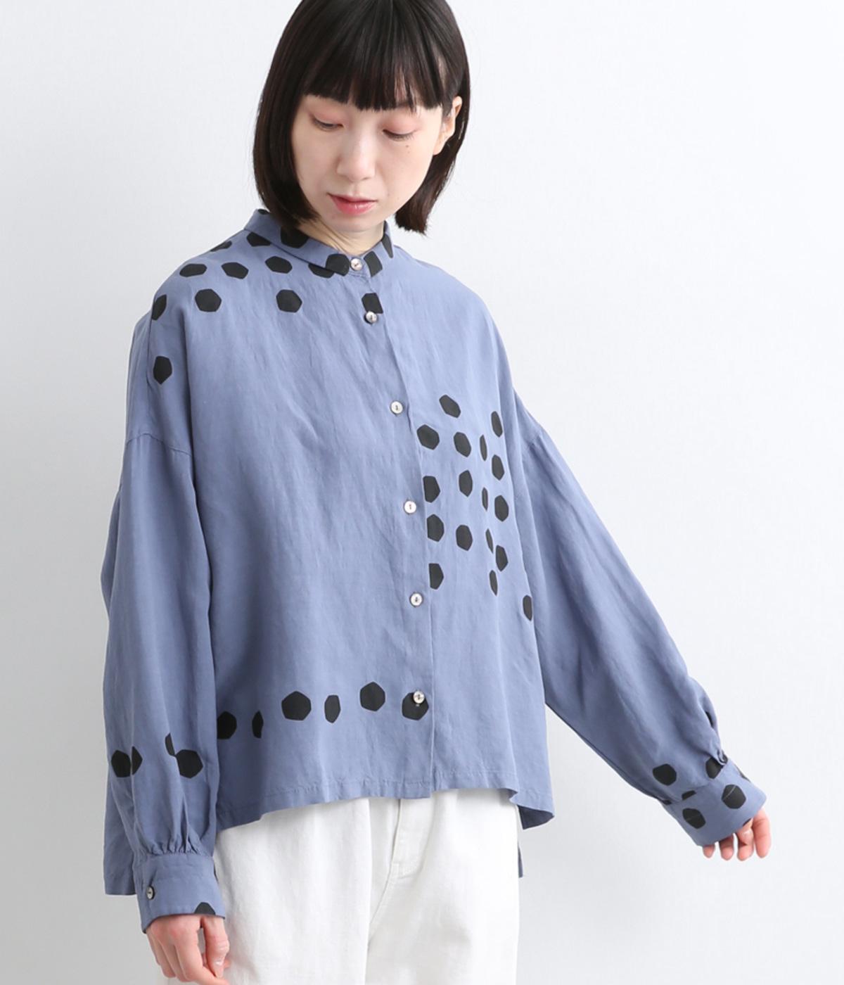 角張ったドット柄をボーダー状に並べたオリジナルプリントが着映えするシャツ。ワイドなスクエア型で着用すると自然にサイドが垂れ、気負いのないこなれ感を運びます。ラフな羽織りもさまになる前後差のある着丈で、裏前立てのステッチもさり気なくて◎。