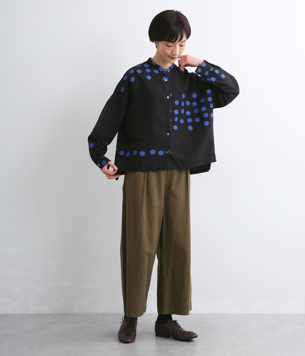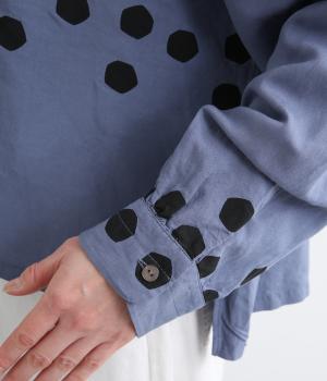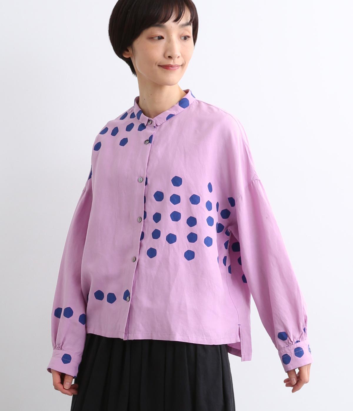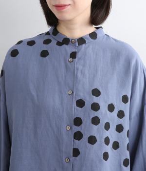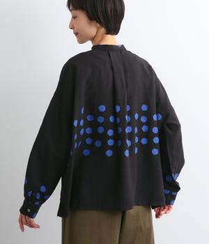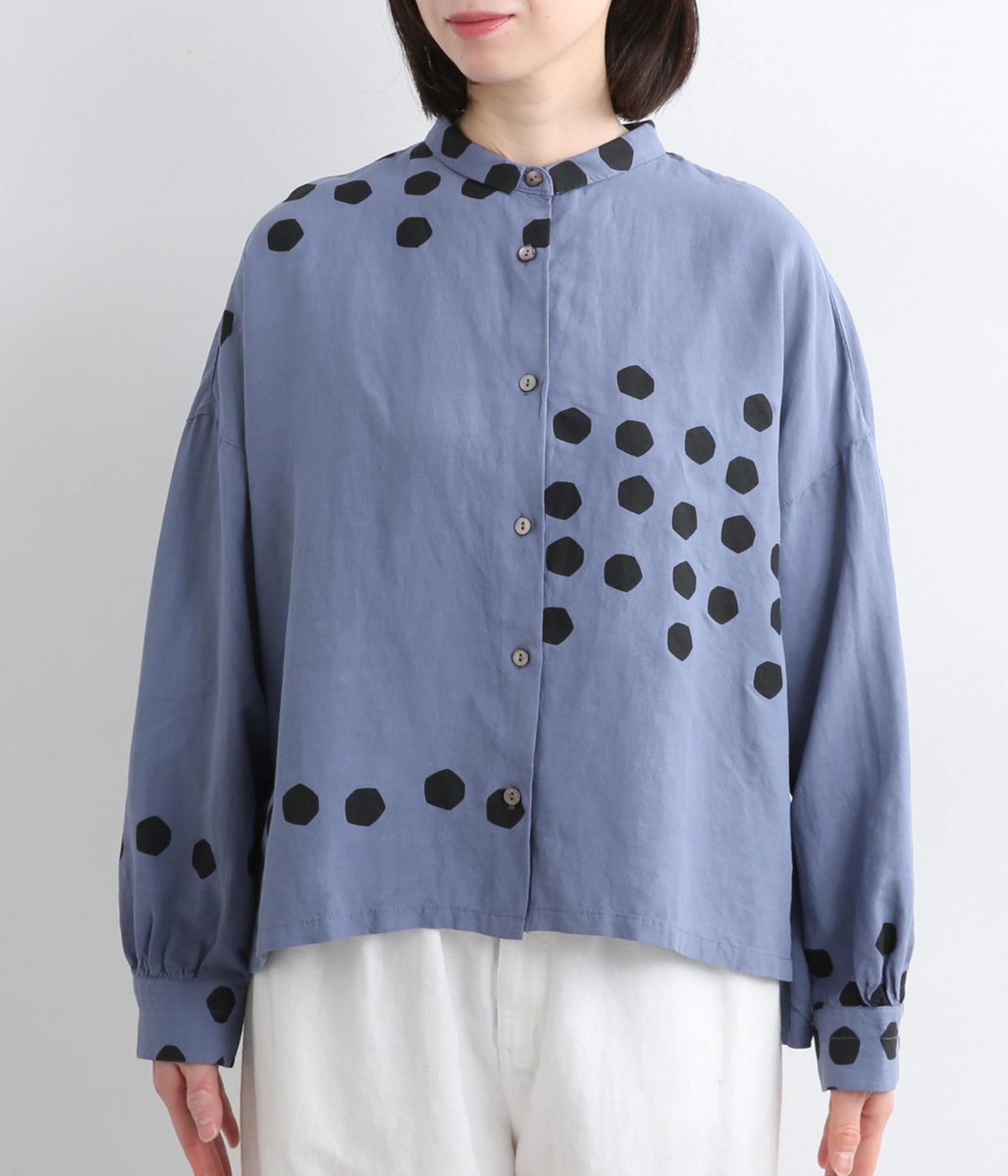 角張ったドット柄をボーダー状に並べたオリジナルプリントが着映えするシャツ。ワイドなスクエア型で着用すると自然にサイドが垂れ、気負いのないこなれ感を運びます。ラフな羽織りもさまになる前後差のある着丈で、裏前立てのステッチもさり気なくて◎。