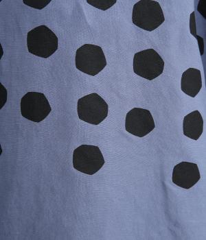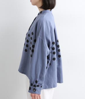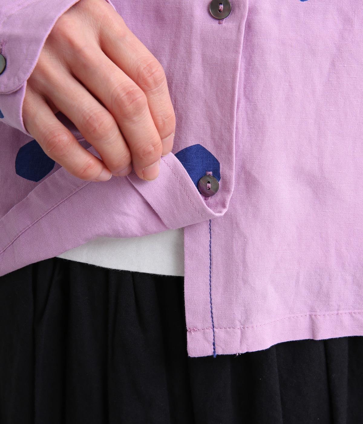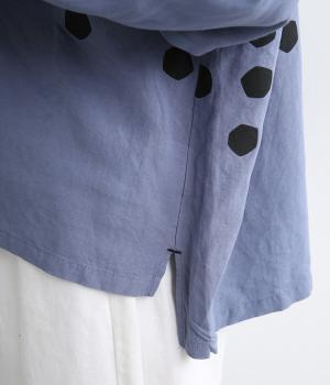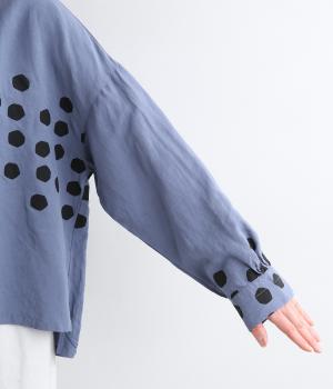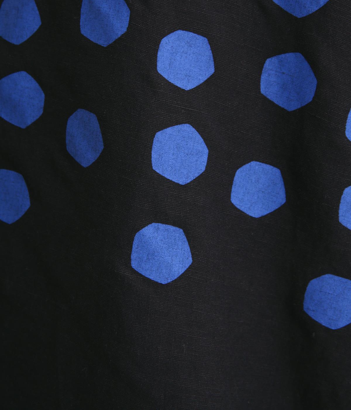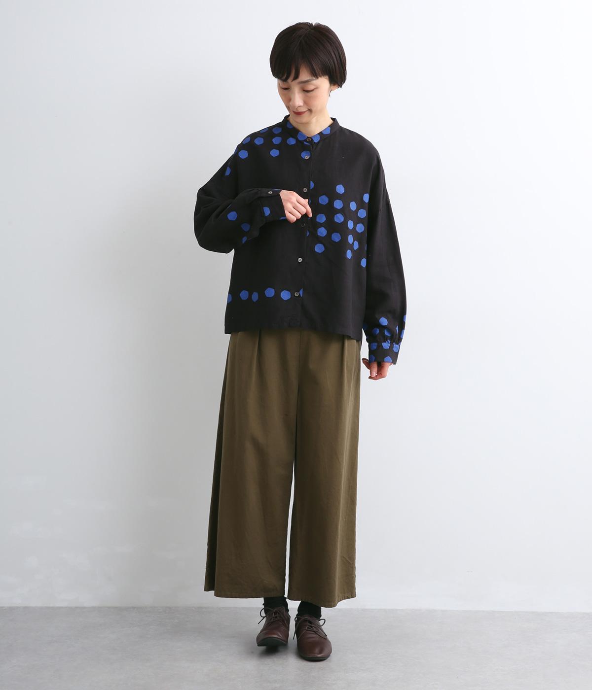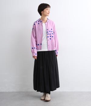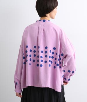 角張ったドット柄をボーダー状に並べたオリジナルプリントが着映えするシャツ。ワイドなスクエア型で着用すると自然にサイドが垂れ、気負いのないこなれ感を運びます。ラフな羽織りもさまになる前後差のある着丈で、裏前立てのステッチもさり気なくて◎。