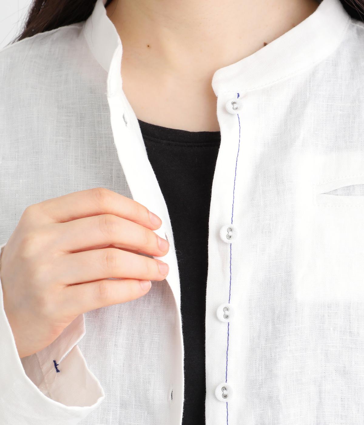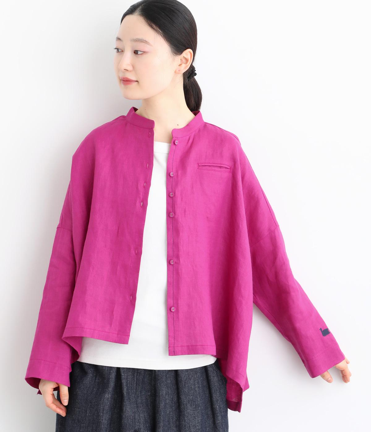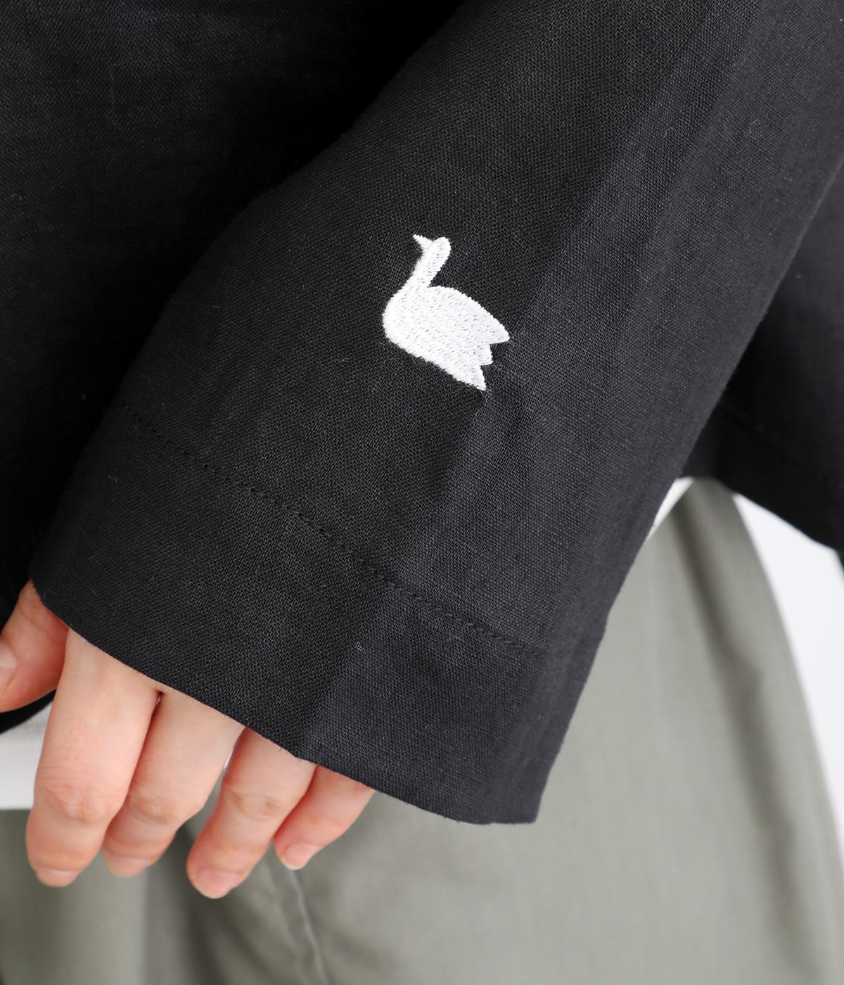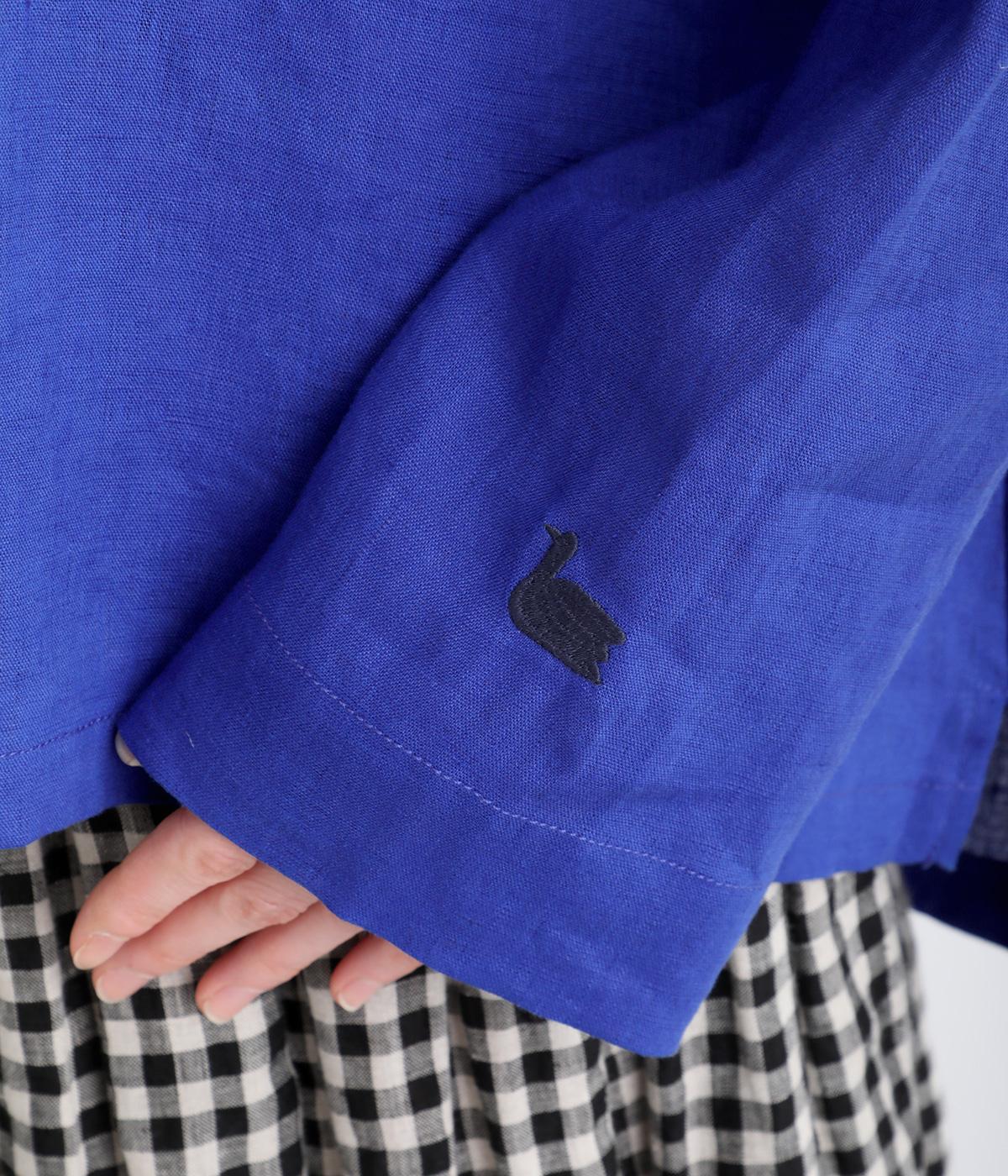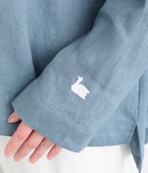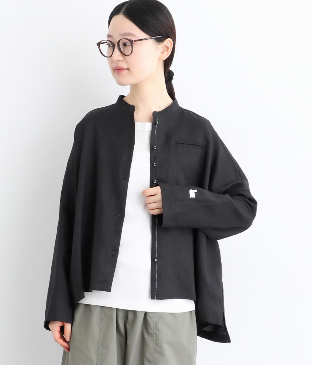 四角いフォルムがラフな印象の、スタンドカラーシャツです。ボリューム感がありながら、肩まわりはすっきりと見えるバランスに仕上げました。両玉縁ポケットが凛としたアクセントに。前裾を短めに設計し軽やかな印象に整え、配色ステッチや袖のスワン刺しゅう、不規則なボタン配置が、さりげない個性を添えます。