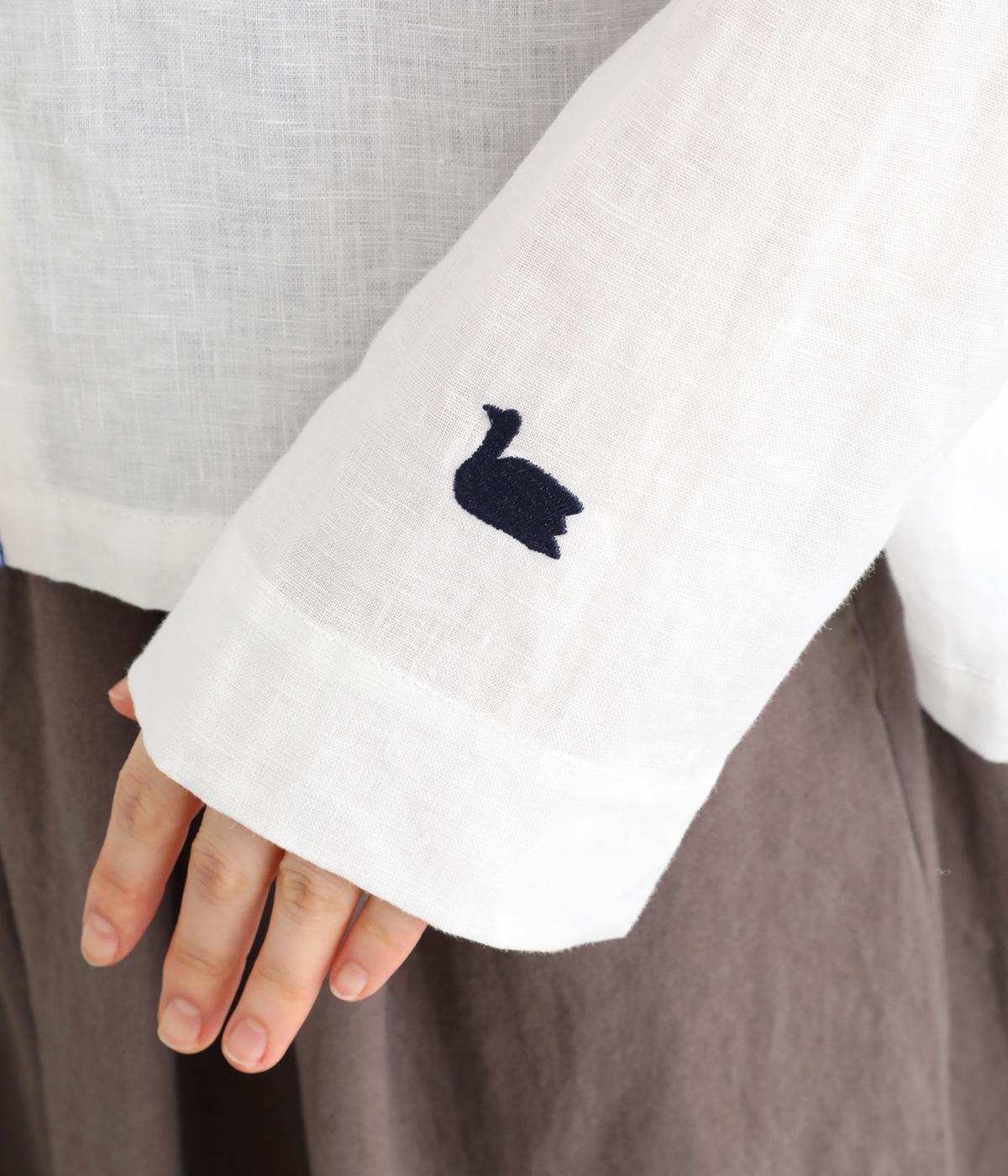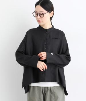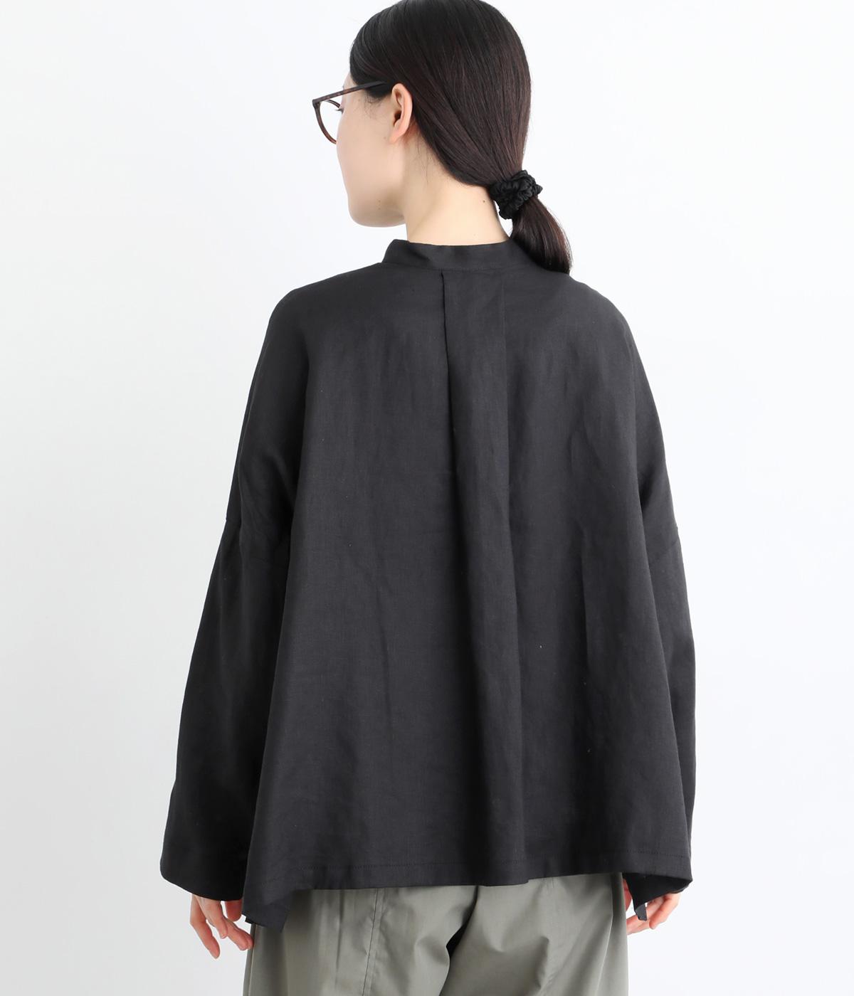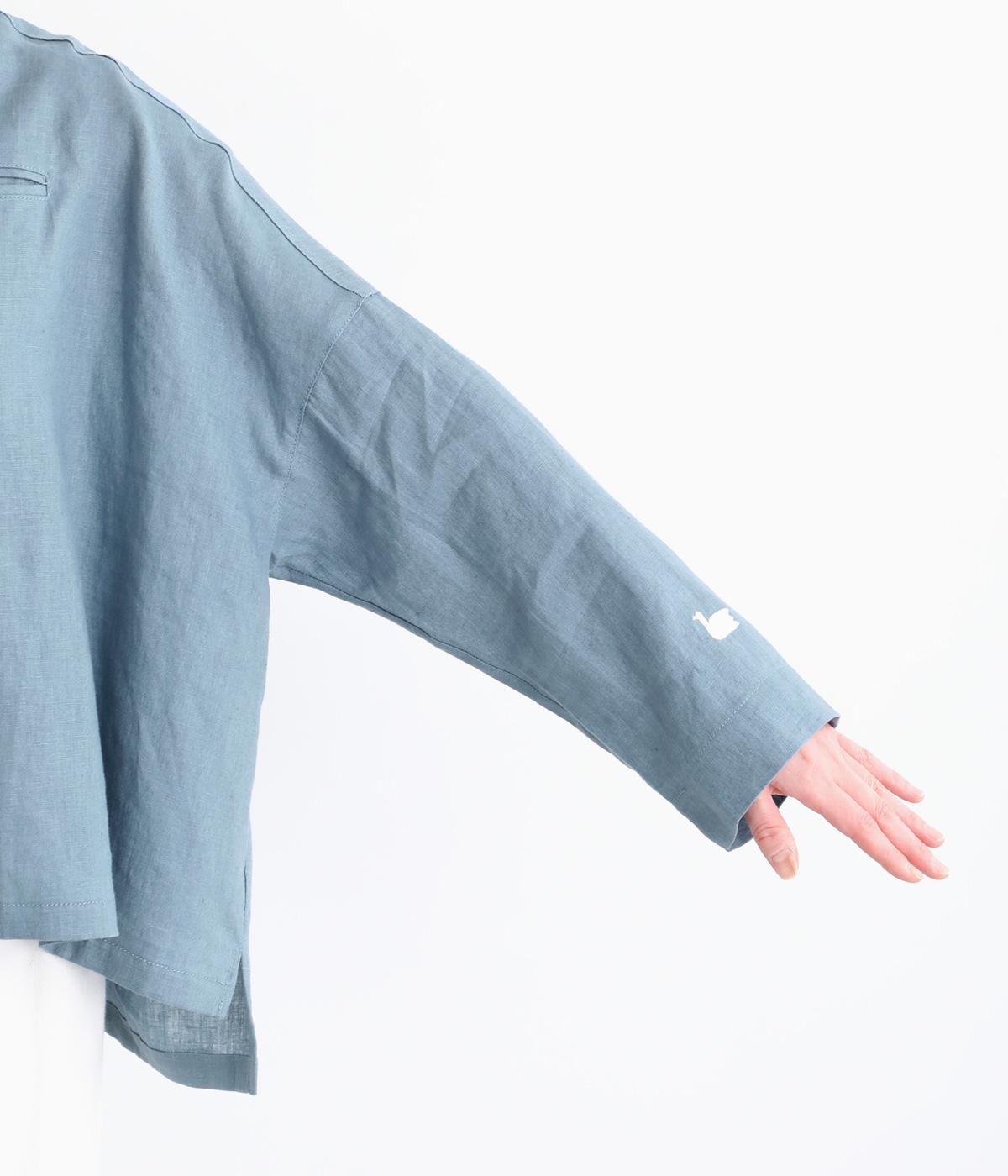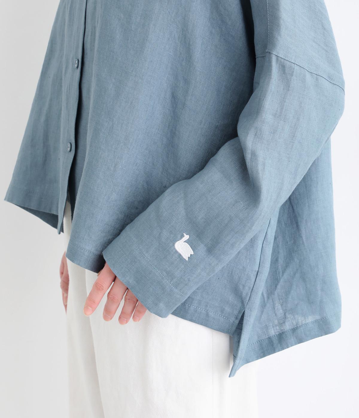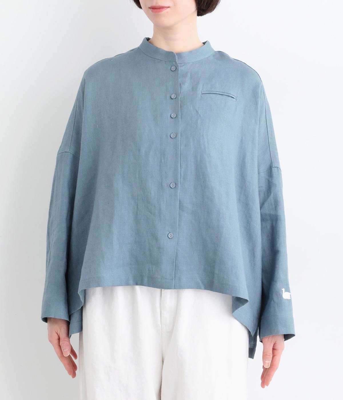 四角いフォルムがラフな印象の、スタンドカラーシャツです。ボリューム感がありながら、肩まわりはすっきりと見えるバランスに仕上げました。両玉縁ポケットが凛としたアクセントに。前裾を短めに設計し軽やかな印象に整え、配色ステッチや袖のスワン刺しゅう、不規則なボタン配置が、さりげない個性を添えます。