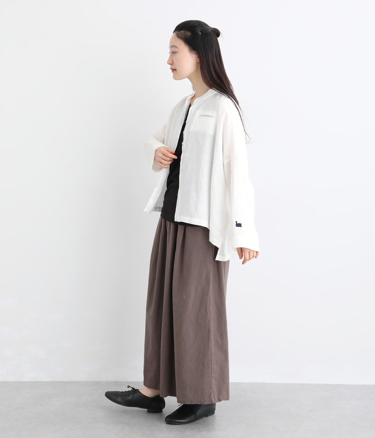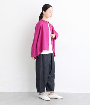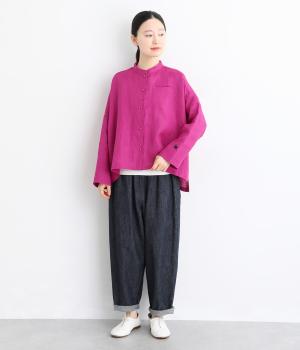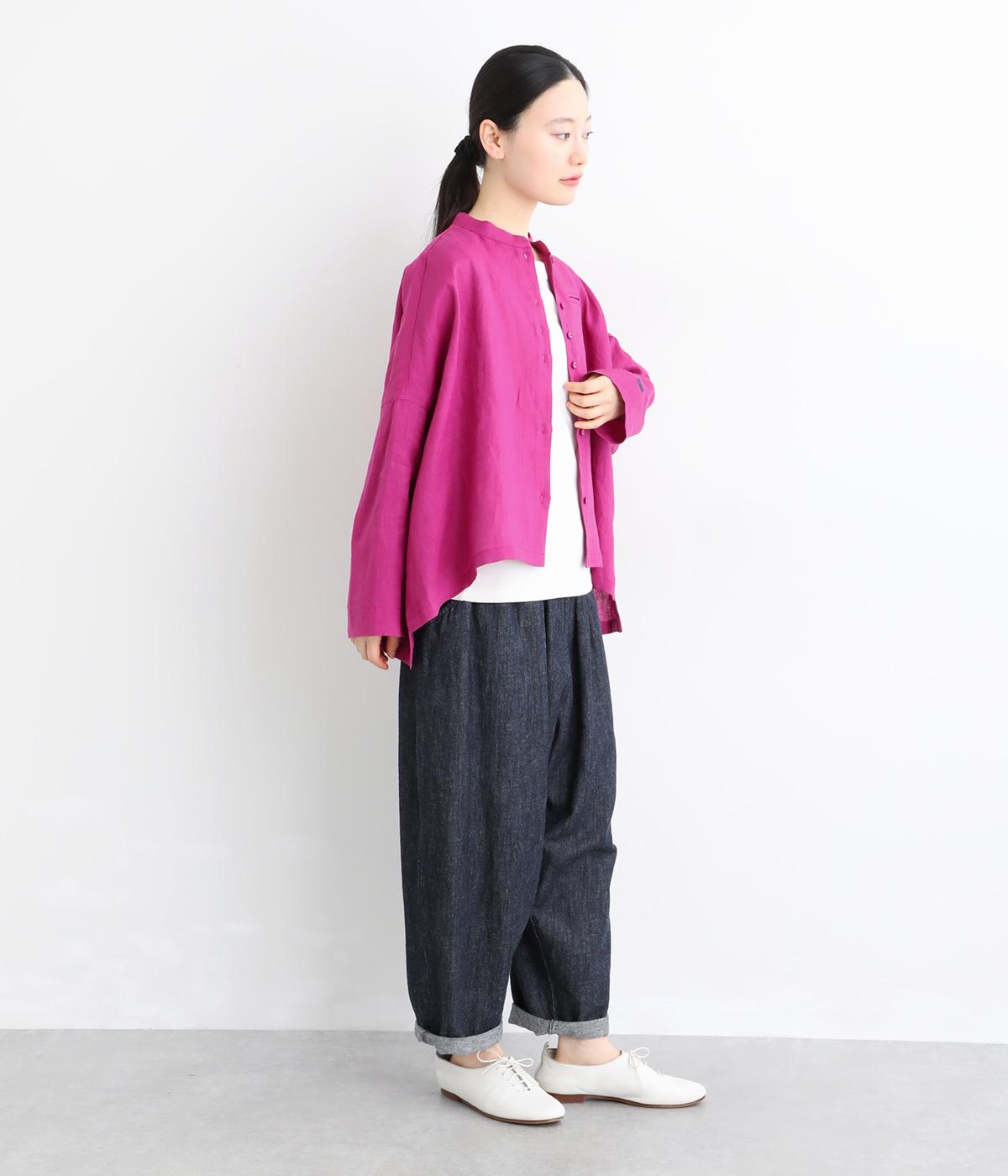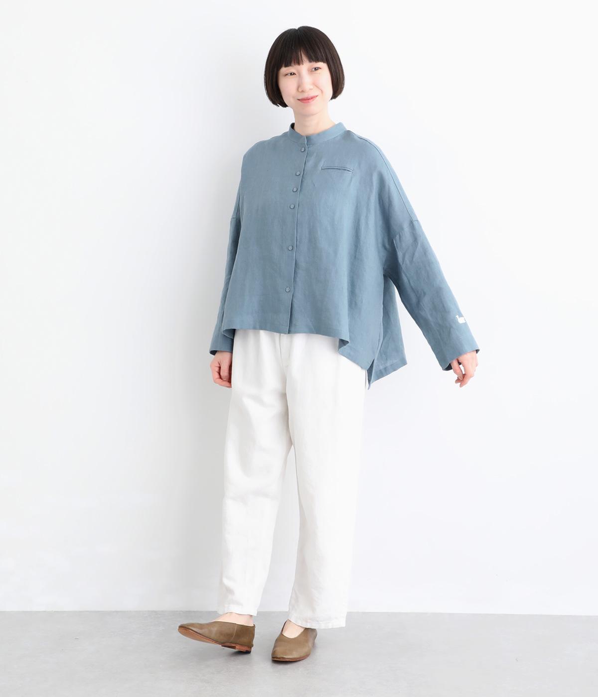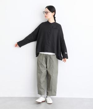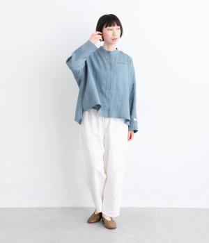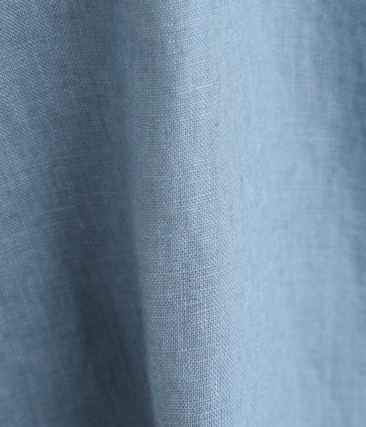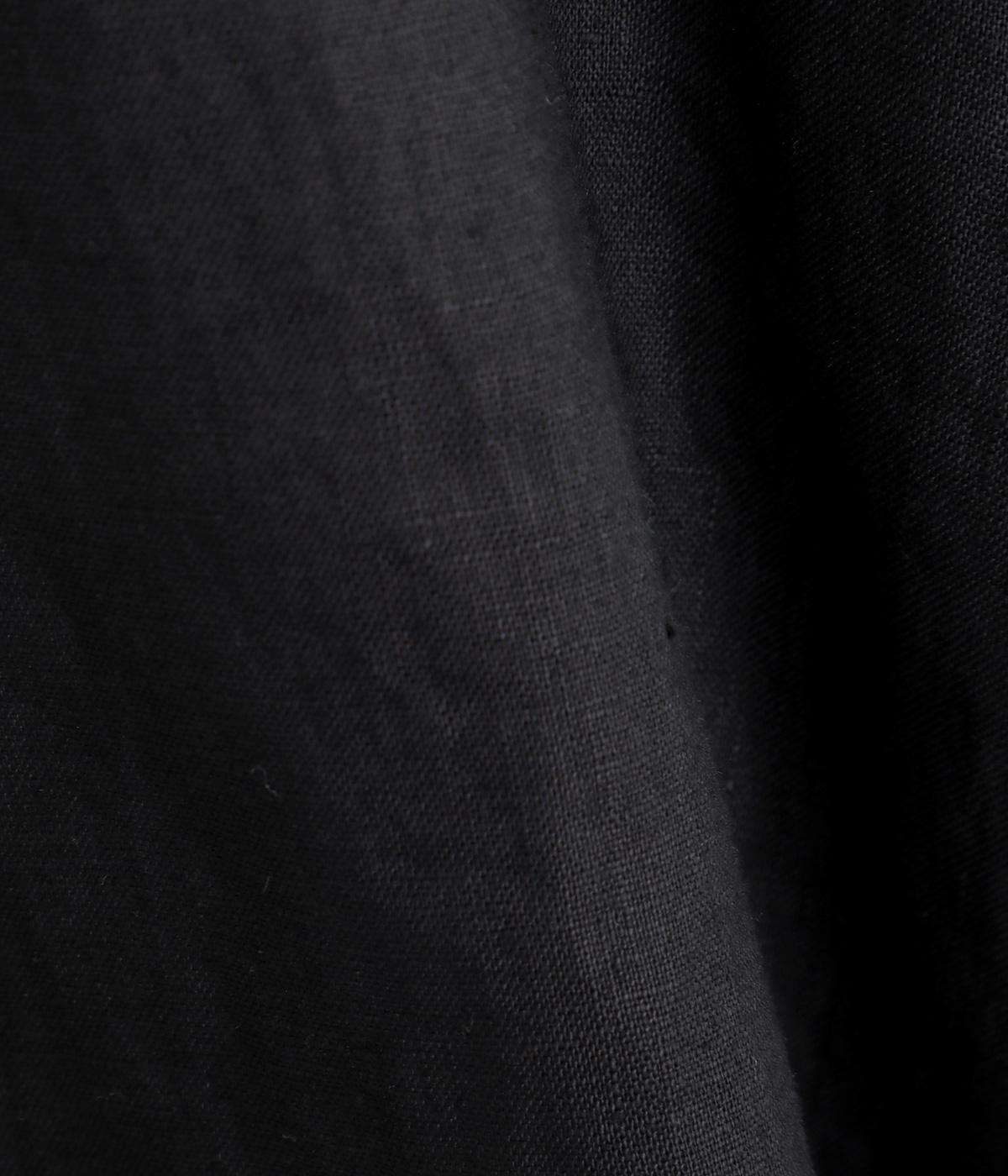 さらりとした肌ざわりが心地よいリネン素材です。ほどよいハリを備えつつ、しなやかに体になじむ、やわらかな風合いに仕上げました。ほのかな光沢とナチュラルなシワが奥行きを生み、着るほどに表情の変化をたのしめる生地感です。