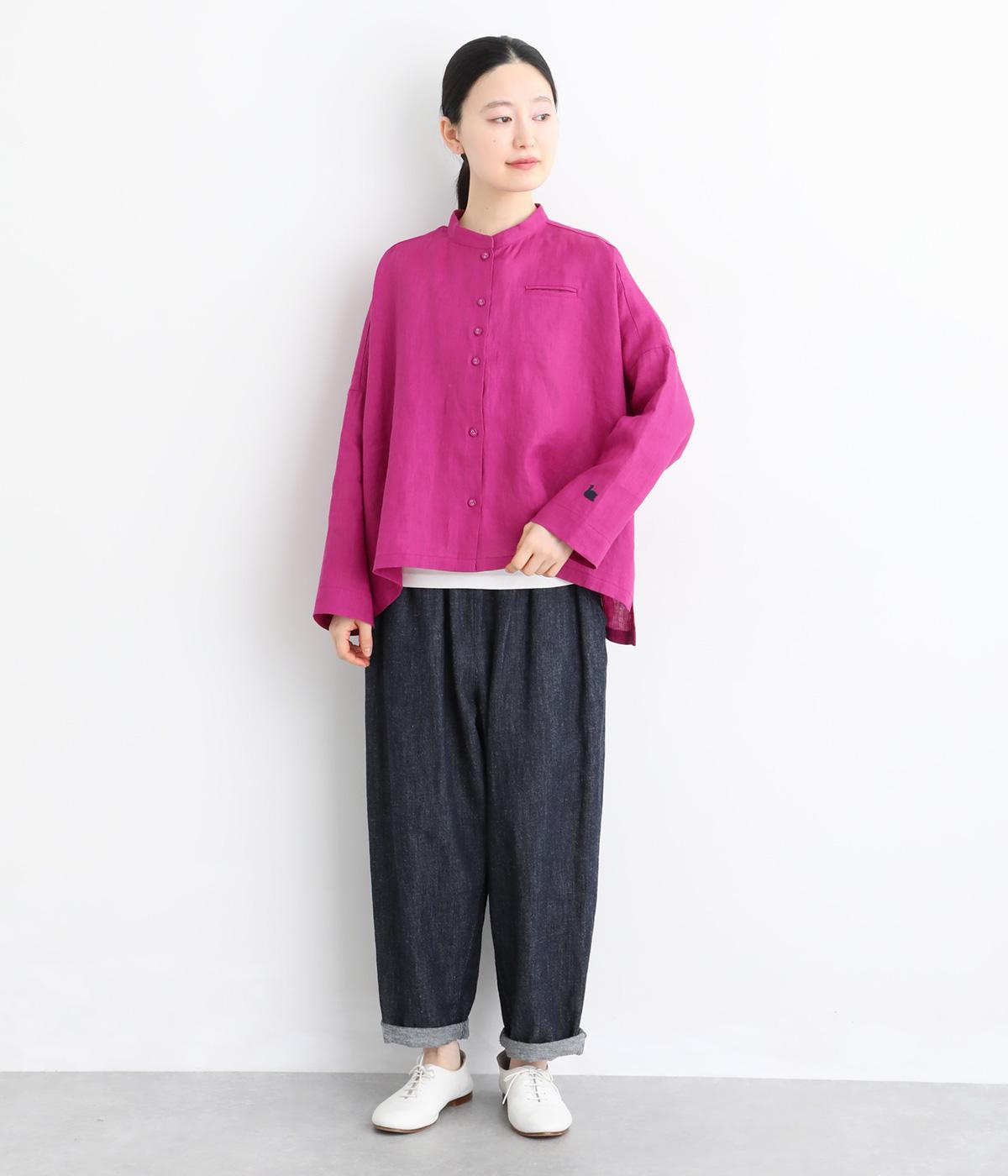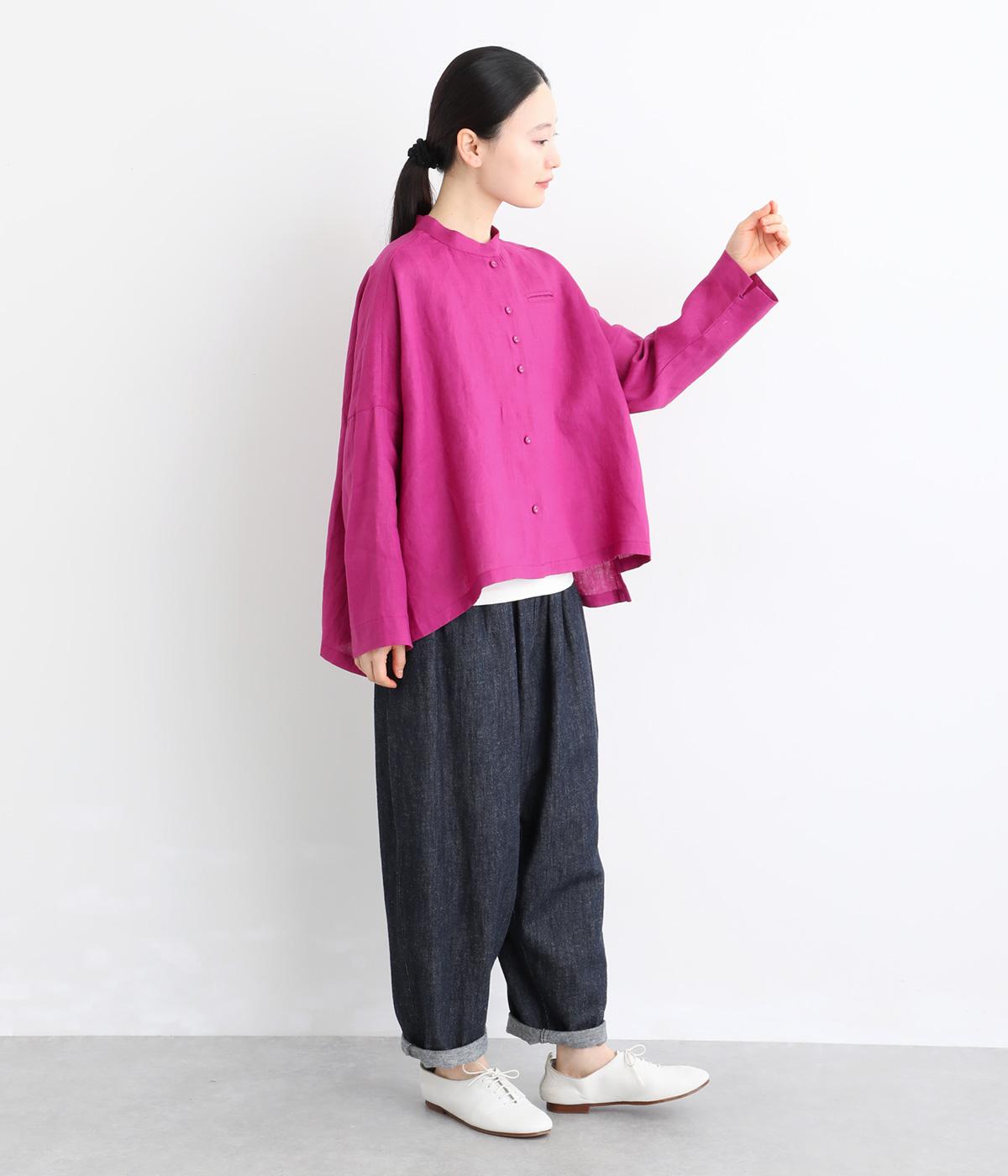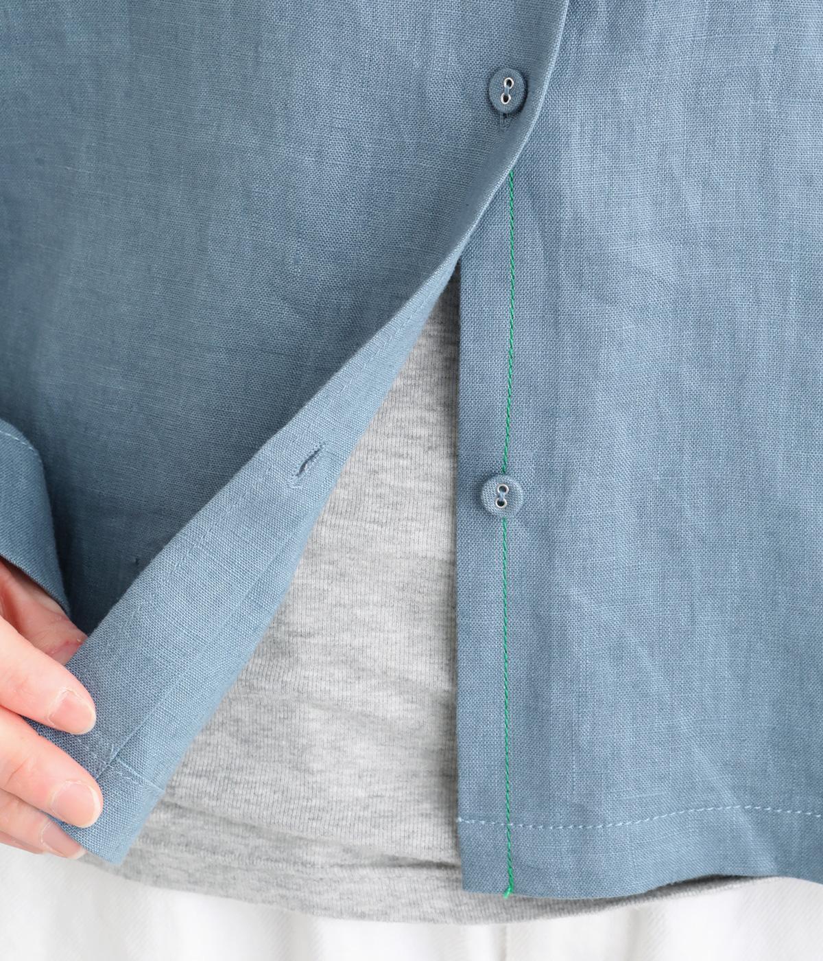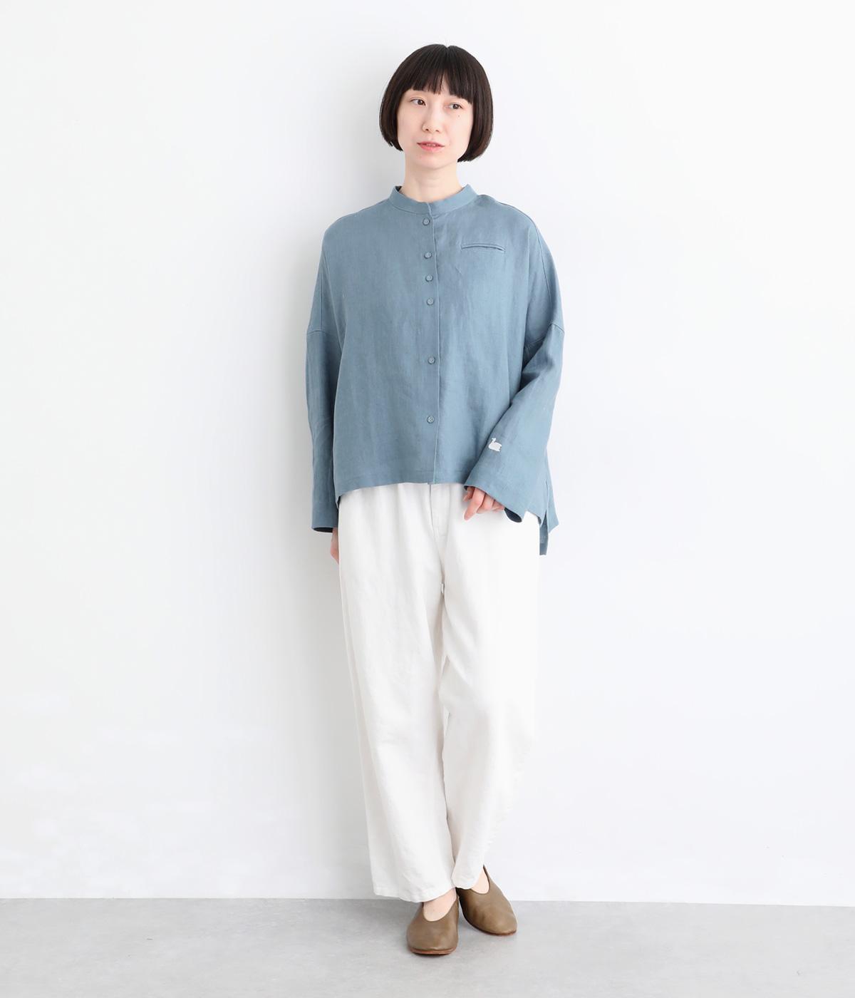 さらりとした肌ざわりが心地よいリネン素材です。ほどよいハリを備えつつ、しなやかに体になじむ、やわらかな風合いに仕上げました。ほのかな光沢とナチュラルなシワが奥行きを生み、着るほどに表情の変化をたのしめる生地感です。