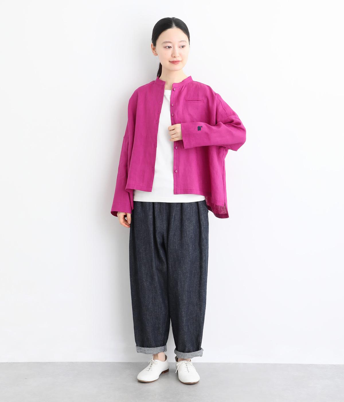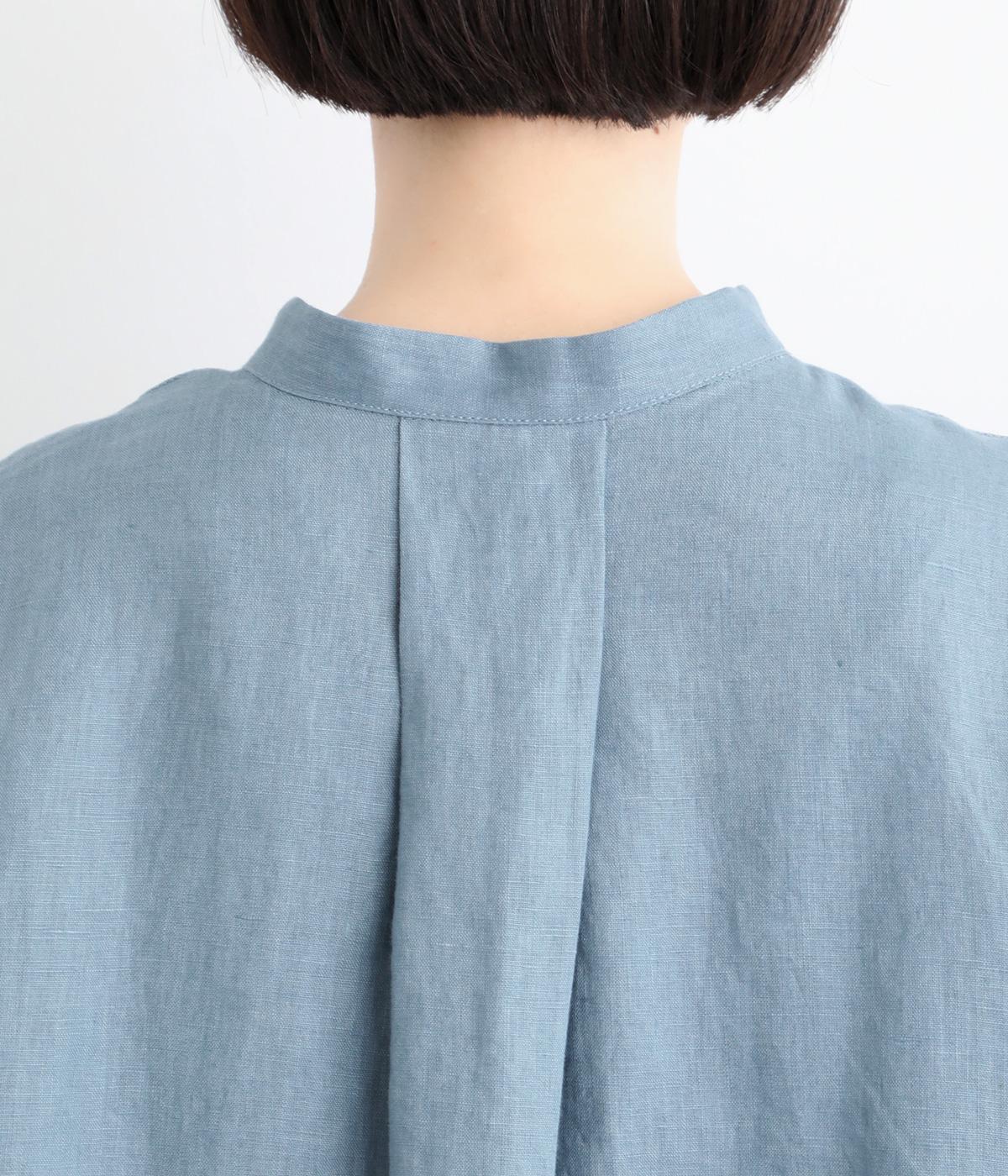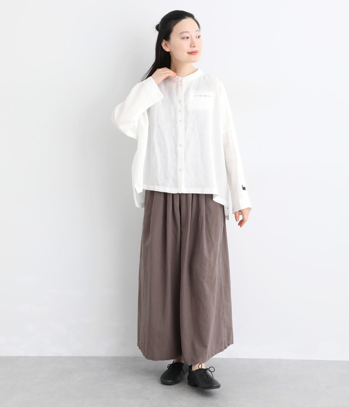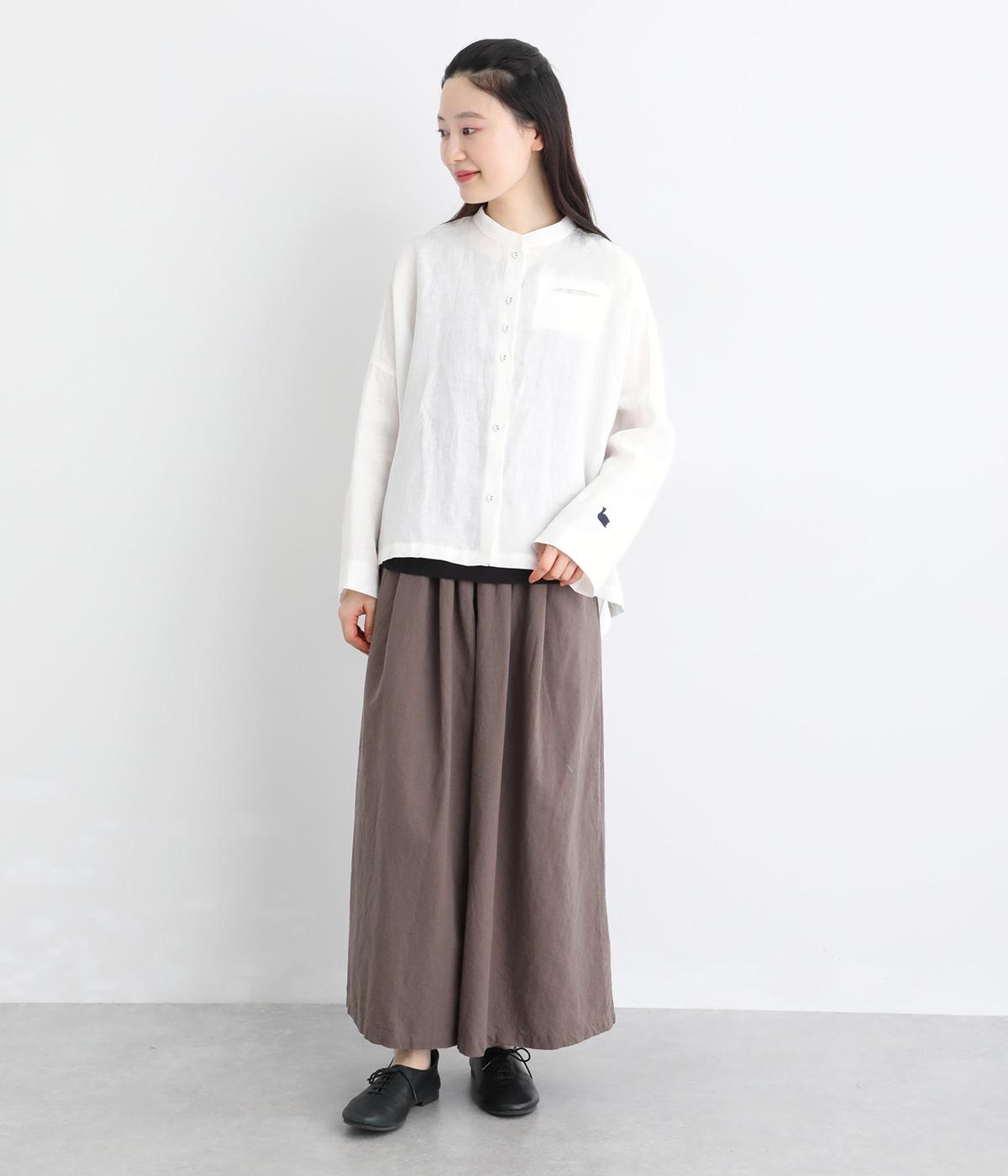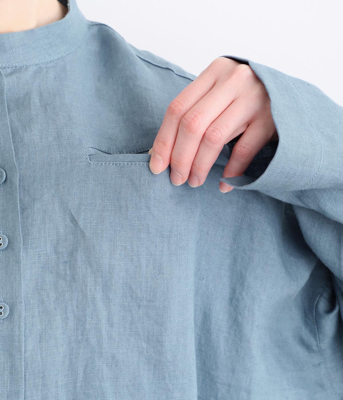 さらりとした肌ざわりが心地よいリネン素材です。ほどよいハリを備えつつ、しなやかに体になじむ、やわらかな風合いに仕上げました。ほのかな光沢とナチュラルなシワが奥行きを生み、着るほどに表情の変化をたのしめる生地感です。