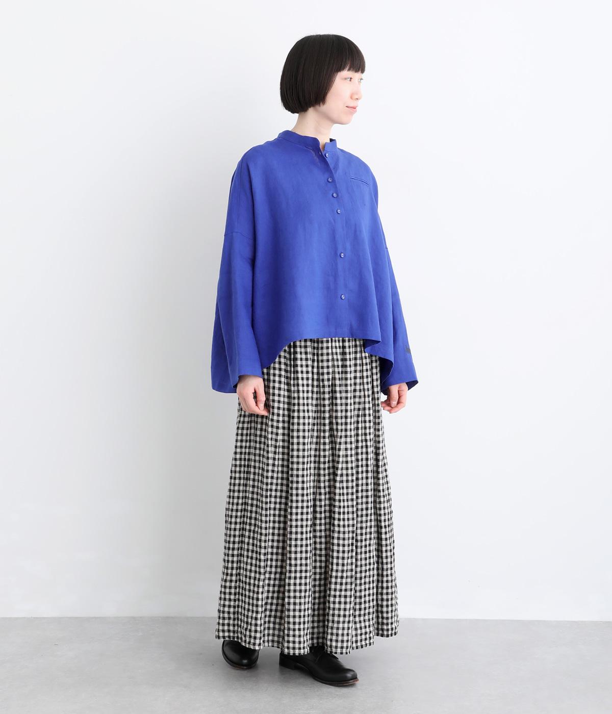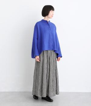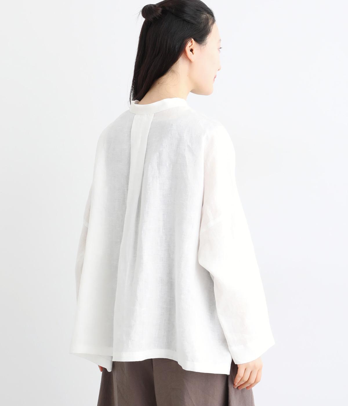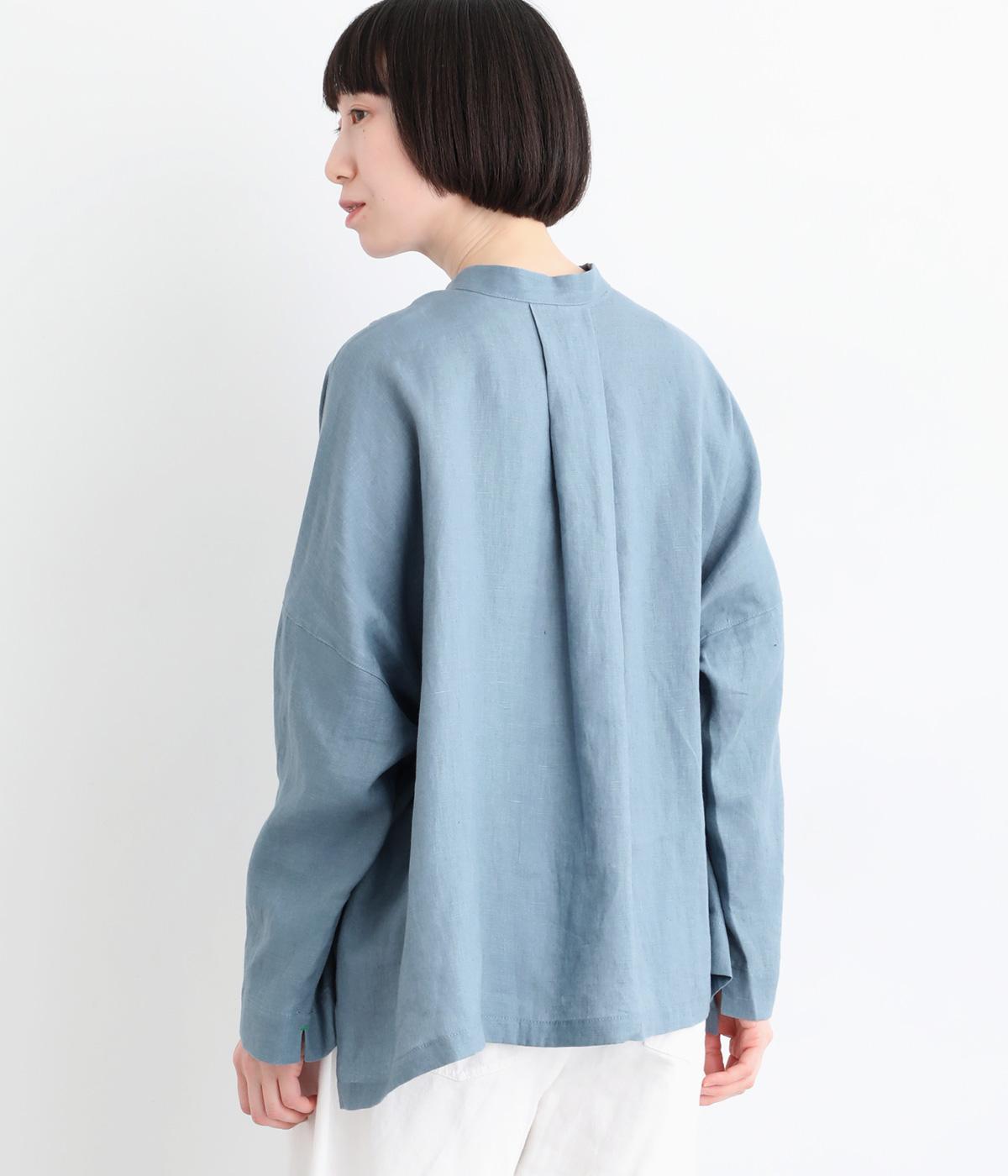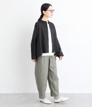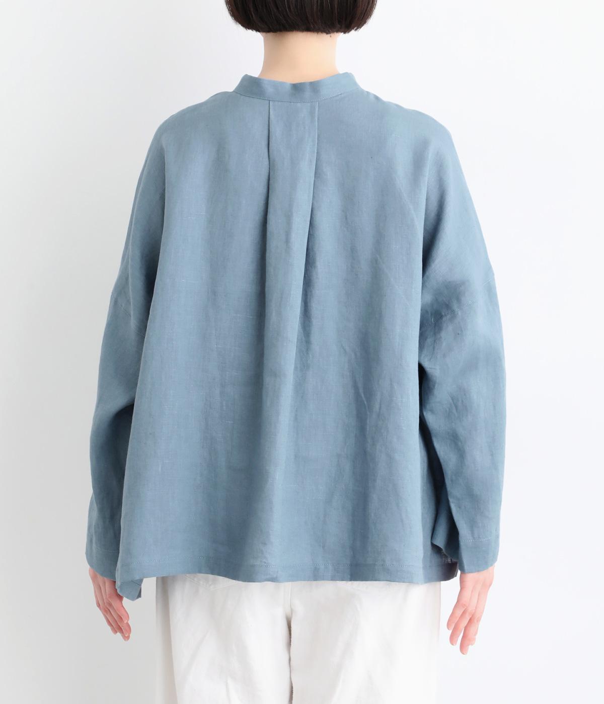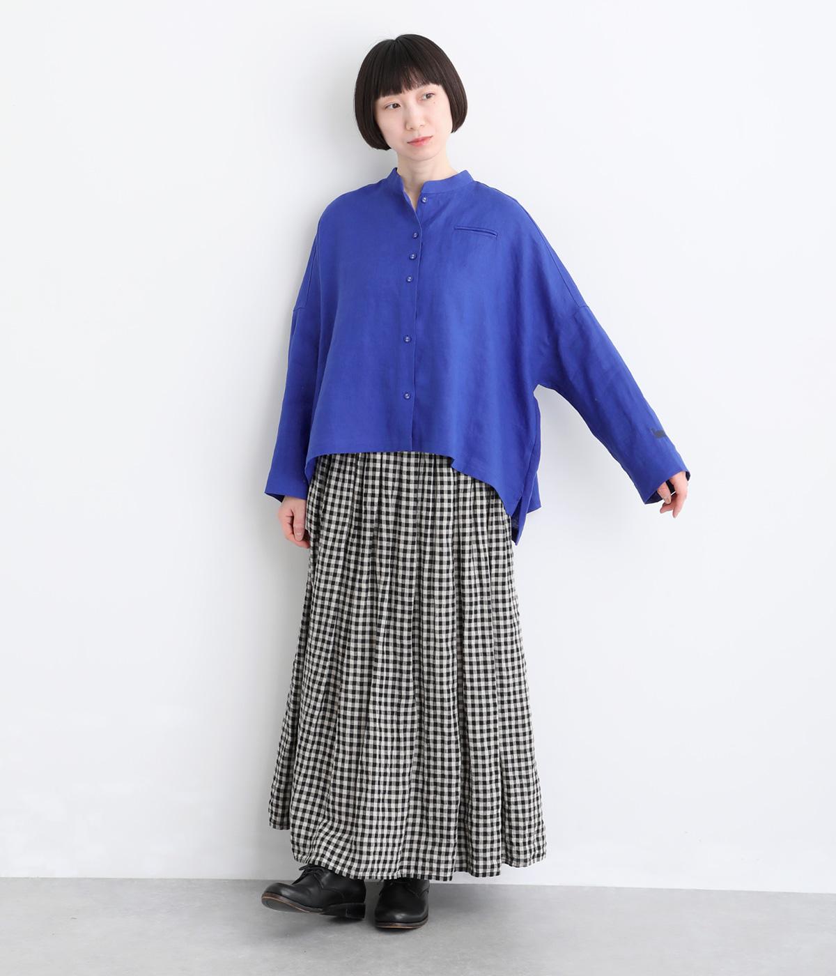 さらりとした肌ざわりが心地よいリネン素材です。ほどよいハリを備えつつ、しなやかに体になじむ、やわらかな風合いに仕上げました。ほのかな光沢とナチュラルなシワが奥行きを生み、着るほどに表情の変化をたのしめる生地感です。