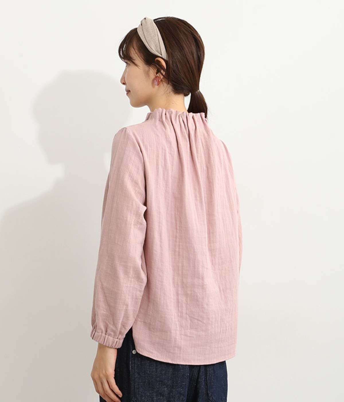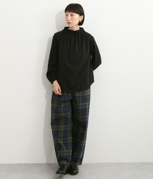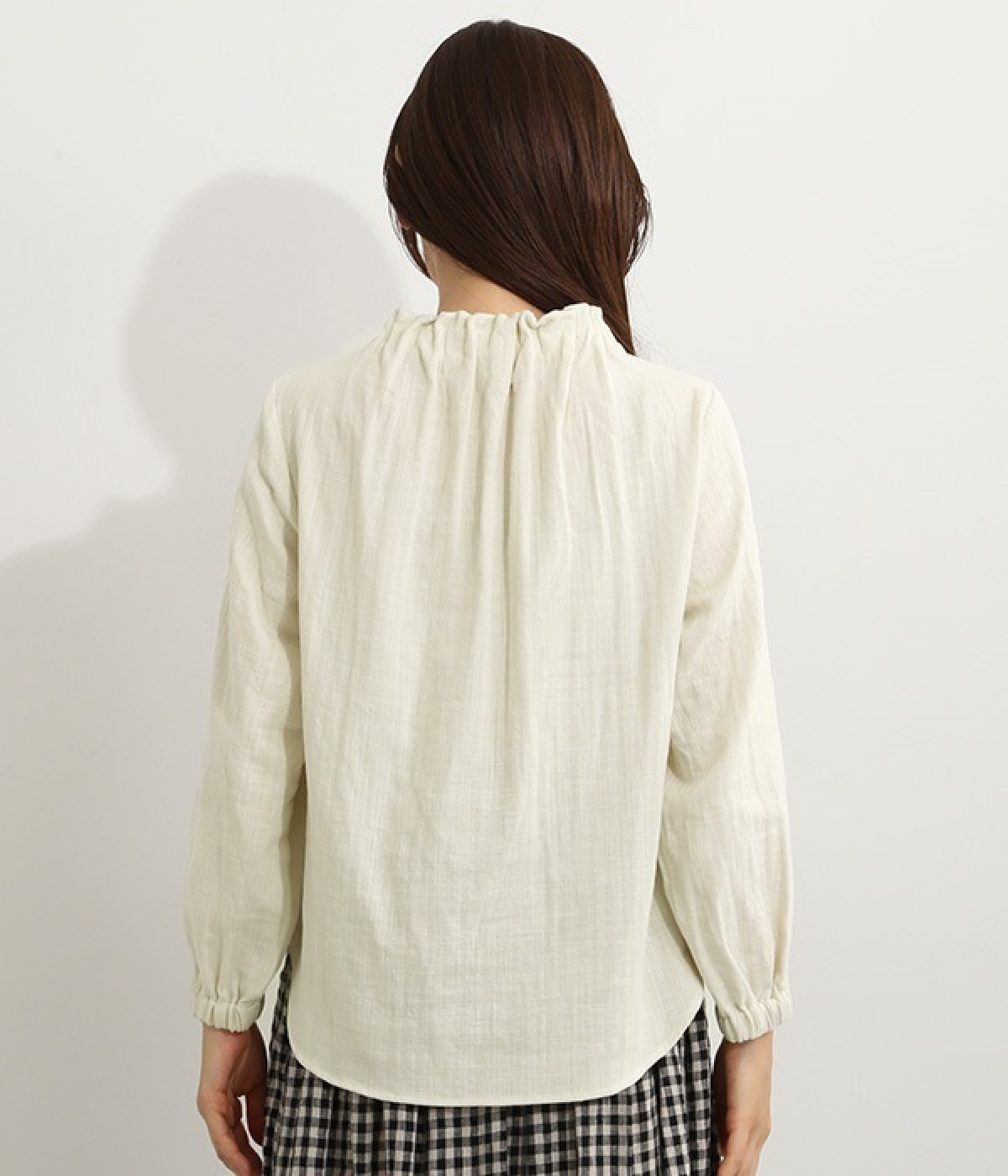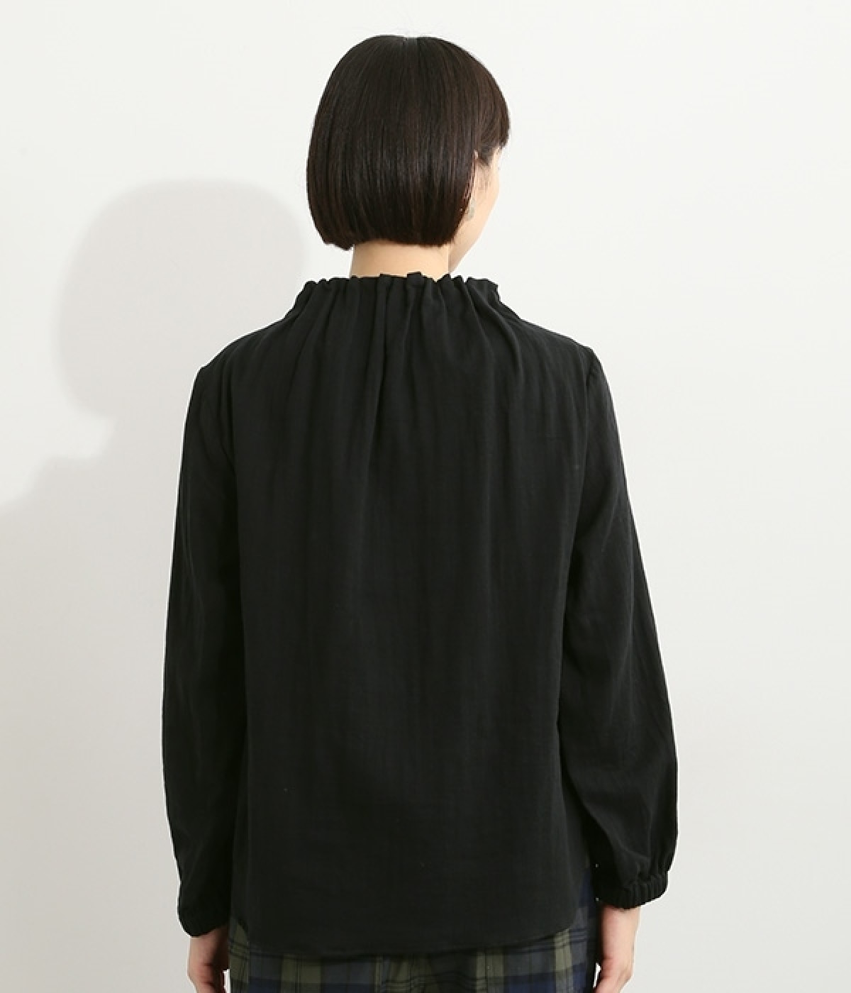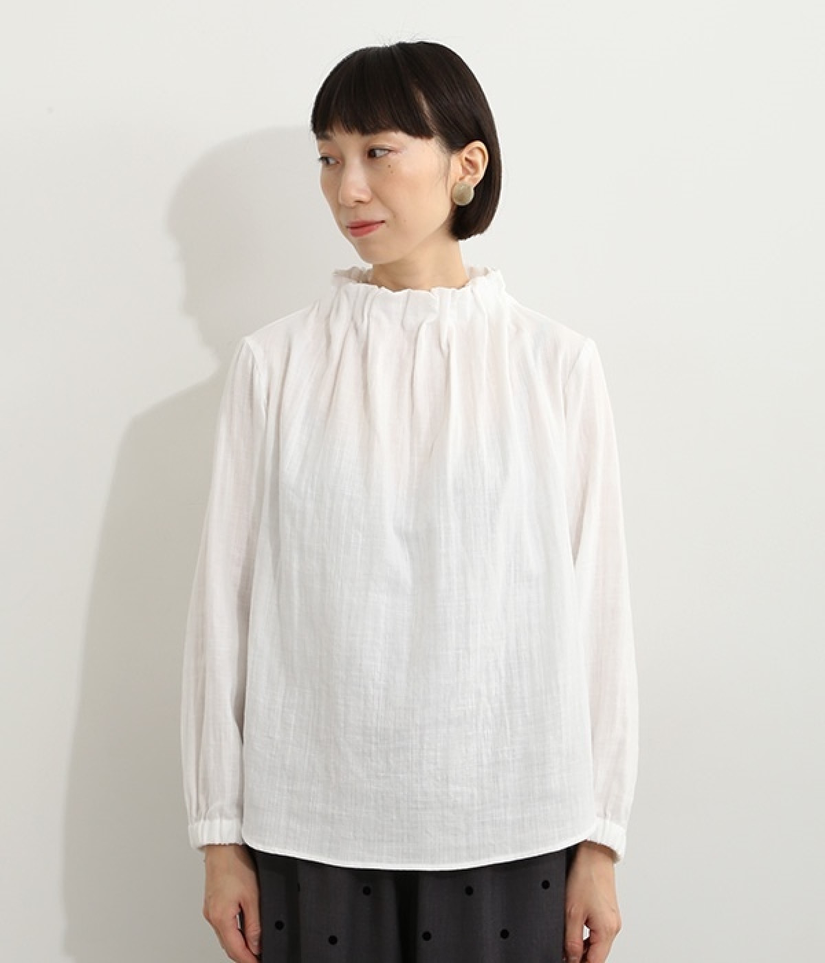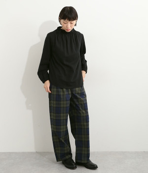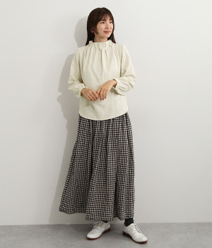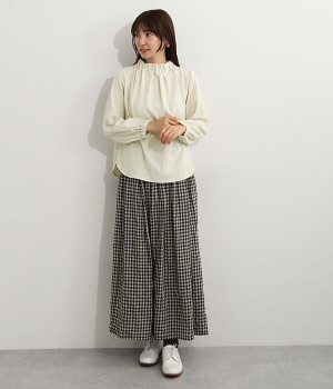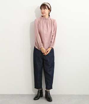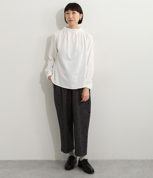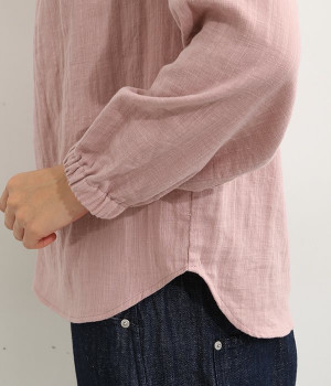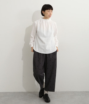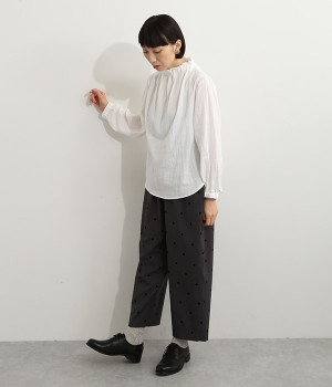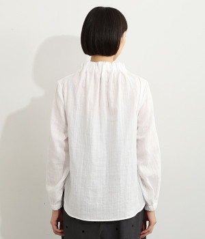 ブランドオリジナルの優しい肌触りを持つダブルガーゼを使用した、ゴム入りタックネックブラウス。ネックの高さを微妙に下げることで、着たときの首まわりがすっきりと見えます。袖口にもゴムを入れてふんわりと柔らかな雰囲気に仕立てました。袖まくりをするとシルエットにボリュームが足されてより華やかに。ジャケットのインナーやワンピースとのレイヤードにもおすすめです。