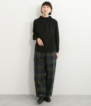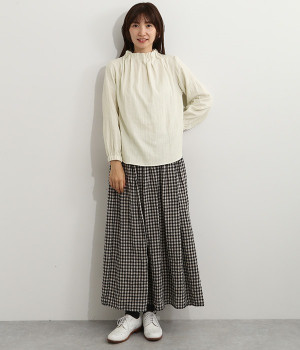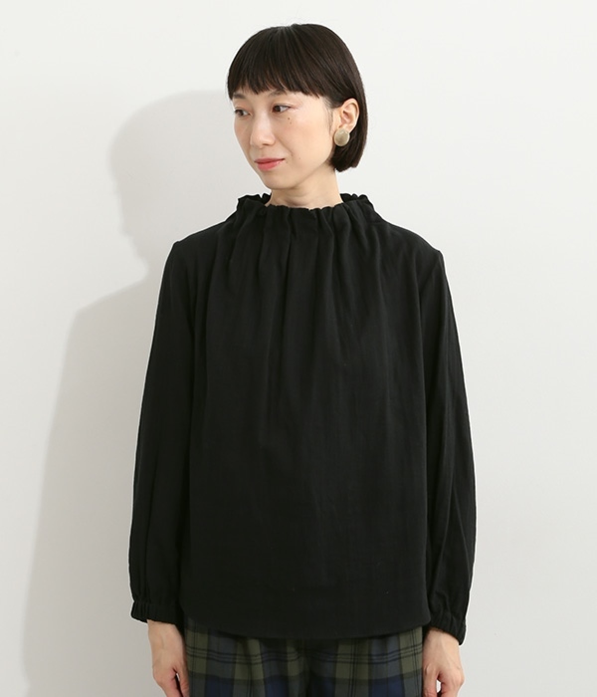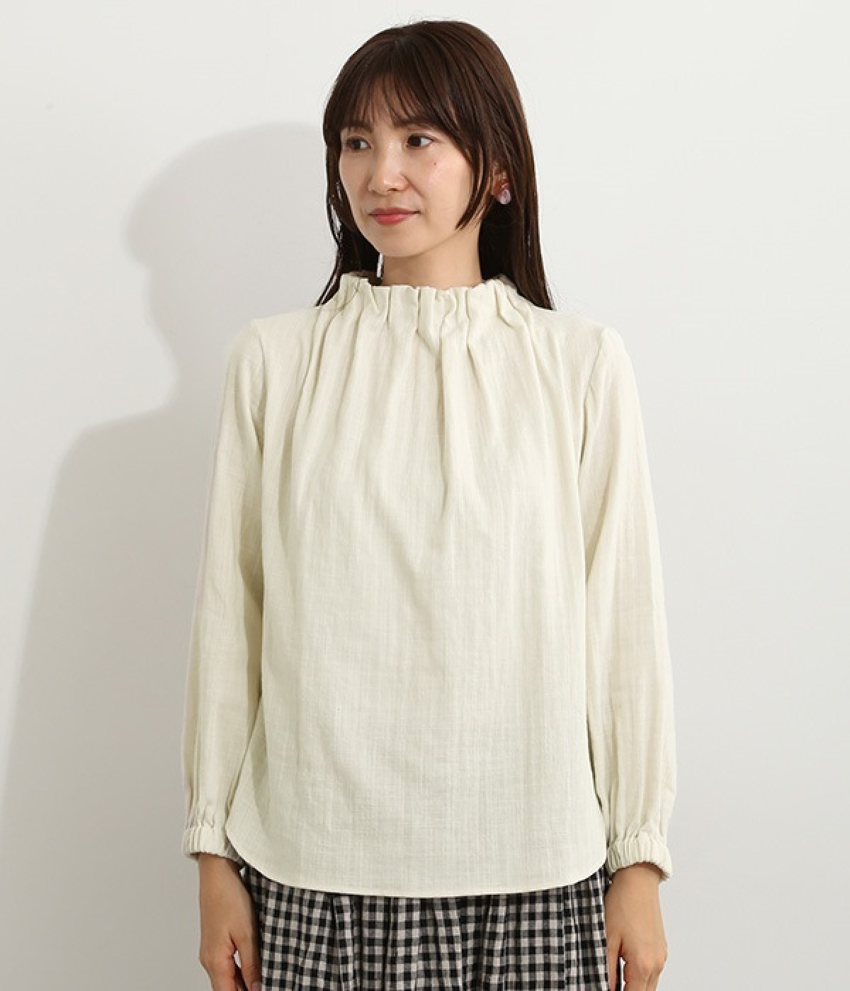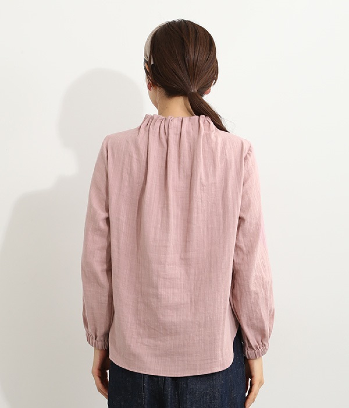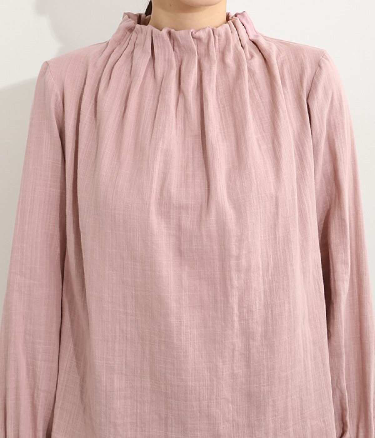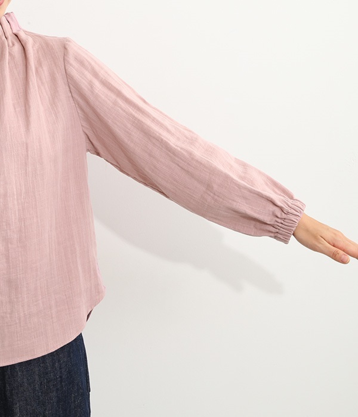 ブランドオリジナルの優しい肌触りを持つダブルガーゼを使用した、ゴム入りタックネックブラウス。ネックの高さを微妙に下げることで、着たときの首まわりがすっきりと見えます。袖口にもゴムを入れてふんわりと柔らかな雰囲気に仕立てました。袖まくりをするとシルエットにボリュームが足されてより華やかに。ジャケットのインナーやワンピースとのレイヤードにもおすすめです。