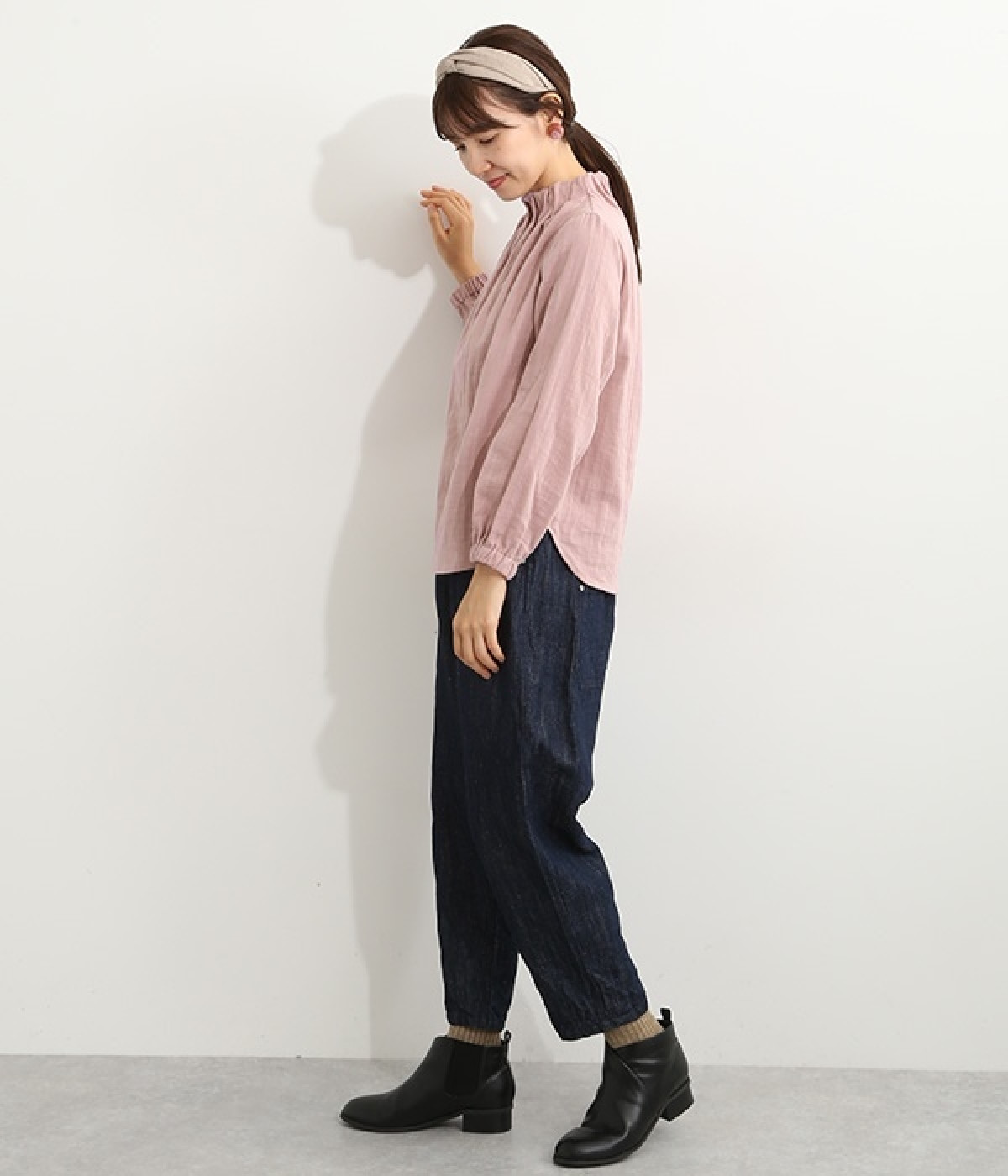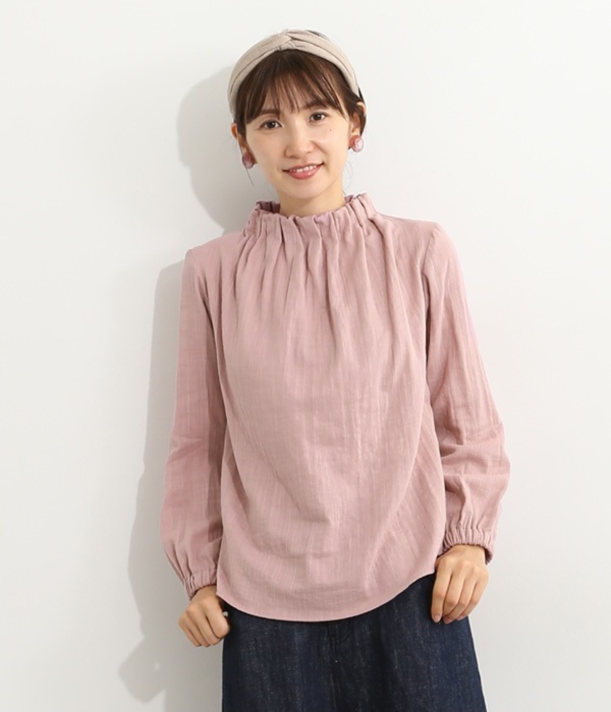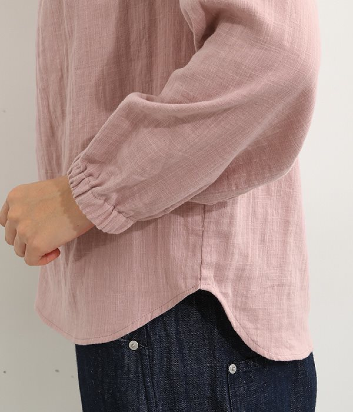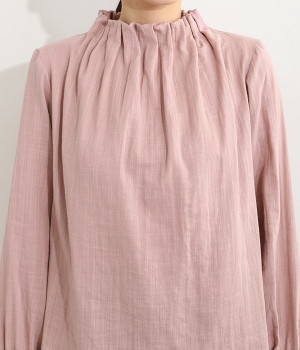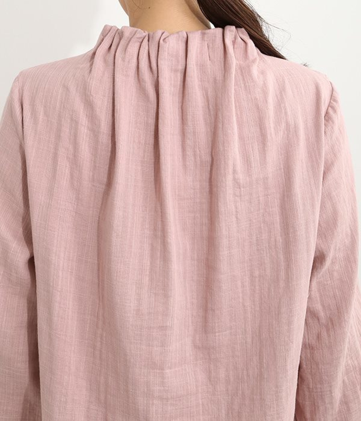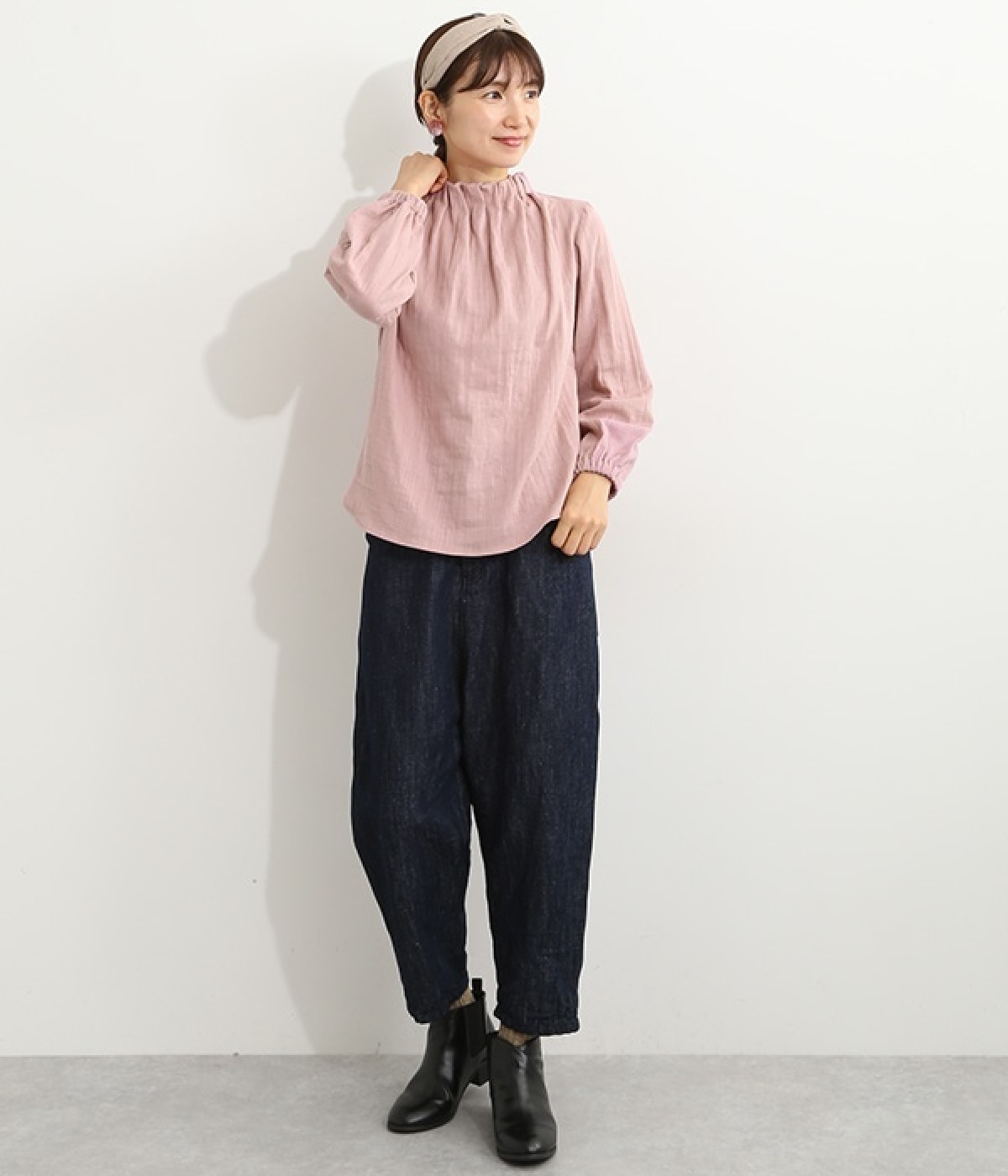 ブランドオリジナルの優しい肌触りを持つダブルガーゼを使用した、ゴム入りタックネックブラウス。ネックの高さを微妙に下げることで、着たときの首まわりがすっきりと見えます。袖口にもゴムを入れてふんわりと柔らかな雰囲気に仕立てました。袖まくりをするとシルエットにボリュームが足されてより華やかに。ジャケットのインナーやワンピースとのレイヤードにもおすすめです。