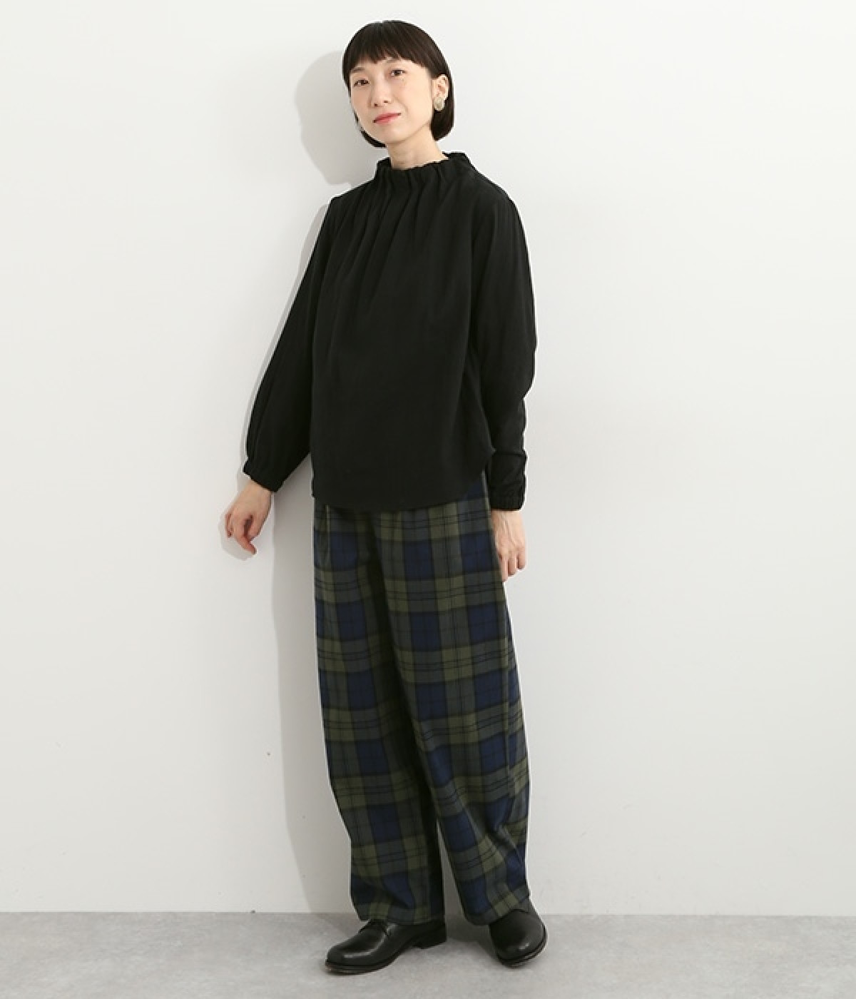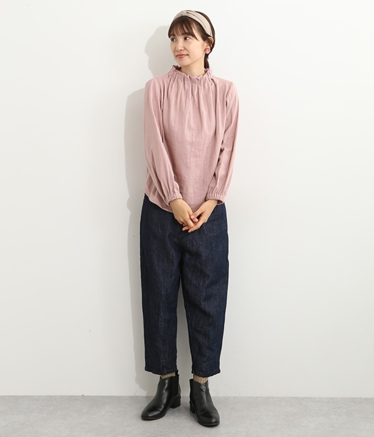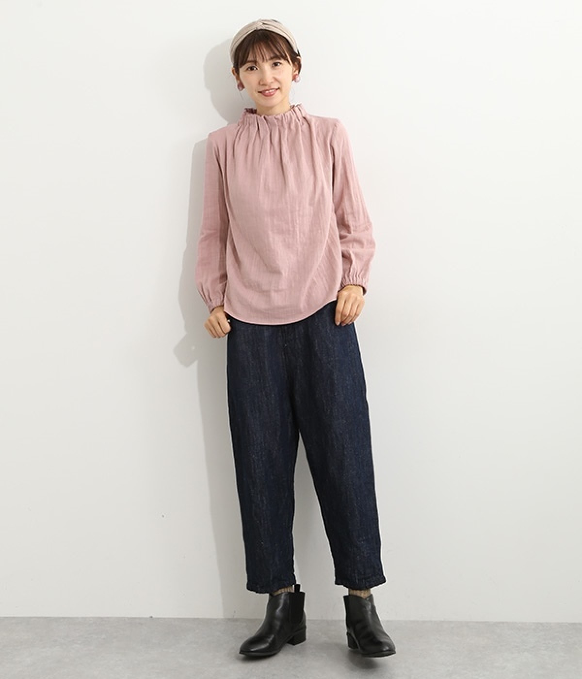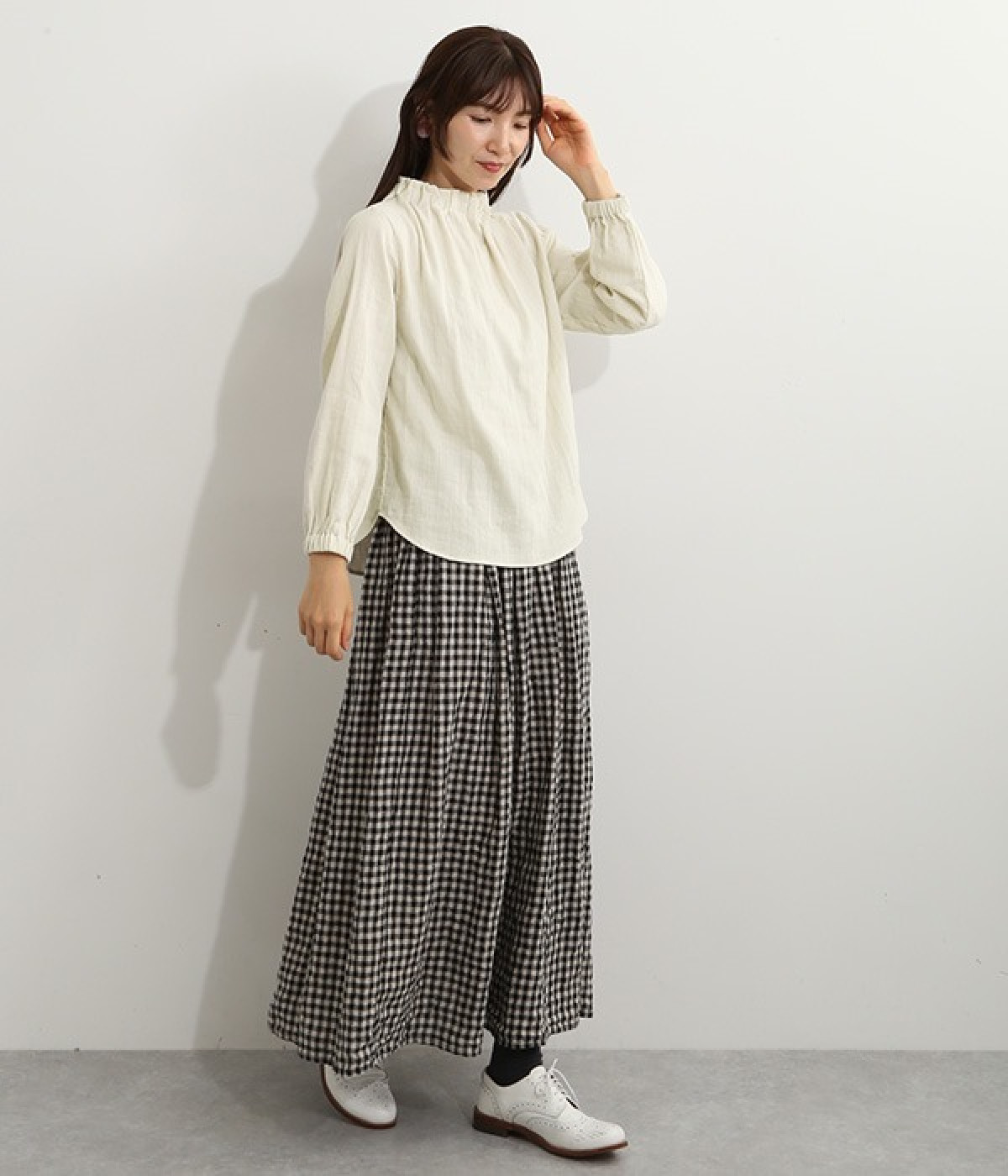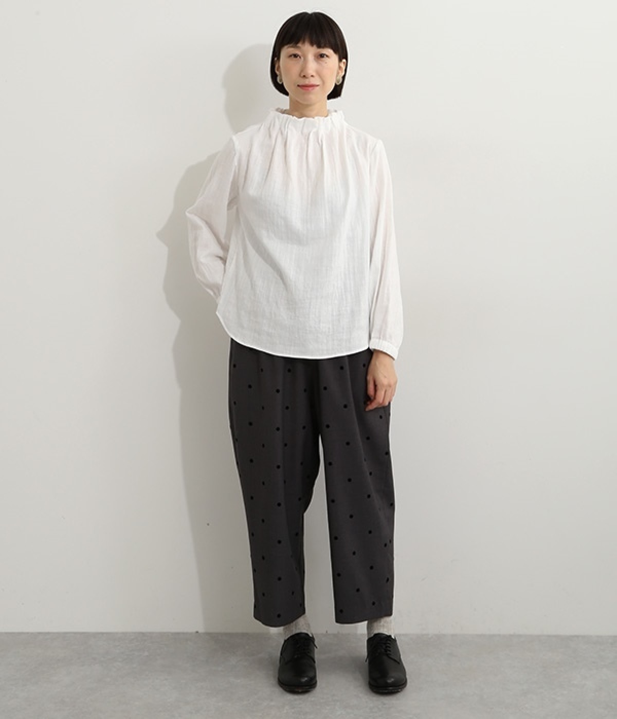 ブランドオリジナルの優しい肌触りを持つダブルガーゼを使用した、ゴム入りタックネックブラウス。ネックの高さを微妙に下げることで、着たときの首まわりがすっきりと見えます。袖口にもゴムを入れてふんわりと柔らかな雰囲気に仕立てました。袖まくりをするとシルエットにボリュームが足されてより華やかに。ジャケットのインナーやワンピースとのレイヤードにもおすすめです。