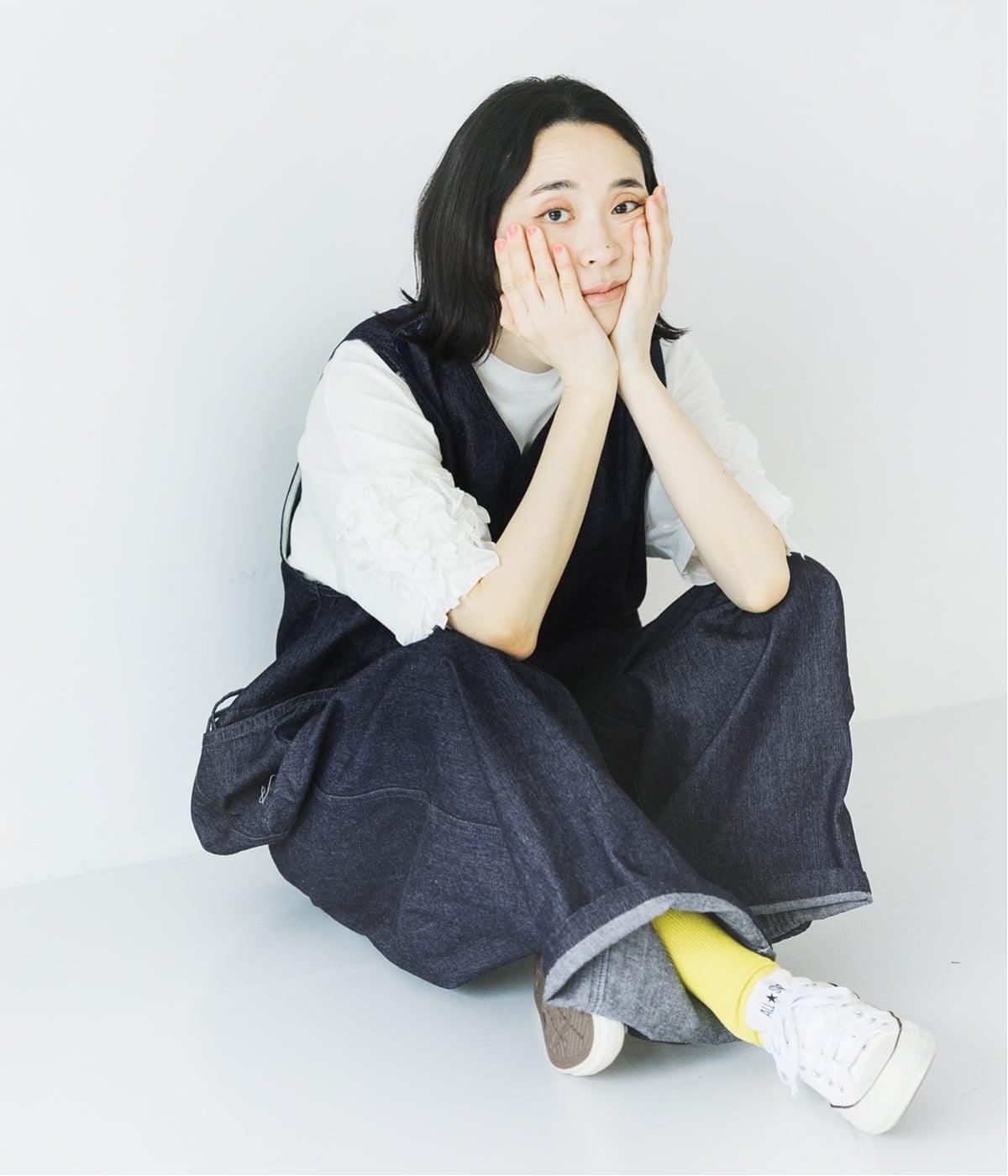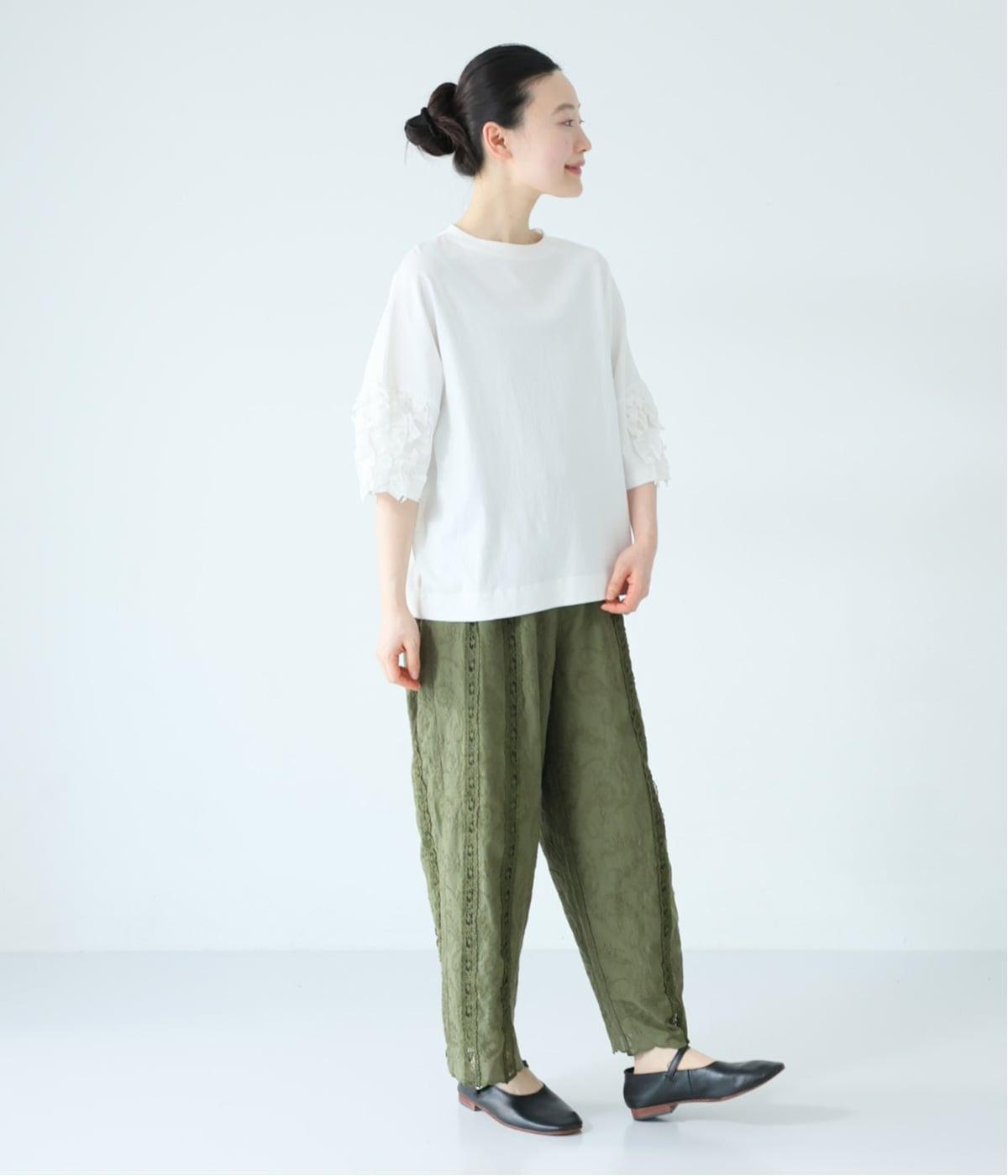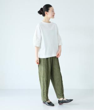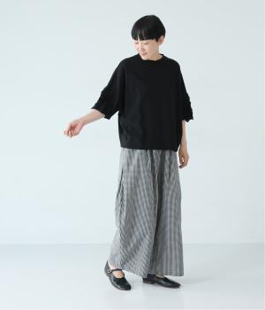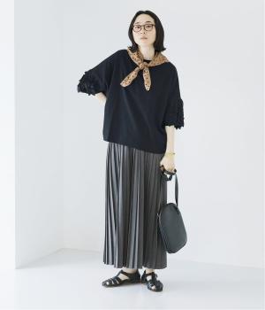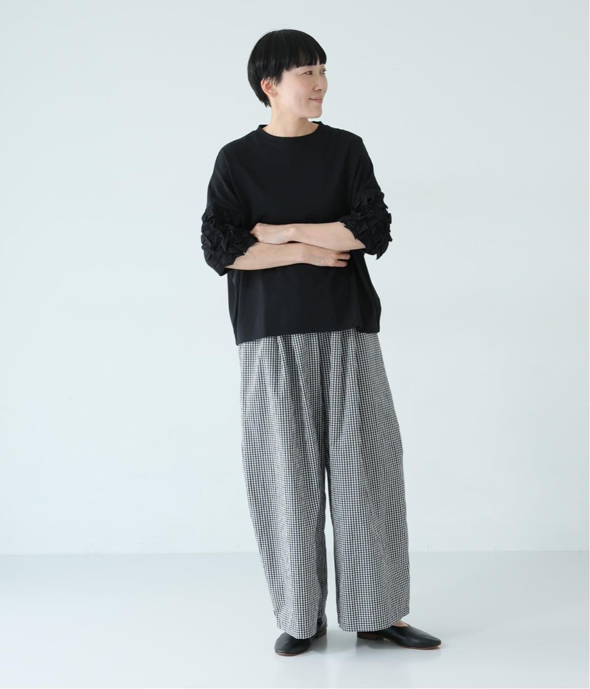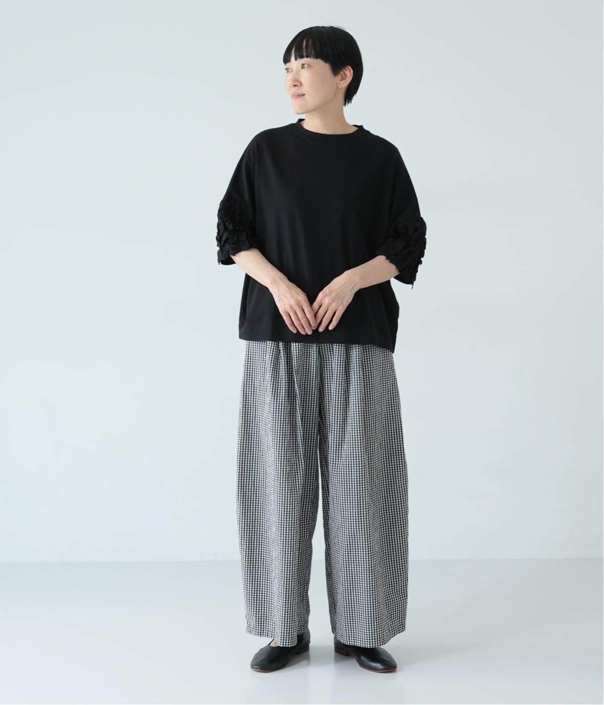 体のラインを拾いにくい、ゆとりのあるボックスシルエット。直線的なラインのボトムとも、すっきりとまとまります。