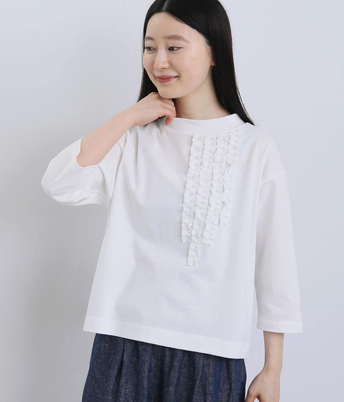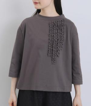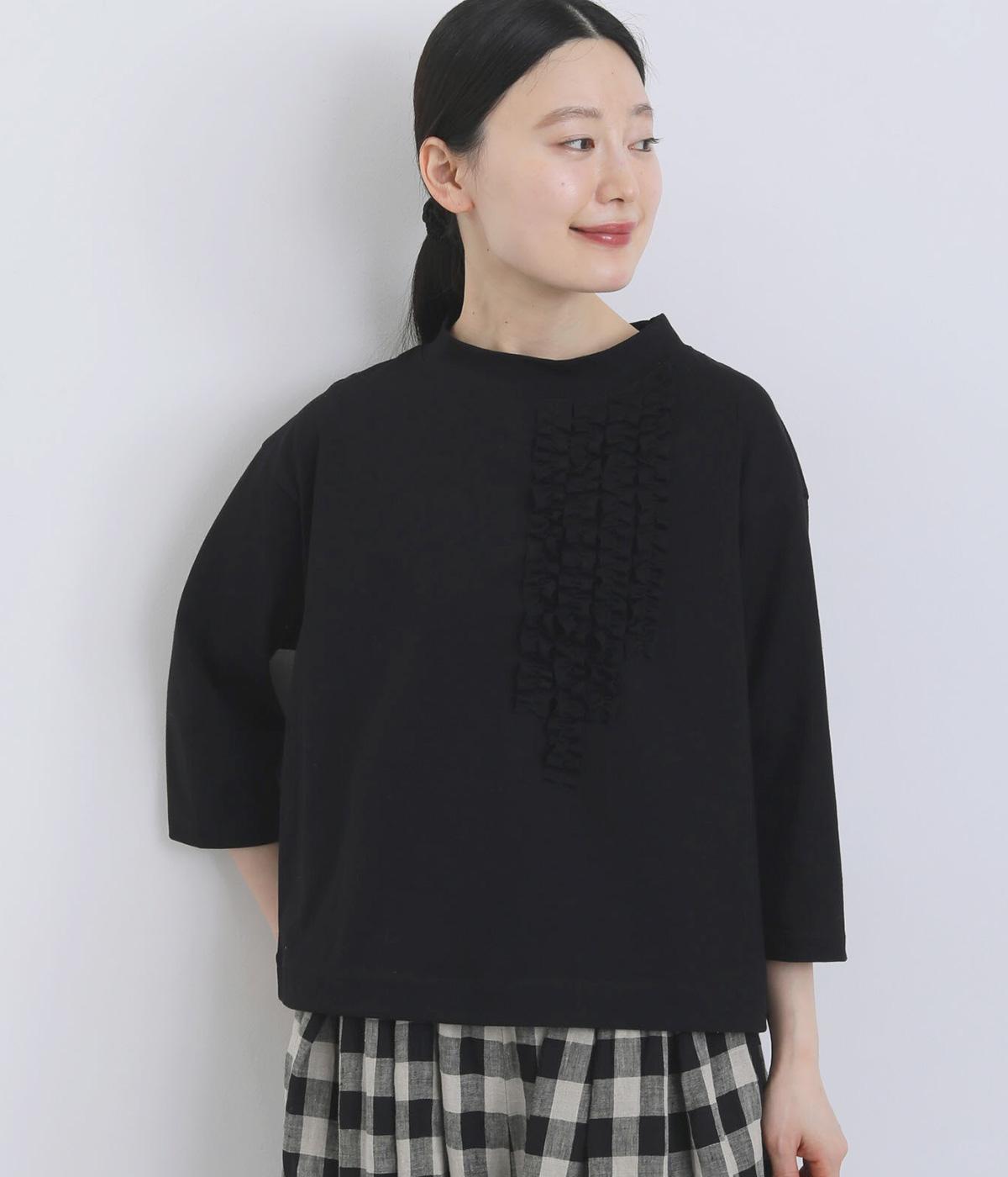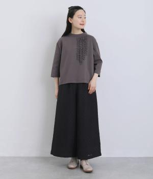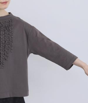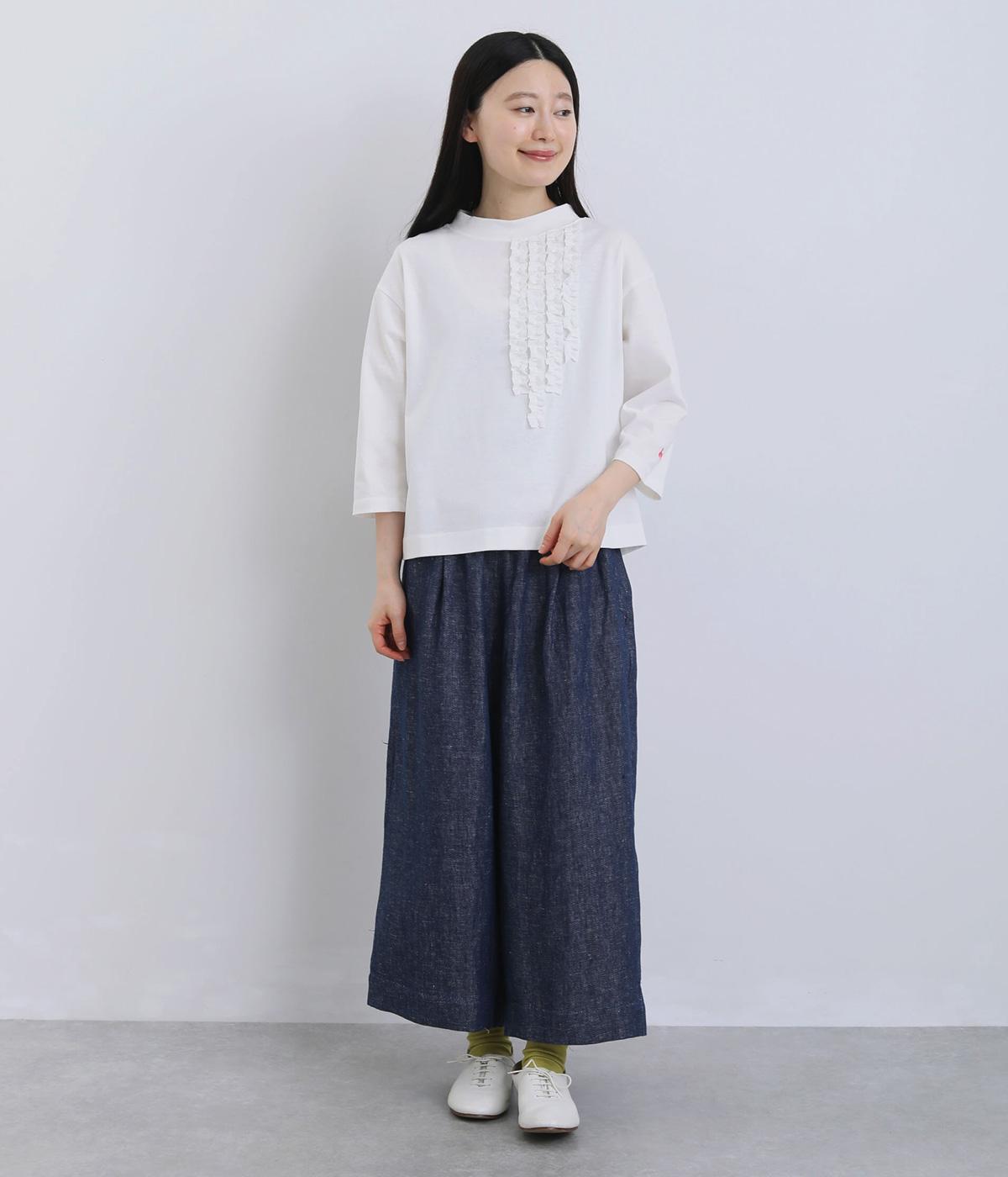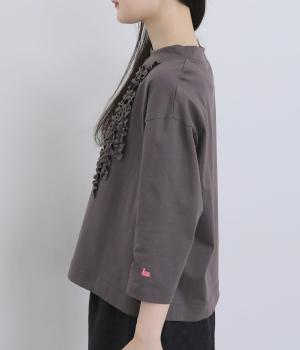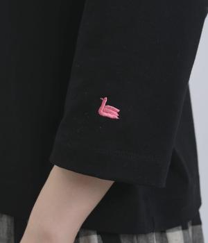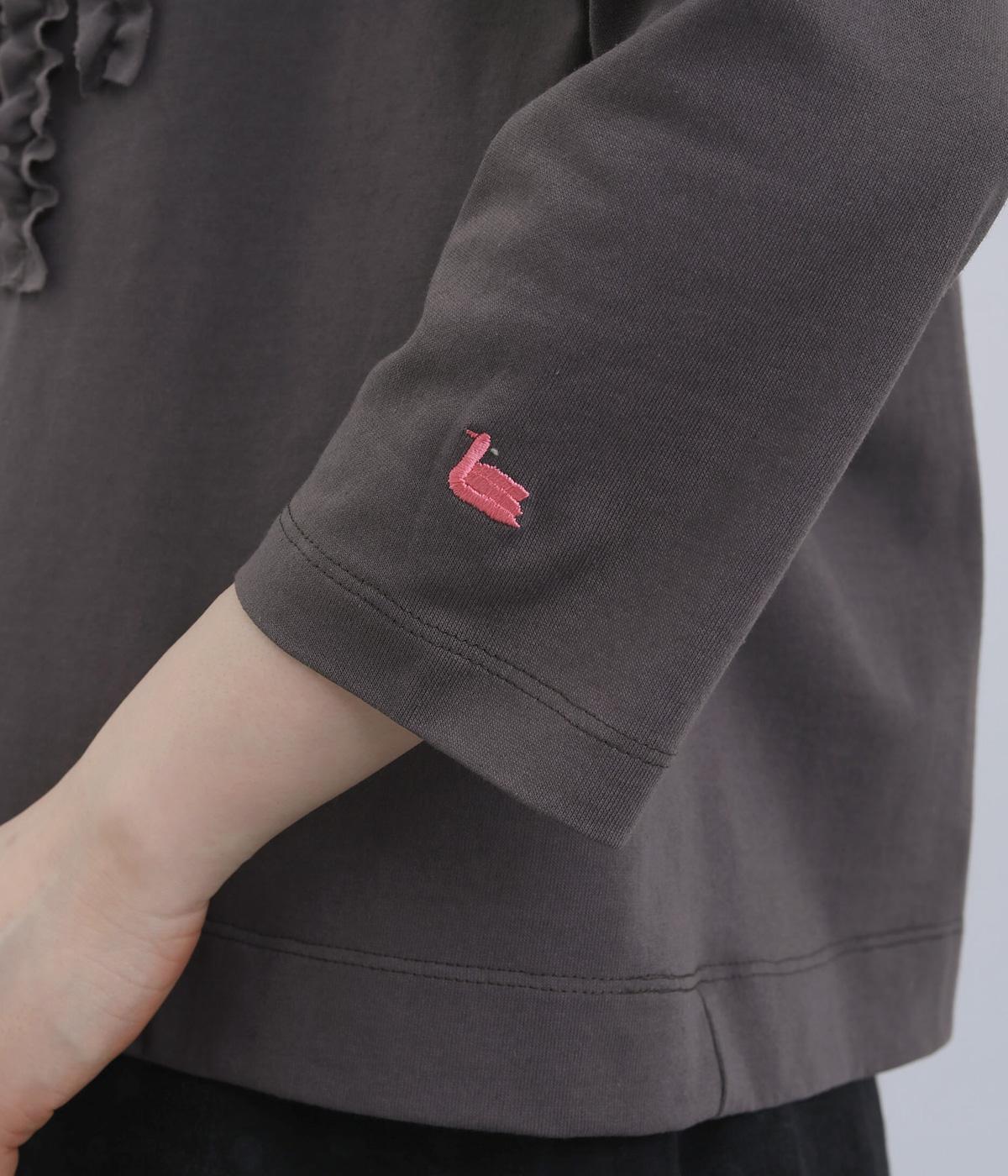 胸ヨークの中心から少しずらしたフリルラインが、ほどよい華やかさを演出。シルエットはほどよくゆとりがありながらも、モックネックとフィット感のある六分袖で、すっきりと上品に着られます。左袖に入った、ピンクの小さなスワン刺しゅうがさりげないアクセント。