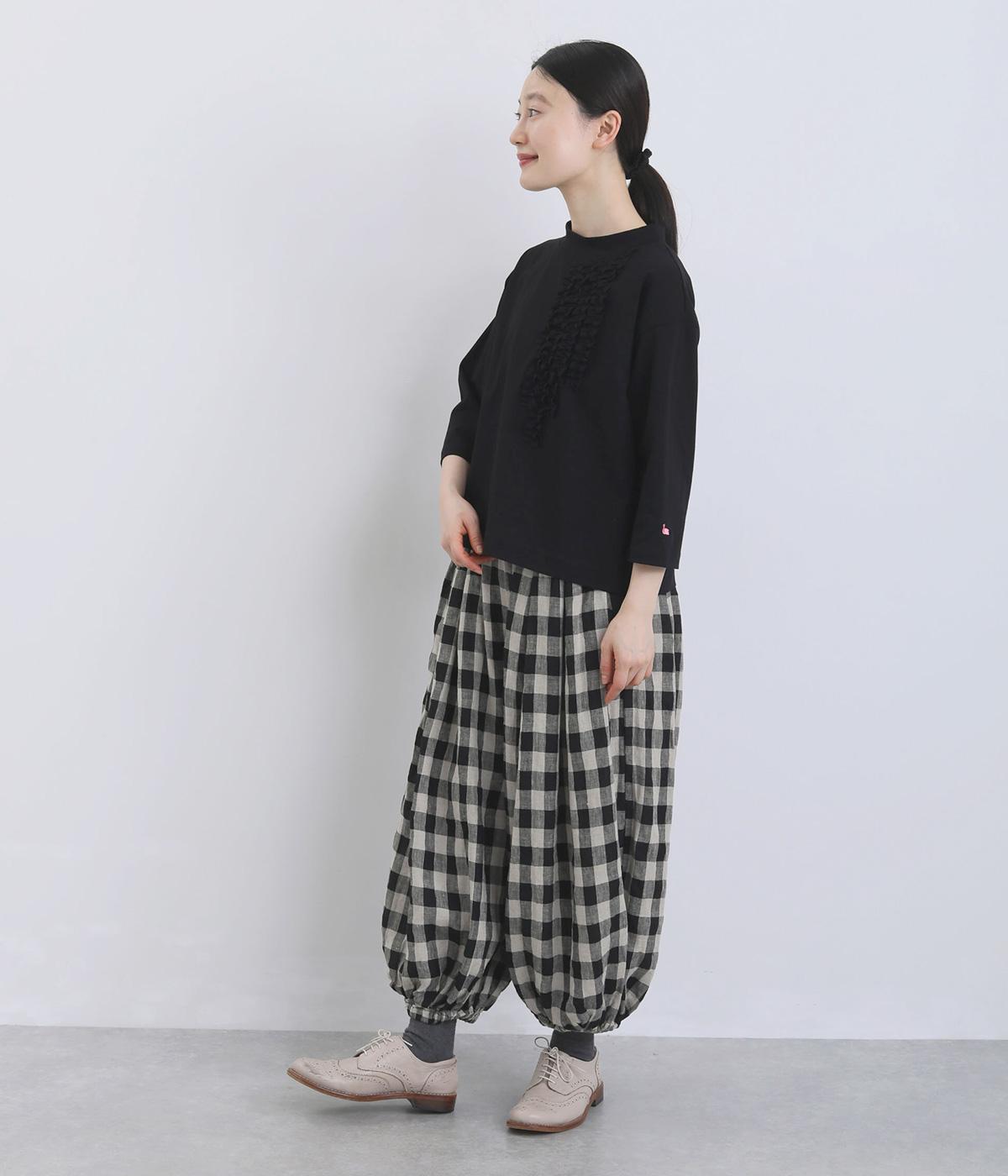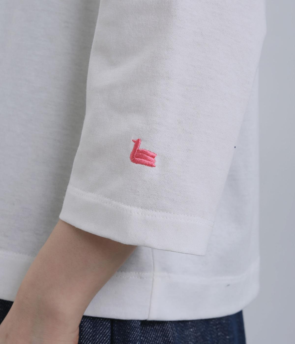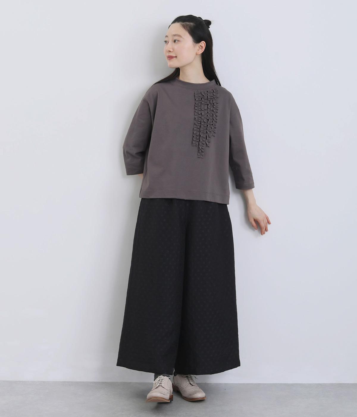胸ヨークの中心から少しずらしたフリルラインが、ほどよい華やかさを演出。シルエットはほどよくゆとりがありながらも、モックネックとフィット感のある六分袖で、すっきりと上品に着られます。左袖に入った、ピンクの小さなスワン刺しゅうがさりげないアクセント。