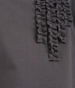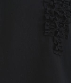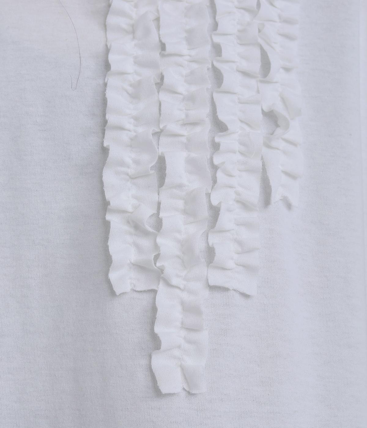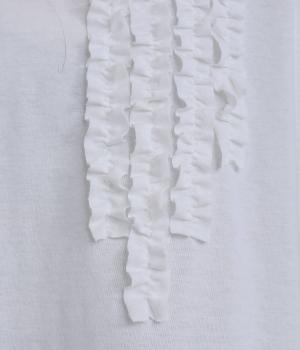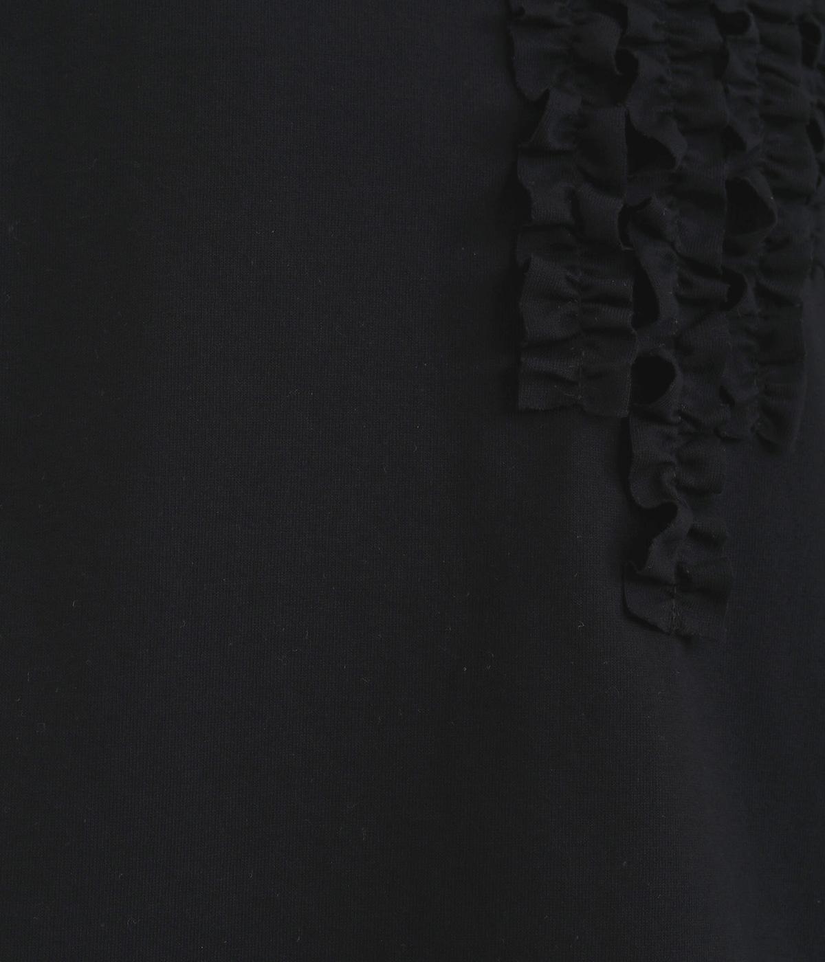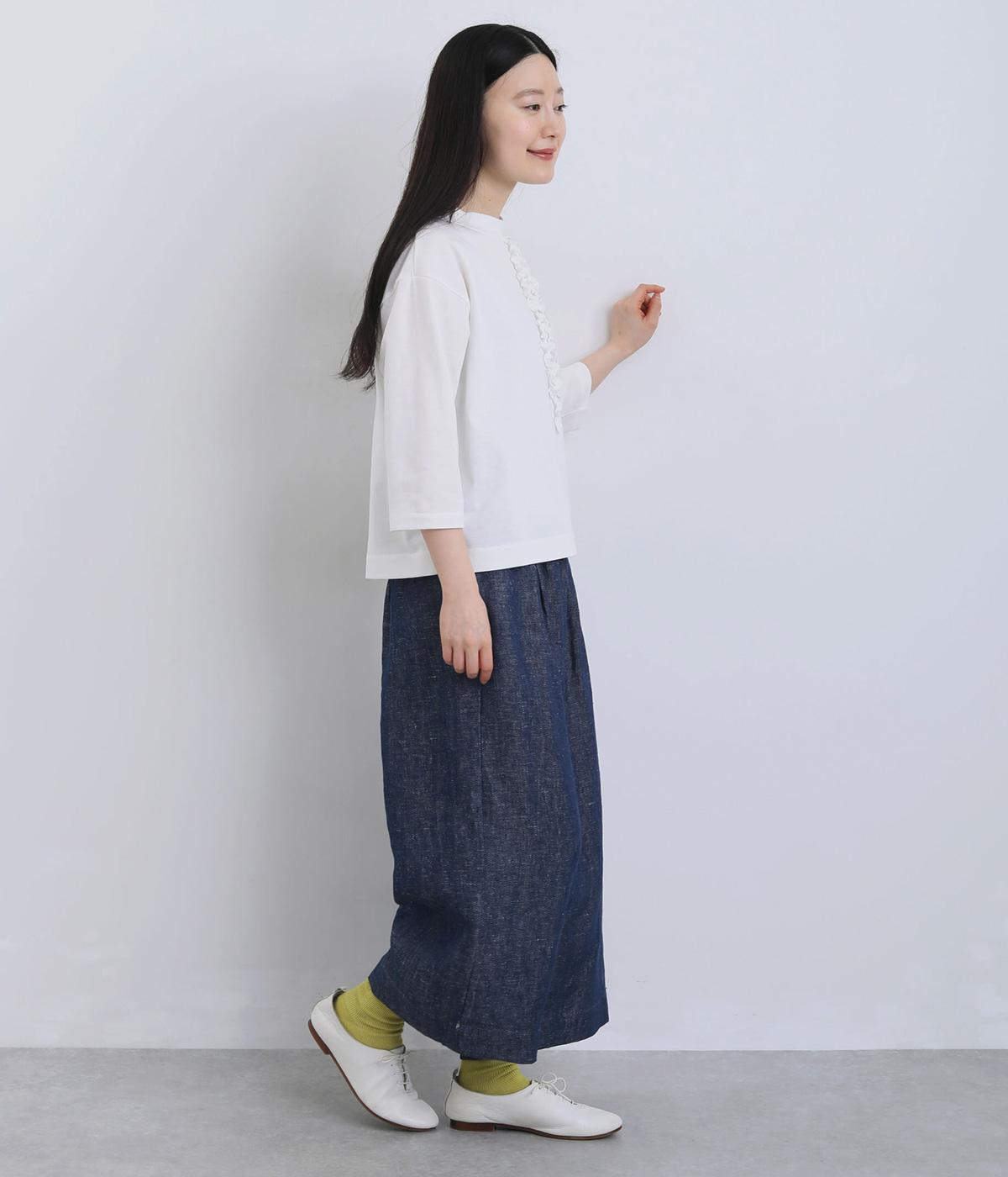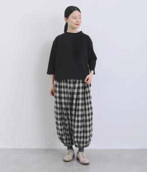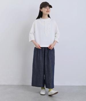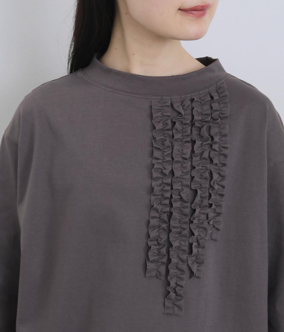 胸ヨークの中心から少しずらしたフリルラインが、ほどよい華やかさを演出。シルエットはほどよくゆとりがありながらも、モックネックとフィット感のある六分袖で、すっきりと上品に着られます。左袖に入った、ピンクの小さなスワン刺しゅうがさりげないアクセント。