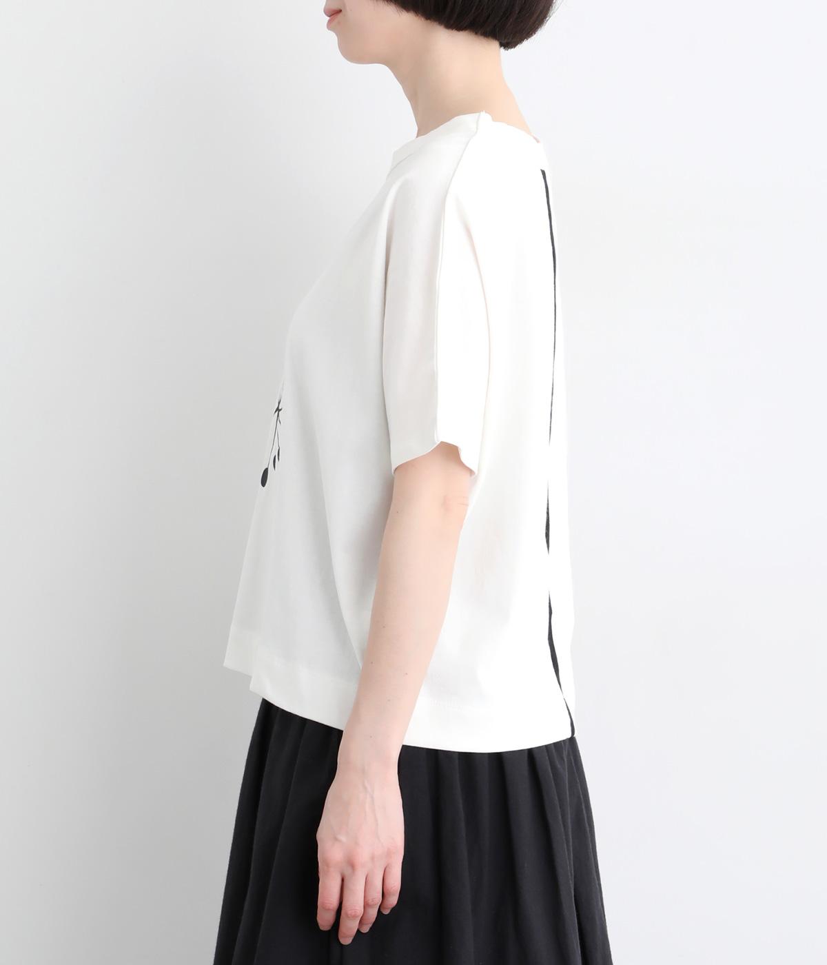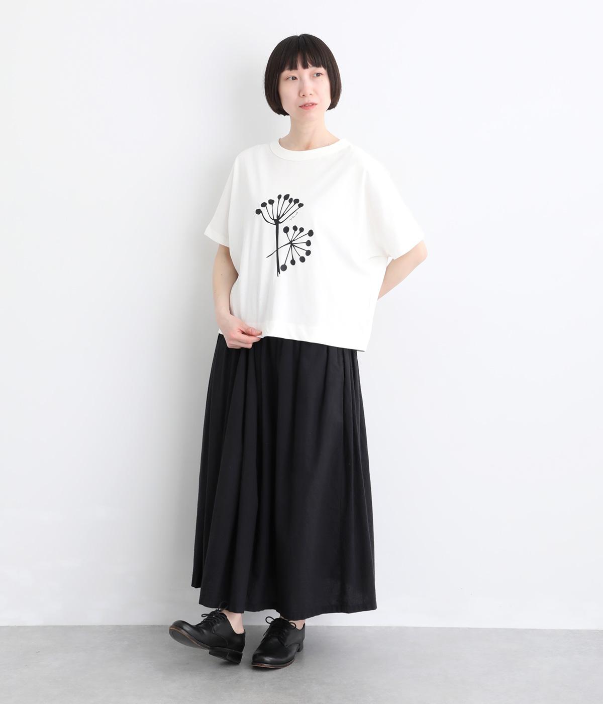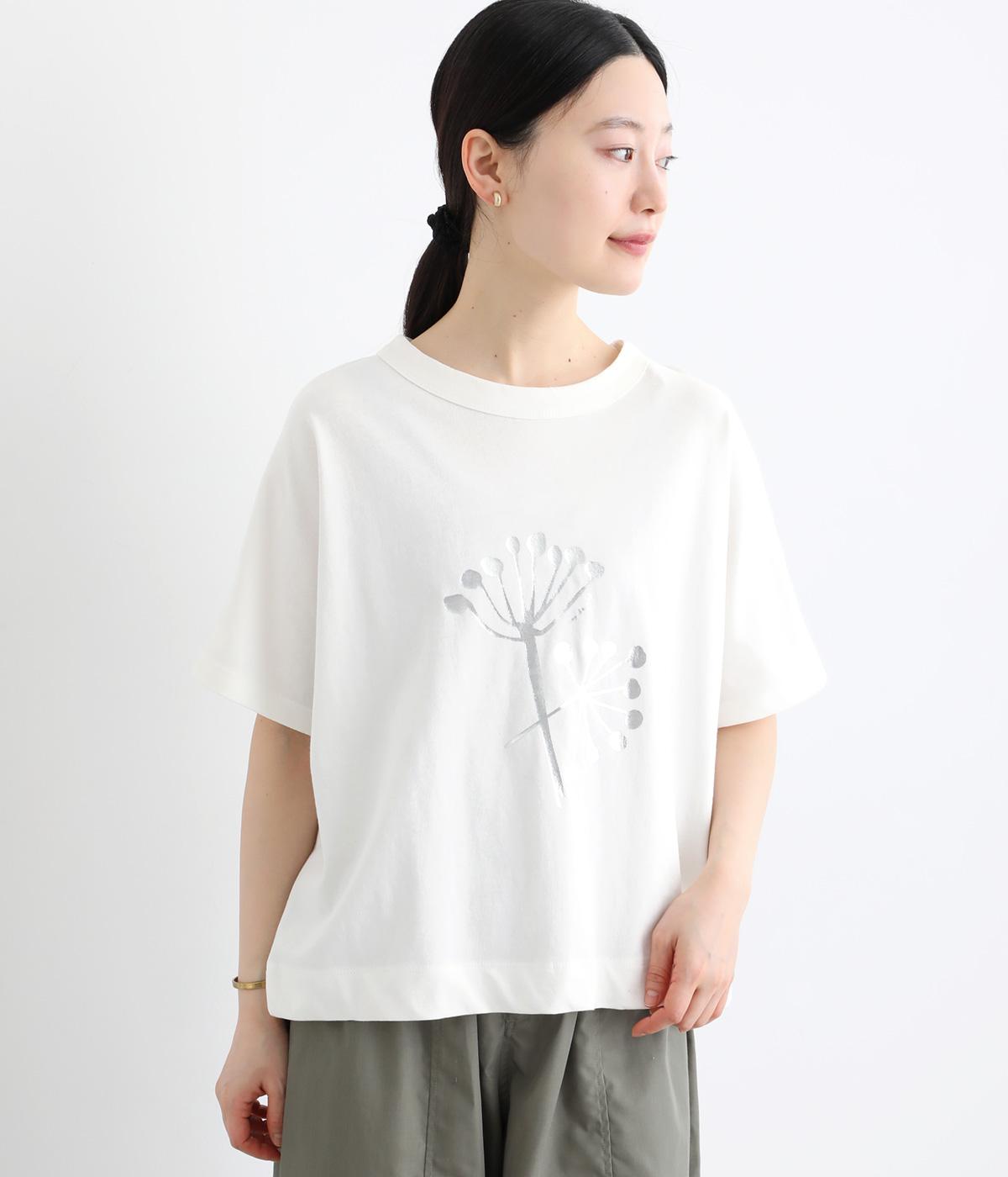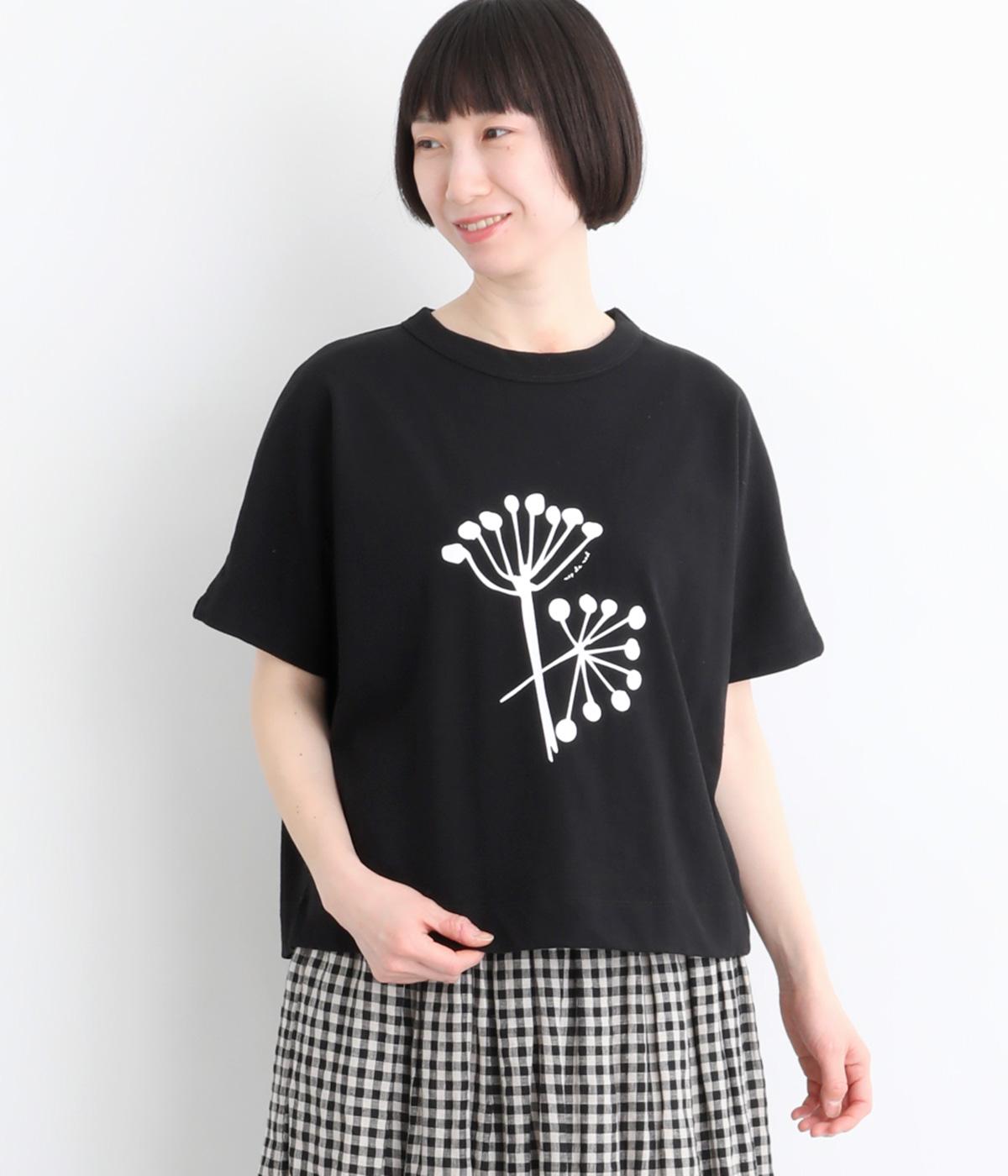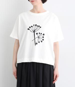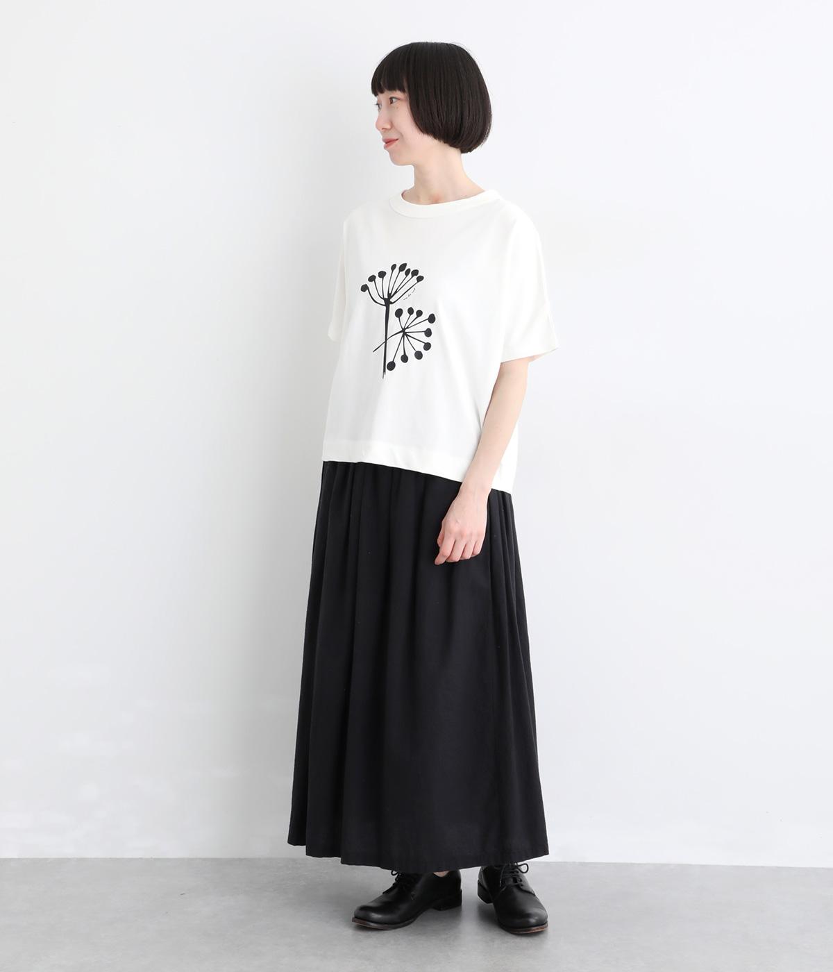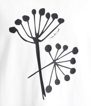 北欧の花をイメージしたプリントが印象的なTシャツです。ドルマンスリーブが腕のラインをやさしくカバーし、すっきりとした丈感でバランスよく着こなせます。うしろの配色ラインと太めのバインダー襟がアクセントになり、コーディネートにほどよい個性をプラス。