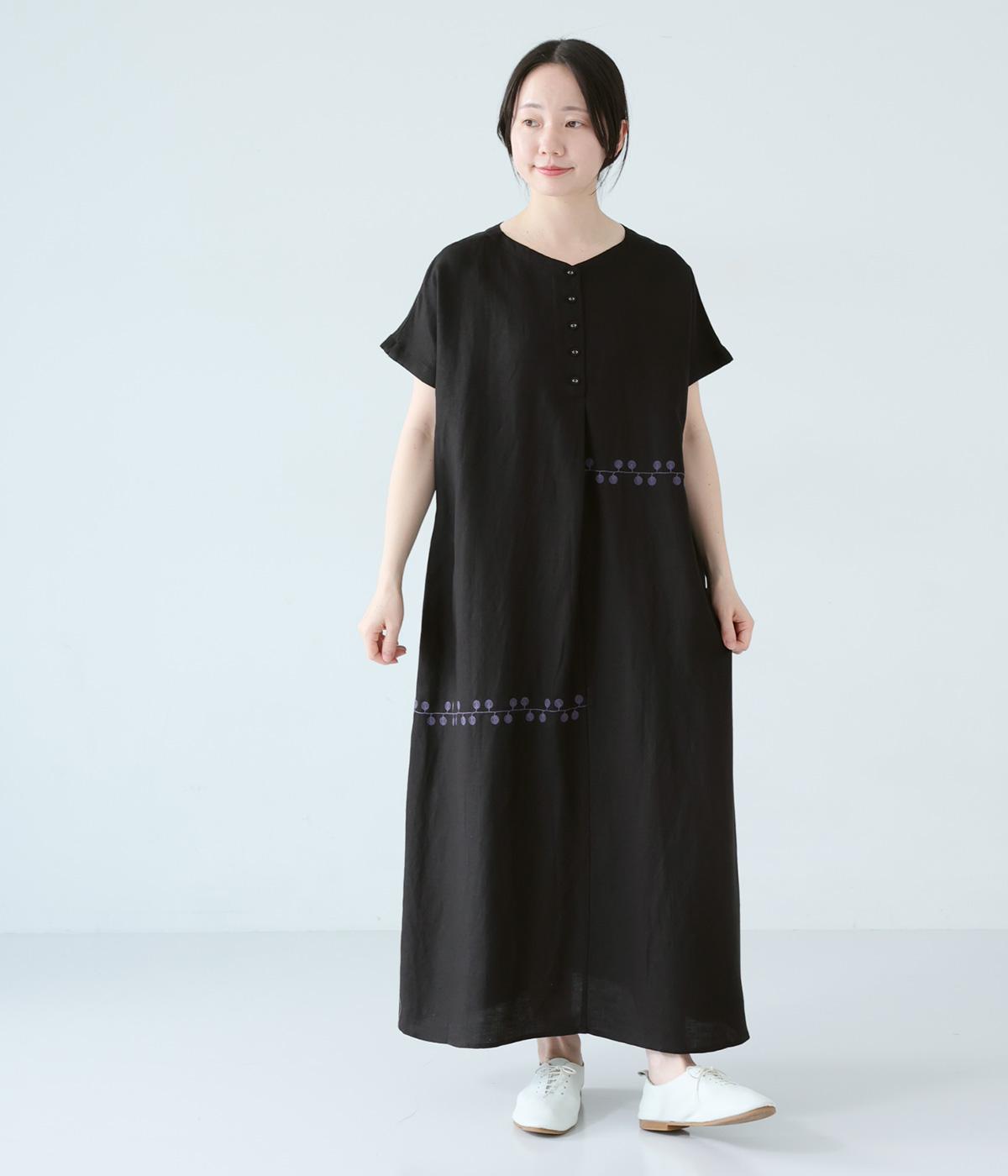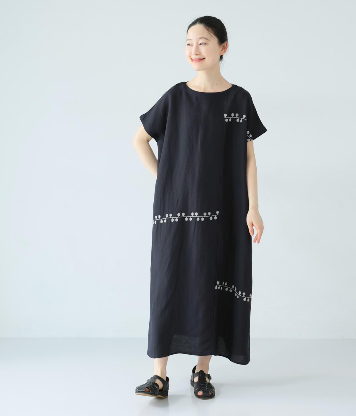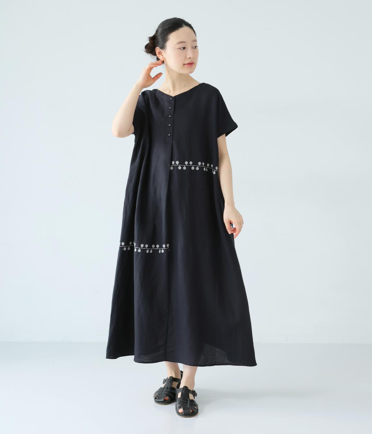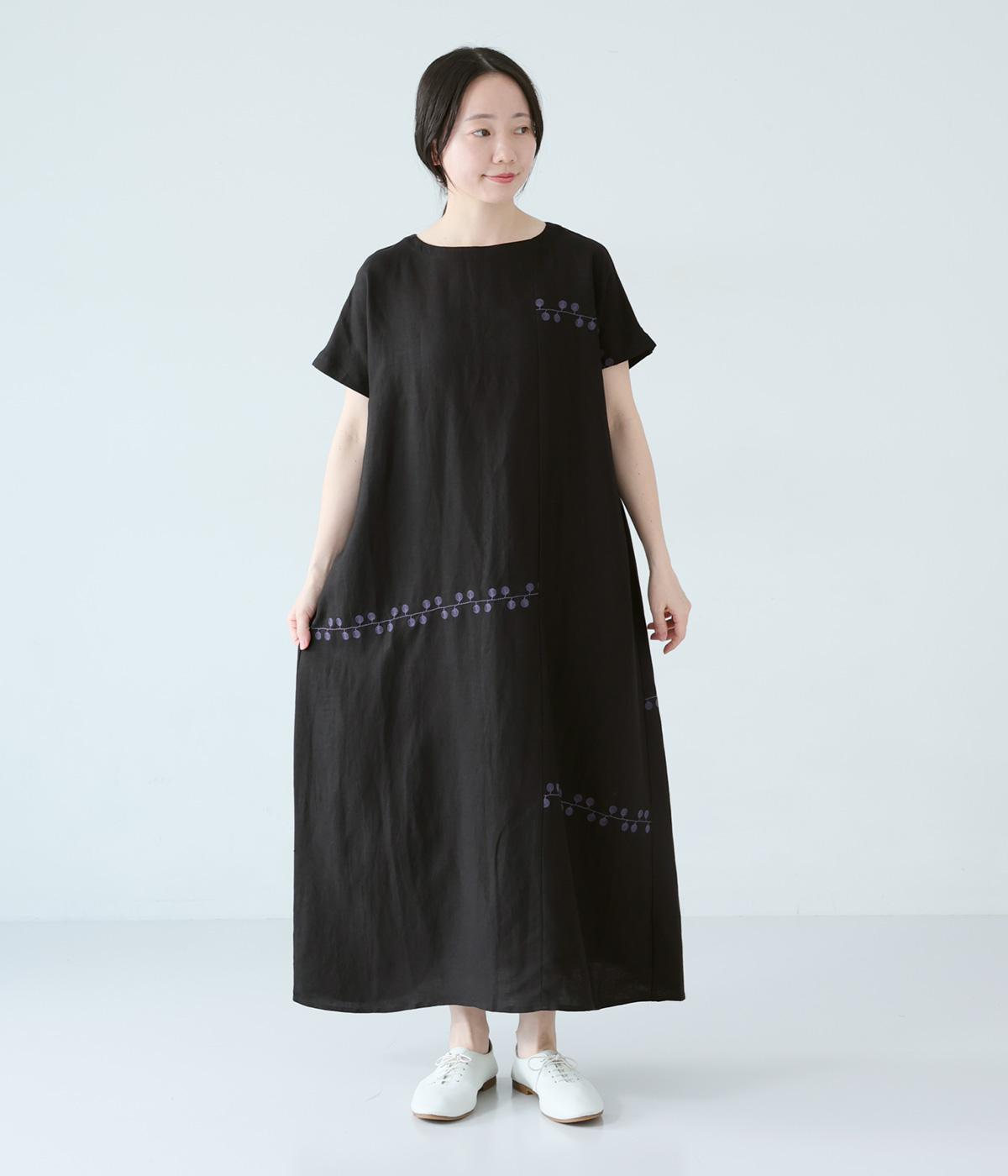 リネンレーヨンライン刺繍サルエルパンツ(ブラック-F)