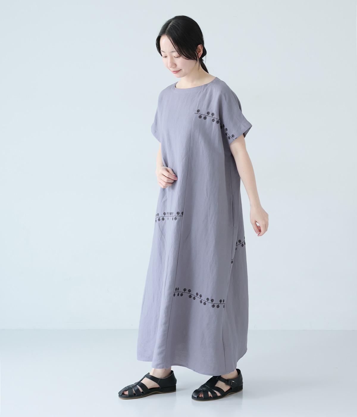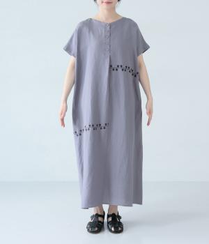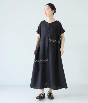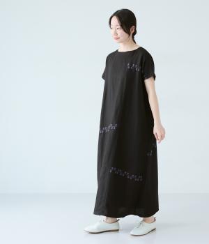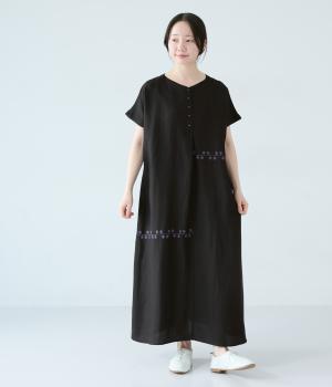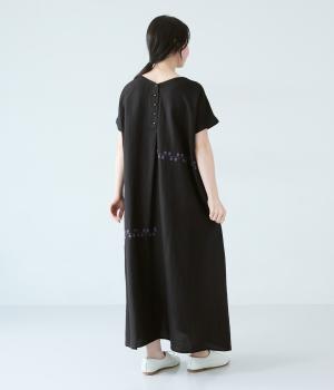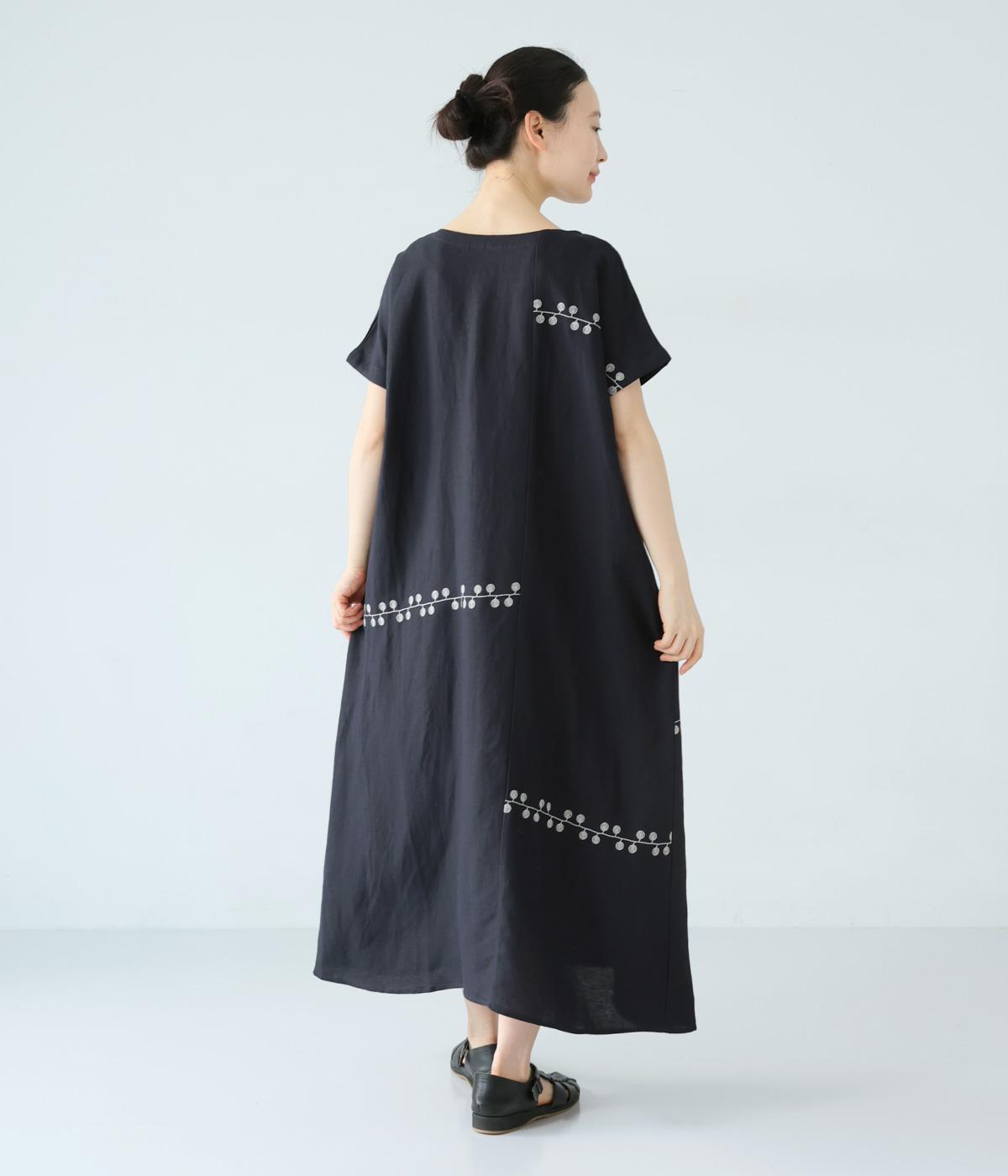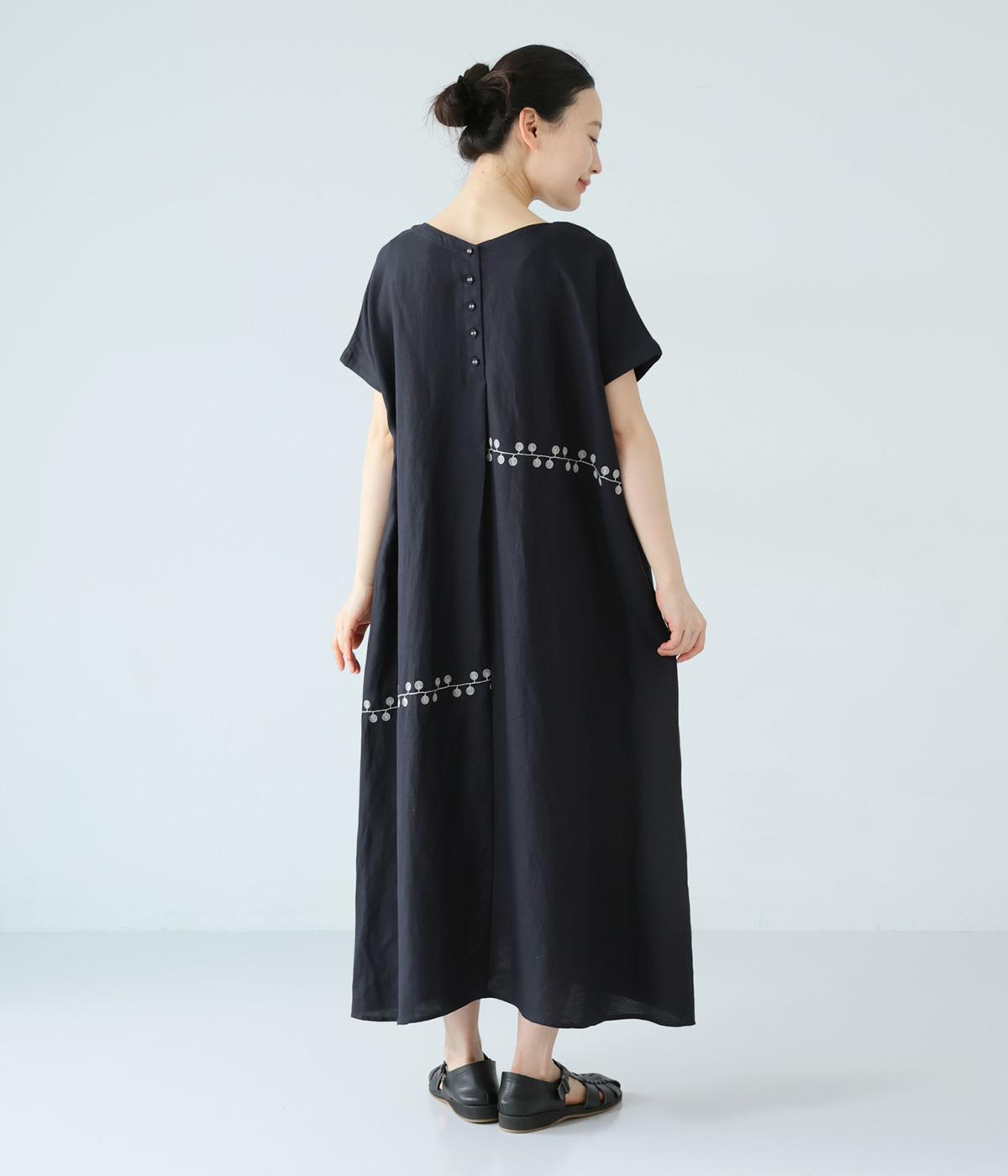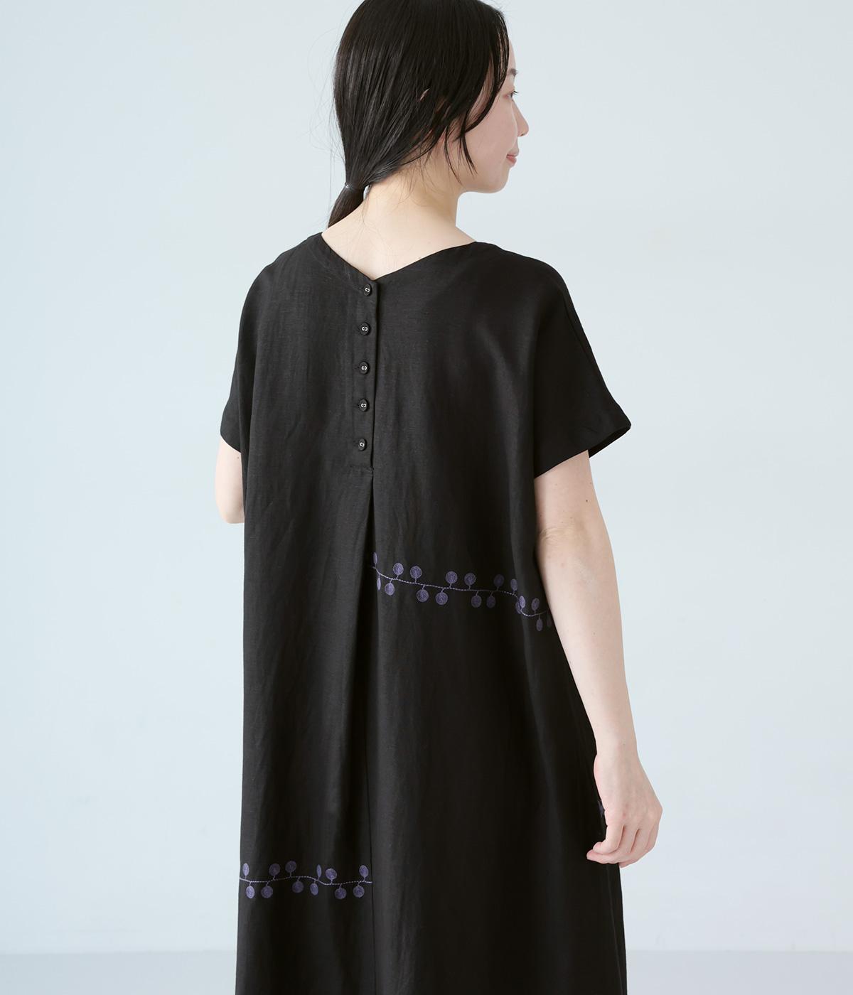 リネンレーヨンライン刺繍サルエルパンツ(ブラック-F)