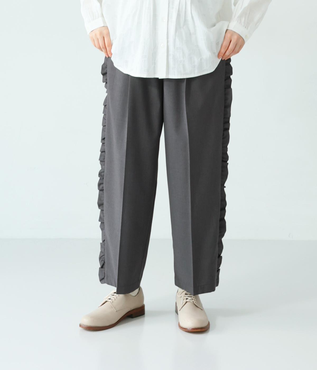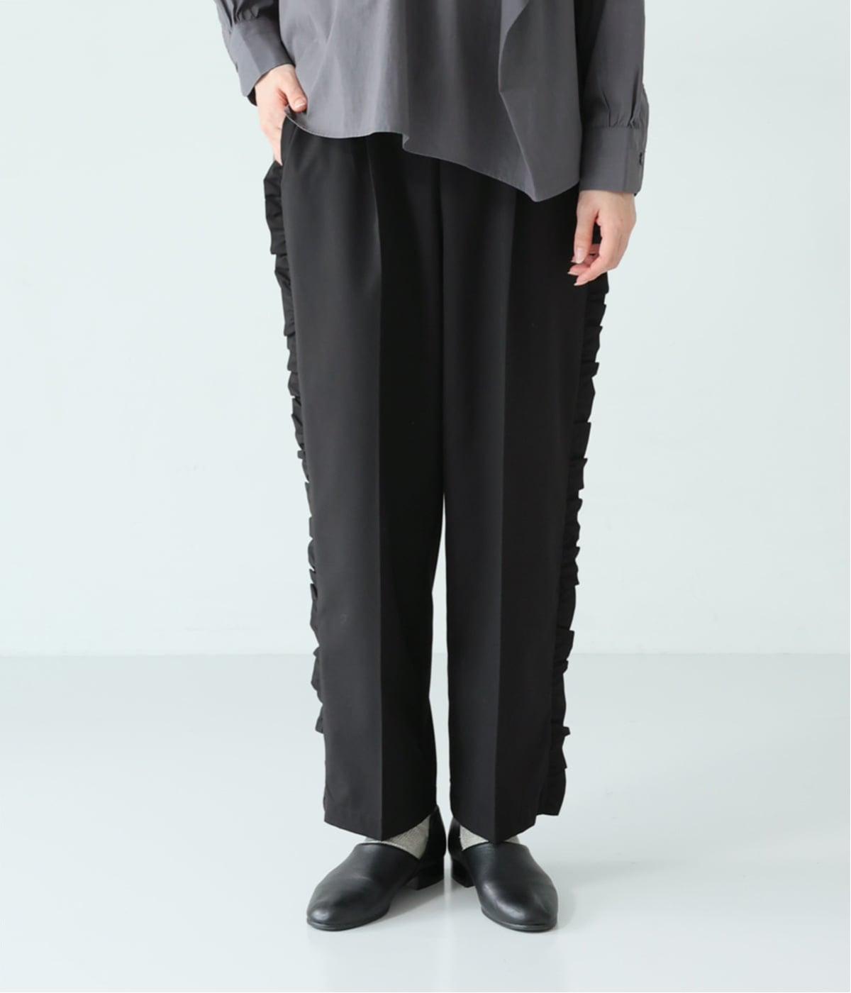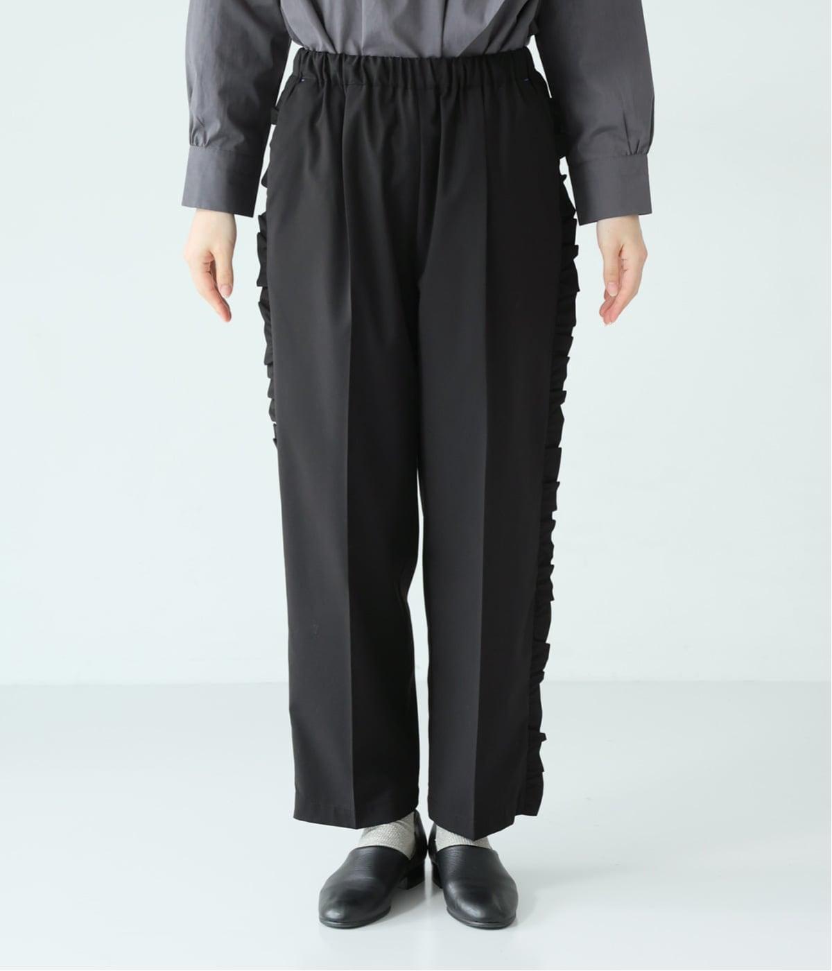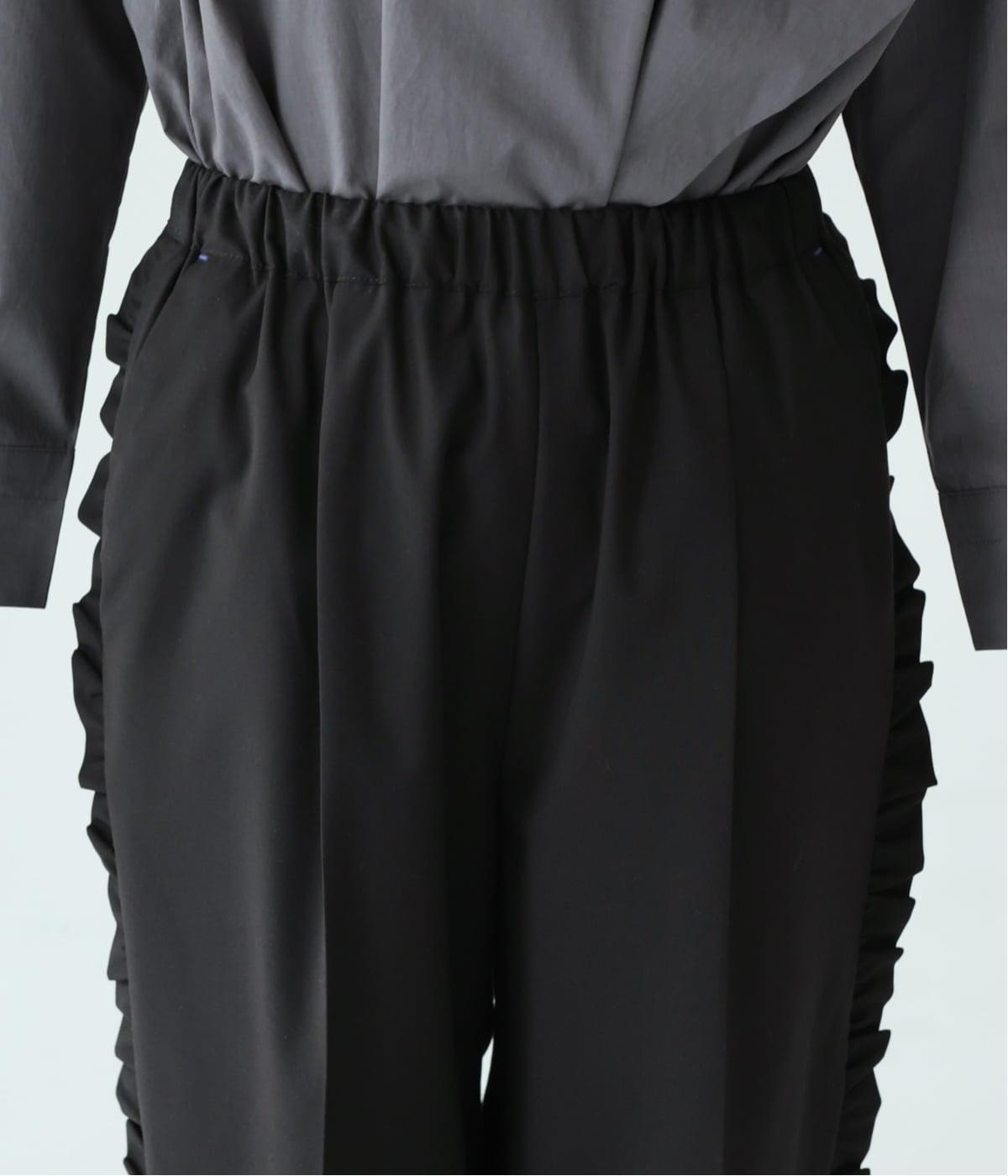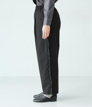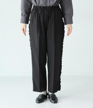 腰まわりや太ももにゆとりを持たせ、裾に向かって細くなるシルエット。センタープレスとサイドにフリルをほどこしました。くるぶし丈の9分丈で抜け感のある仕上がりに。ウエストゴムでフィット感も抜群です。