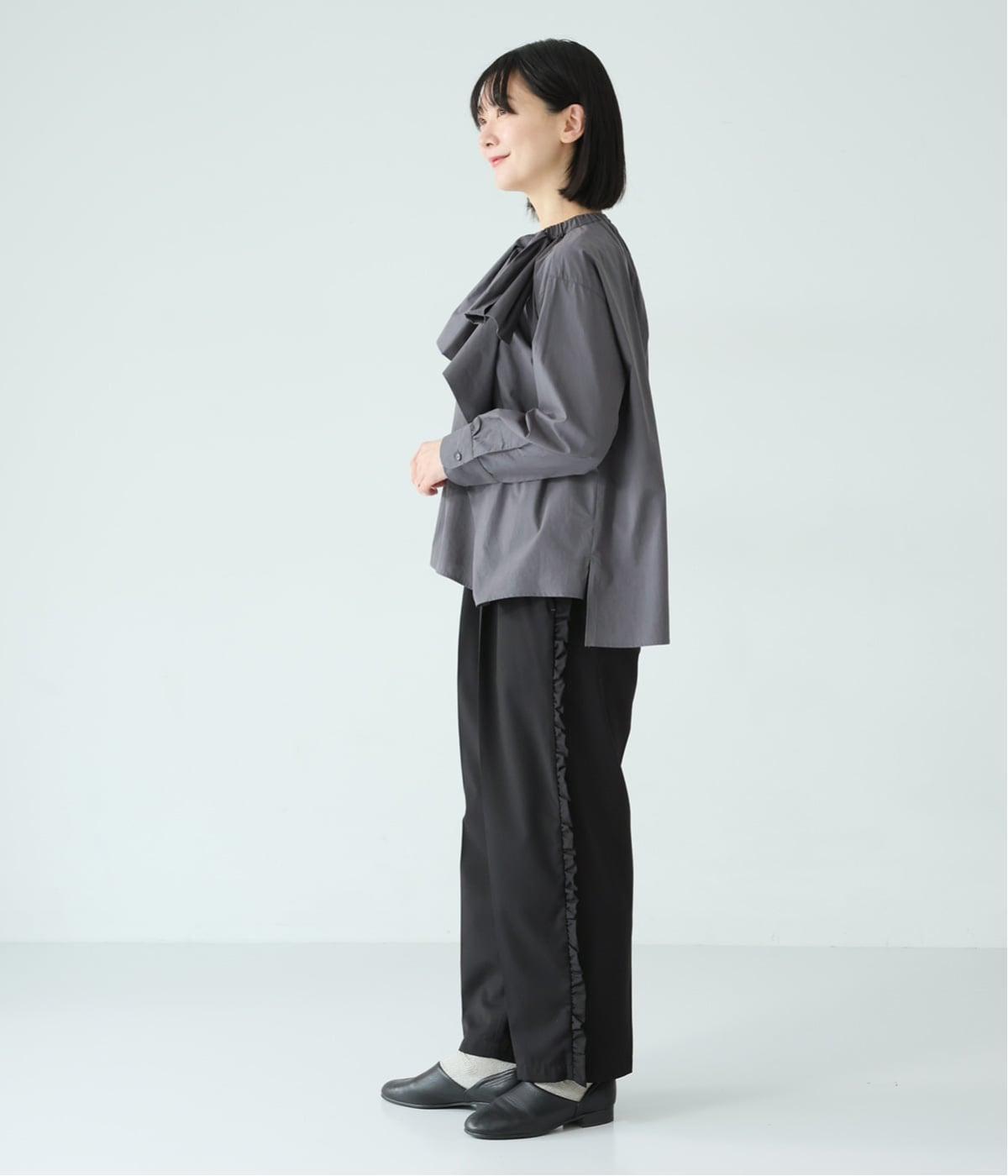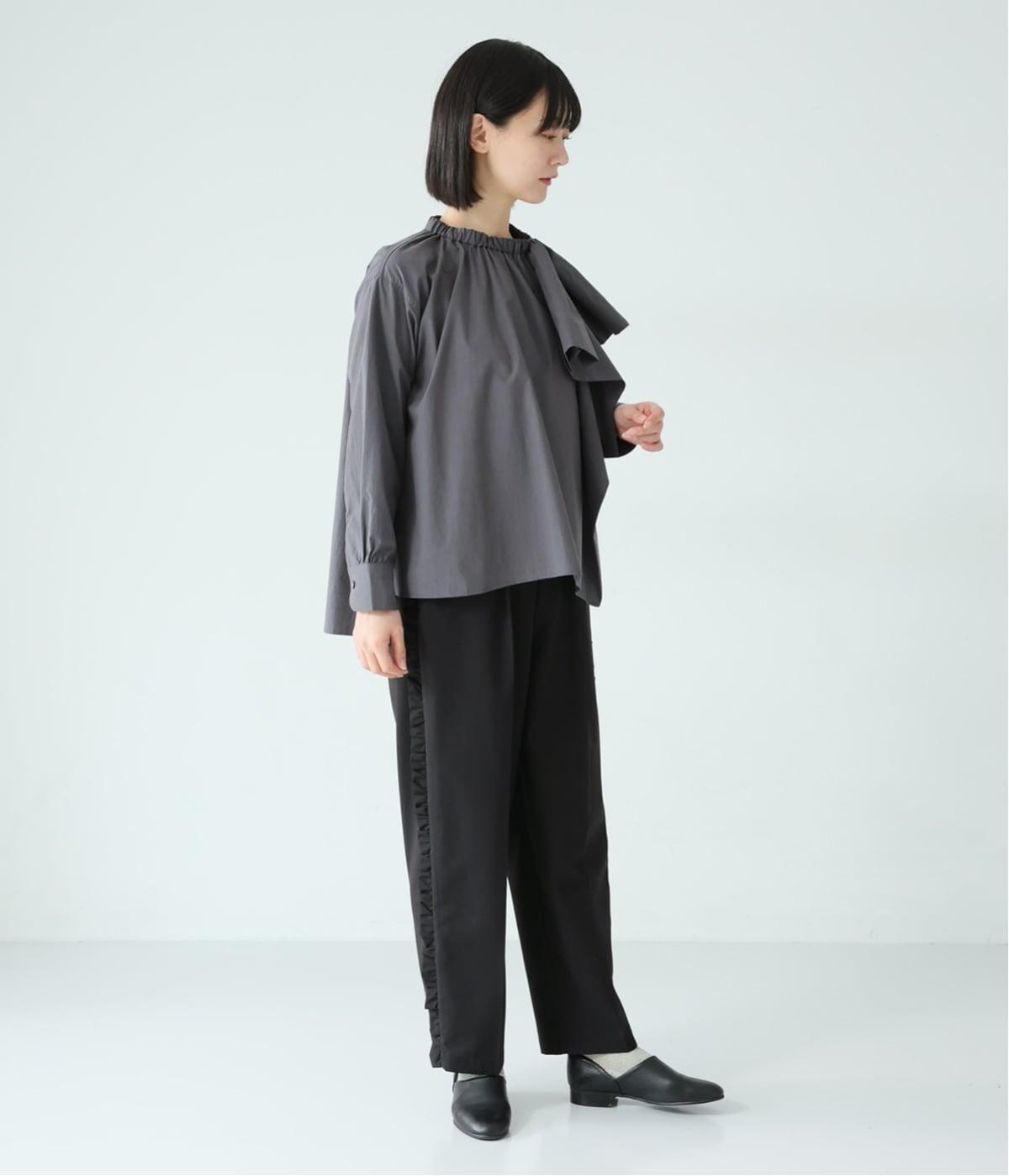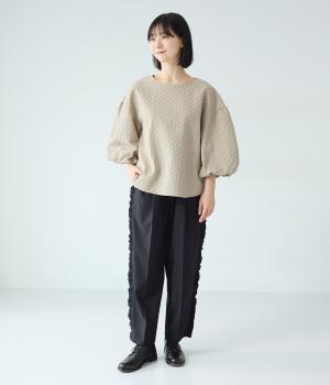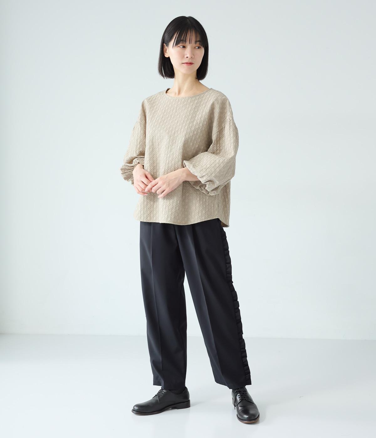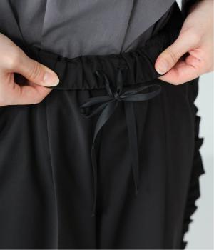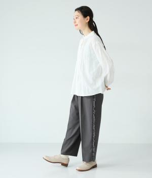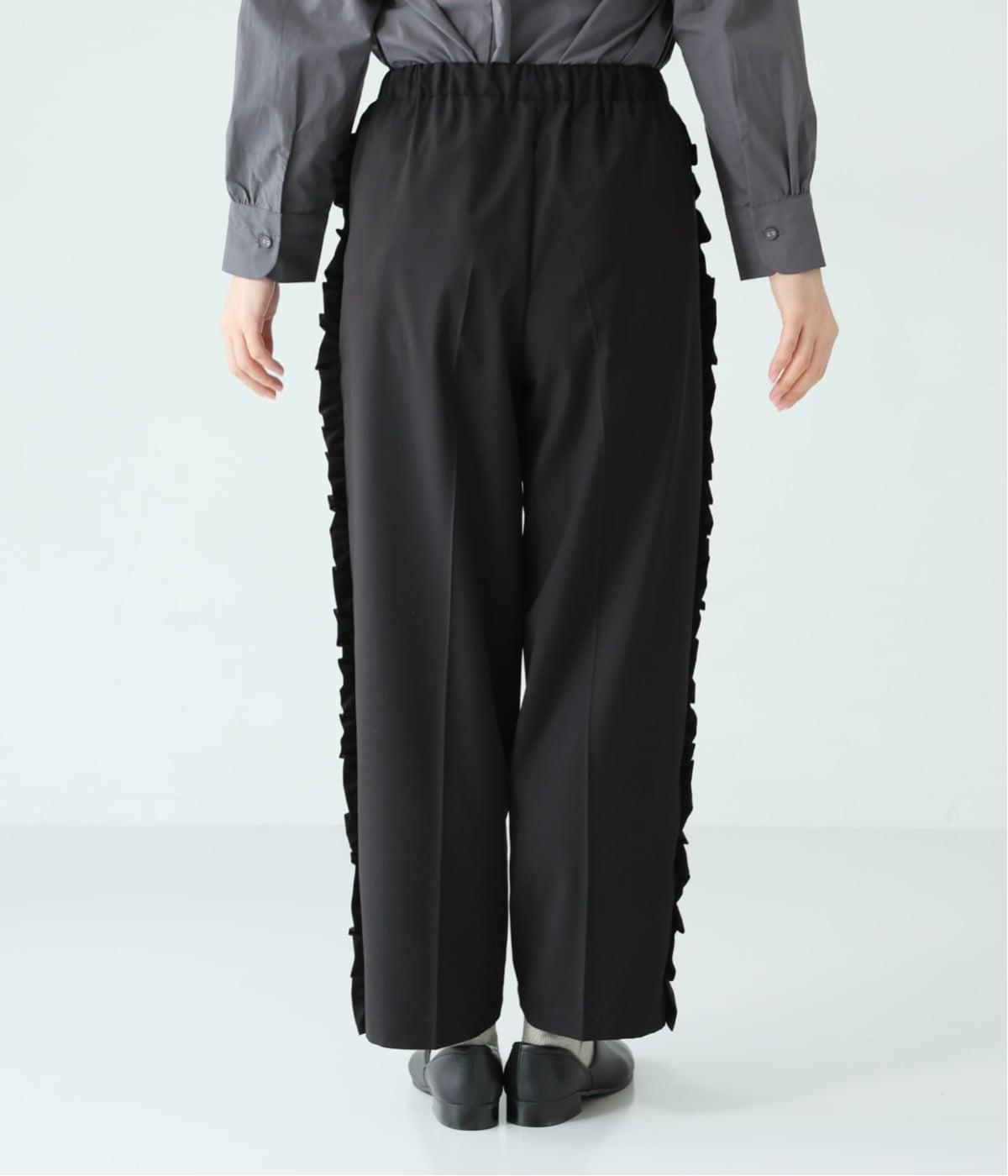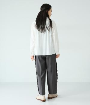 腰まわりや太ももにゆとりを持たせ、裾に向かって細くなるシルエット。センタープレスとサイドにフリルをほどこしました。くるぶし丈の9分丈で抜け感のある仕上がりに。ウエストゴムでフィット感も抜群です。