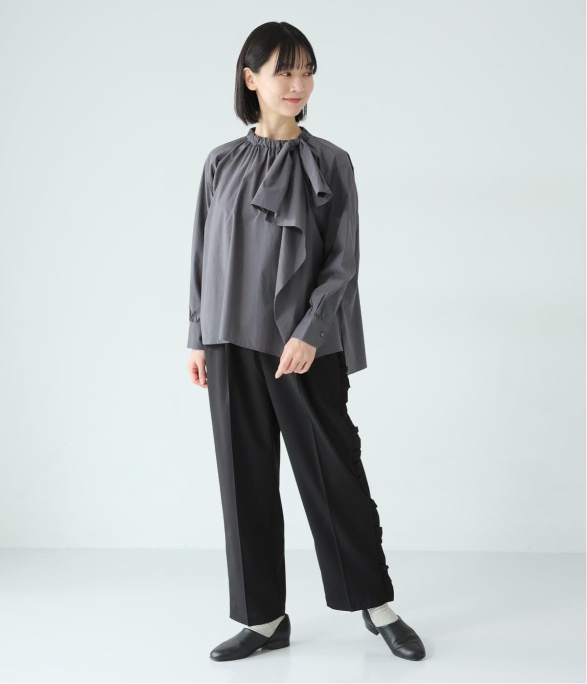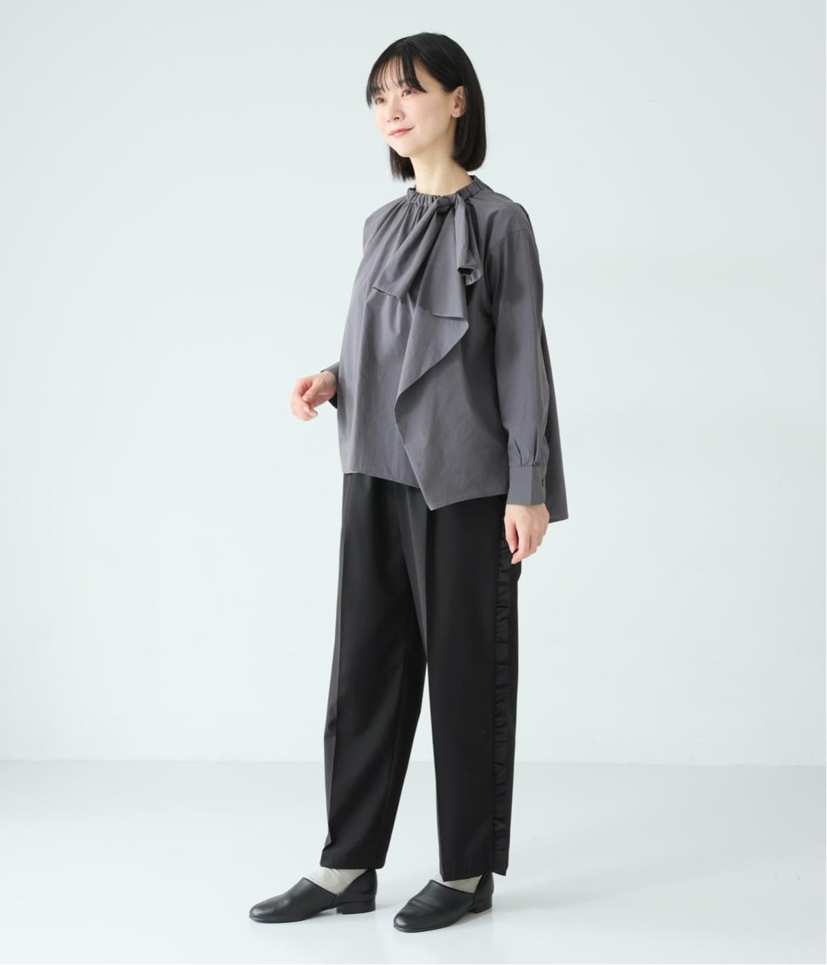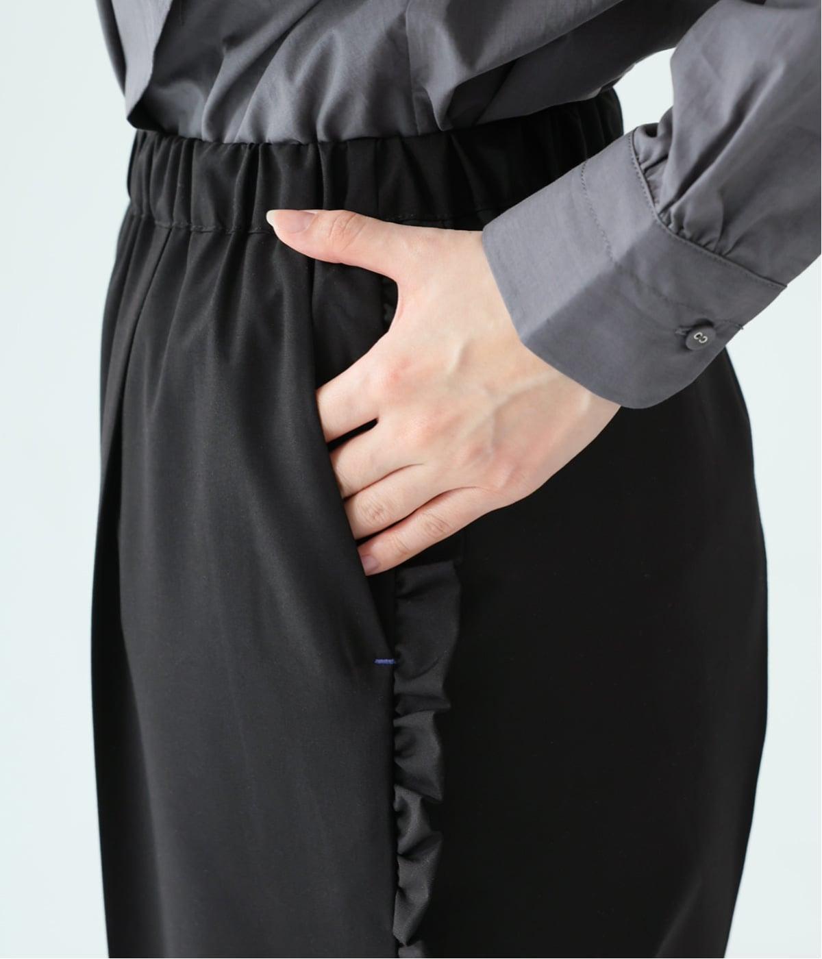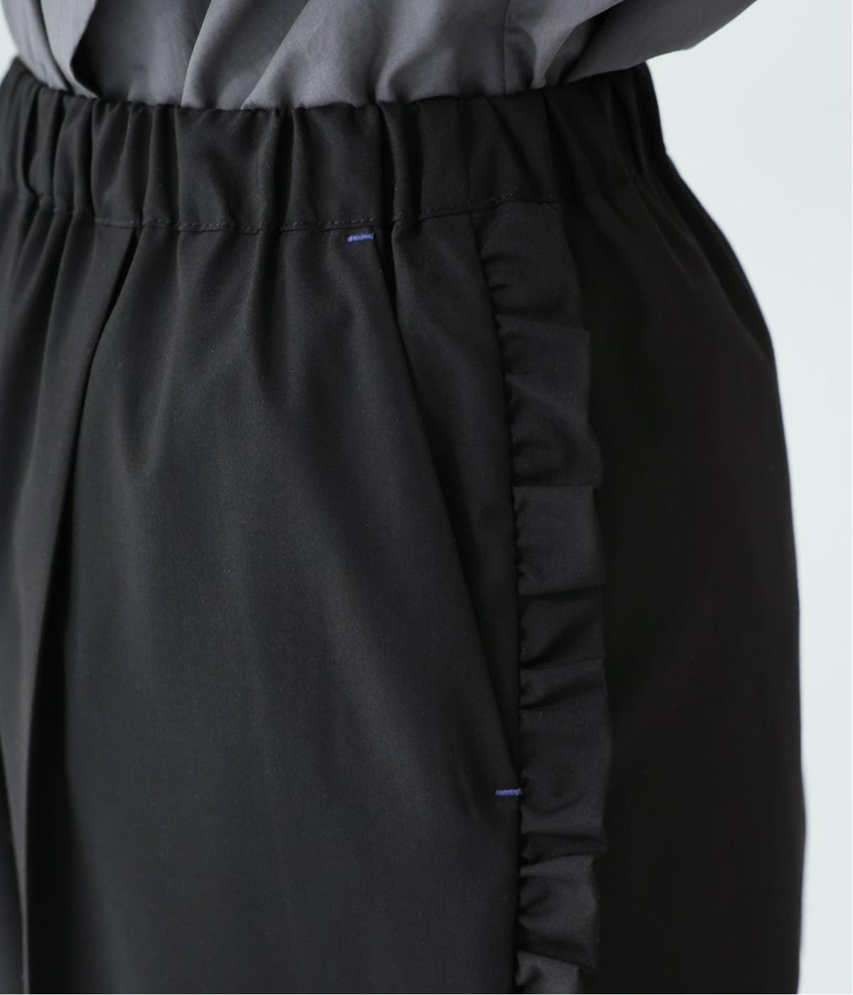 腰まわりや太ももにゆとりを持たせ、裾に向かって細くなるシルエット。センタープレスとサイドにフリルをほどこしました。くるぶし丈の9分丈で抜け感のある仕上がりに。ウエストゴムでフィット感も抜群です。