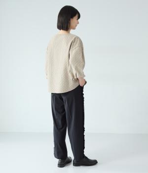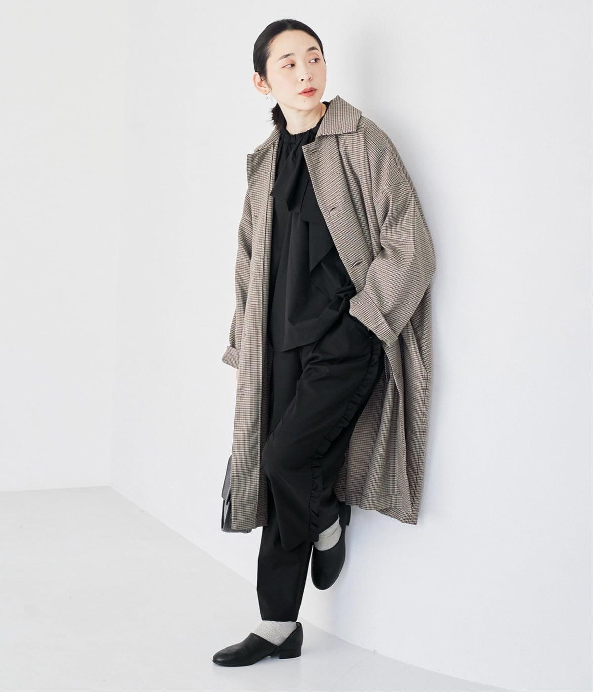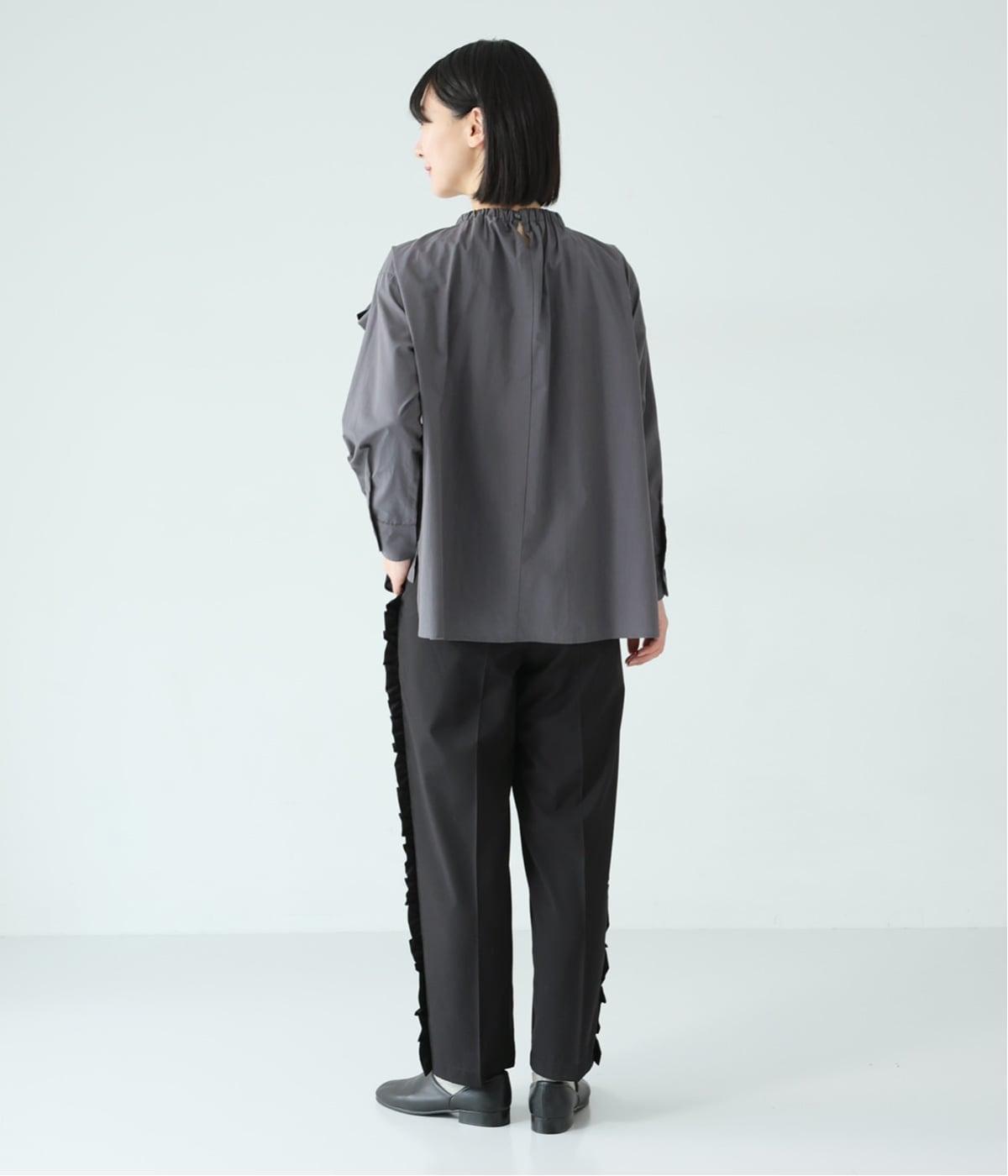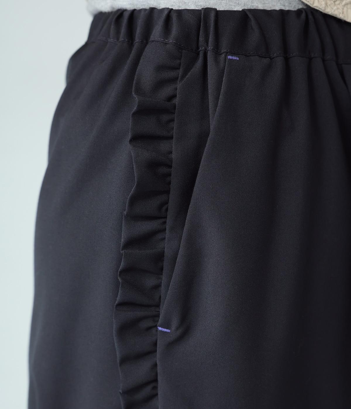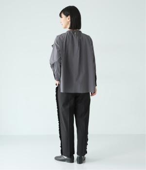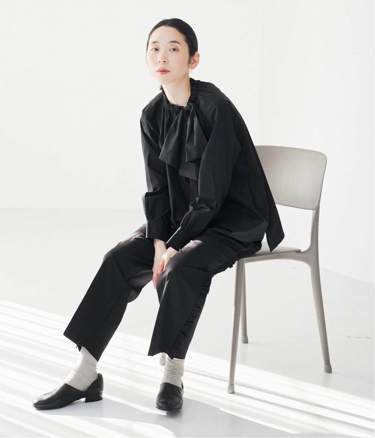 腰まわりや太ももにゆとりを持たせ、裾に向かって細くなるシルエット。センタープレスとサイドにフリルをほどこしました。くるぶし丈の9分丈で抜け感のある仕上がりに。ウエストゴムでフィット感も抜群です。