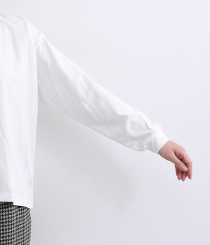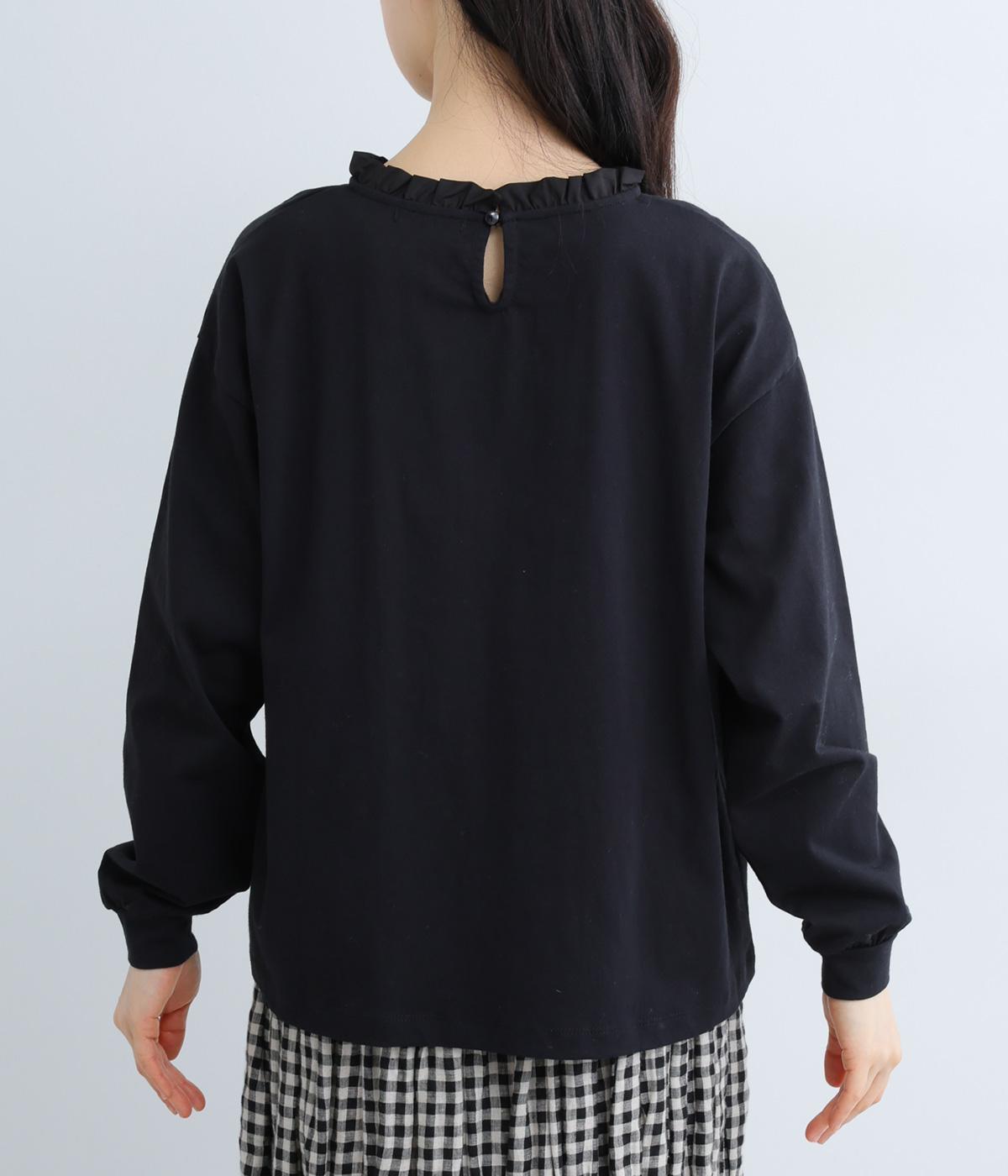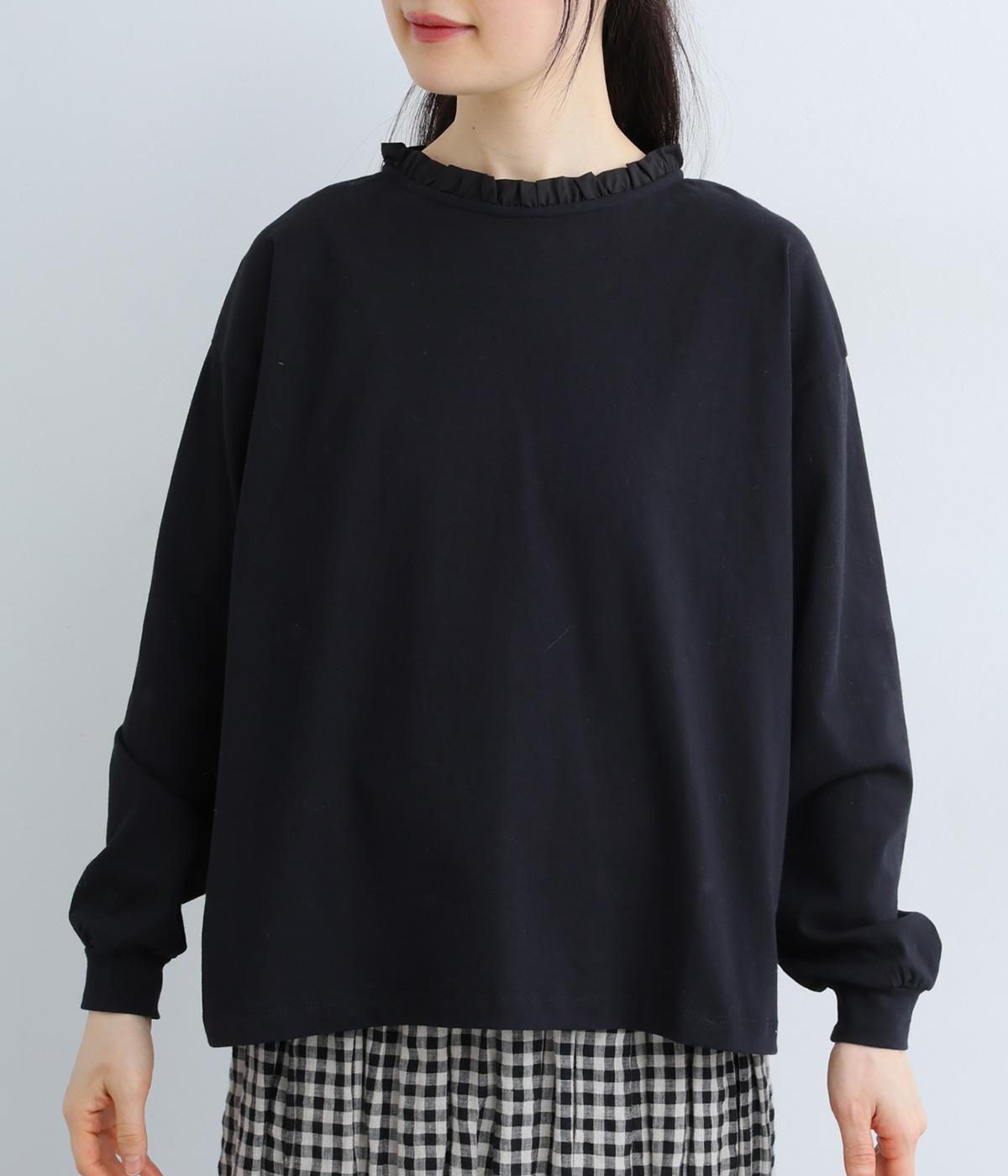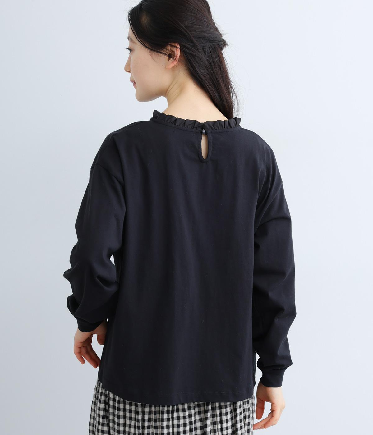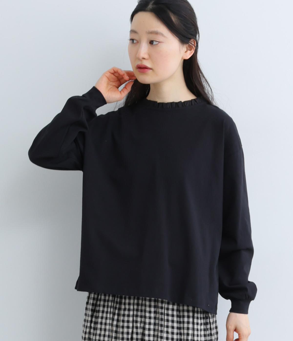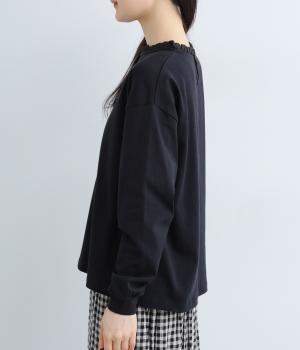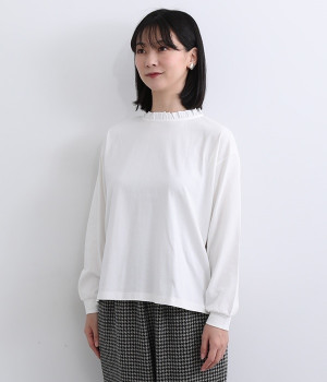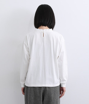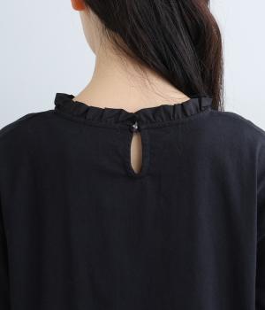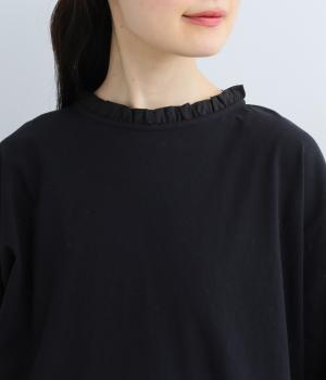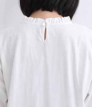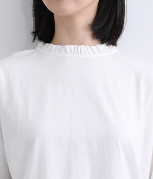 シンプルなコットンカットソーにフリルをあしらい、デザイン性のある一枚に仕立てました。涙あきの背中が、女性らしさと着やすさを兼ね備えています。ボトムスを選ばない丈感にもこだわり、パンツスタイルにもスカートにもなじみます。