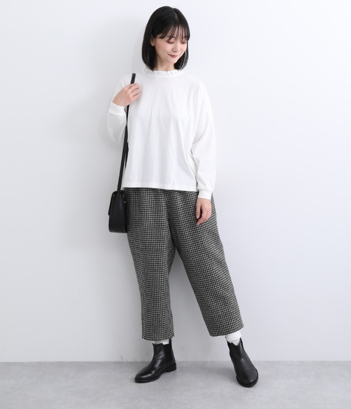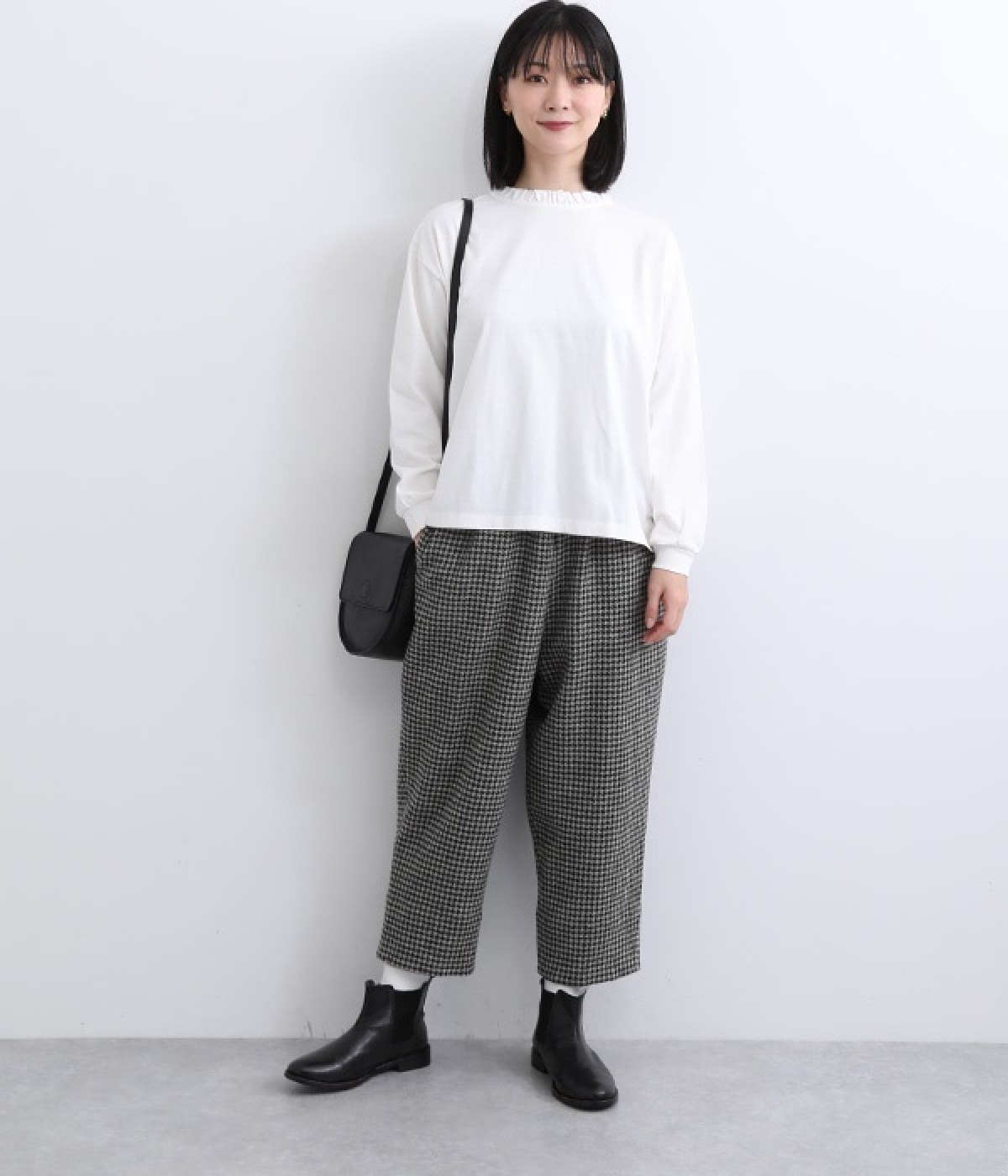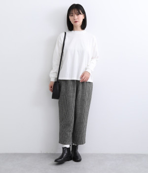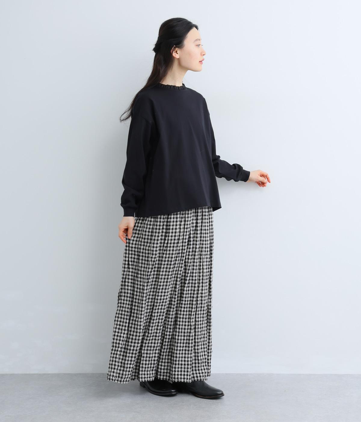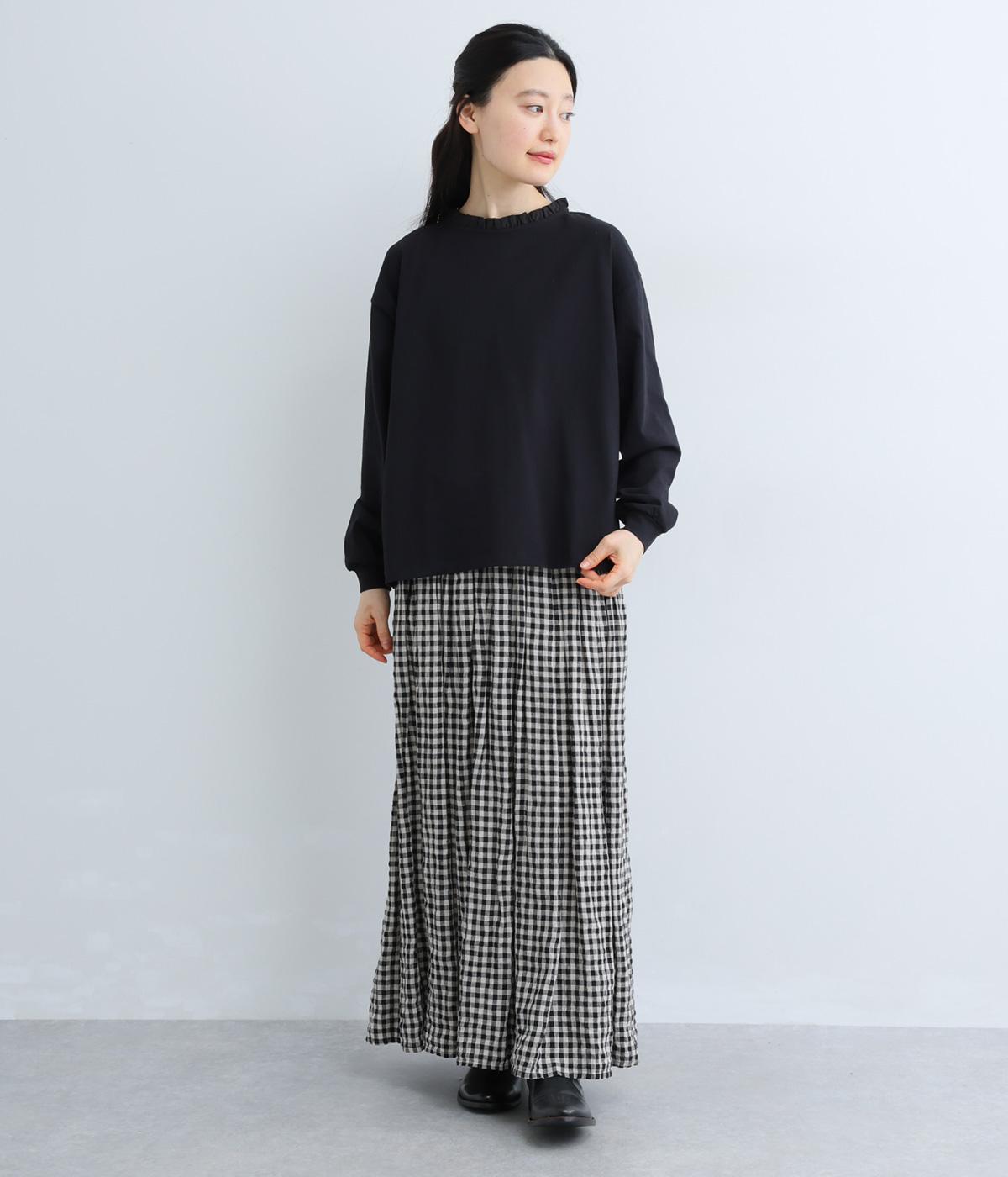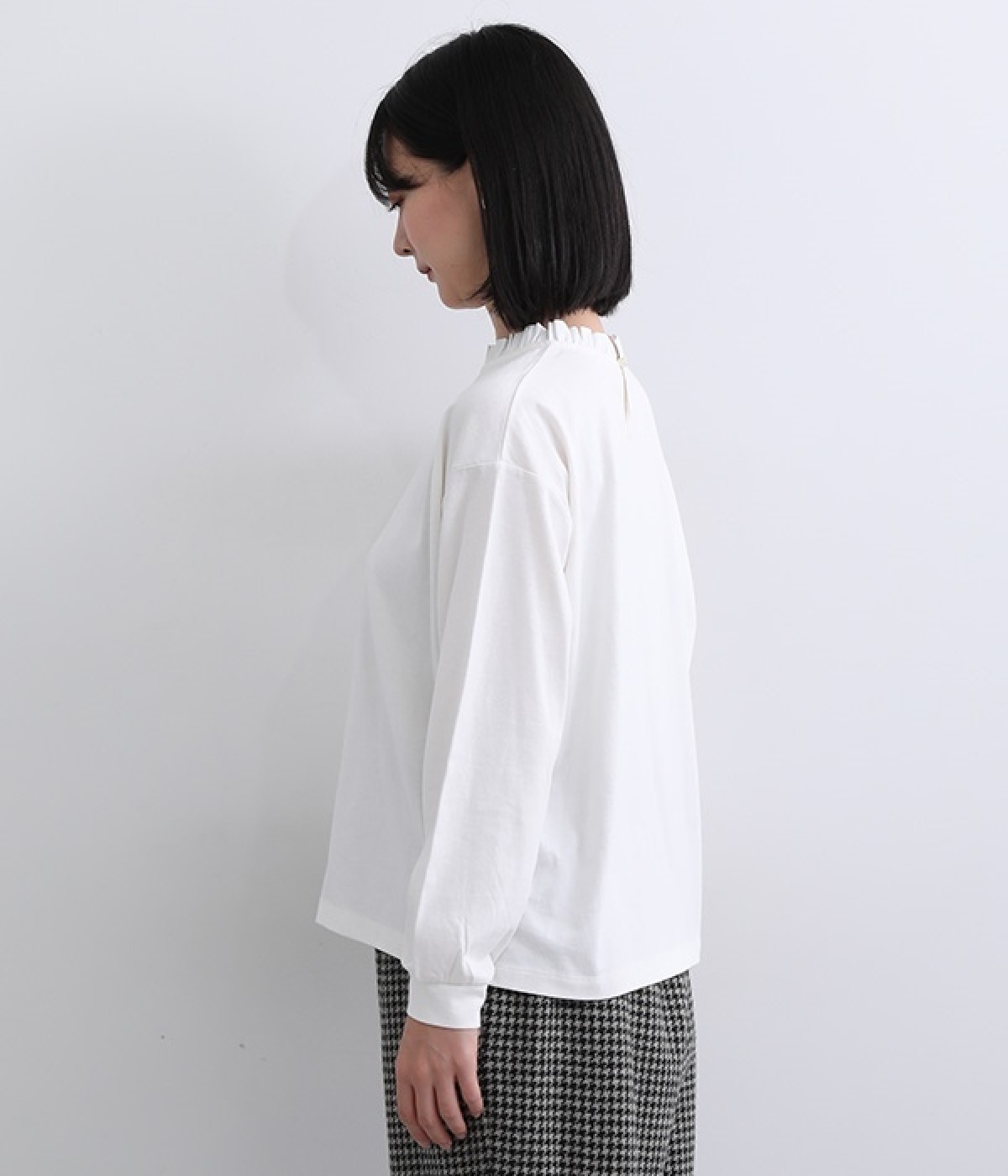 シンプルなコットンカットソーにフリルをあしらい、デザイン性のある一枚に仕立てました。涙あきの背中が、女性らしさと着やすさを兼ね備えています。ボトムスを選ばない丈感にもこだわり、パンツスタイルにもスカートにもなじみます。
