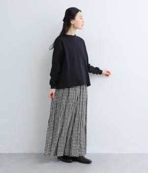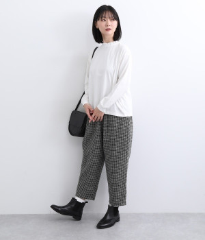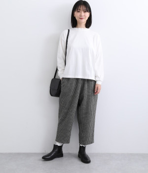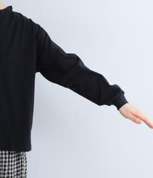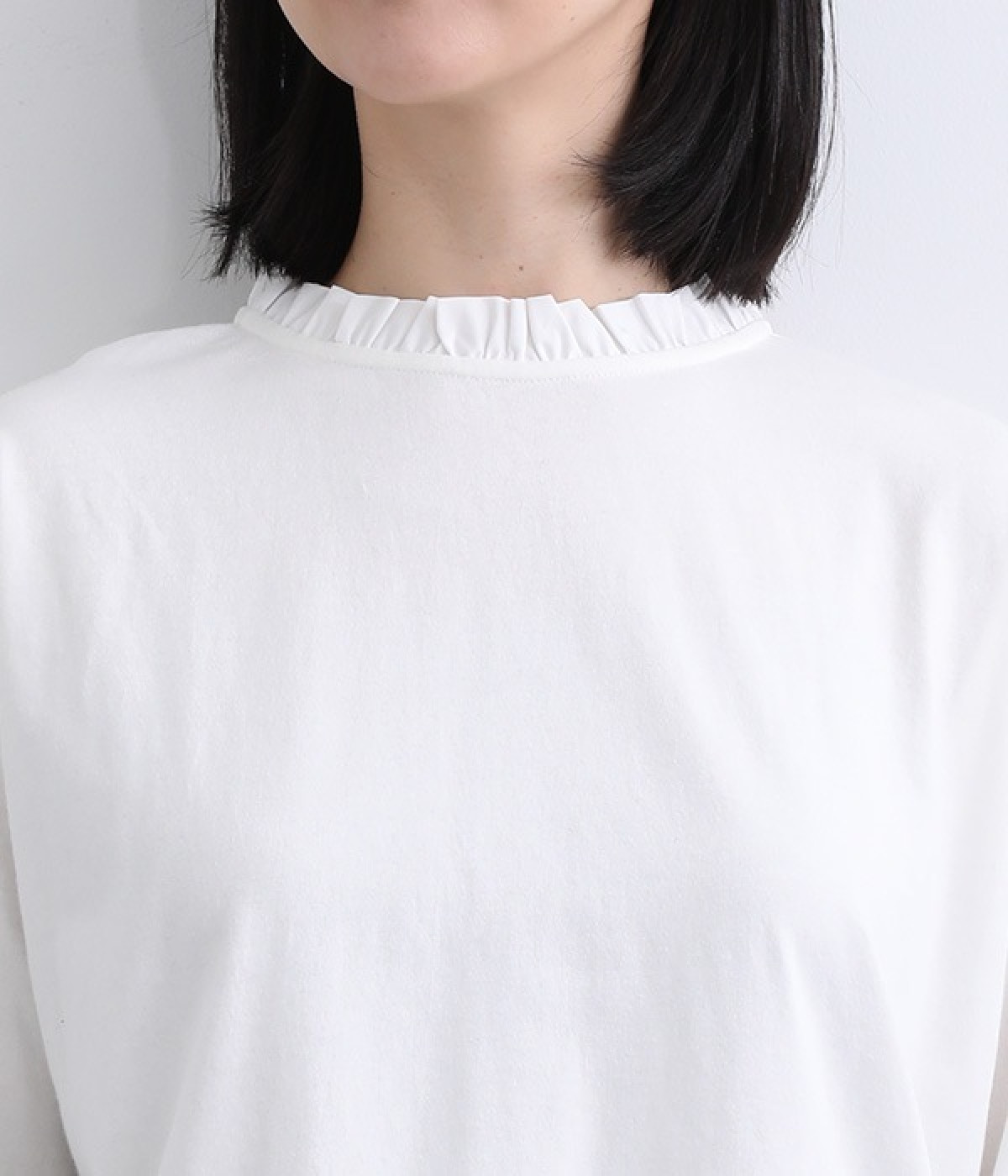 素肌にやさしく、吸水性に優れたコットン素材を使用しました。伸縮性があり、さらっと軽やかな着心地です。首元にはハリがありながらも硬さの少ないフリルをあしらいました。