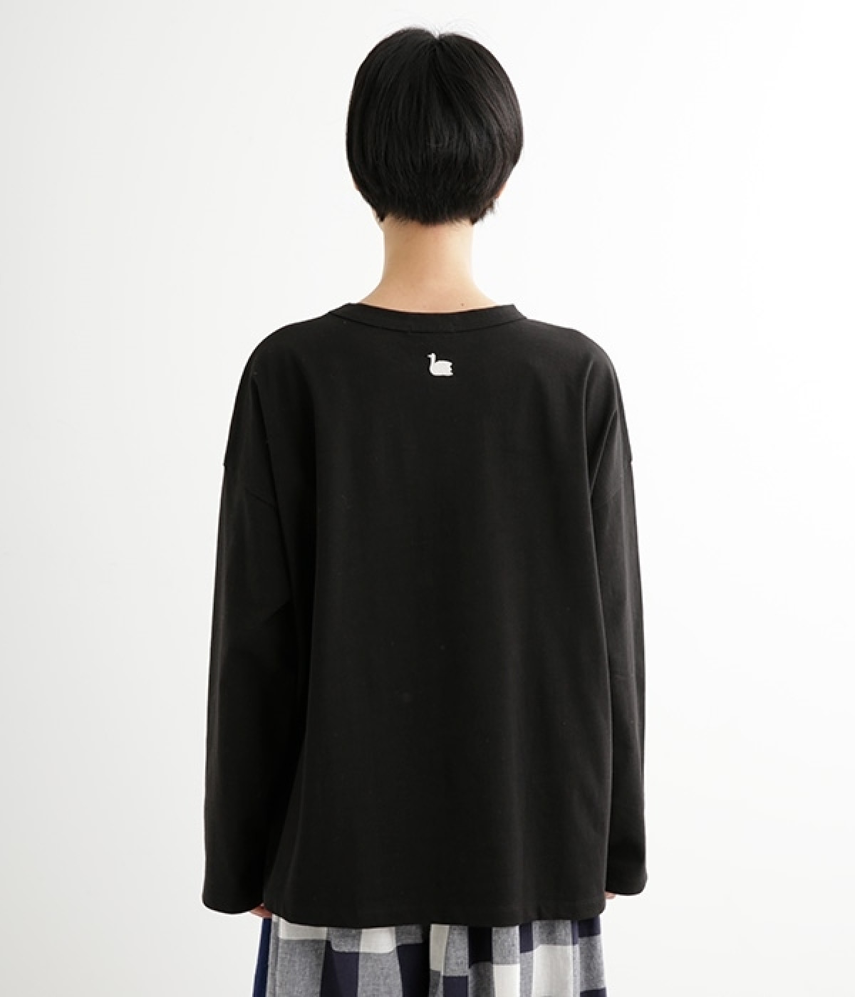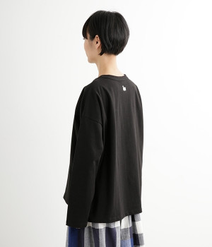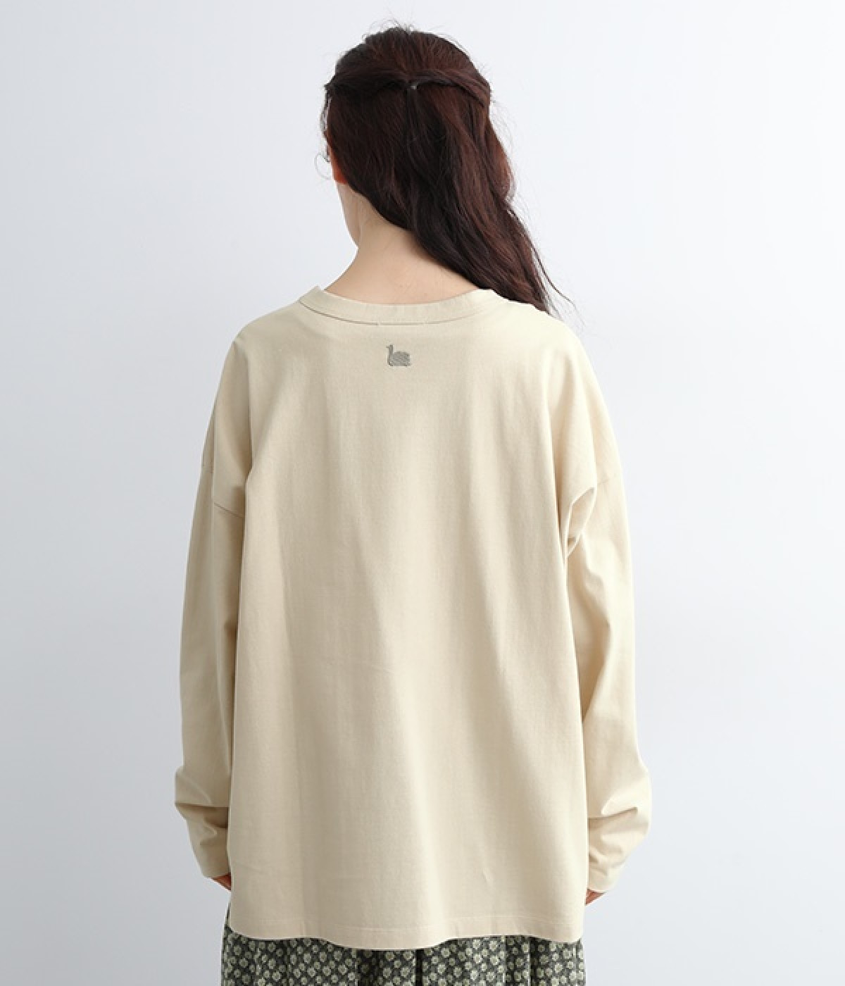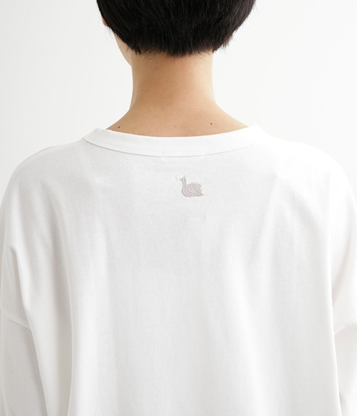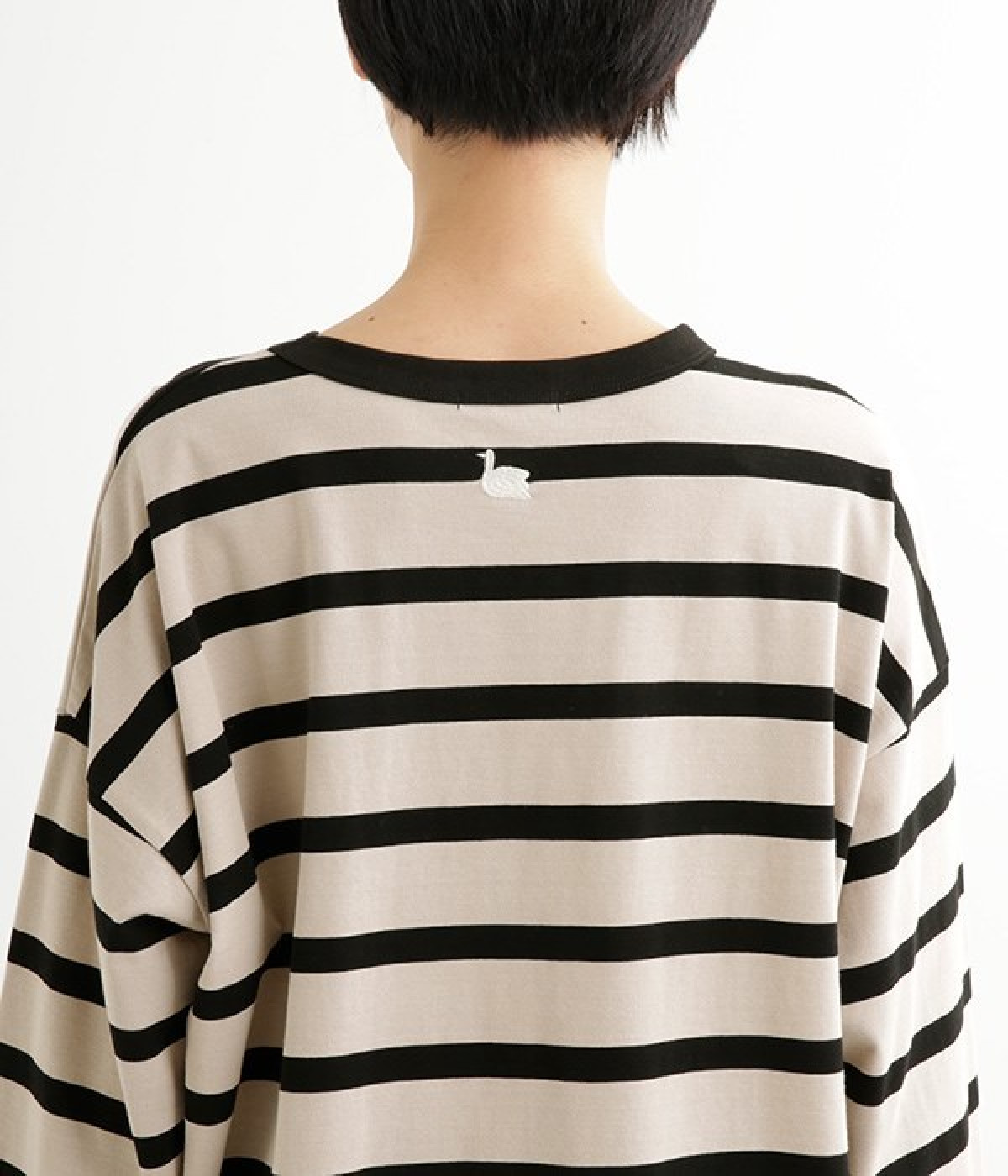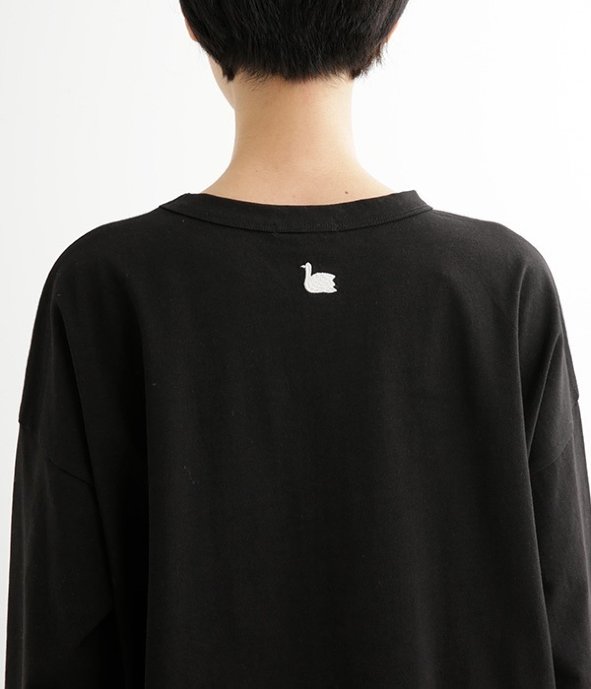 ドロップショルダーのワイドな身幅がポイントのプルオーバー。長めの袖丈がリラックスした雰囲気です。着丈にはさりげない前後差があり、後ろはやや長めでヒップラインをさりげなくカバー。ブランドのアイコンであるスワンモチーフが背中の襟元にあしらわれています。