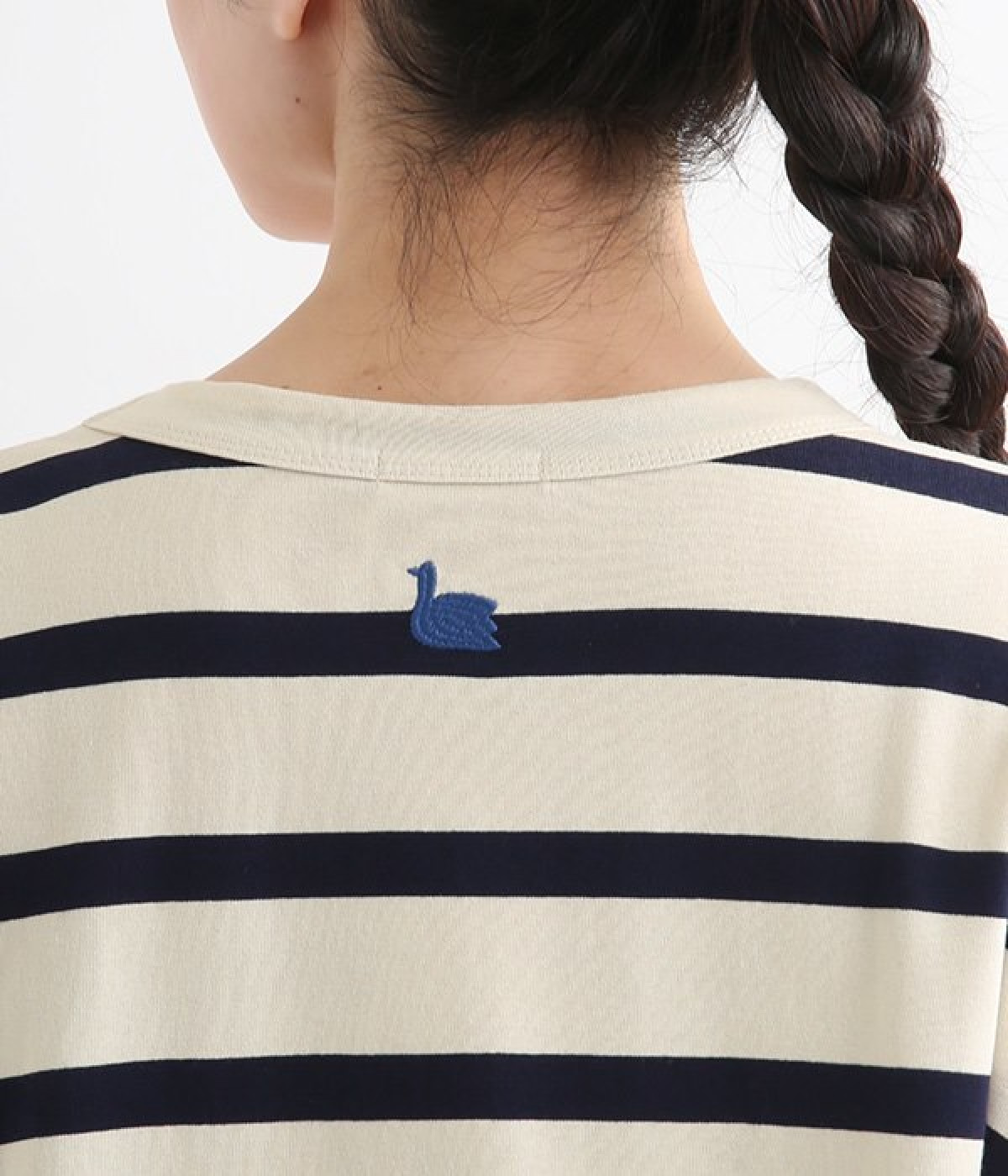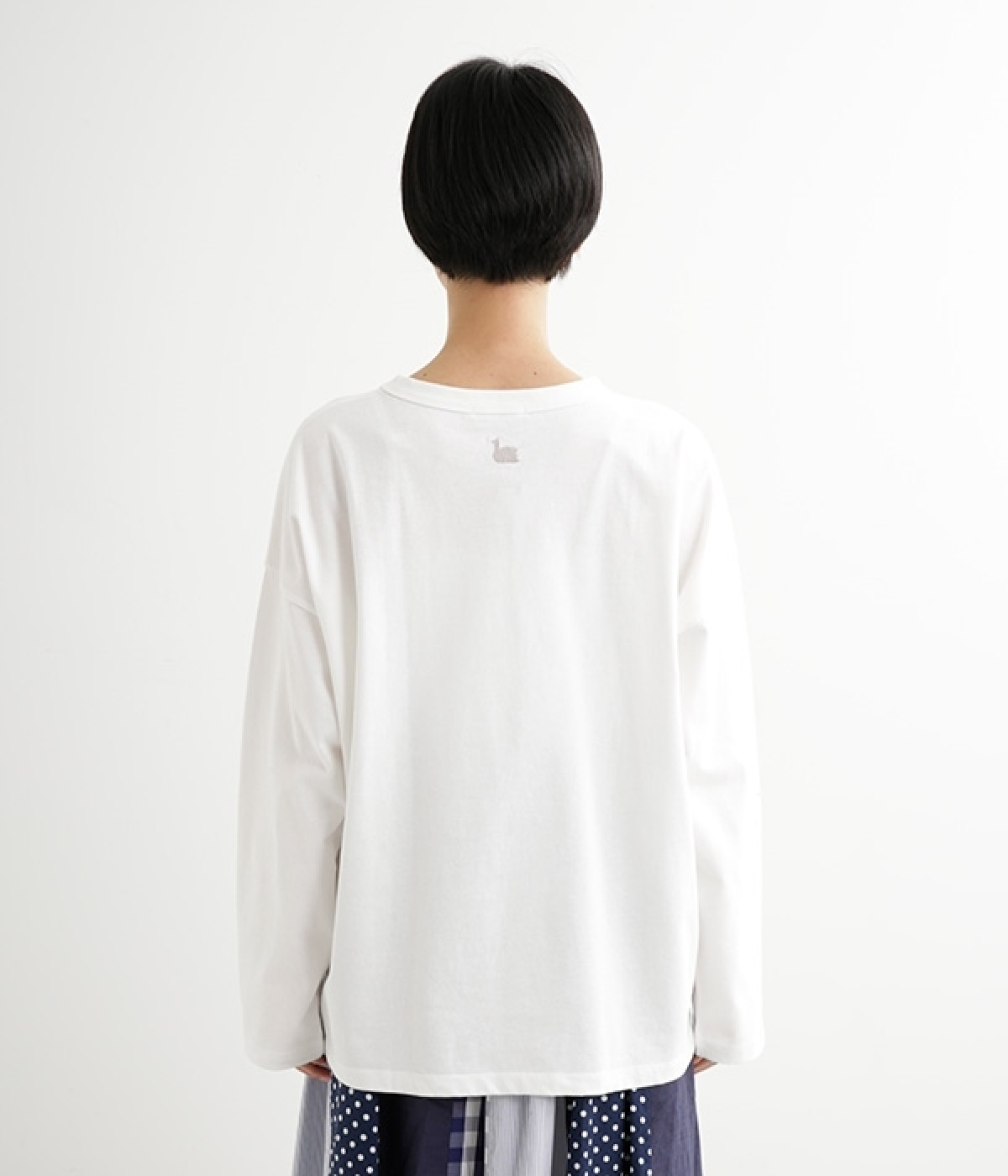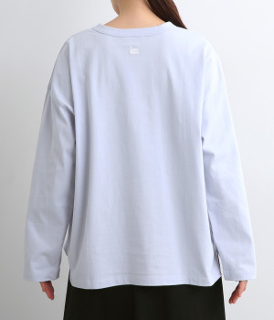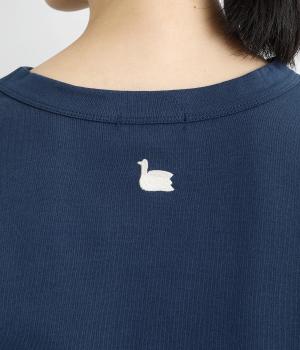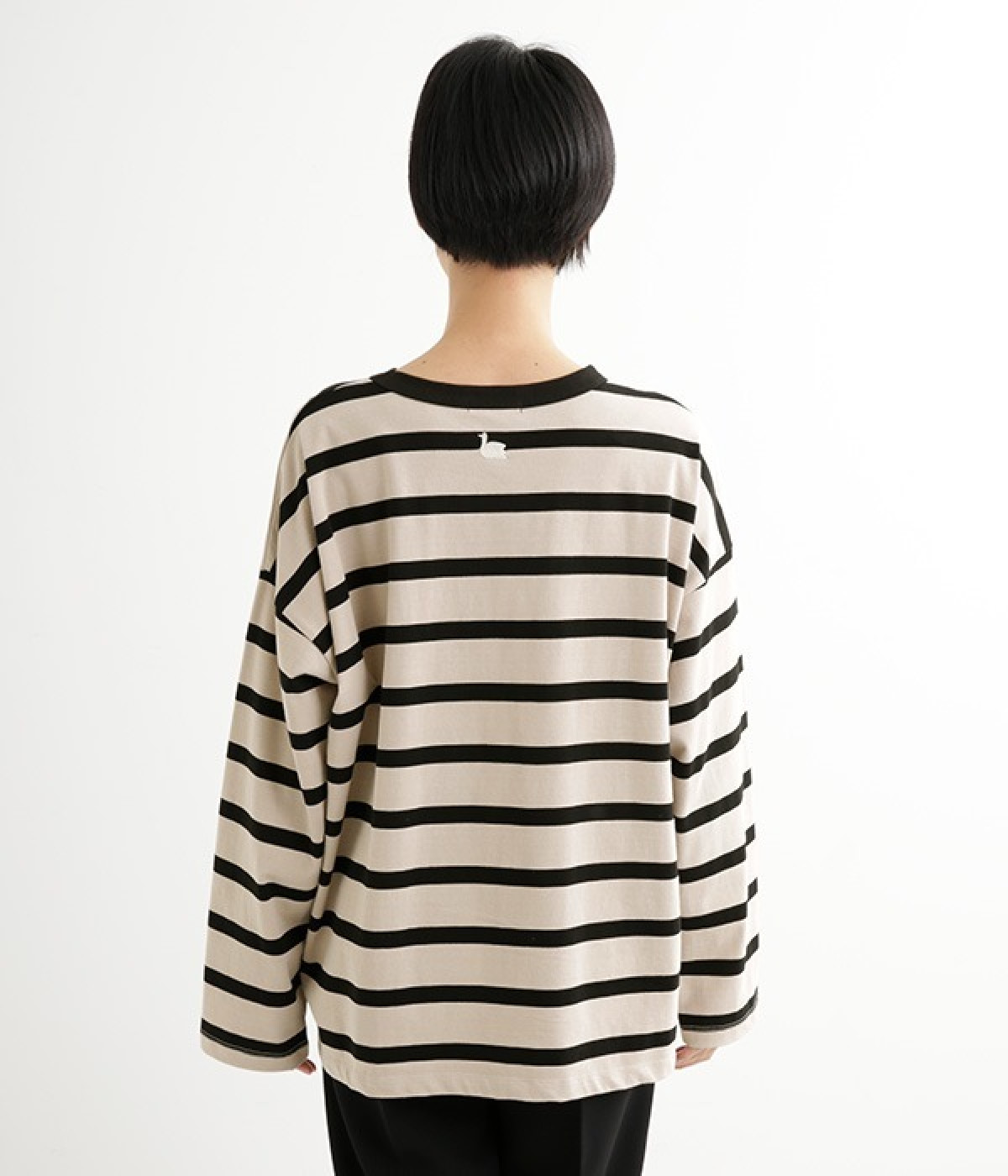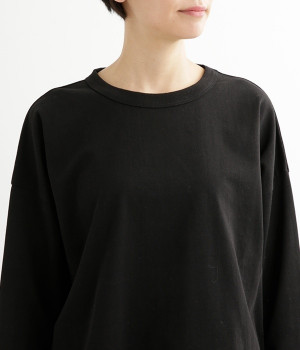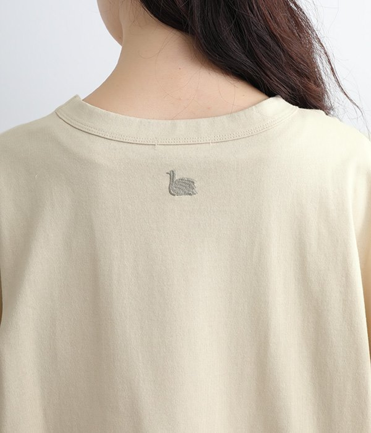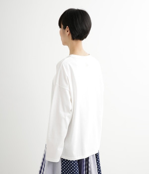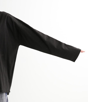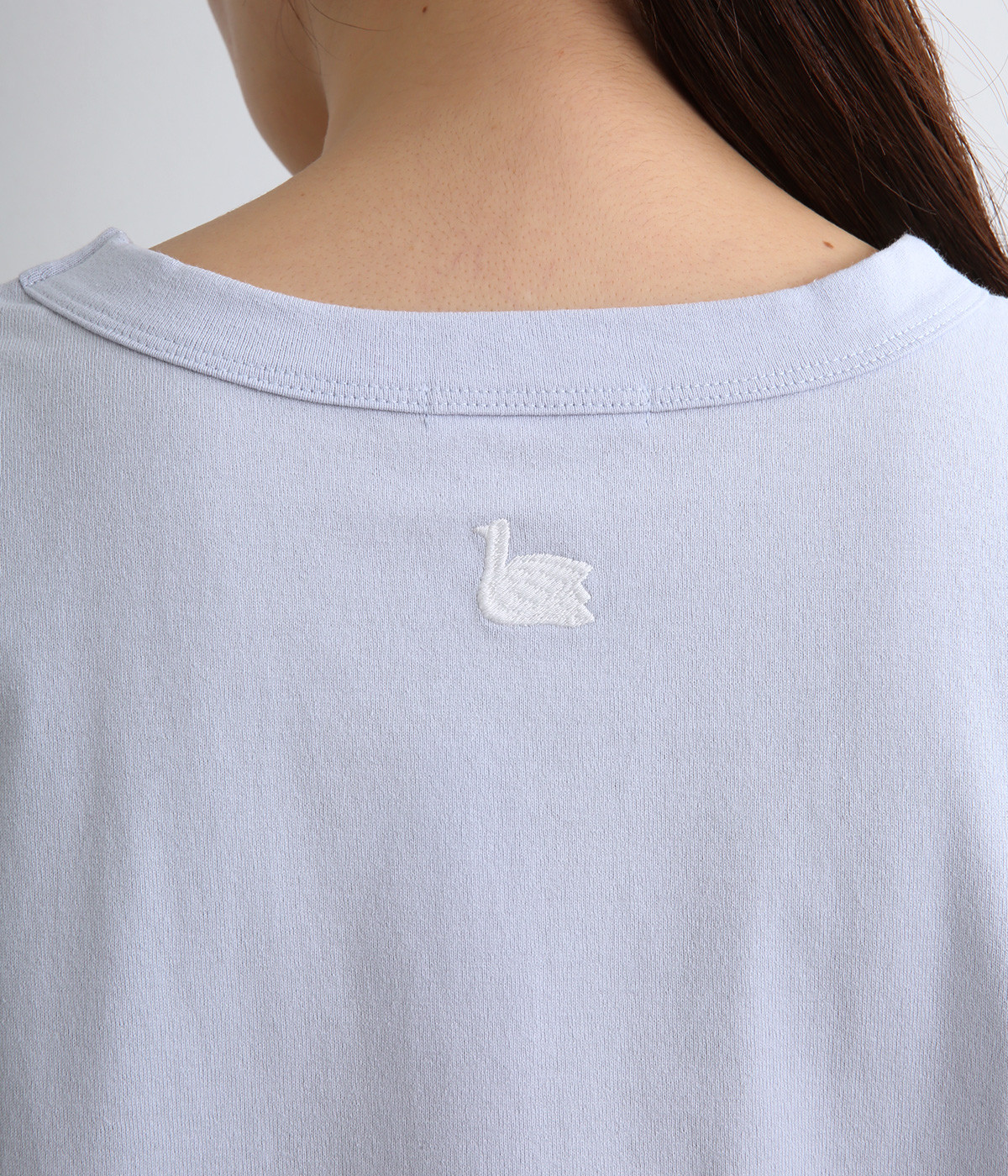 ドロップショルダーのワイドな身幅がポイントのプルオーバー。長めの袖丈がリラックスした雰囲気です。着丈にはさりげない前後差があり、後ろはやや長めでヒップラインをさりげなくカバー。ブランドのアイコンであるスワンモチーフが背中の襟元にあしらわれています。