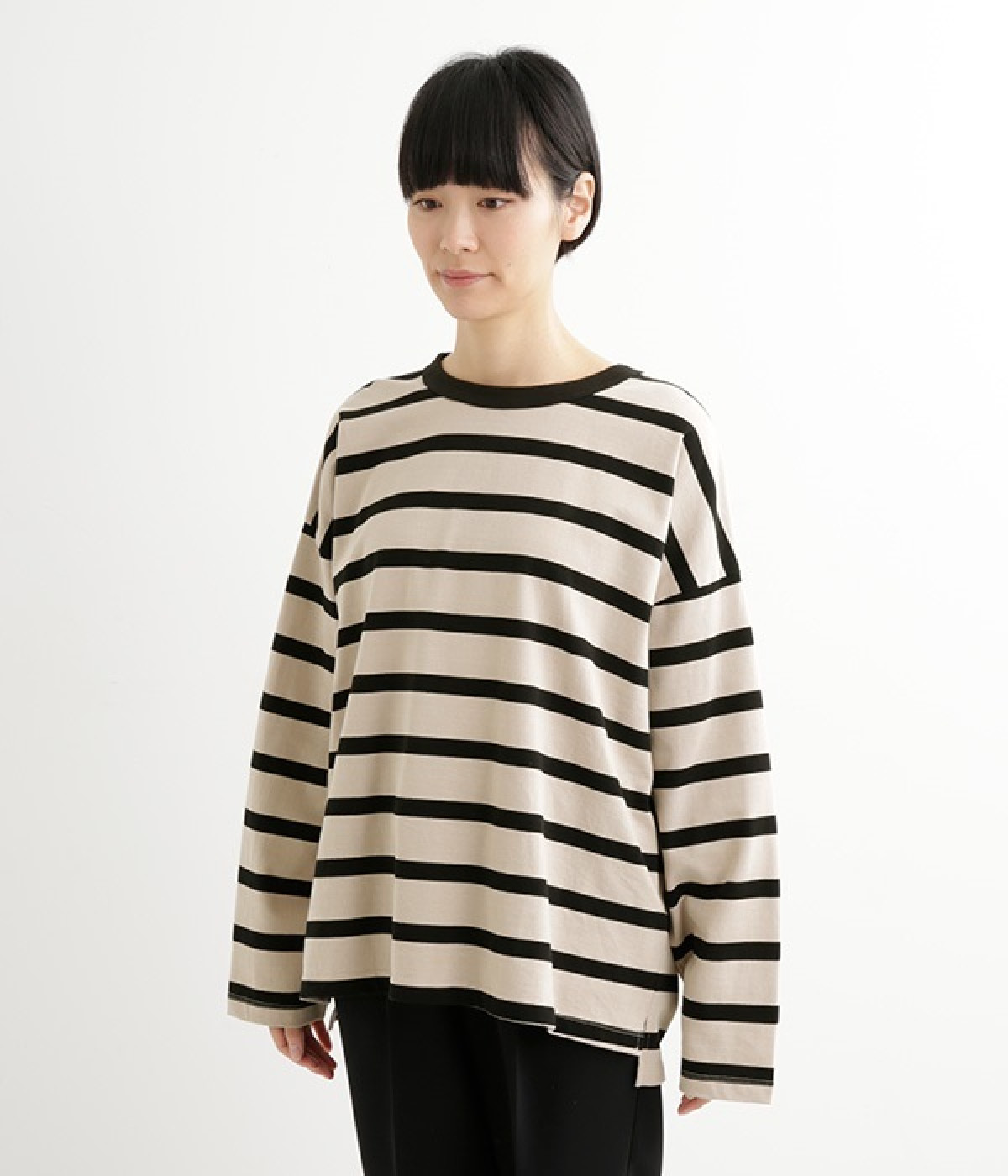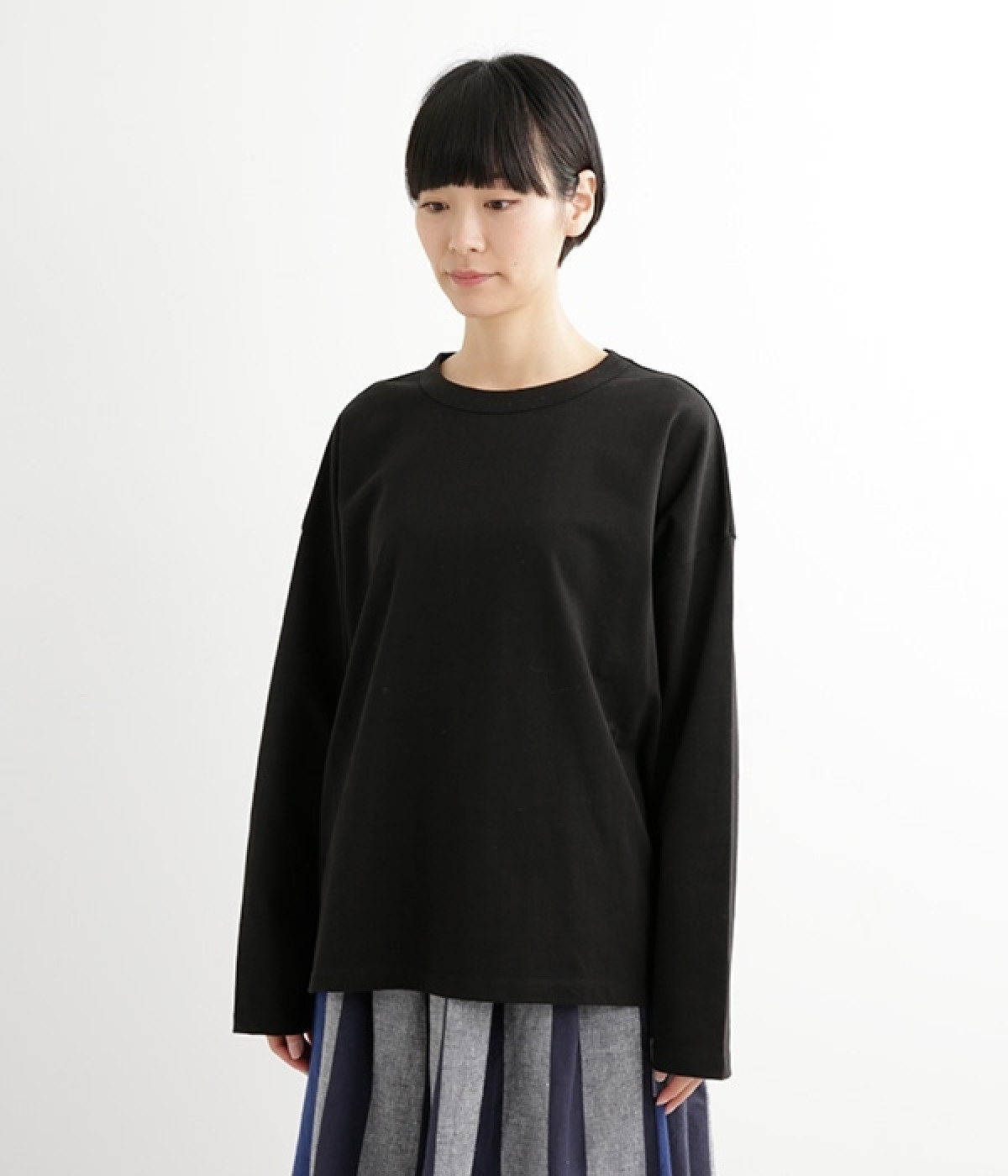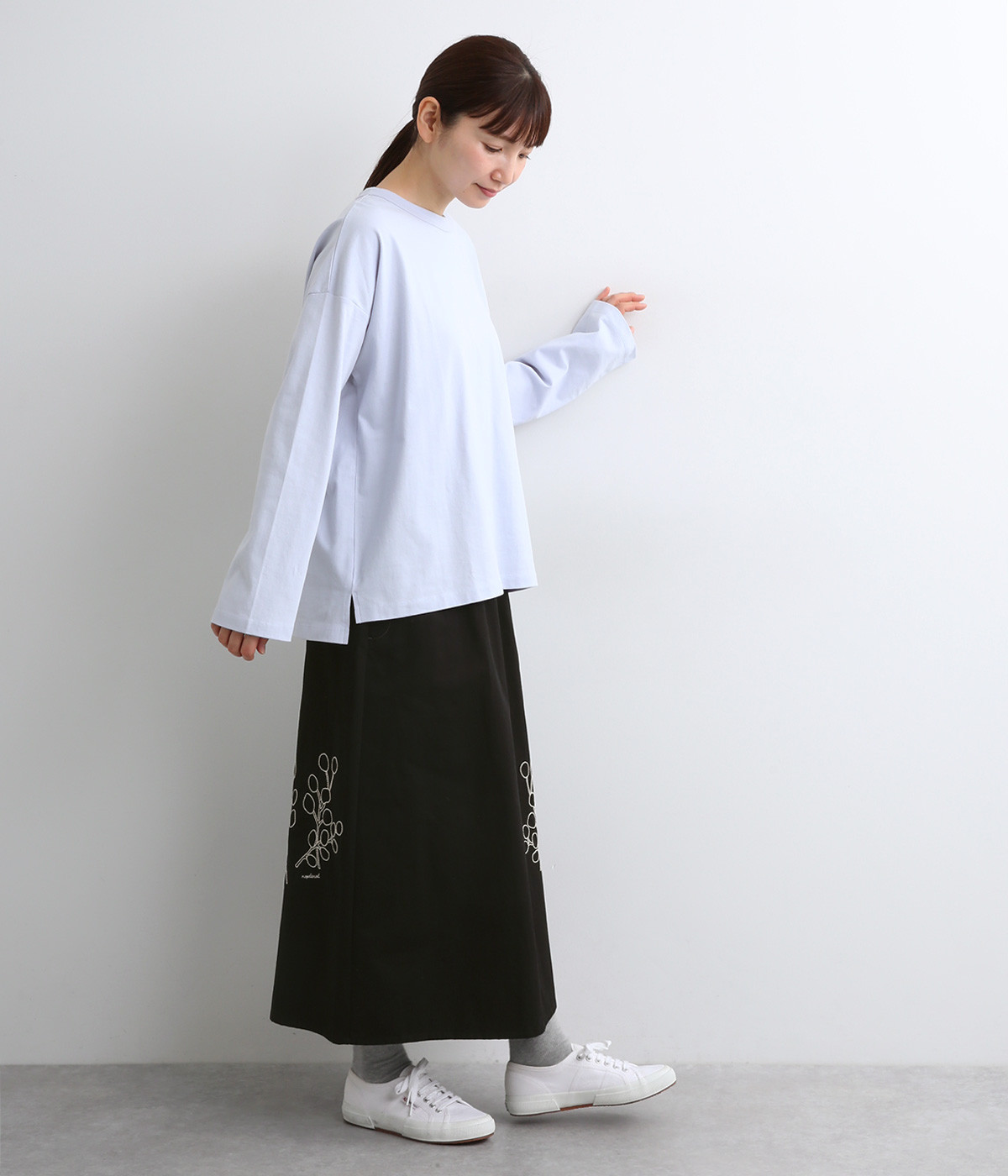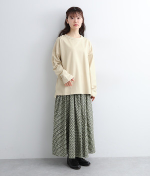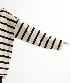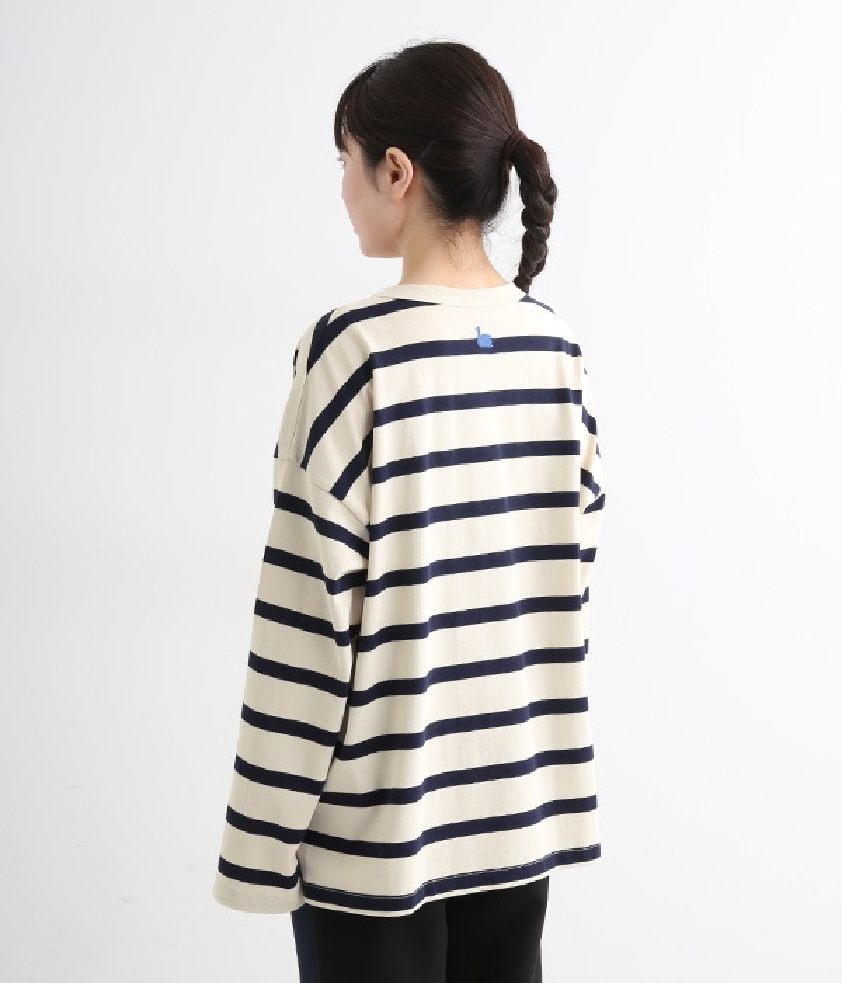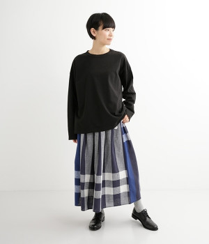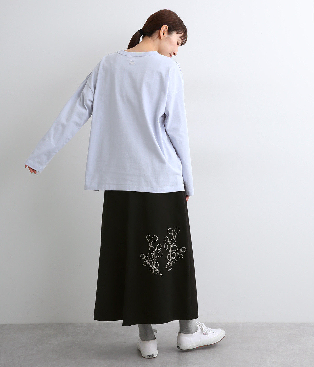 ドロップショルダーのワイドな身幅がポイントのプルオーバー。長めの袖丈がリラックスした雰囲気です。着丈にはさりげない前後差があり、後ろはやや長めでヒップラインをさりげなくカバー。ブランドのアイコンであるスワンモチーフが背中の襟元にあしらわれています。